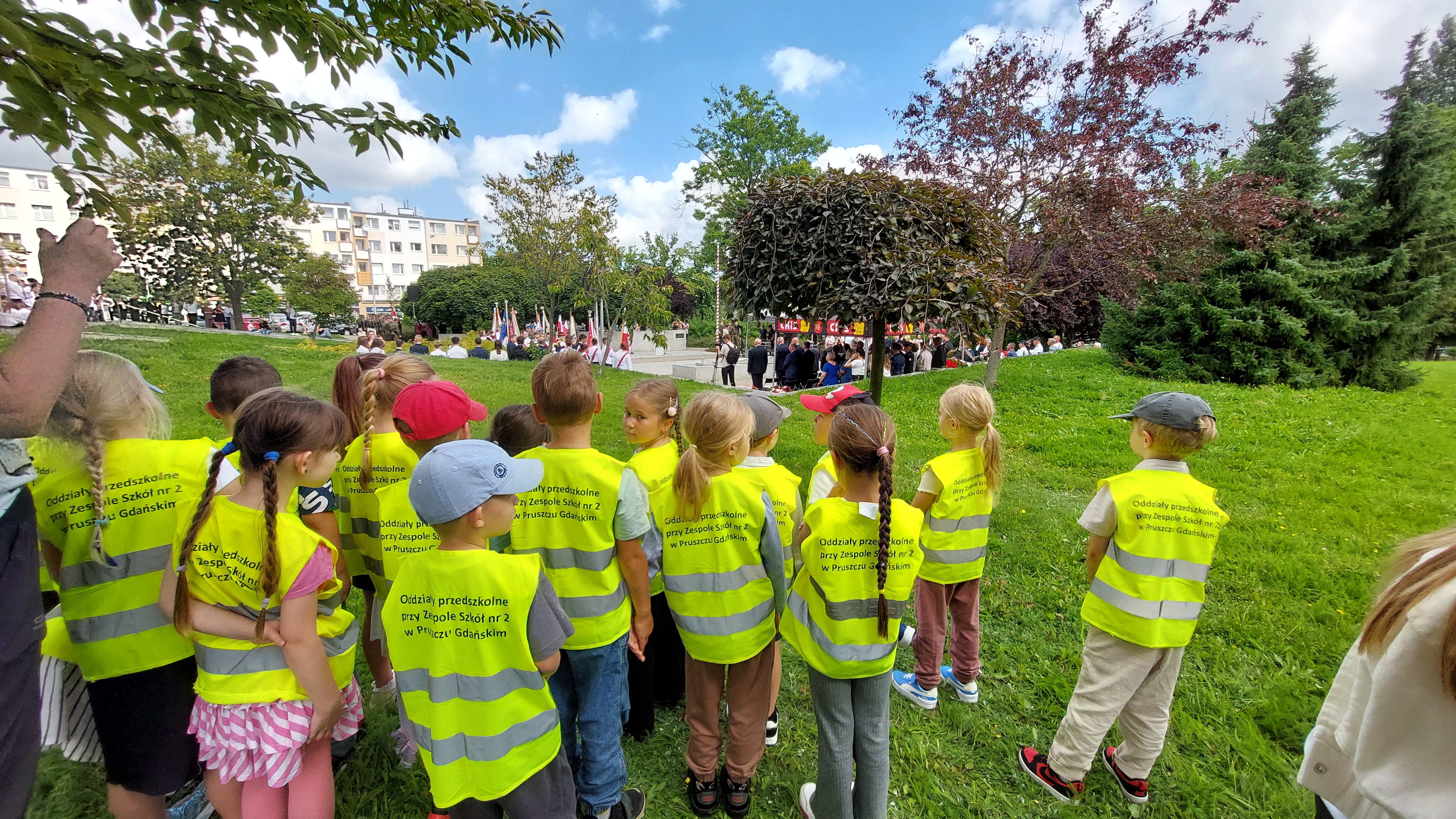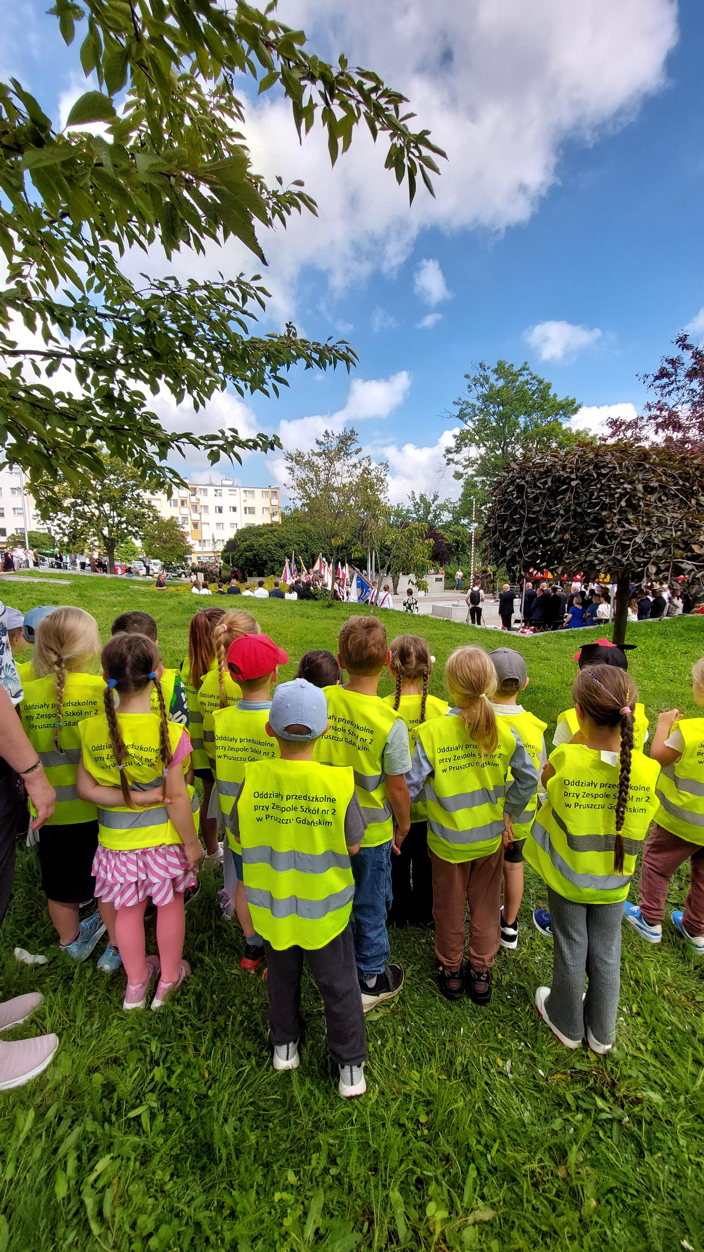 1 września nasza grupa poszła jako delegacja Oddziałów Przedszkolnych na Obchody 86. rocznicy wybuchu II Wojny Światowej. Uroczystość miała bardzo podniosły charakter, a dzieci z zainteresowaniem obserwowały przebieg wydarzeń. Wspólnie ze wszystkimi wyśpiewały Hymn Polski , który już doskonale znają.
