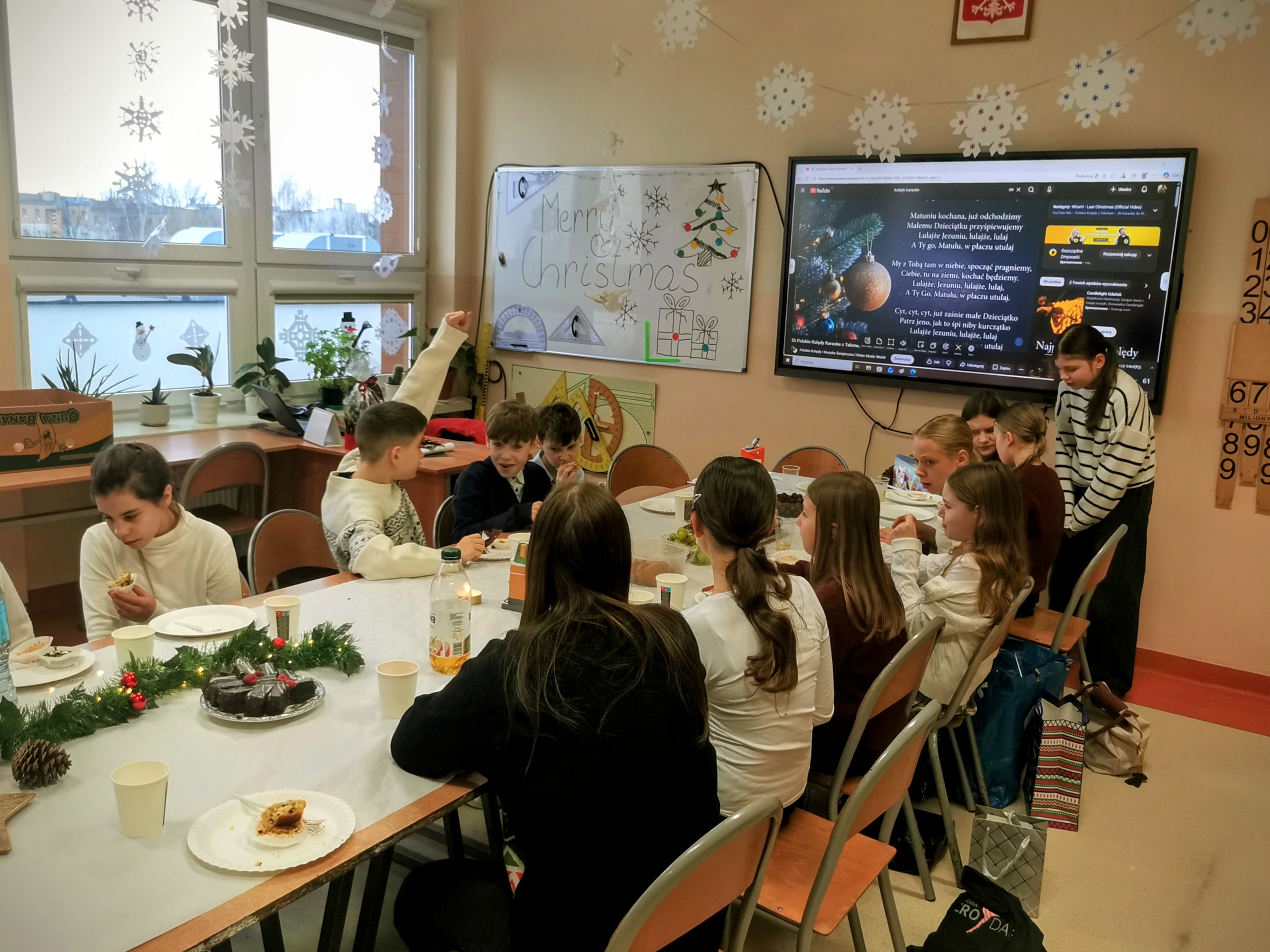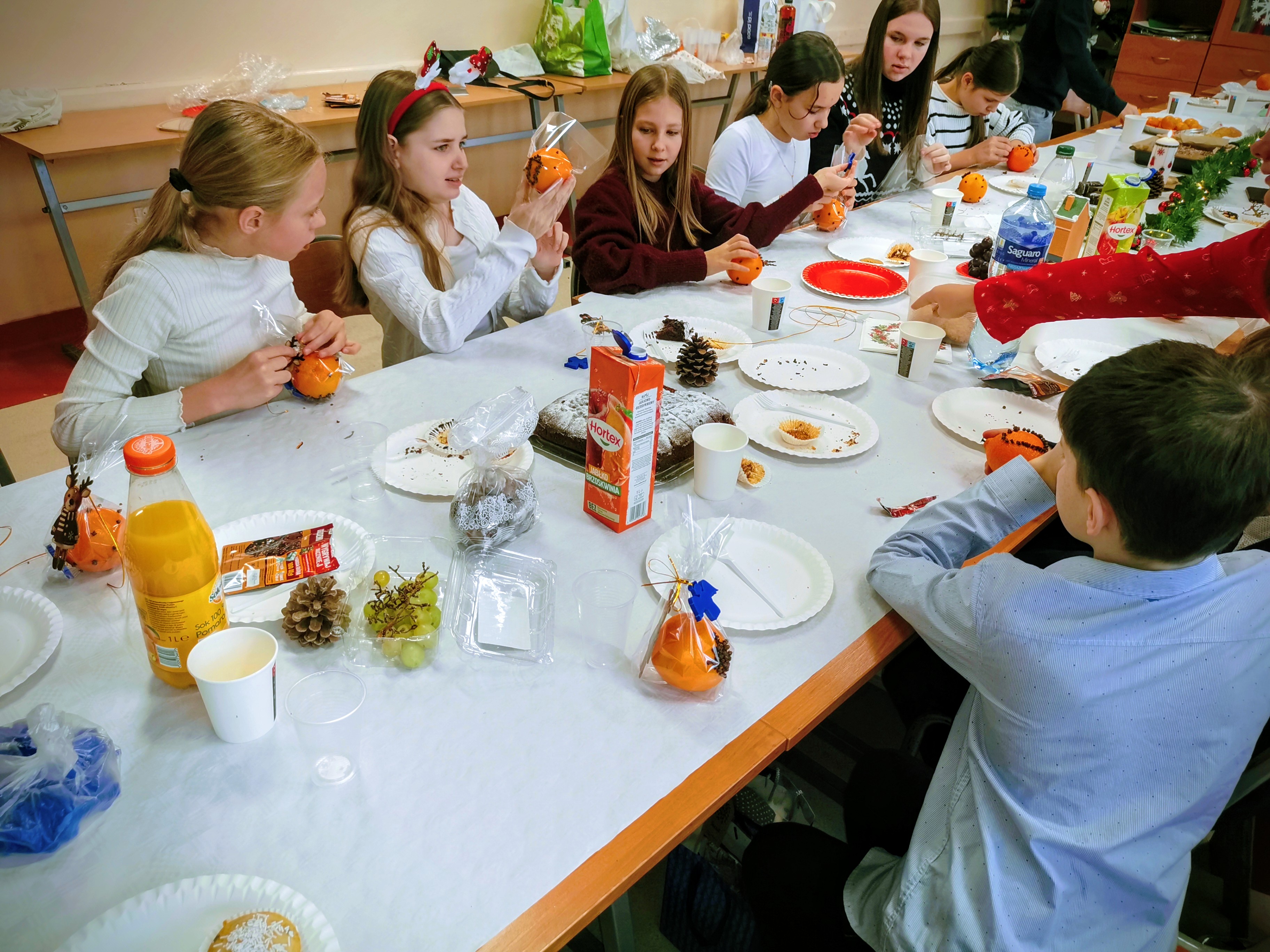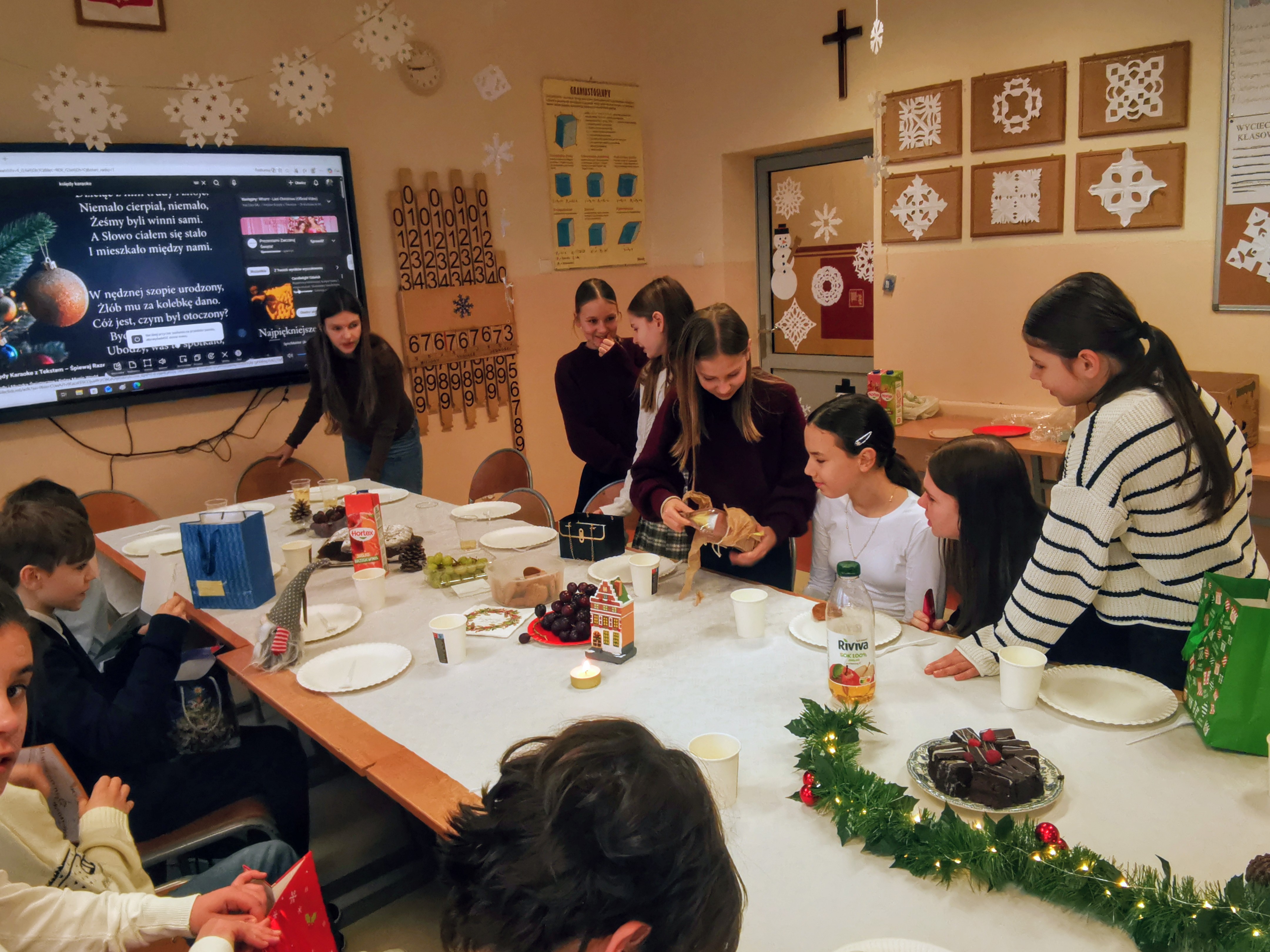 Odwiedziła nas także pani Marzenka, nasza wychowawczyni z klas I–III, co sprawiło nam ogromną radość. Przy dźwiękach kolęd wykonaliśmy aromatyczną ozdobę świąteczną, którą po zapakowaniu zabraliśmy do naszych domów. Na zakończenie uczestniczyliśmy w koncercie kolęd i pastorałek. Wystąpiły w nim nasze koleżanki Lena i Natalia oraz wyrecytowały wiersze o tematyce świątecznej w języku angielskim. Był to piękny i bardzo świąteczny dzień.