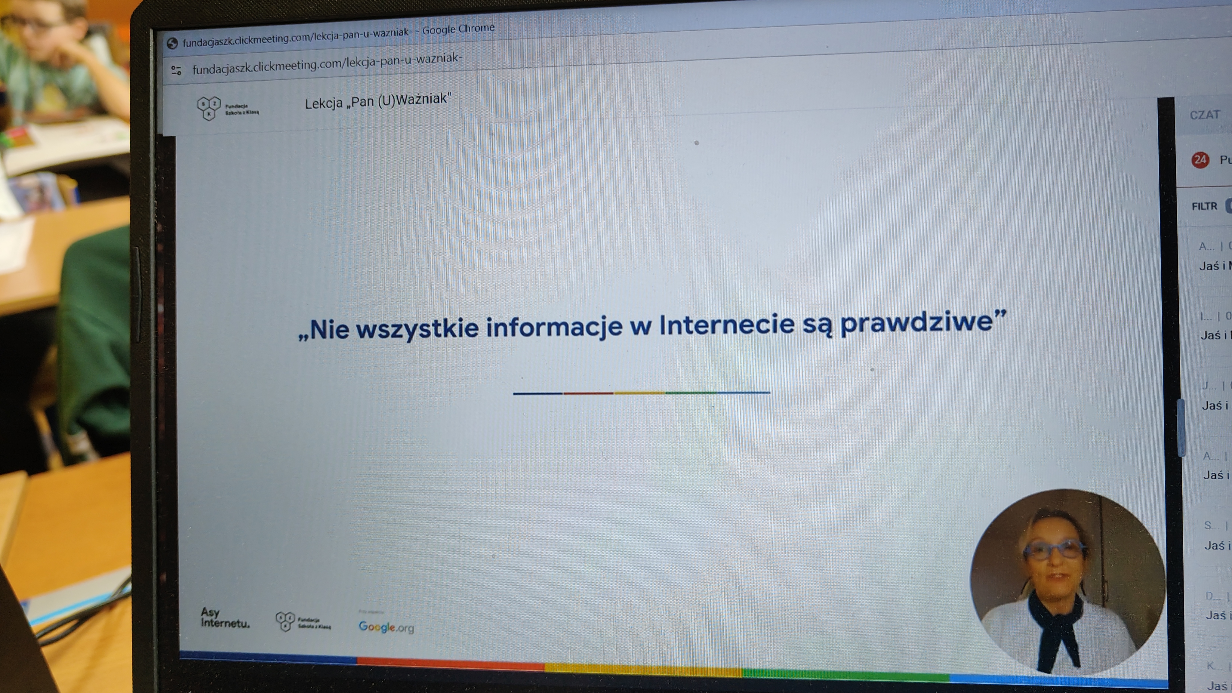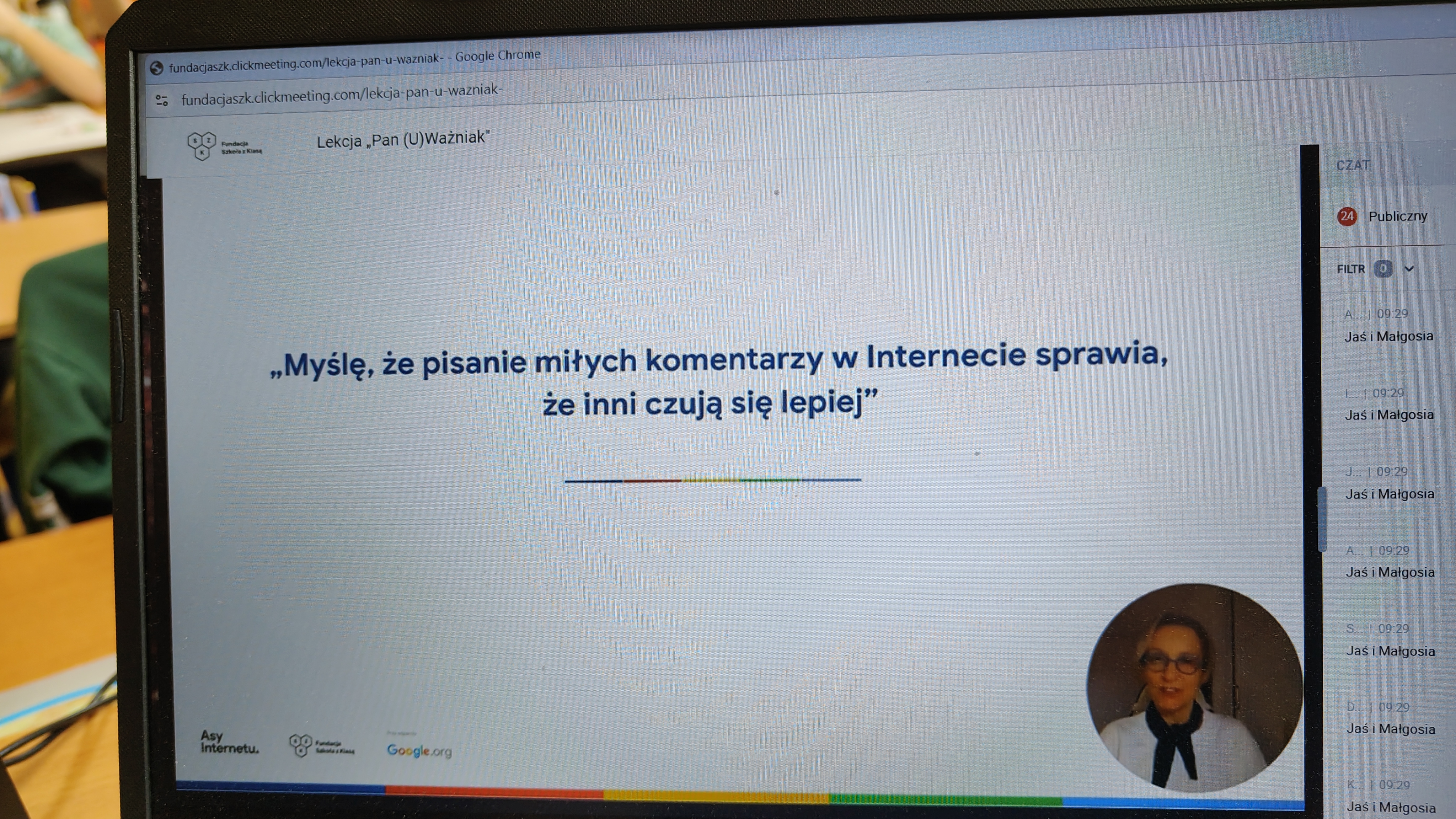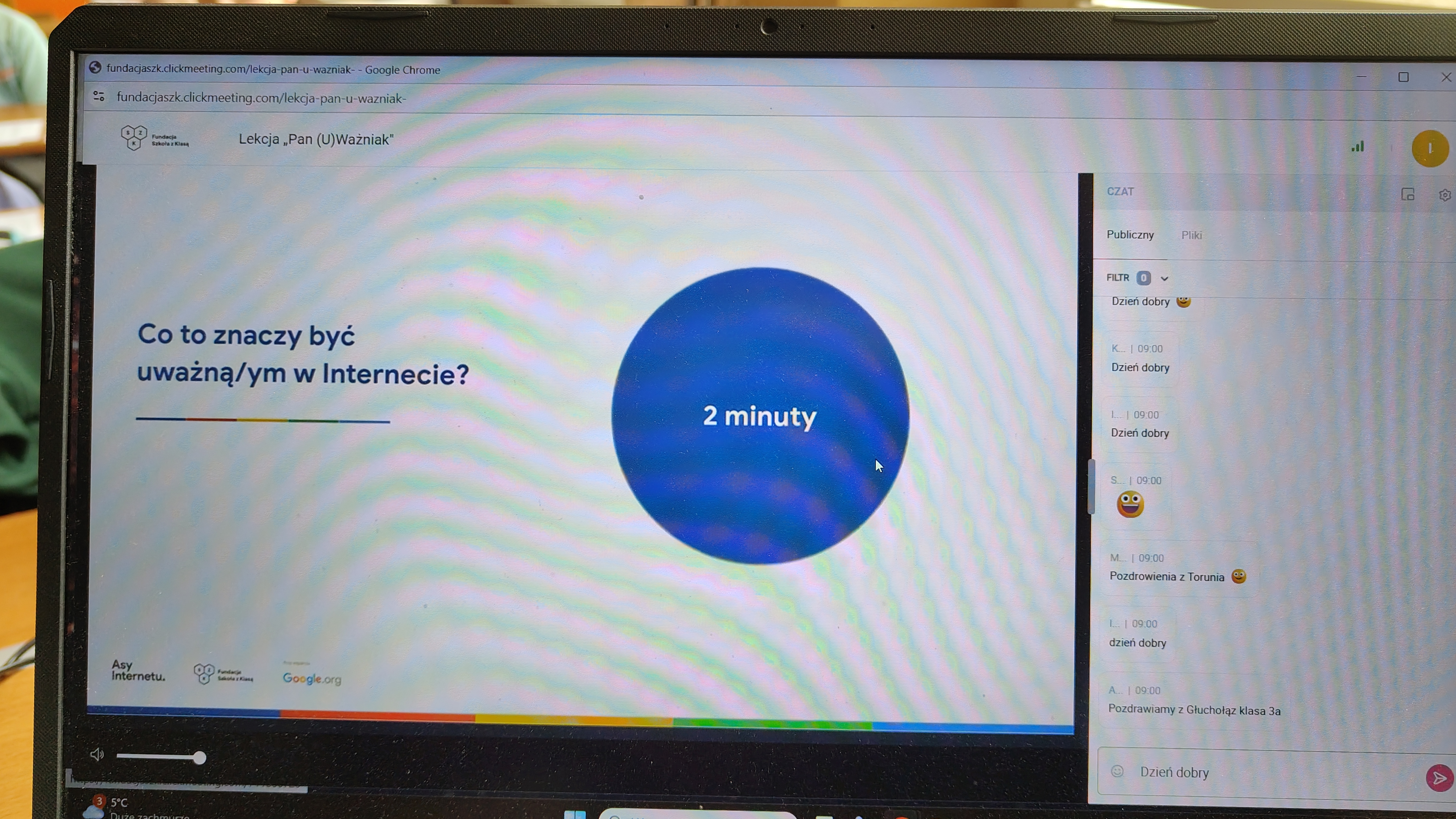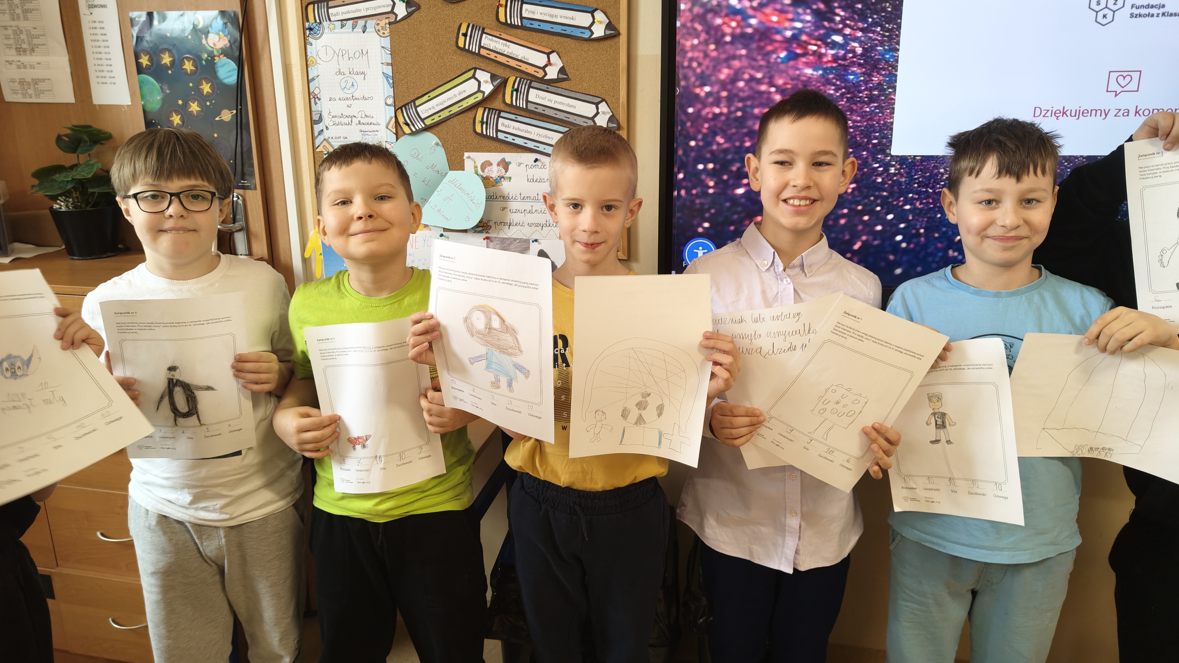 We wtorek 03.03. uczniowie klasy 2 a uczestniczyli w tegorocznej edycji Konferencji Asów Internetu, organizowanej przez Fundację Szkoła z Klasą! Wydarzenie realizowane jest w ramach programu Asy Internetu, który skupia się na kształtowaniu cyfrowego obywatelstwa i korzystania z internetu w sposób świadomy i odpowiedzialny. Program jest realizowany przy wsparciu Google.org. Zajęcia miały charakter online, a temat lekcji brzmiał: "Co to znaczy być uważnym w Internecie?". Bohaterem spotkania był Pan U(Ważniak), który w czasie huraganu zgubił literkę "U" i został przemądrzałym i nieuważnym Ważniakiem. Na szczęście dzięki pomocy uczniów, którzy z zapałem wykonywali interaktywne zadania, proponowane przez prowadzącą, nasz bohater odnalazł literkę "U" i wrócił do Interlandii -krainy Internetu, po której znów mógł poruszać się z uważnością, aby czuć się bezpiecznie. Z pewnością były to atrakcyjne, a zarazem pouczające zajęcia, dotyczące bezpiecznego korzystania z Internetu przez najmłodszych. Wych. Iwona Birunt