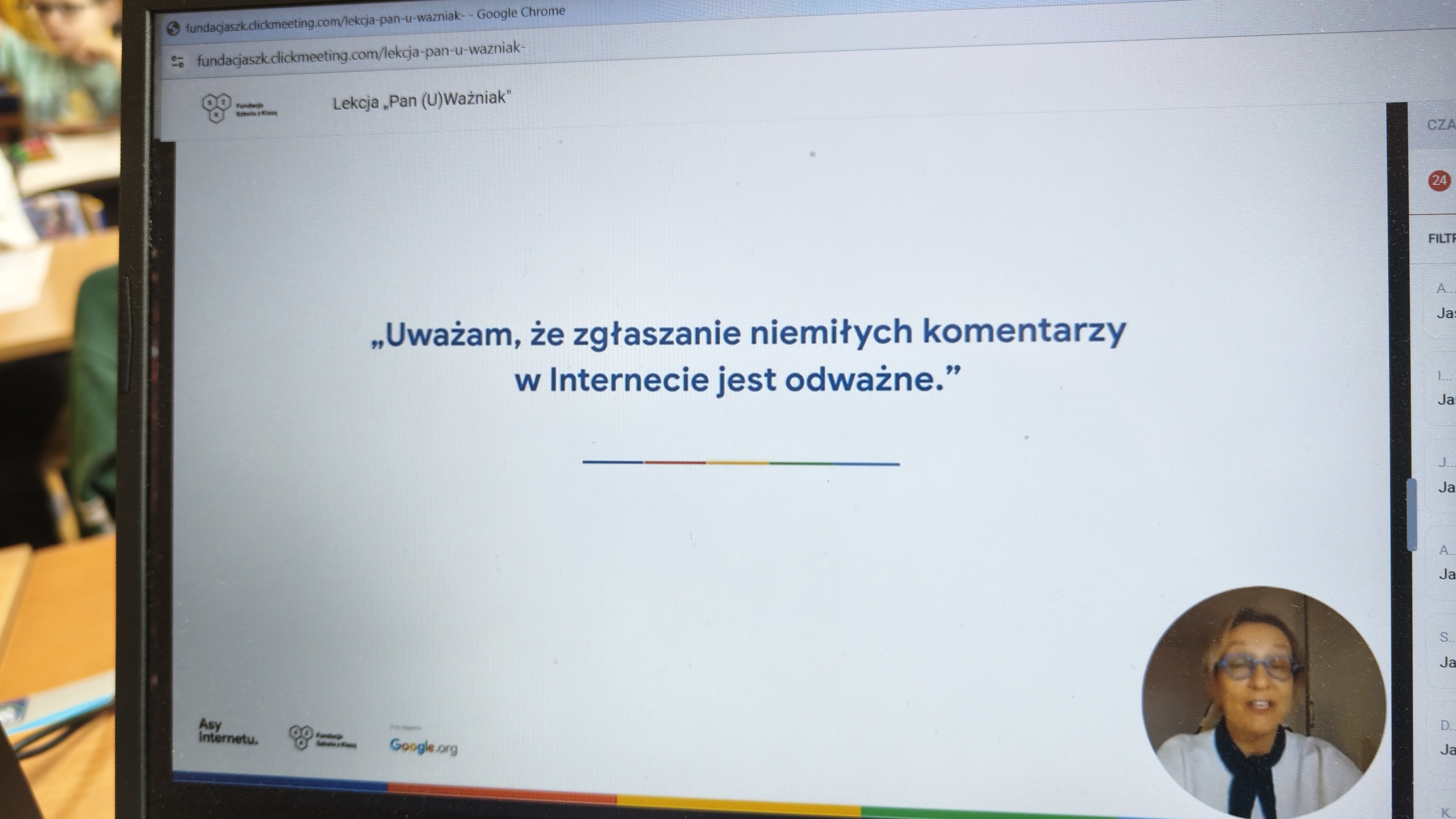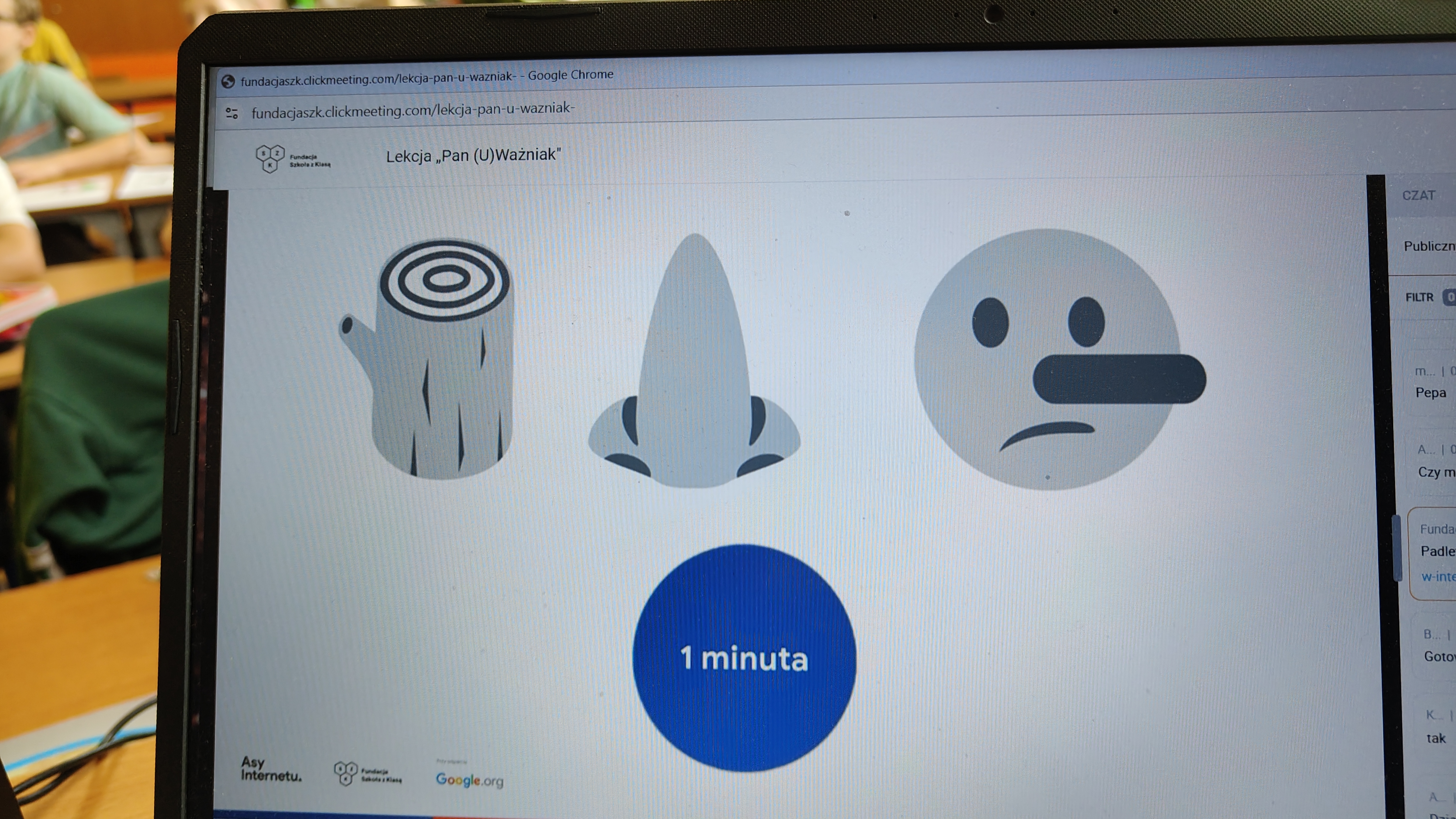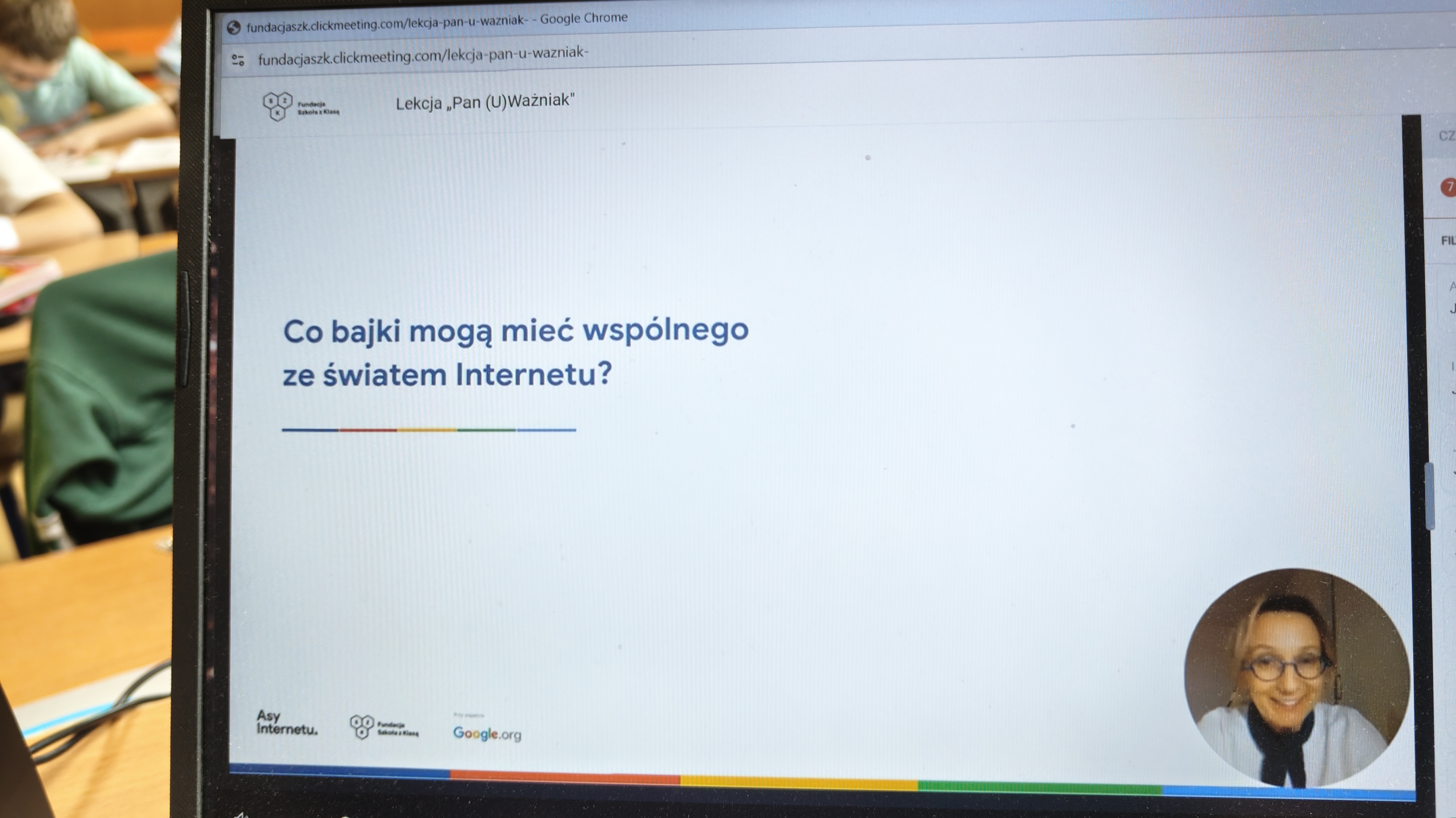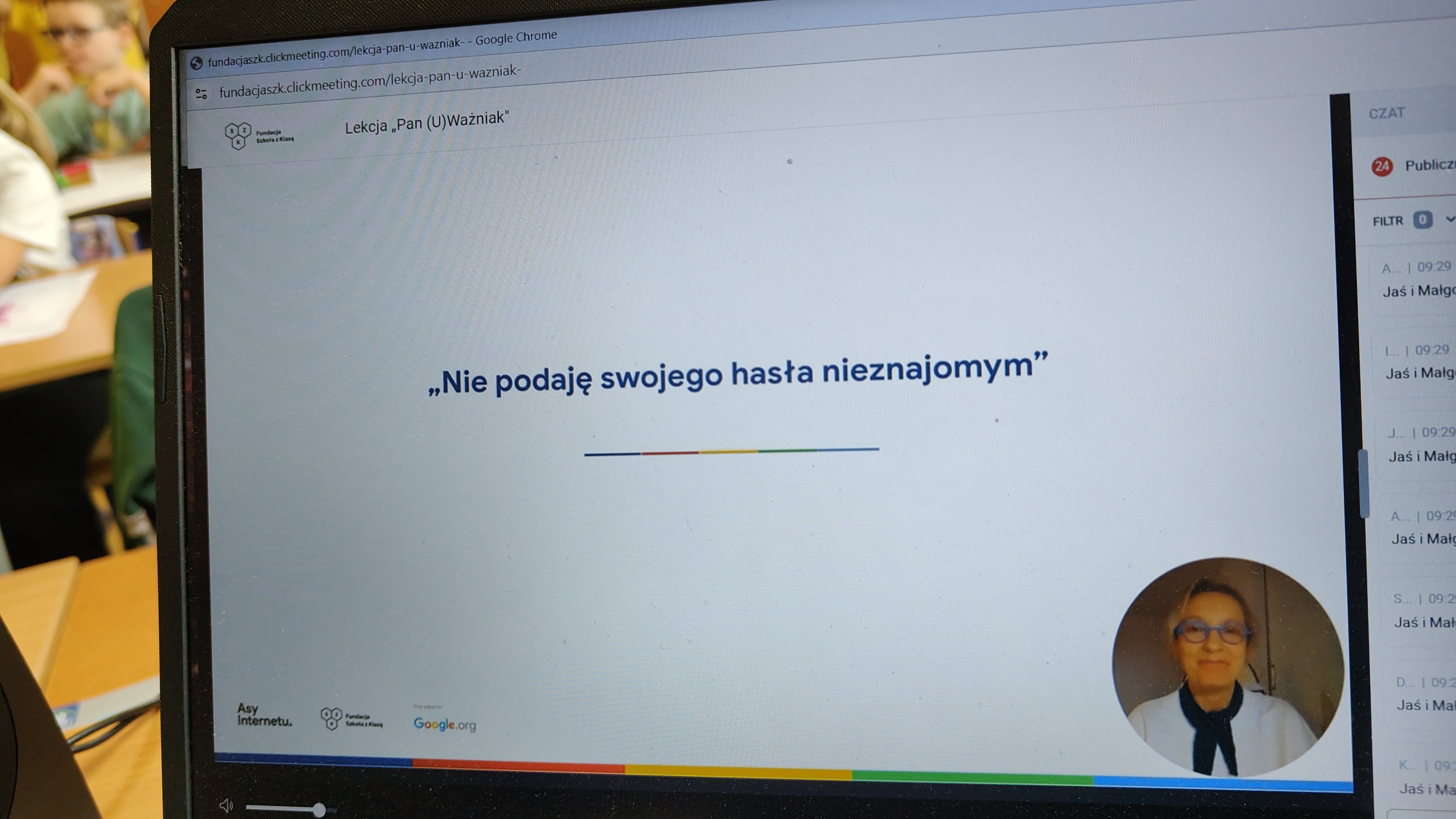 We wtorek 03.03. uczniowie klasy 2 a uczestniczyli w tegorocznej edycji Konferencji Asów Internetu, organizowanej przez Fundację Szkoła z Klasą! Wydarzenie realizowane jest w ramach programu Asy Internetu, który skupia się na kształtowaniu cyfrowego obywatelstwa i korzystania z internetu w sposób świadomy i odpowiedzialny. Program jest realizowany przy wsparciu Google.org. Zajęcia miały charakter online, a temat lekcji brzmiał: "Co to znaczy być uważnym w Internecie?". Bohaterem spotkania był Pan U(Ważniak), który w czasie huraganu zgubił literkę "U" i został przemądrzałym i nieuważnym Ważniakiem. Na szczęście dzięki pomocy uczniów, którzy z zapałem wykonywali interaktywne zadania, proponowane przez prowadzącą, nasz bohater odnalazł literkę "U" i wrócił do Interlandii -krainy Internetu, po której znów mógł poruszać się z uważnością, aby czuć się bezpiecznie. Z pewnością były to atrakcyjne, a zarazem pouczające zajęcia, dotyczące bezpiecznego korzystania z Internetu przez najmłodszych. Wych. Iwona Birunt