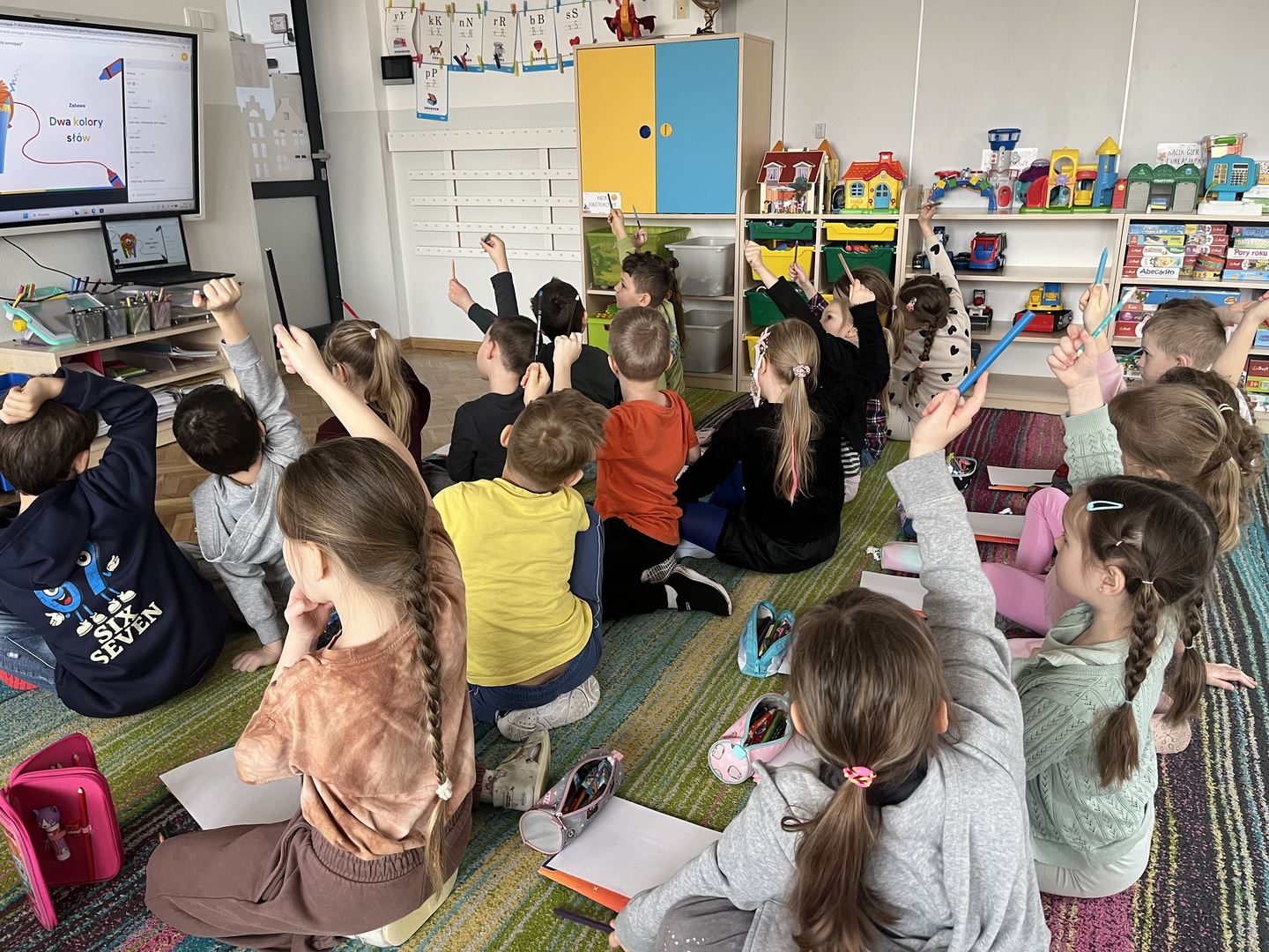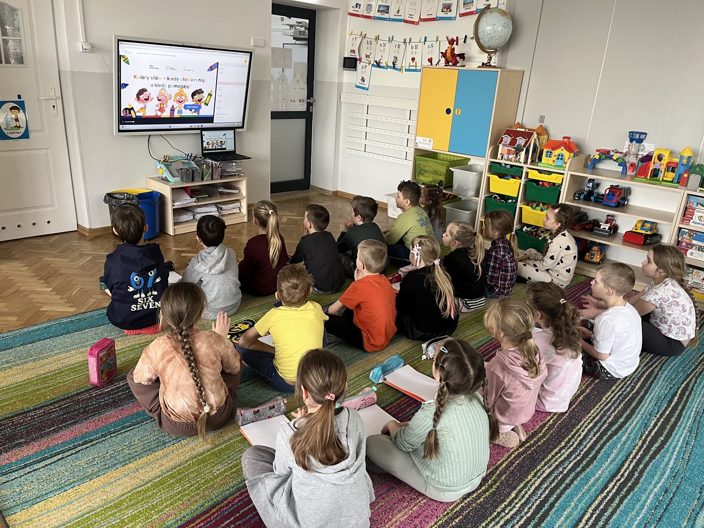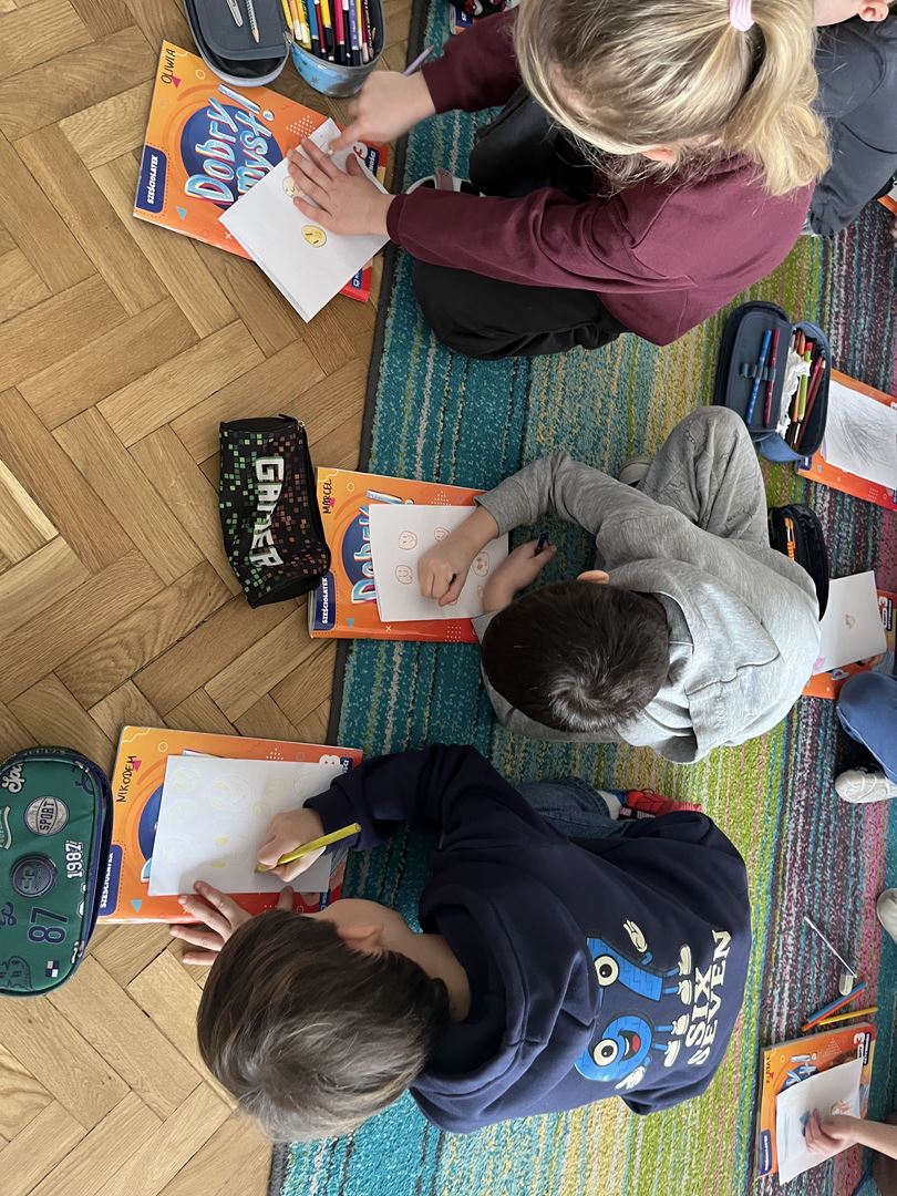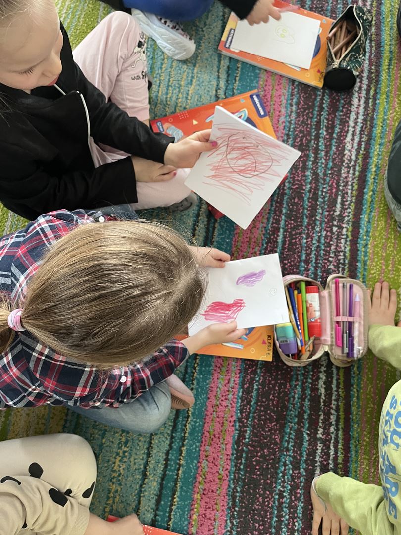 W ramach realizacji programu Asy Internetu grupa 0b brała udział w zajęcia online pt. „Kolory słów – kiedy słowa ranią, a kiedy pomagają”. Spotkanie rozpoczęło się od rozmowy o znaczeniu słów oraz o tym, jaki mają wpływ na nasze emocje. Dzieci opowiadały, jak czują się, gdy słyszą miłe i wspierające komunikaty, a jak wtedy, gdy ktoś mówi coś przykrego. Do części plastycznej dzieci wcześniej przygotowały kartki i kredki. Następnie wysłuchały opowiadania o słowach zmieniających kolory. W historii dobre, życzliwe słowa rozjaśniały świat jasnymi barwami, natomiast te raniące sprawiały, że kolory stawały się ciemne i smutne. Opowieść stała się inspiracją do dalszej rozmowy o emocjach oraz o tym, jak nasze wypowiedzi wpływają na innych. Dzieci chętnie podawały przykłady słów, które budują i pomagają, a także takich, które mogą sprawić komuś przykrość. W pracy plastycznej przedstawiły „kolory słów”, pokazując za pomocą barw emocje wywoływane przez dobre i złe komunikaty. Zajęcia uświadomiły dzieciom, że słowa mają ogromną moc – mogą ranić, ale mogą też wspierać, dodawać odwagi i sprawiać radość.