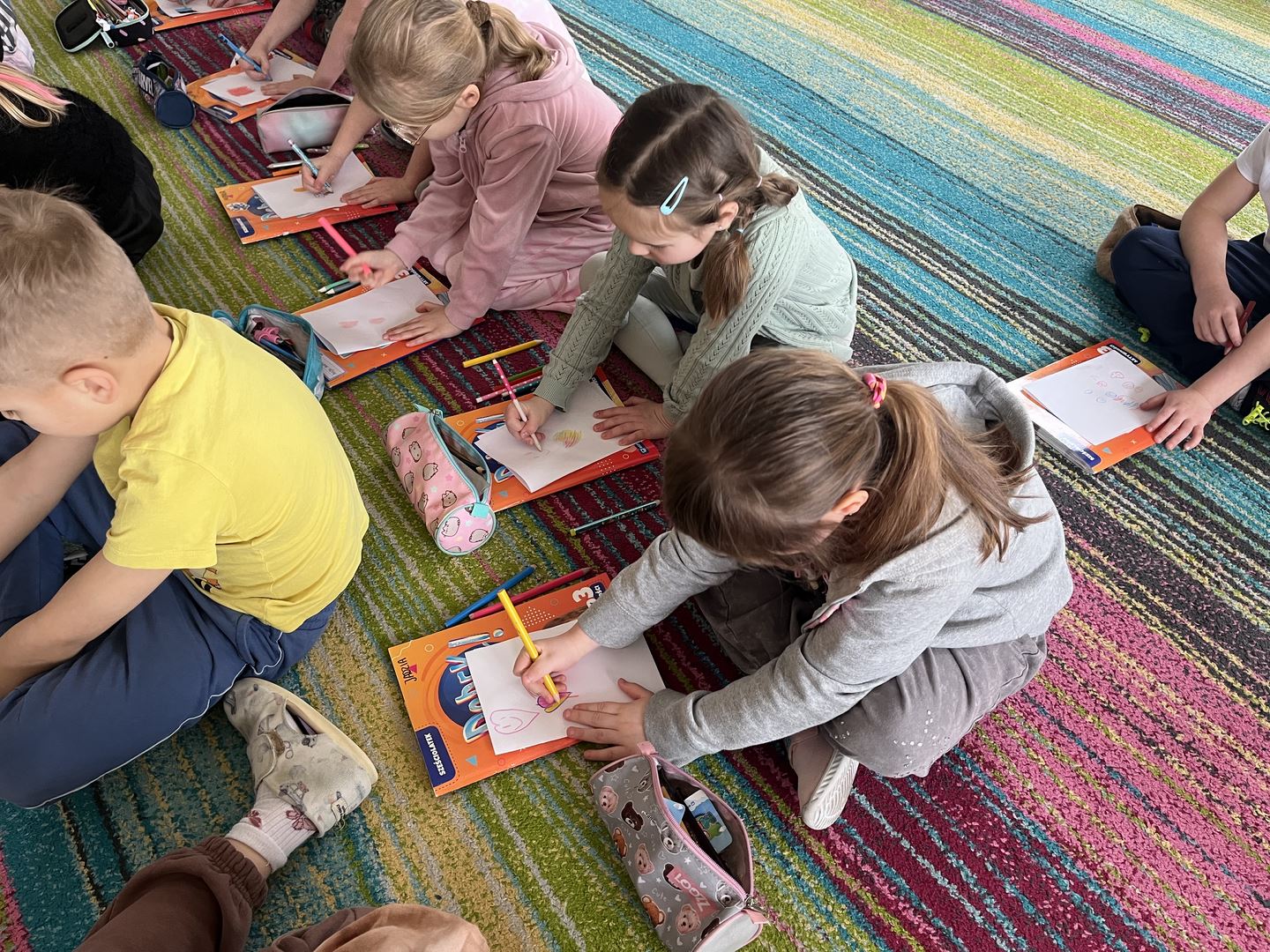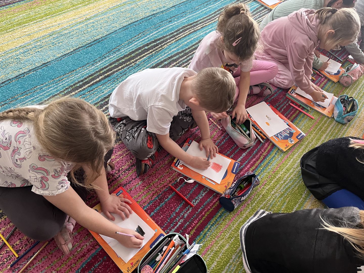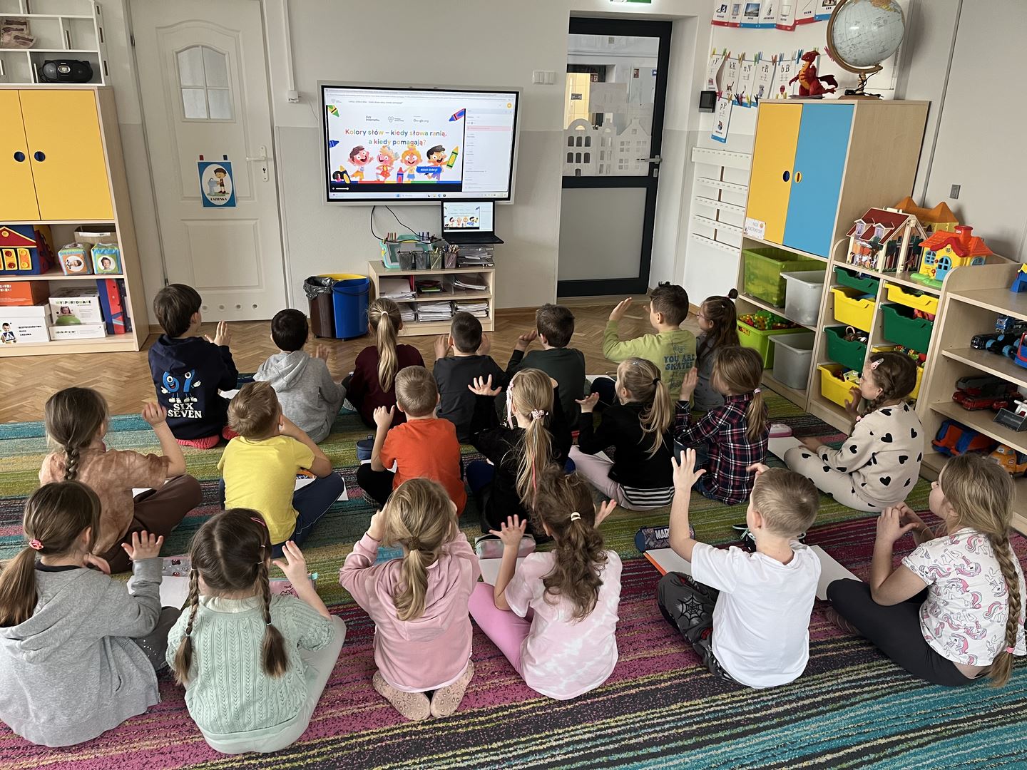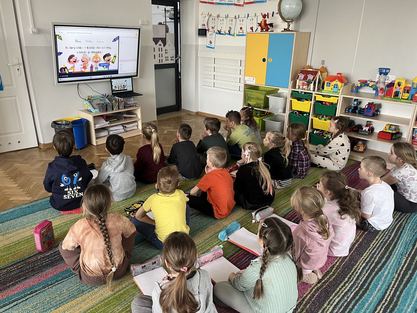 W ramach realizacji programu Asy Internetu grupa 0b brała udział w zajęcia online pt. „Kolory słów – kiedy słowa ranią, a kiedy pomagają”. Spotkanie rozpoczęło się od rozmowy o znaczeniu słów oraz o tym, jaki mają wpływ na nasze emocje. Dzieci opowiadały, jak czują się, gdy słyszą miłe i wspierające komunikaty, a jak wtedy, gdy ktoś mówi coś przykrego. Do części plastycznej dzieci wcześniej przygotowały kartki i kredki. Następnie wysłuchały opowiadania o słowach zmieniających kolory. W historii dobre, życzliwe słowa rozjaśniały świat jasnymi barwami, natomiast te raniące sprawiały, że kolory stawały się ciemne i smutne. Opowieść stała się inspiracją do dalszej rozmowy o emocjach oraz o tym, jak nasze wypowiedzi wpływają na innych. Dzieci chętnie podawały przykłady słów, które budują i pomagają, a także takich, które mogą sprawić komuś przykrość. W pracy plastycznej przedstawiły „kolory słów”, pokazując za pomocą barw emocje wywoływane przez dobre i złe komunikaty. Zajęcia uświadomiły dzieciom, że słowa mają ogromną moc – mogą ranić, ale mogą też wspierać, dodawać odwagi i sprawiać radość.