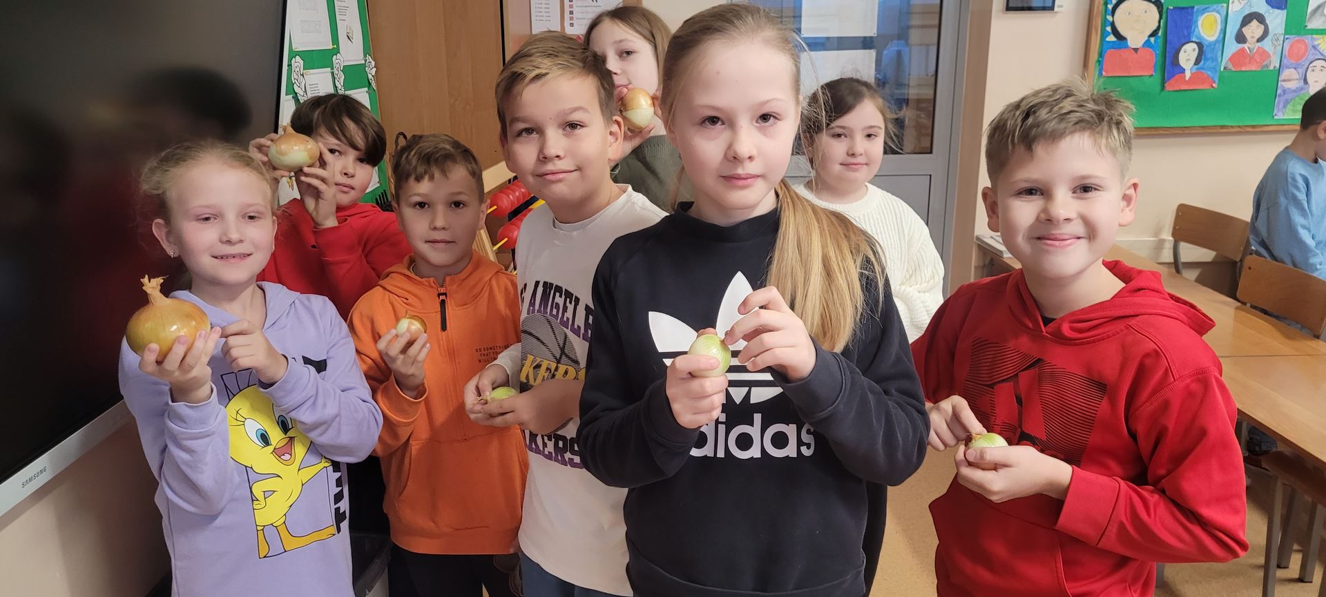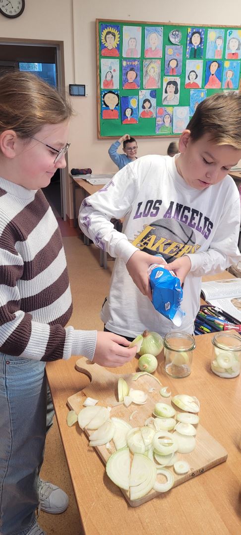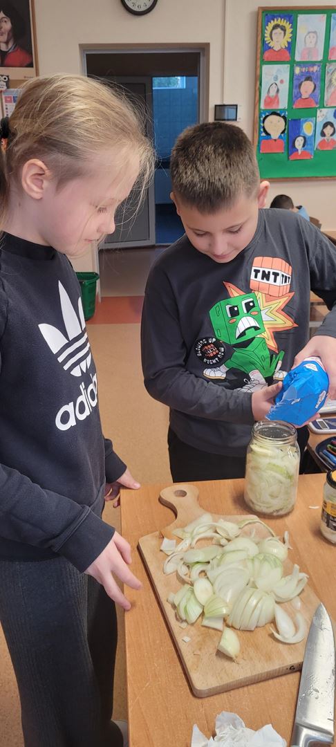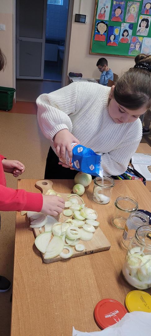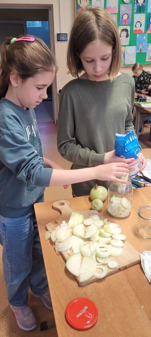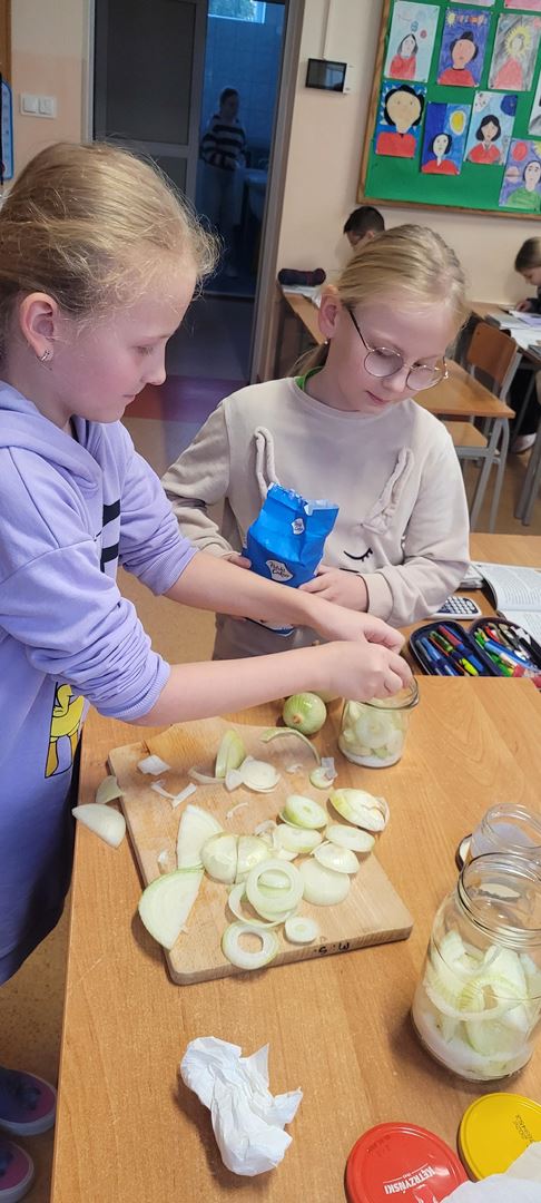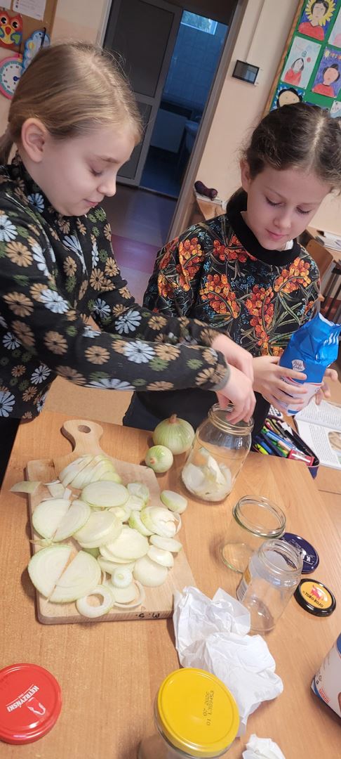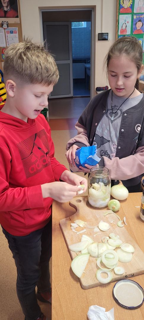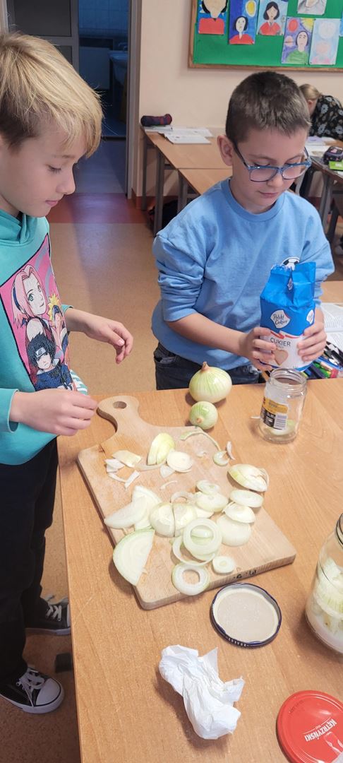 Uczniowie poznawali dobre nawyki dbania o zdrowie poprzez wspólne działanie. Podczas zajęć kroili cebulę i przygotowywali naturalny syrop, ucząc się, że natura może wspierać naszą odporność. Dzieci z zaangażowaniem uczestniczyły w pracy, próbowały nowych rzeczy i zdobywały praktyczne umiejętności, rozwijając jednocześnie świadomość zdrowego stylu życia.