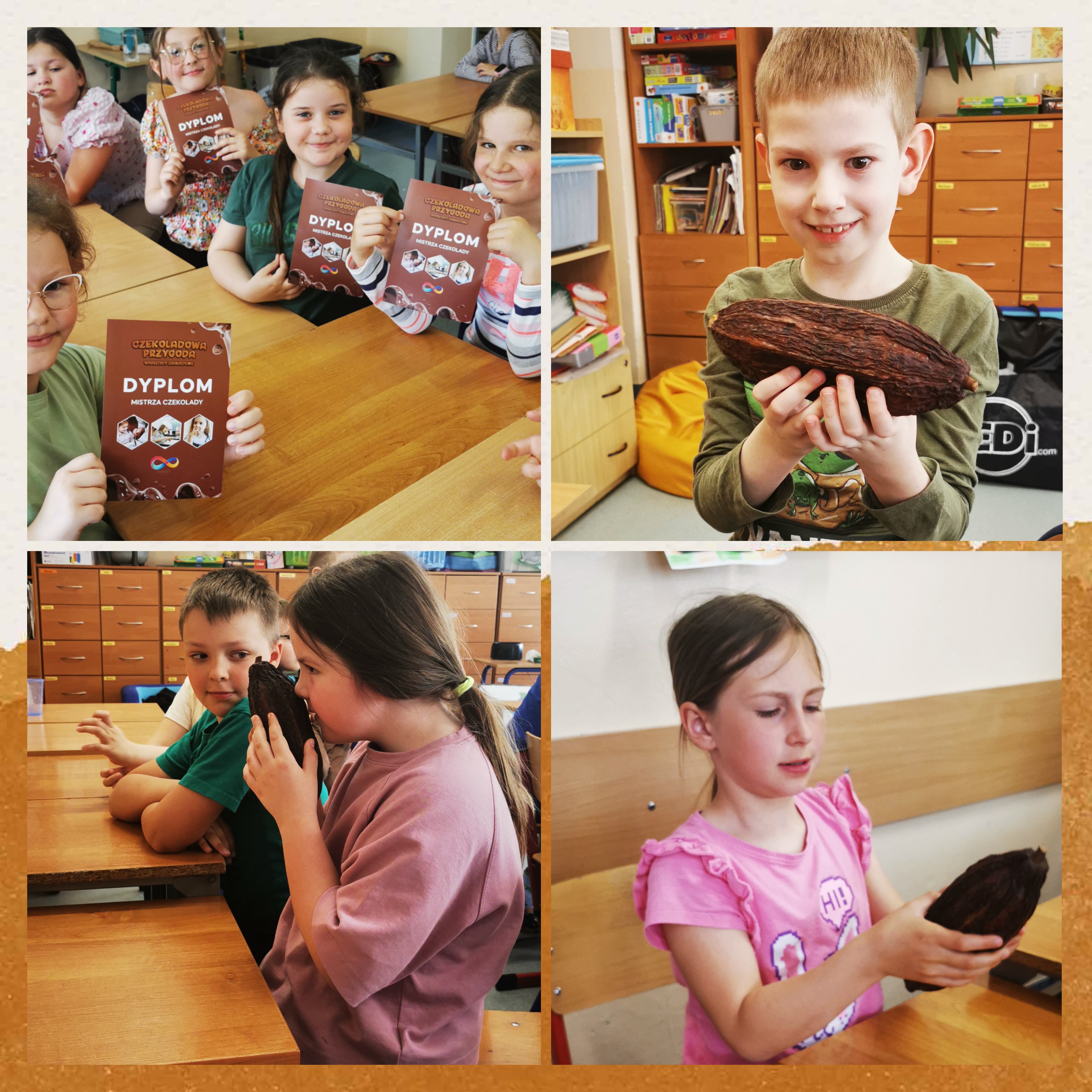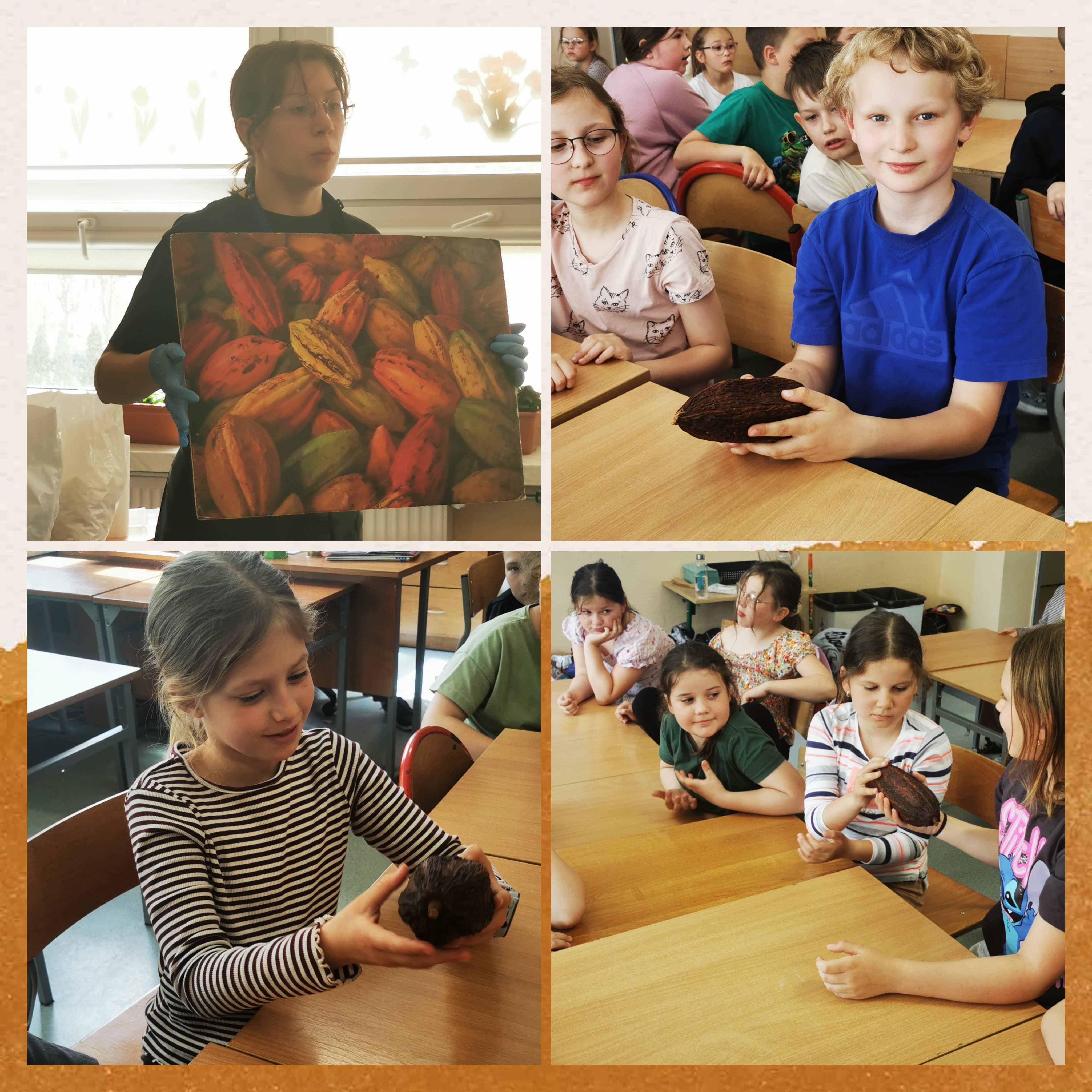 6 maja od pierwszych chwil w klasie nie mogliśmy się doczekać zaproszonych gości. Na szczęście wybiła długo wyczekiwana chwila. Prowadzący warsztaty opowiedzili nam o najważniejszych składnikach czekolady. Każdy z nas miał możliwość wirtualnie wybrać się w ,,tropikalną podróż" i zobaczyć, jak wygląda owoc kakaowca. Poznaliśmy wiele ciekawostek dotyczących kakao, z którego powstaje czekolada.