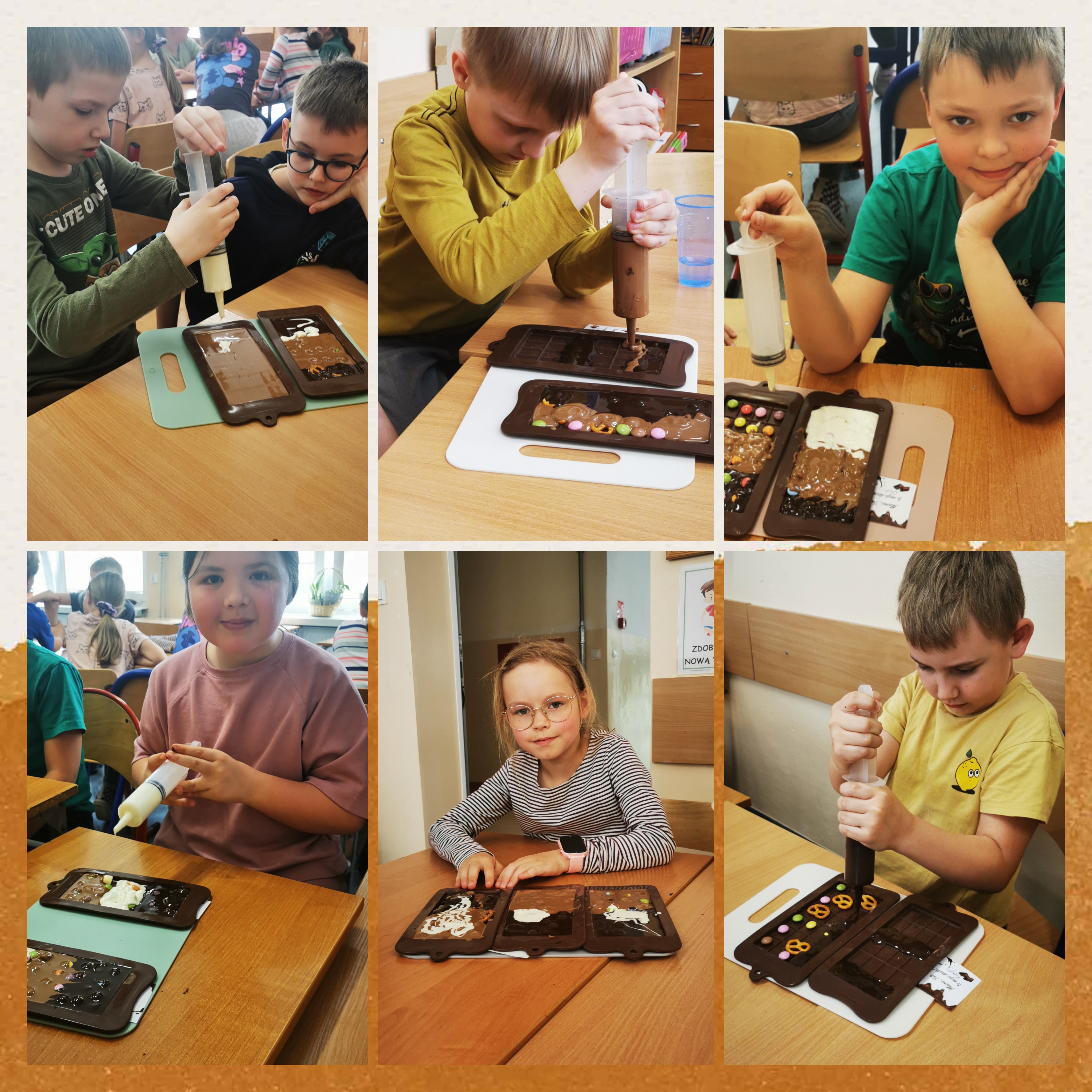 Następnie mogliśmy wykonać swoje własne tabliczki. Za pomocą dozowników napełnialiśmy formy. Mogliśmy je dodatkowo udekorować słodkościami, precelkami, a nawet suszonymi owocami. Po dokładnym napełnieniu formy musieliśmy cierpliwie odczekać, aż nasza czekolada stężeje. Następnie starannie pakowaliśmy ją do specjalnych woreczków. Czy udało nam się donieść czekoladę do domu bez kosztowania? Oczywiście nie... Każdy ugryzł, odłamał kawałek, by posmakować swoich słodkości. Mniam.
