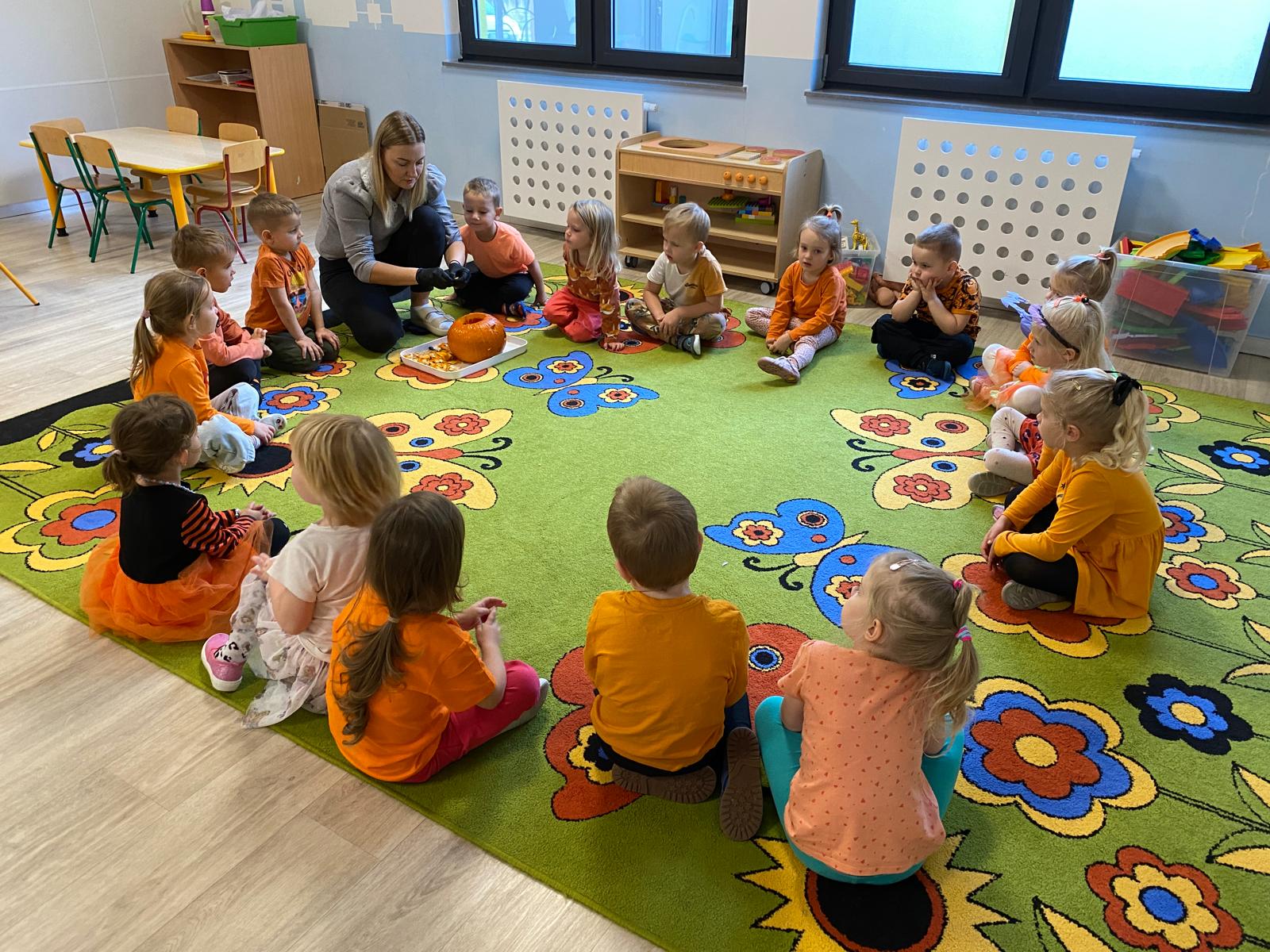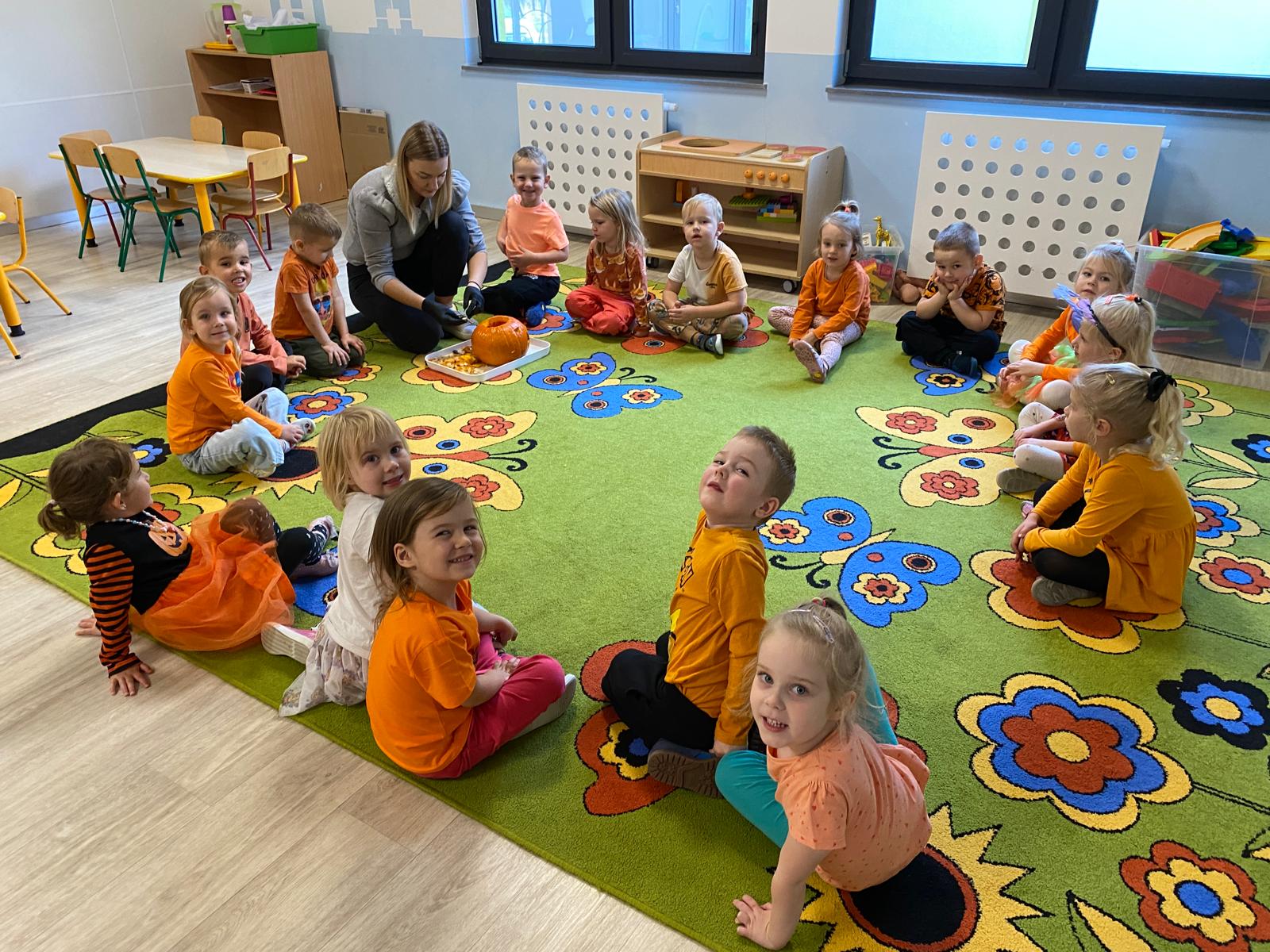 Był to wyjątkowy dzień pełen zabawy, nauki i radości. Dzieci poznały wiele ciekawostek o dyni – dowiedziały się, skąd pochodzi, jakie ma odmiany oraz do czego można ją wykorzystać w kuchni i w zabawie.