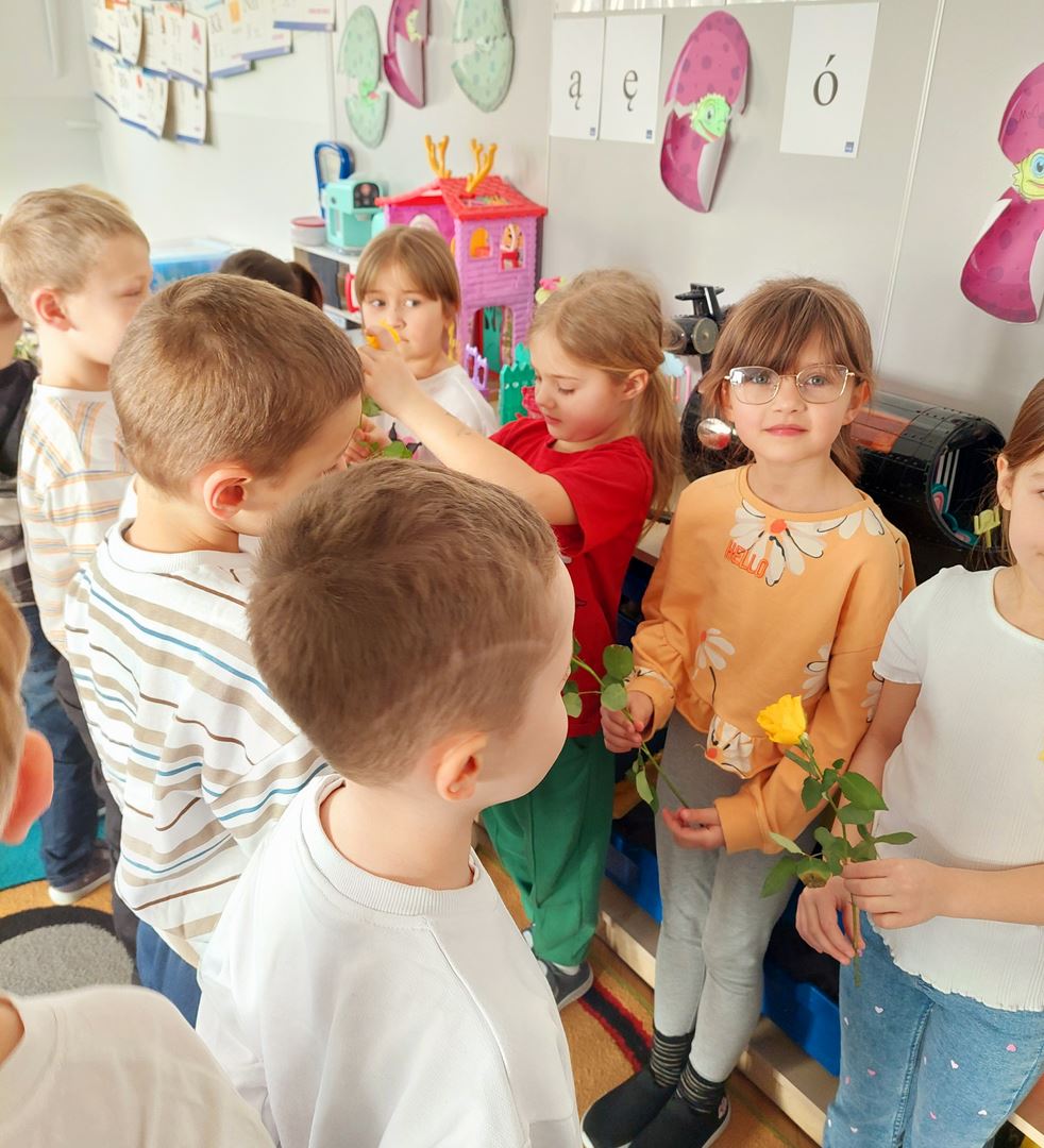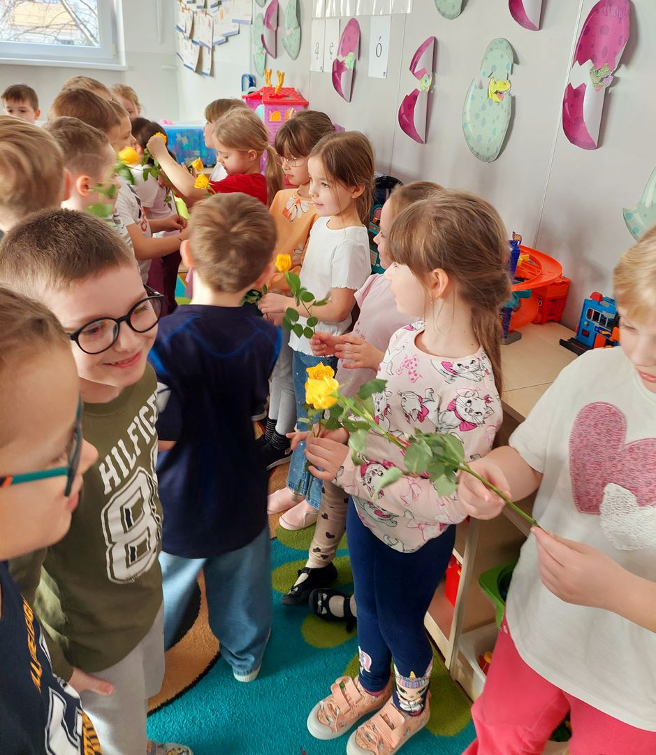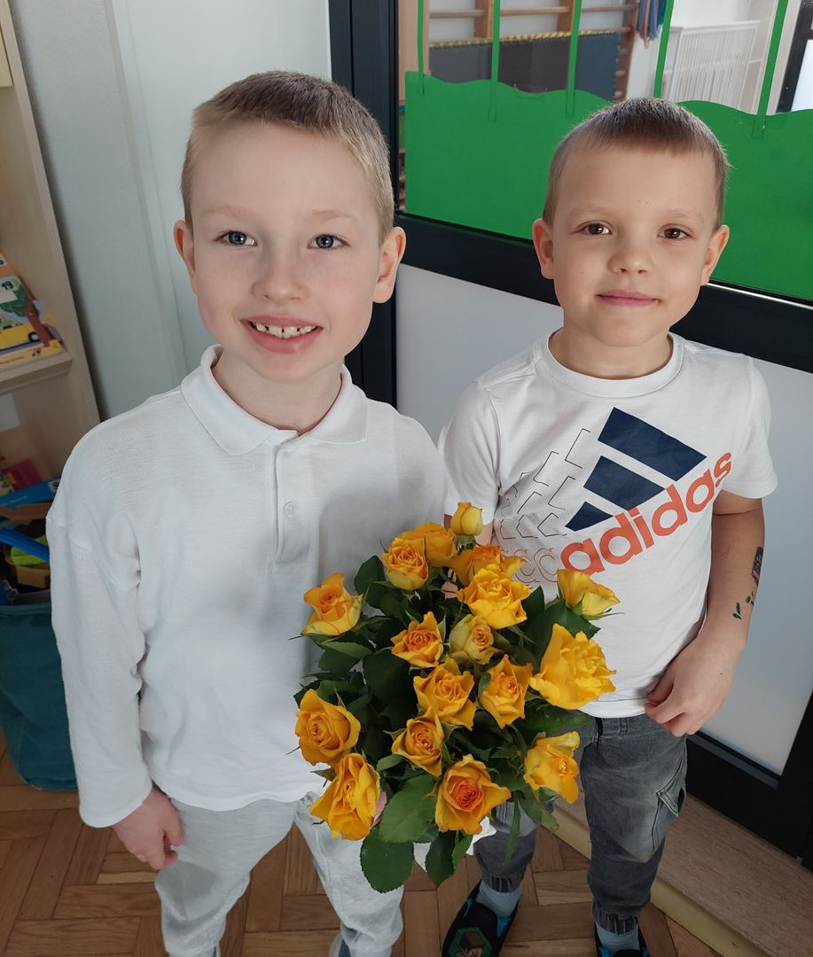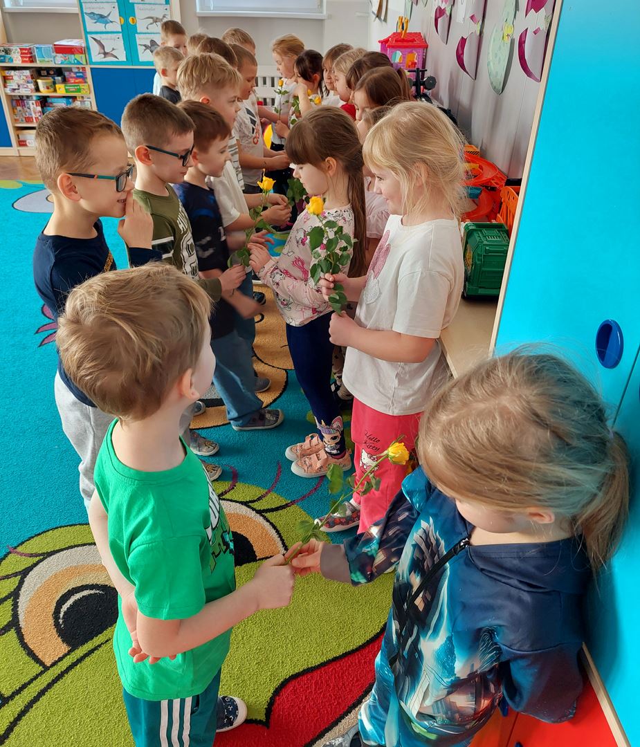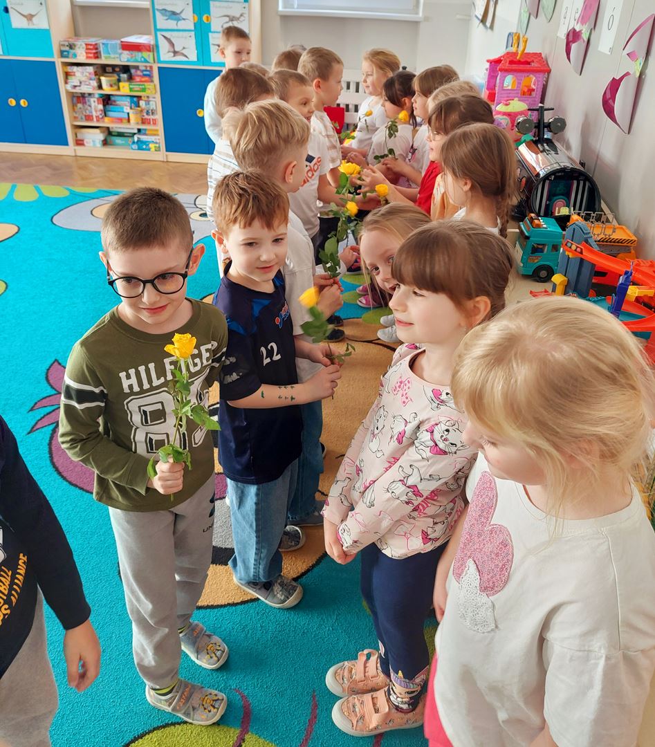 Z tej okazji wszyscy chłopcy wręczyli dziewczynkom piękne róże, sprawiając im wiele radości. Delegacja z naszej grupy udała się również z kwiatami do Pani Dyrektor oraz wszystkich Pań pracujących w budynku przedszkola, aby podziękować im za ich codzienną troskę i uśmiech.