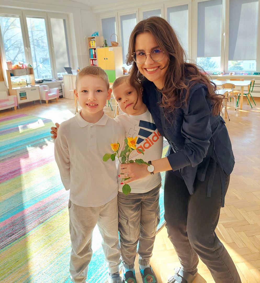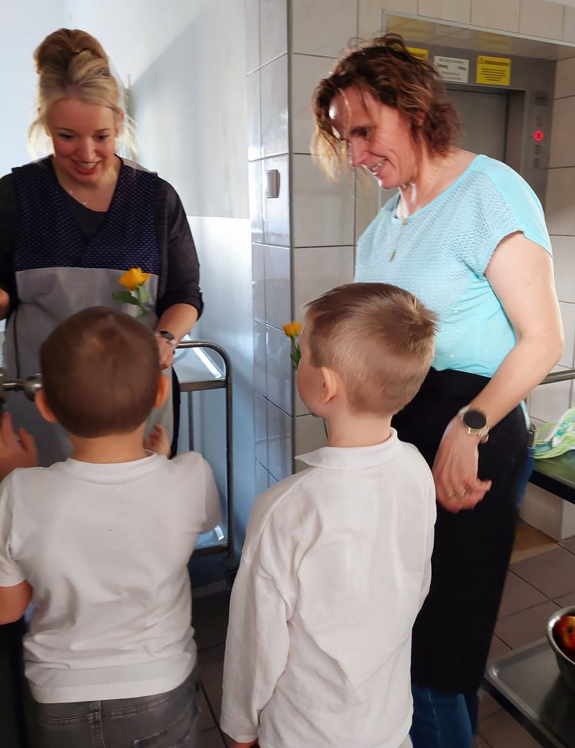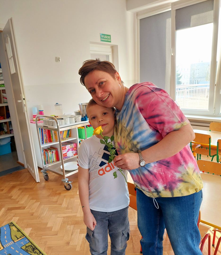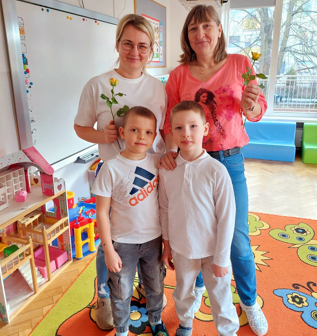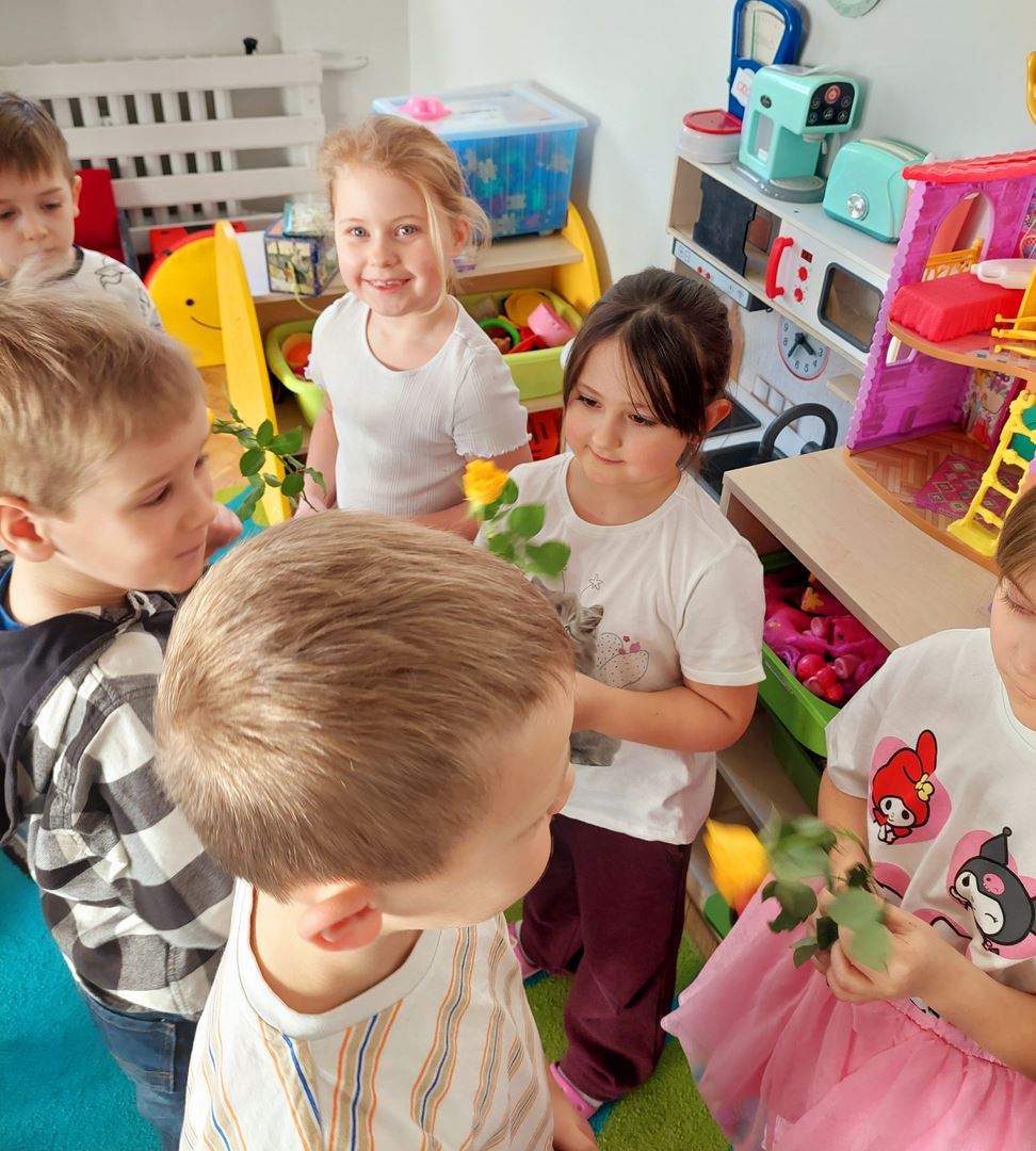Z tej okazji wszyscy chłopcy wręczyli dziewczynkom piękne róże, sprawiając im wiele radości. Delegacja z naszej grupy udała się również z kwiatami do Pani Dyrektor oraz wszystkich Pań pracujących w budynku przedszkola, aby podziękować im za ich codzienną troskę i uśmiech.