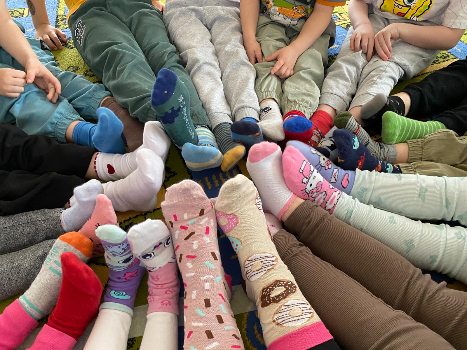 W naszym przedszkolu obchodziliśmy wyjątkowy Dzień Kolorowych Skarpetek – pełen radości, uśmiechu i ważnych rozmów o tolerancji oraz akceptacji różnorodności. Tego dnia dzieci przyszły w dwóch różnych, kolorowych skarpetkach, symbolizujących w ten sposób otwartość na inność i wyjątkowość każdego człowieka.