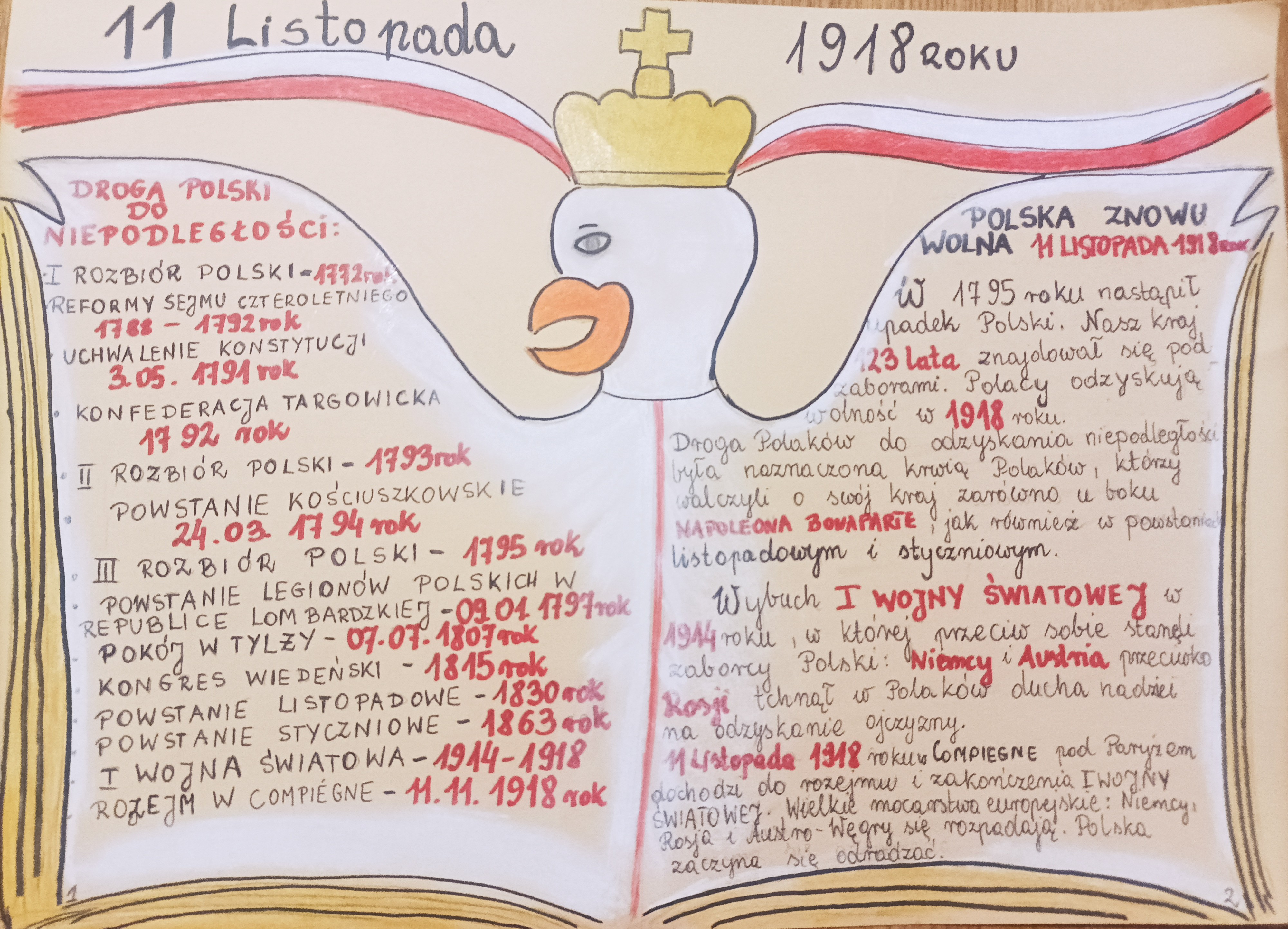 Z okazji zbliżajacego się Dnia Niepodległości na godzinie wychowawczej rozmawialismy o drodze Polski do odzyskania niepodległości. Wspominaliśmy o najważniejszych wydarzeniach historycznych- od rozbiorów i powstań narodowych po I wojnę światową i dzień 11 listopada kiedy Polska ponownie pojawiła się na mapie Europy.