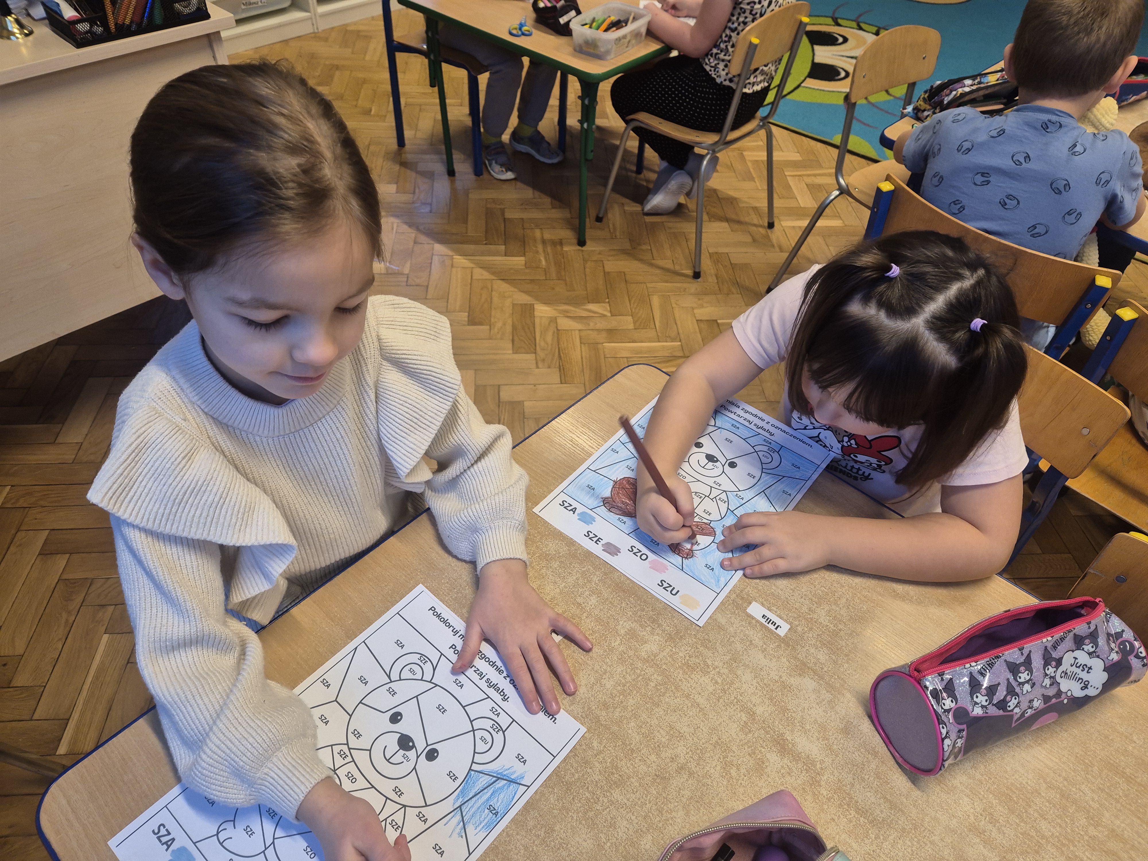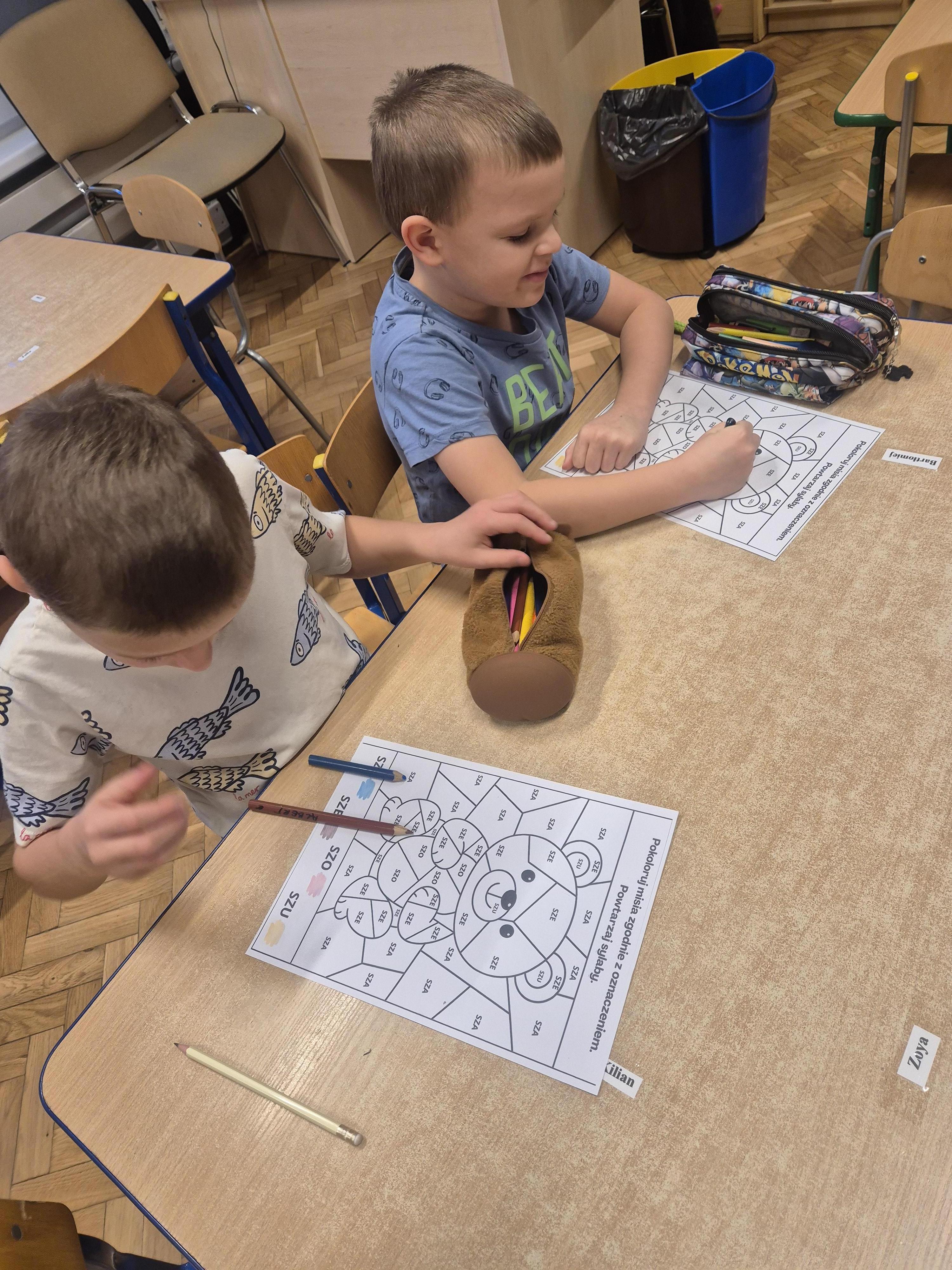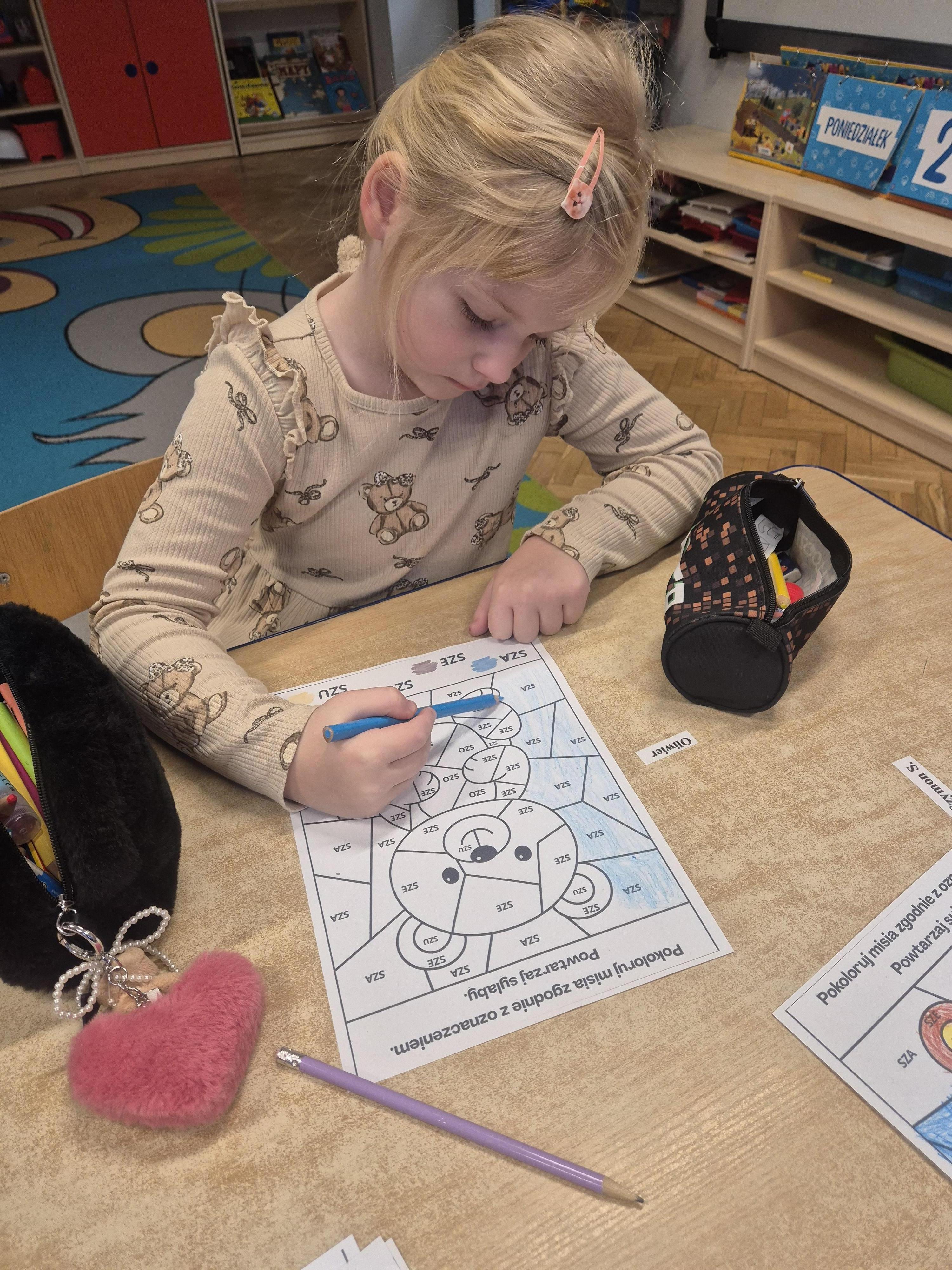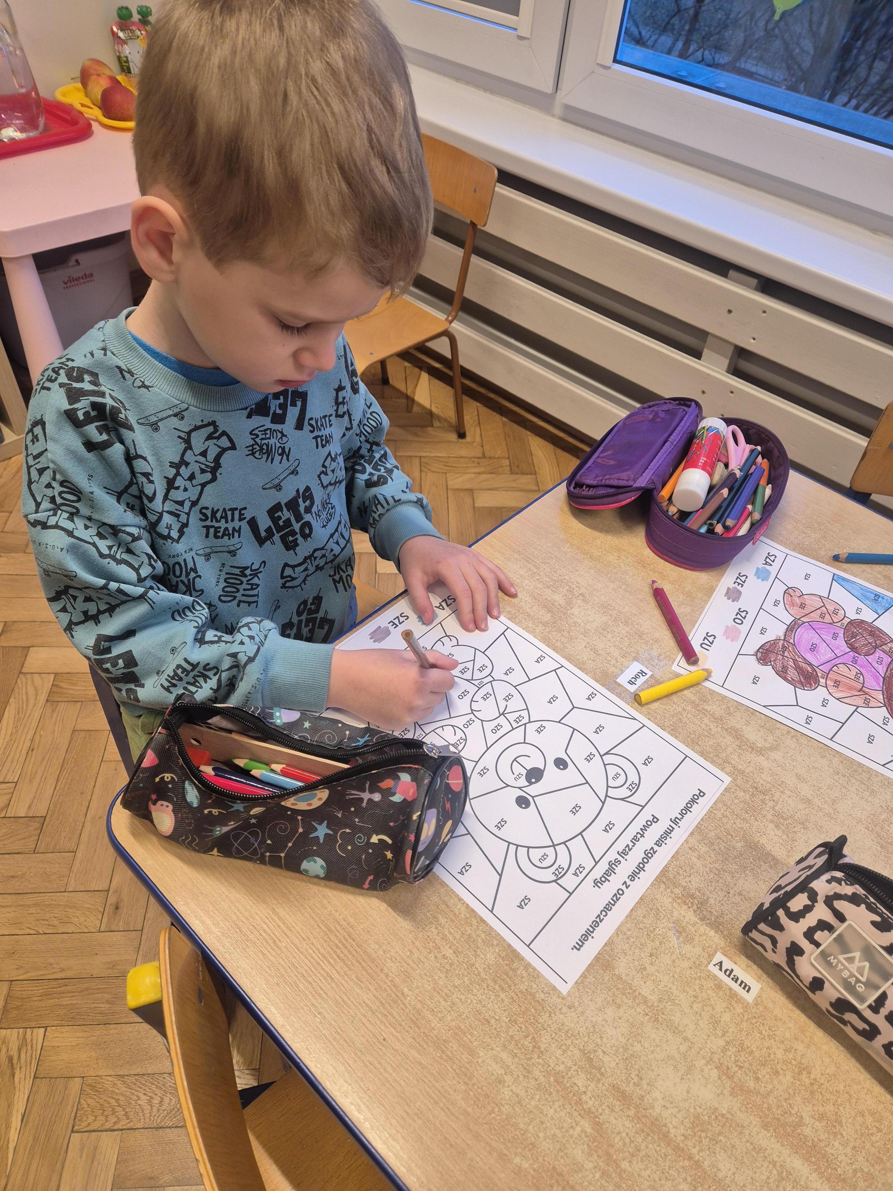 Wykonane zostały także karty pracy o tematyce misiowej. Dzieci chętnie opowiadały o swoich pluszakach, ćwicząc wypowiedzi i ucząc się słuchać innych.