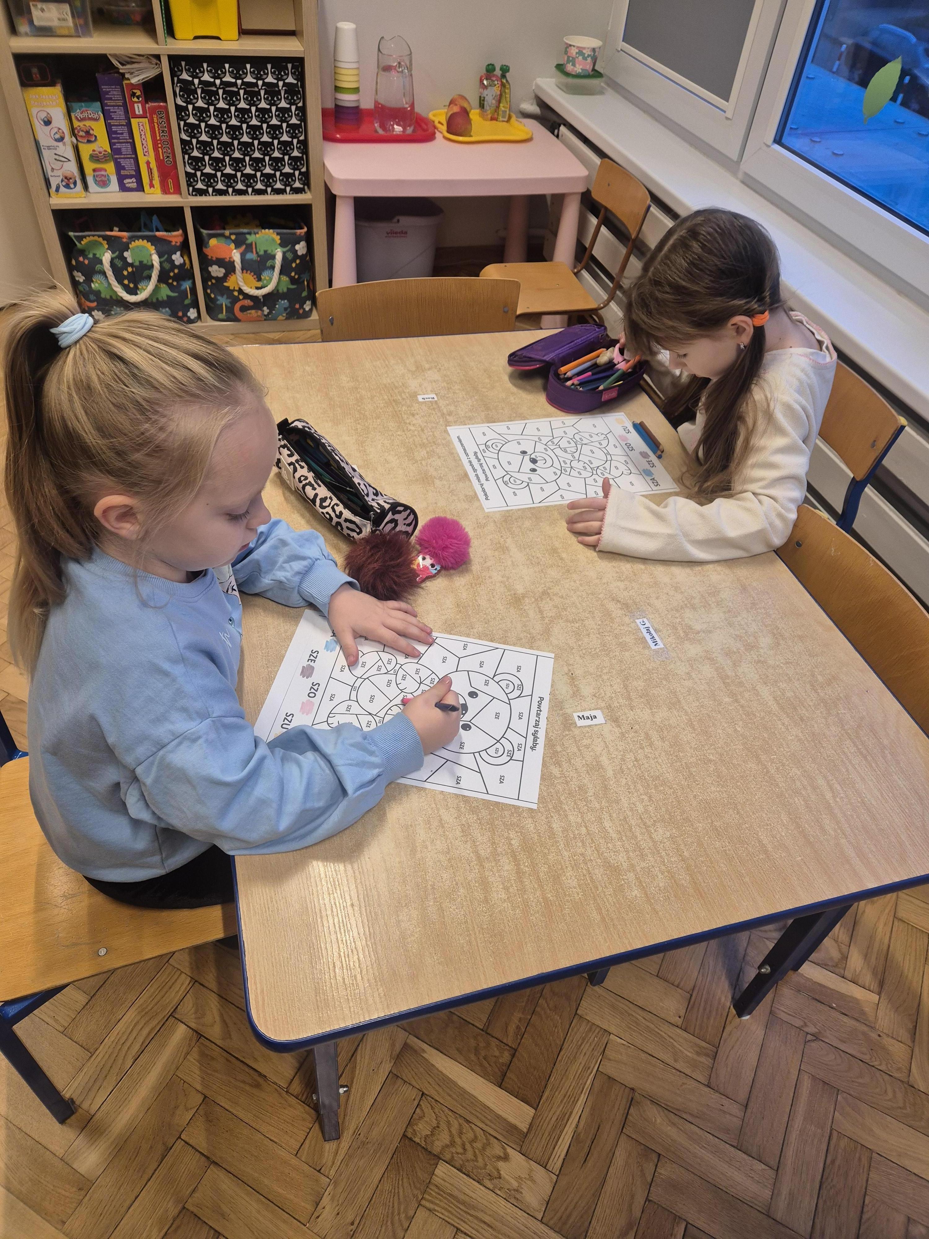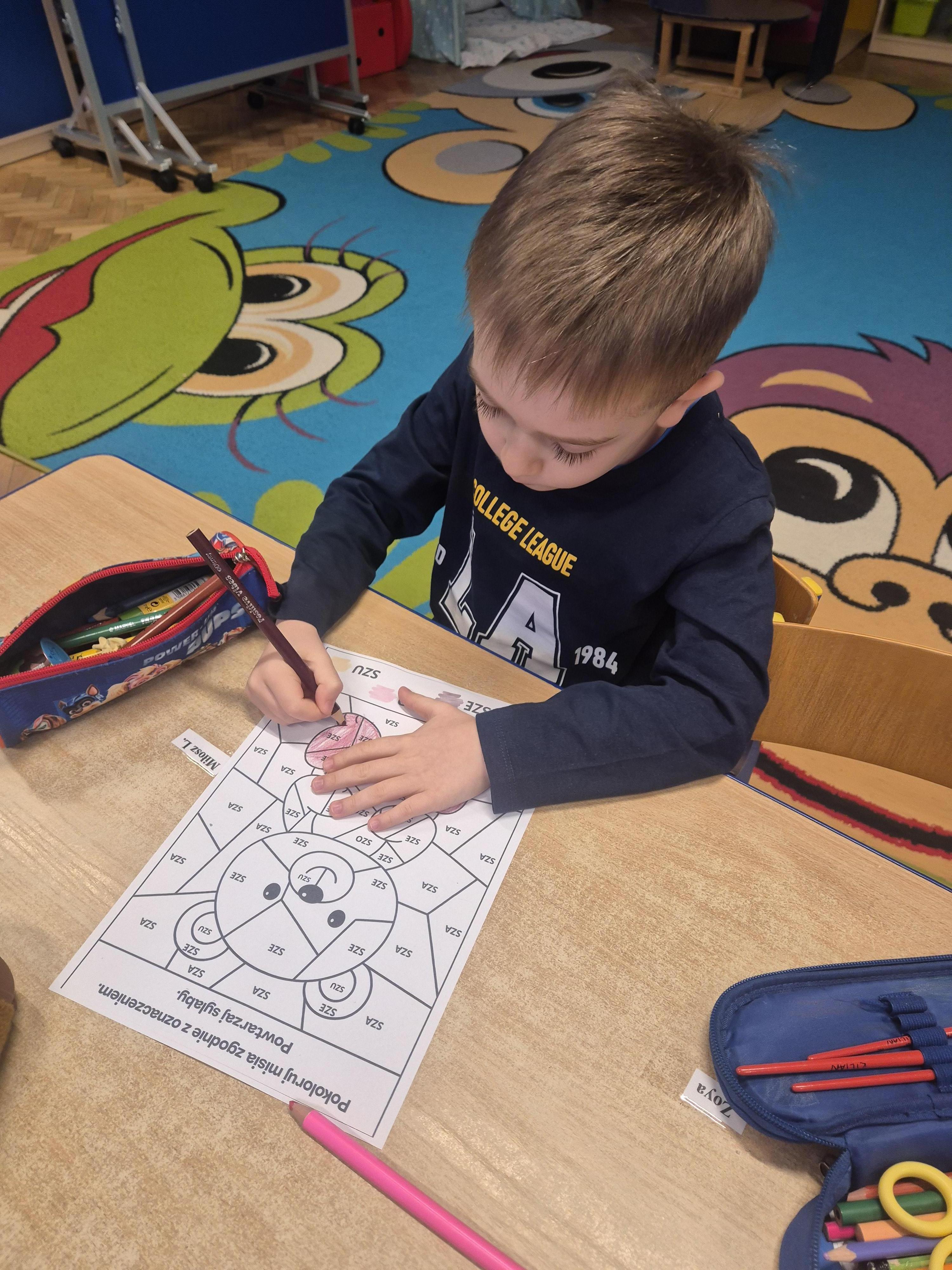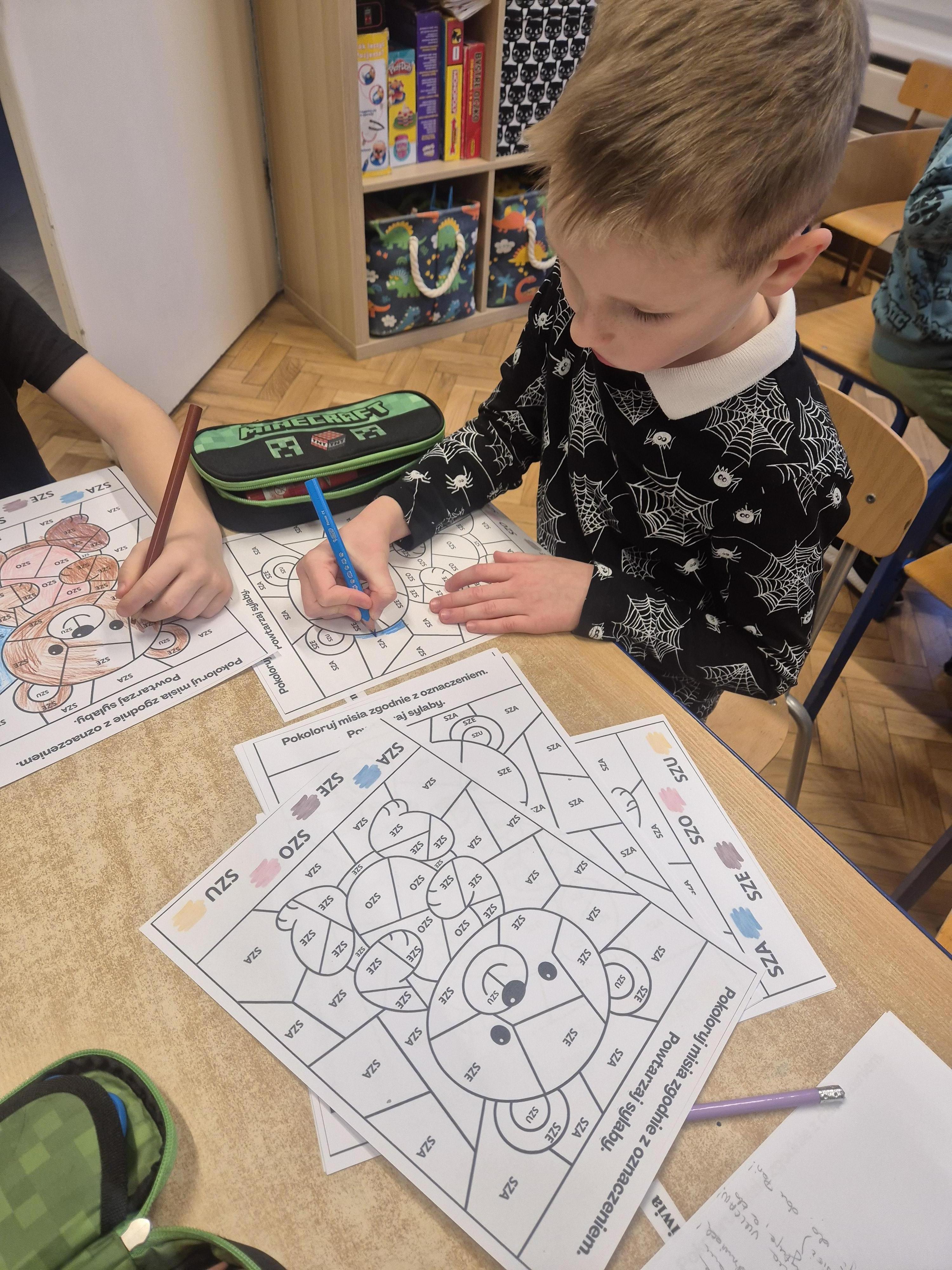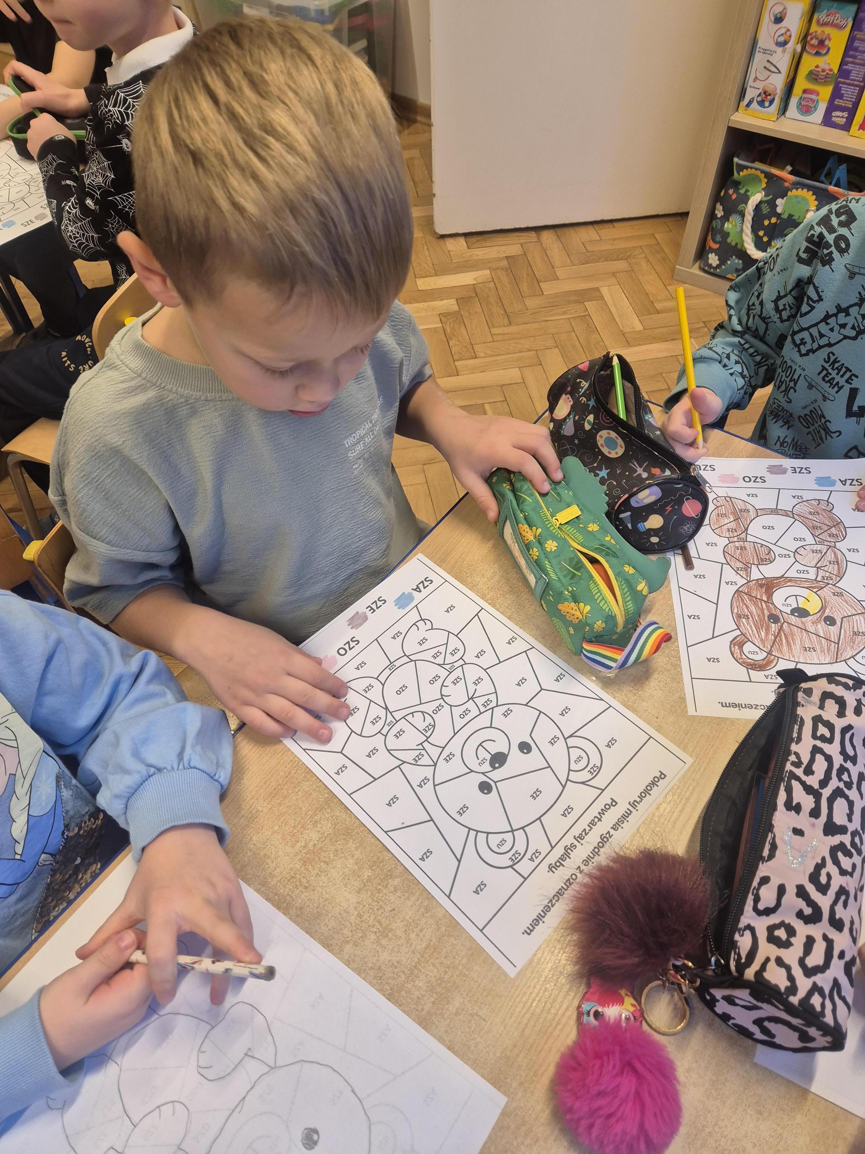 Wykonane zostały także karty pracy o tematyce misiowej. Dzieci chętnie opowiadały o swoich pluszakach, ćwicząc wypowiedzi i ucząc się słuchać innych.