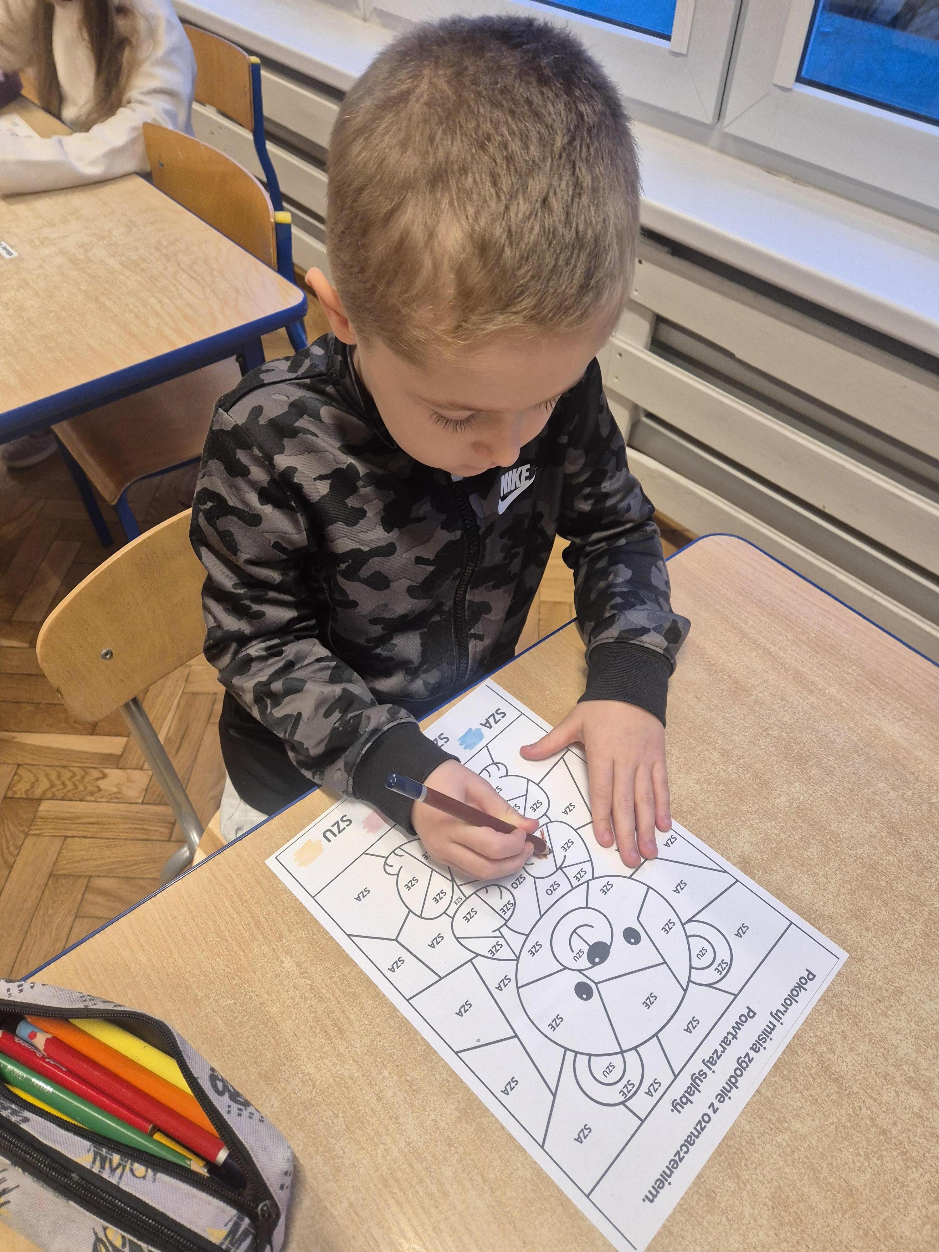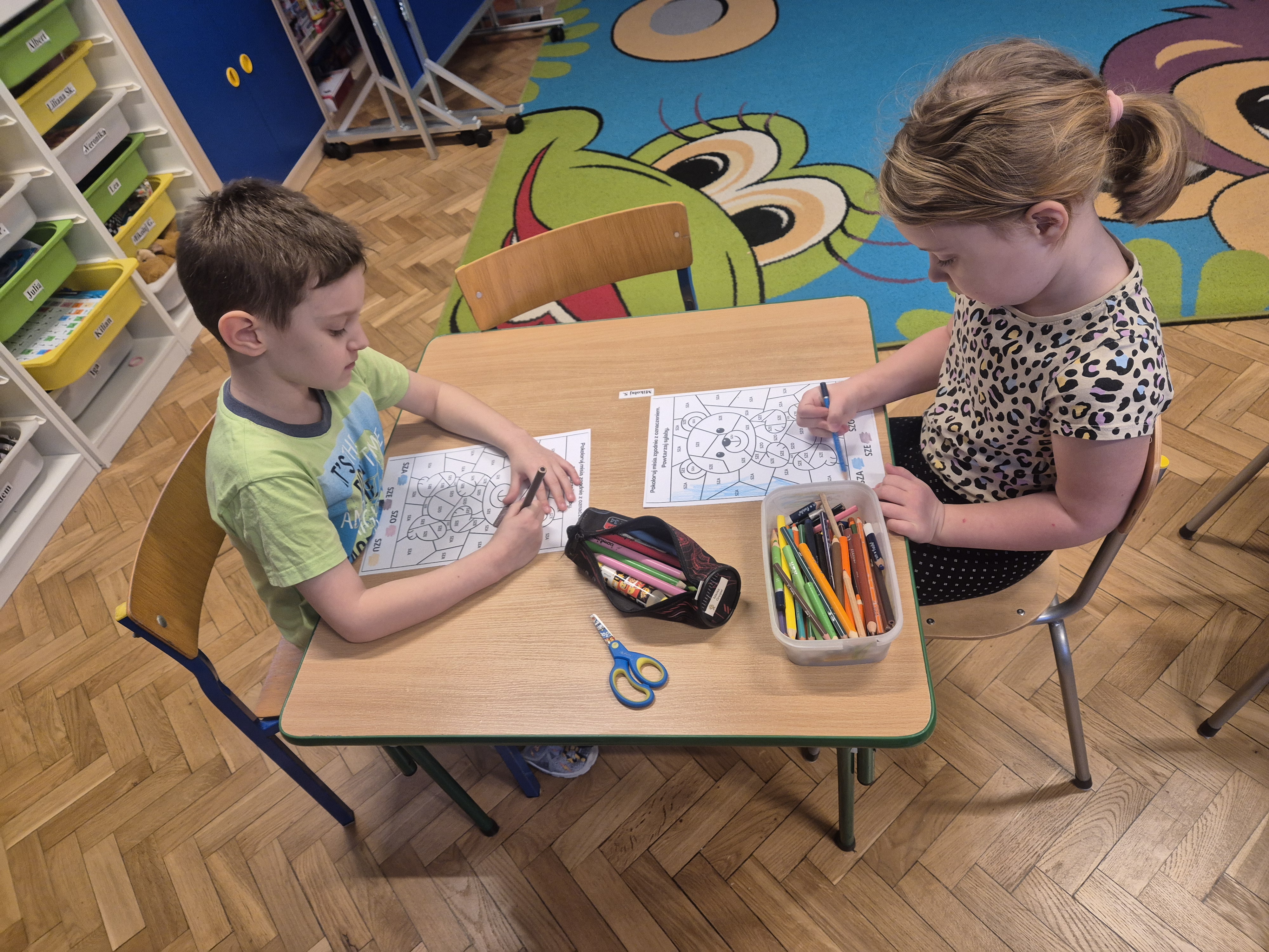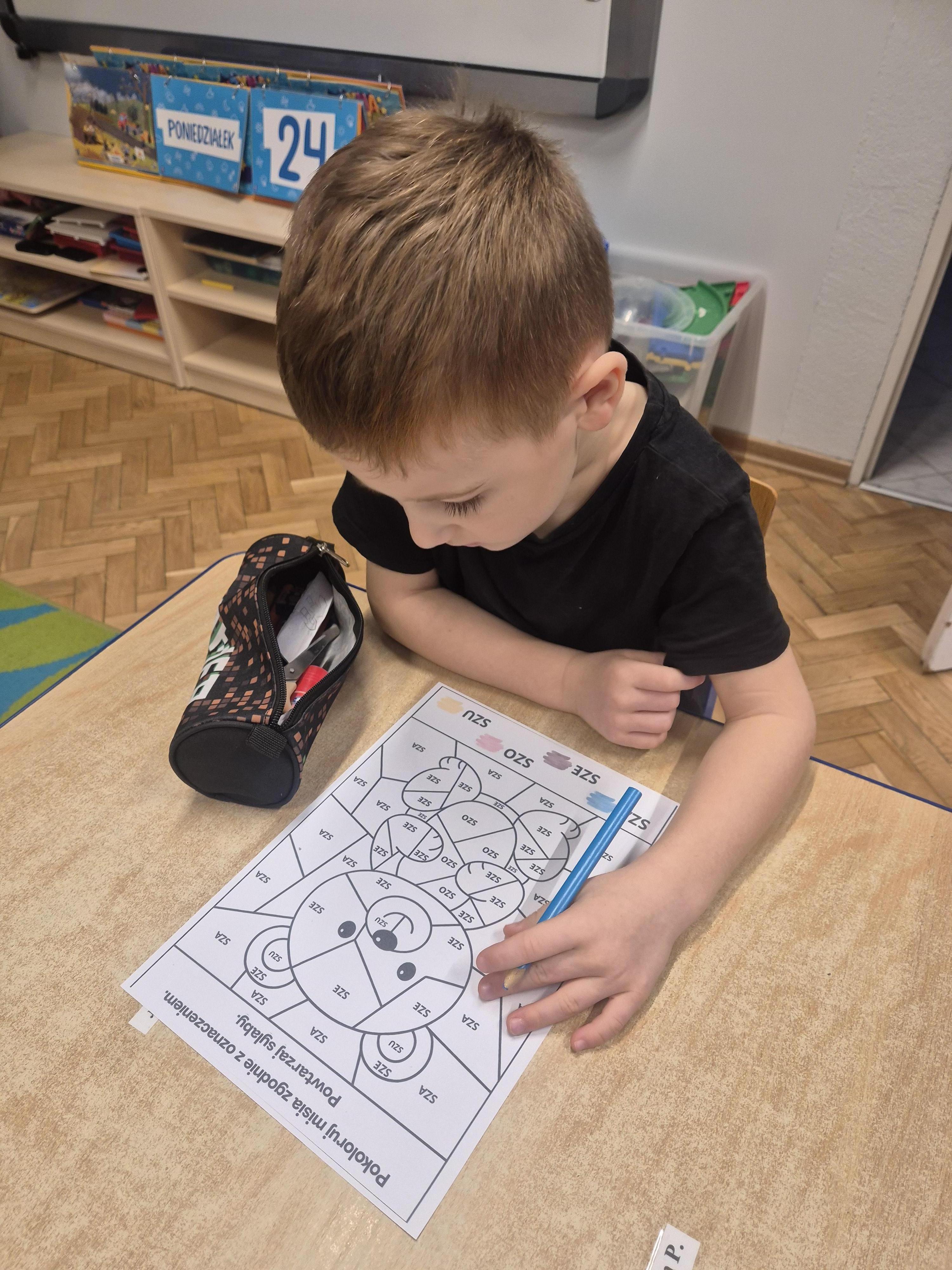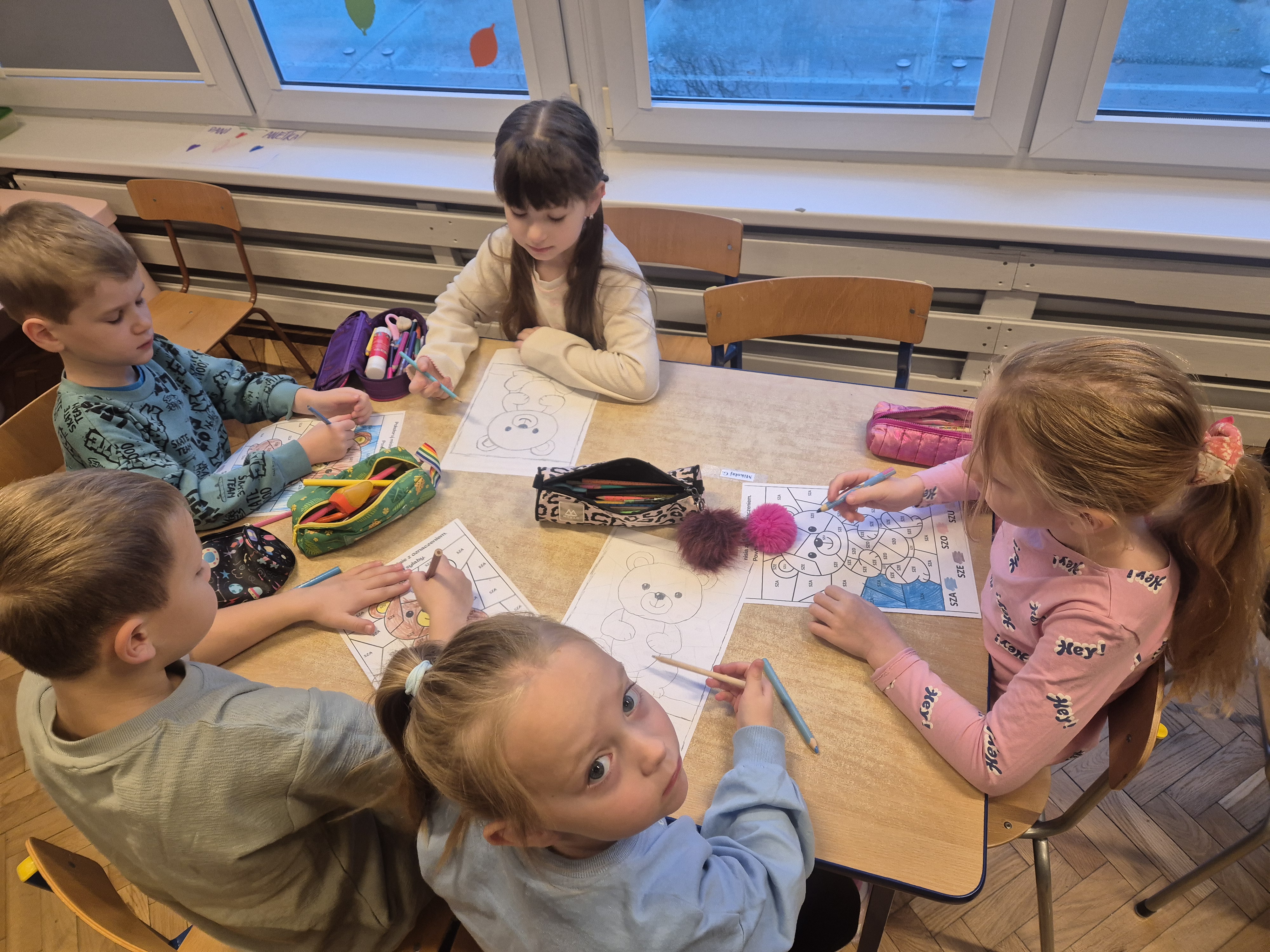 Wykonane zostały także karty pracy o tematyce misiowej. Dzieci chętnie opowiadały o swoich pluszakach, ćwicząc wypowiedzi i ucząc się słuchać innych.