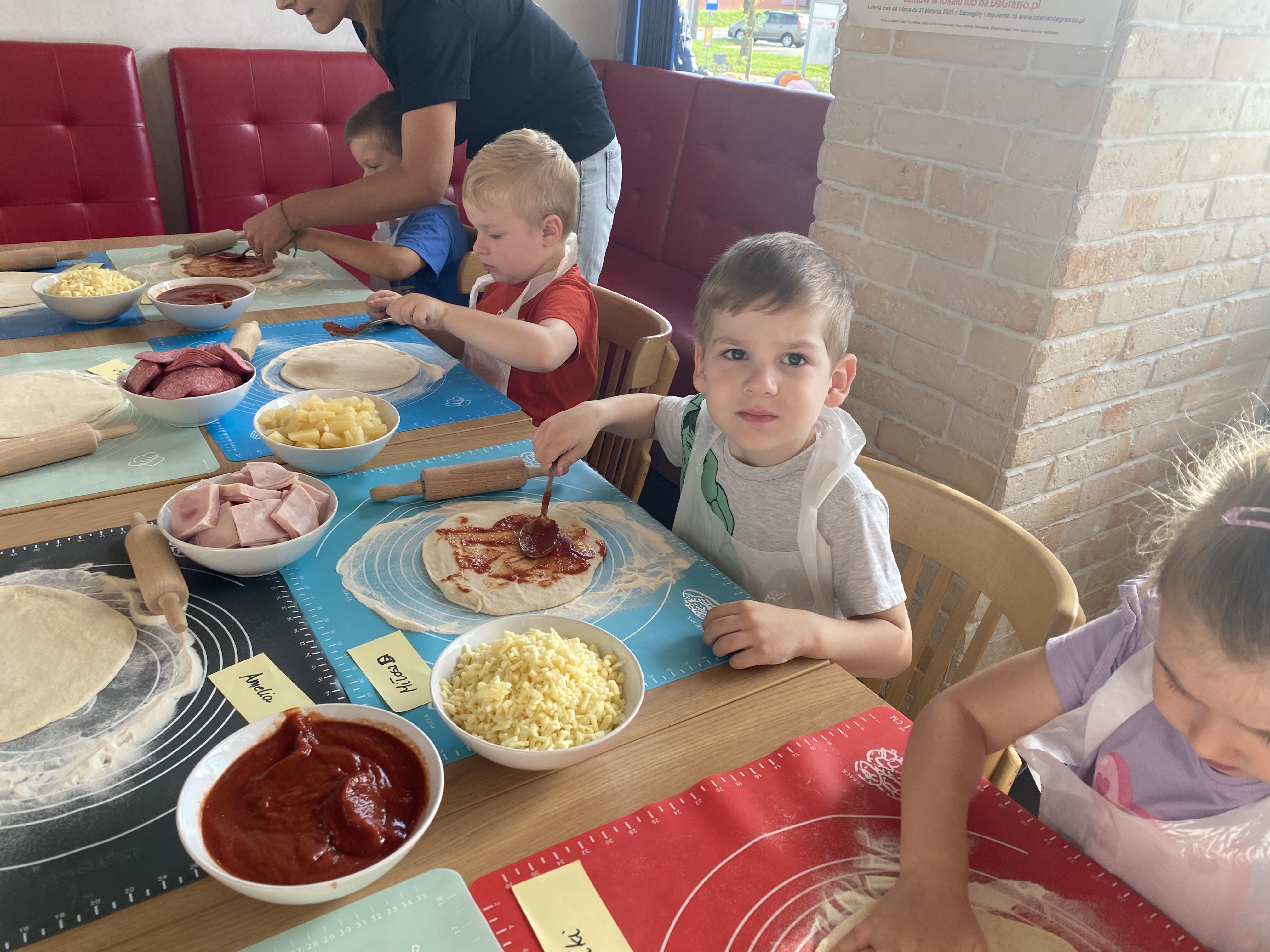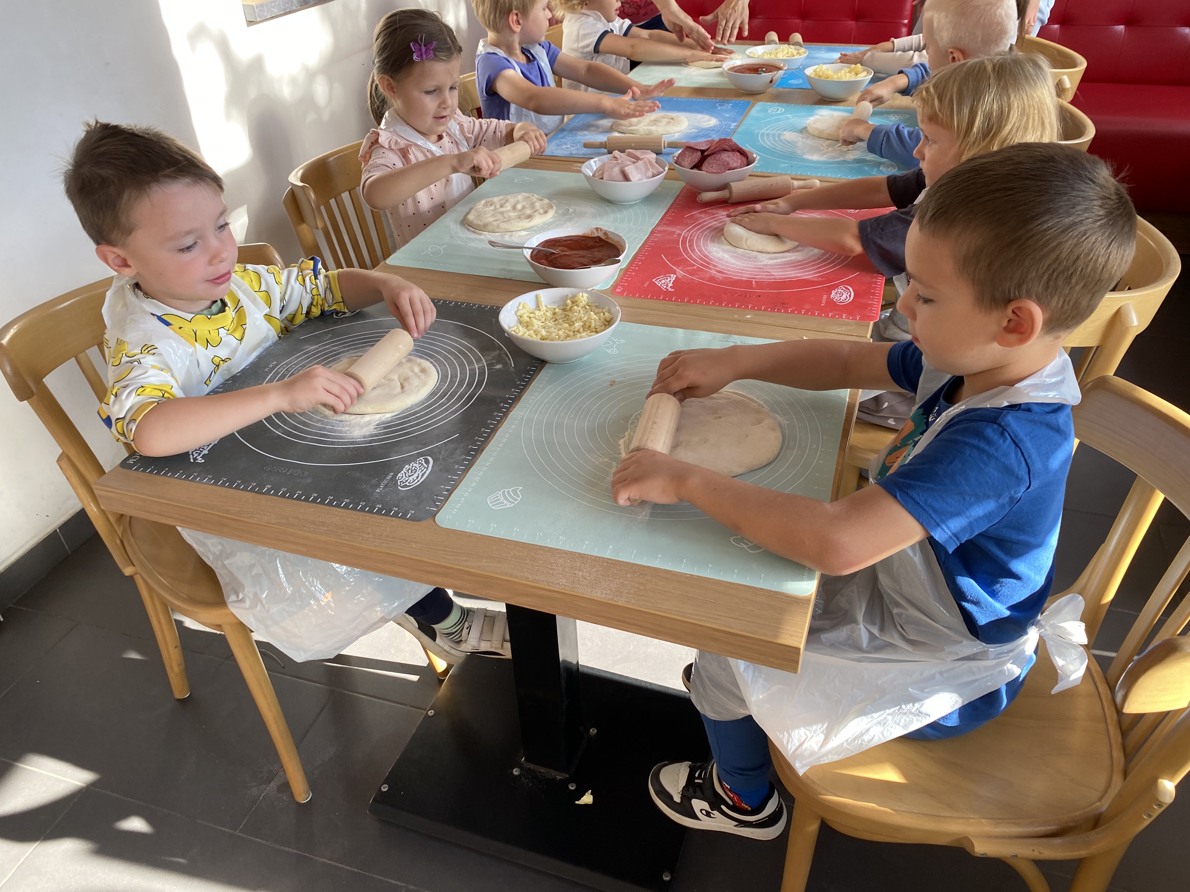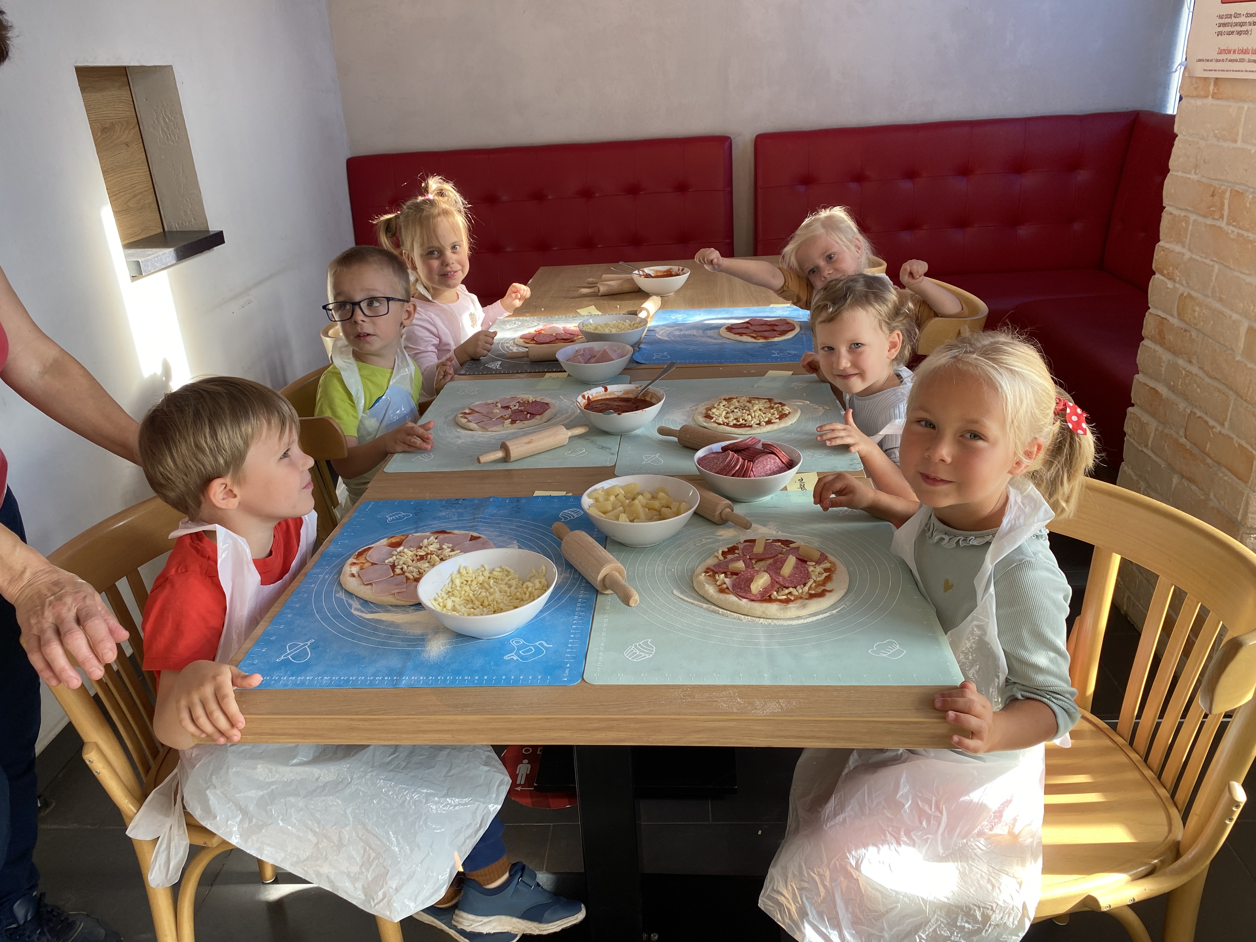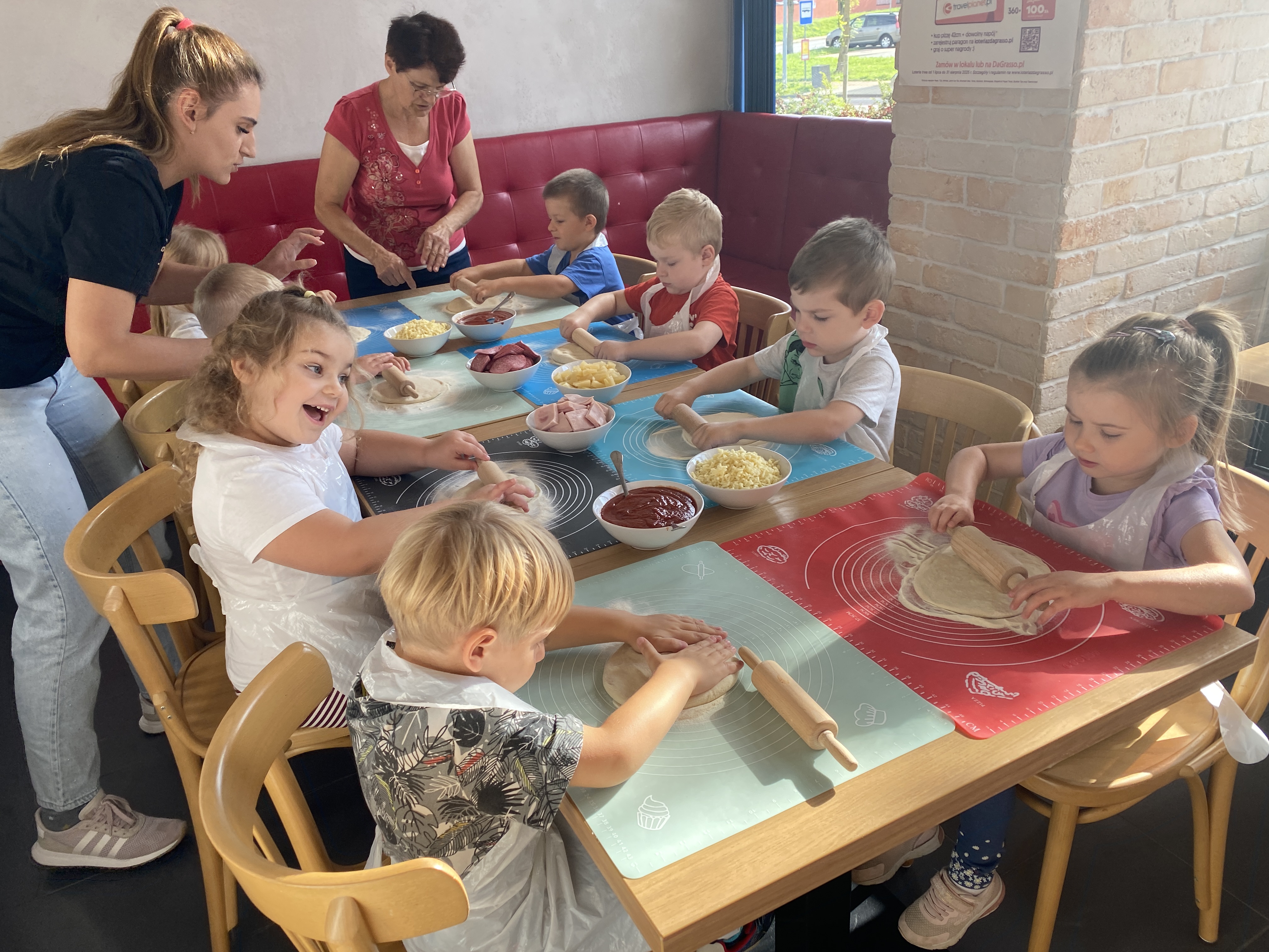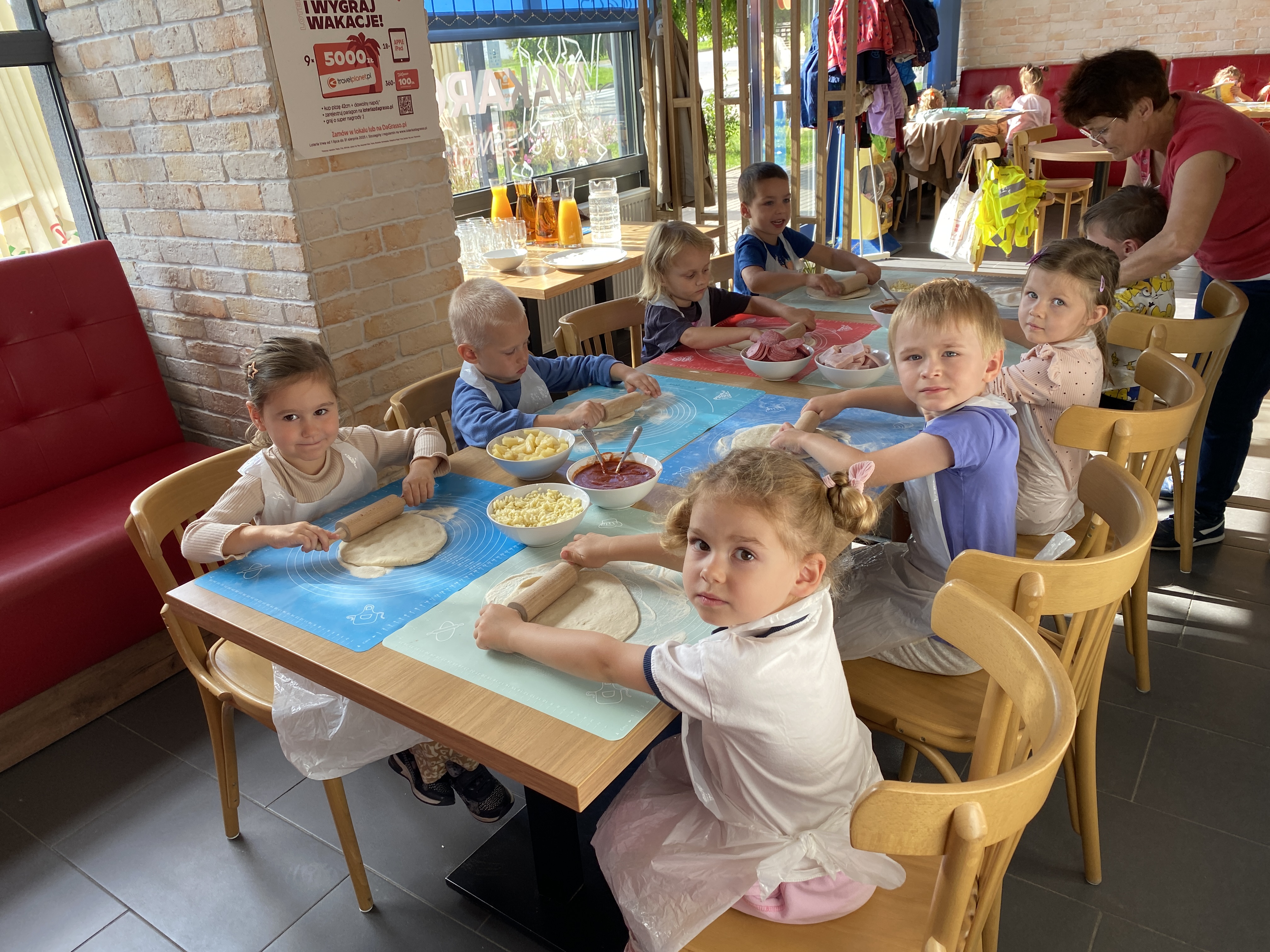 Z okazji Dnia Przedszkolaka Kreciki uczestniczyły w warsztatach kulinarnych w pizzeri DaGrasso. Była to świetna okazja do rozwijania umiejętności manualnych, nauki zasad higieny i pracy zespołowej poprzez tworzenie własnych, wymyślonych przez dzieci pizz. Dzieci wałkowały ciasto, dobierały ulubione składniki i wspólnie degustowały swoje dzieła. Na koniec warsztatów otrzymaliśmy certyfikat zdobytej wiedzy oraz mały upominek. Bardzo nam się podobało.