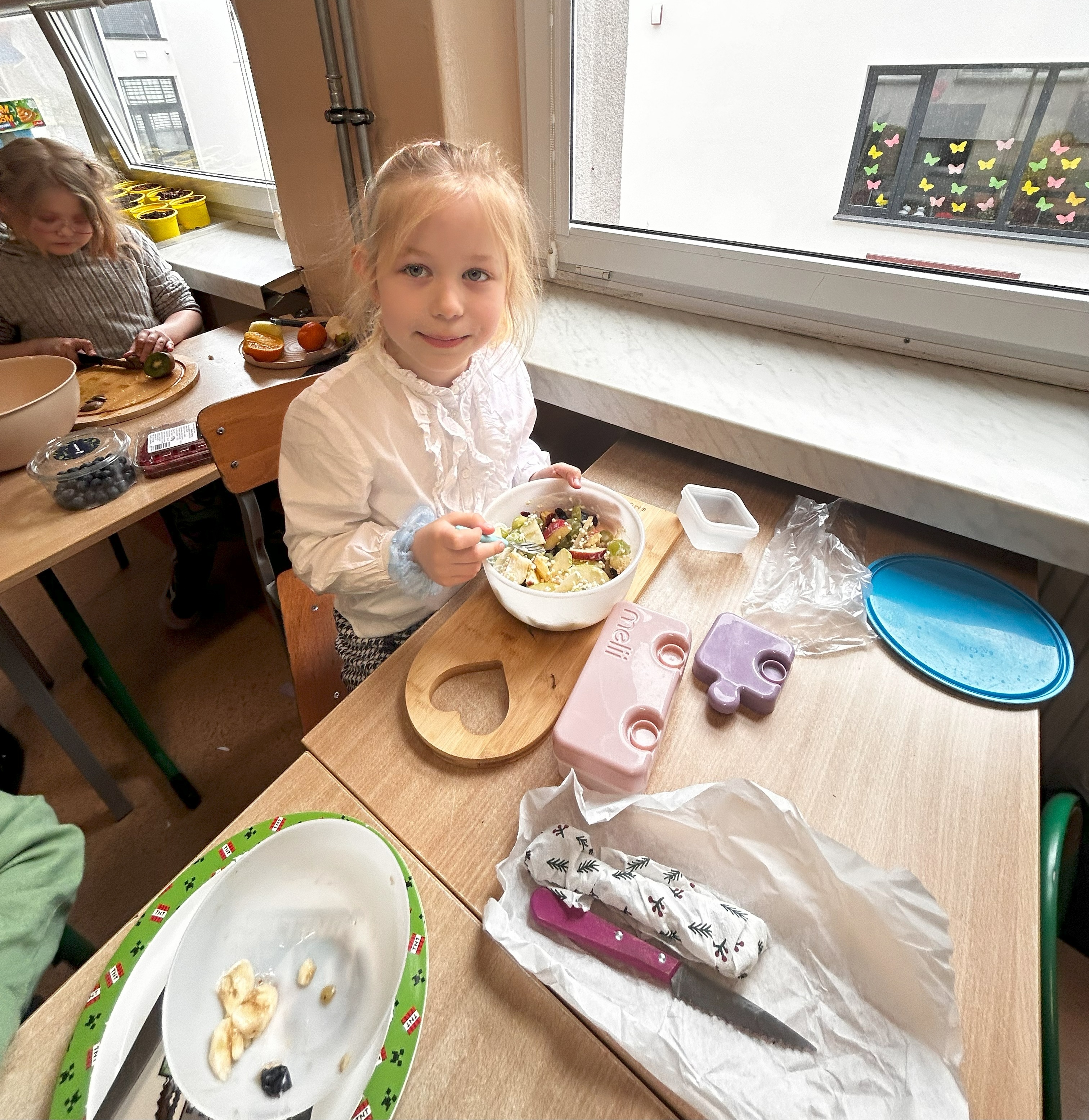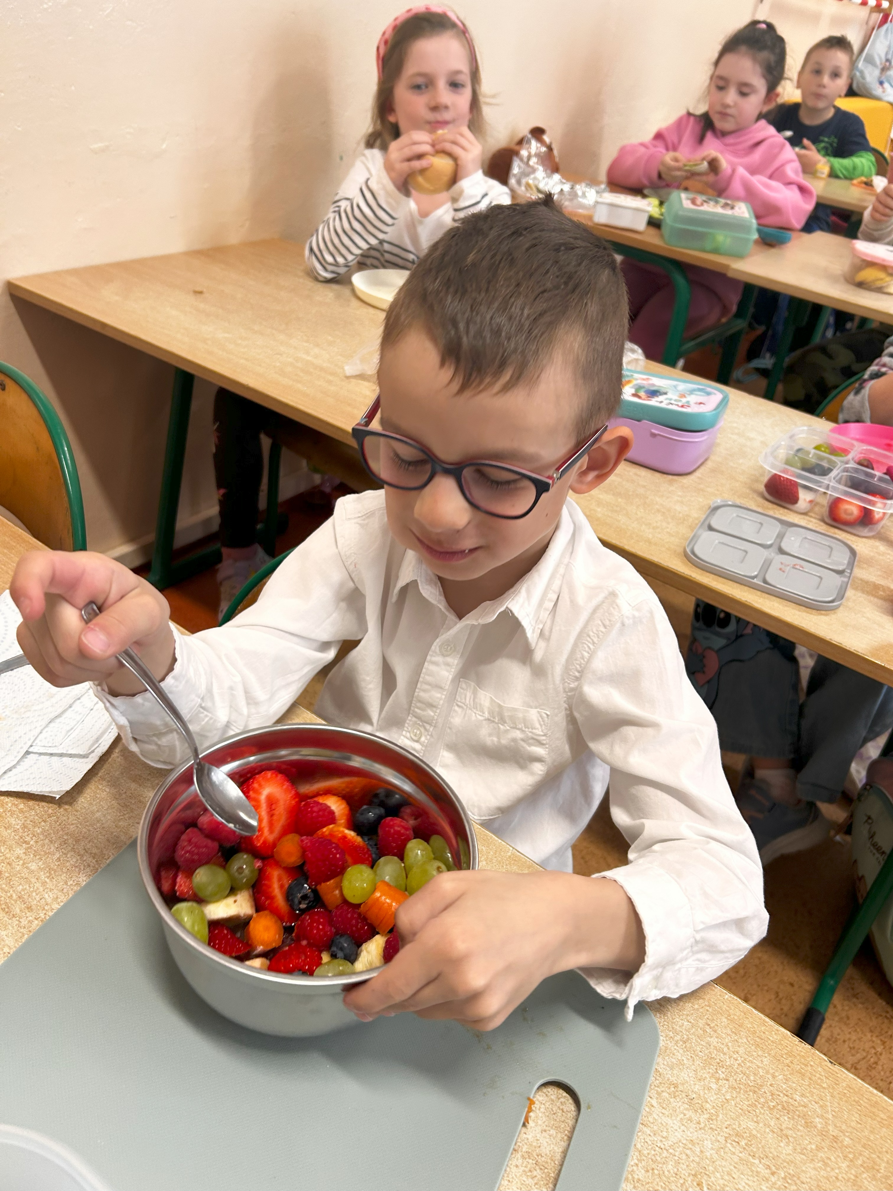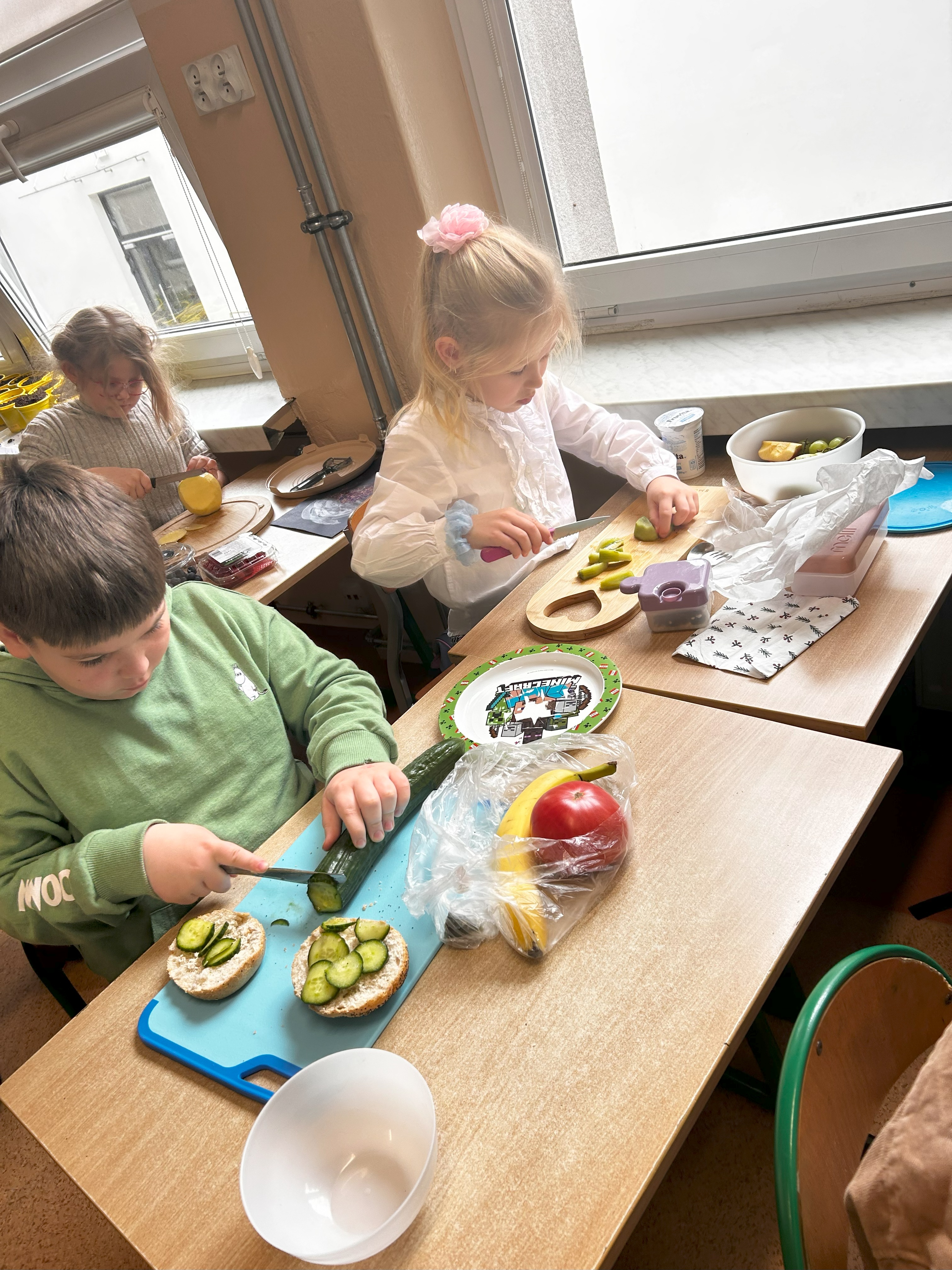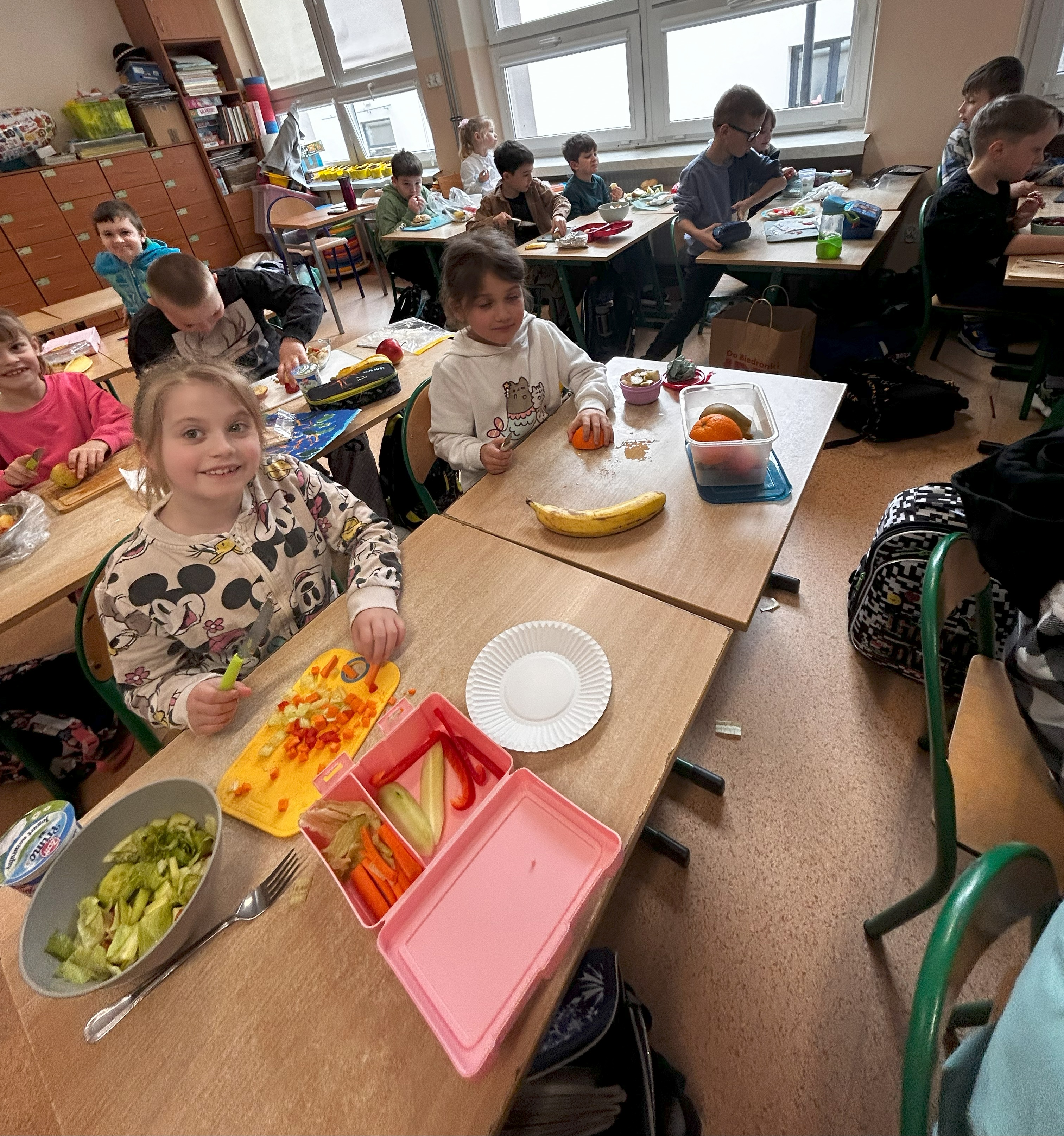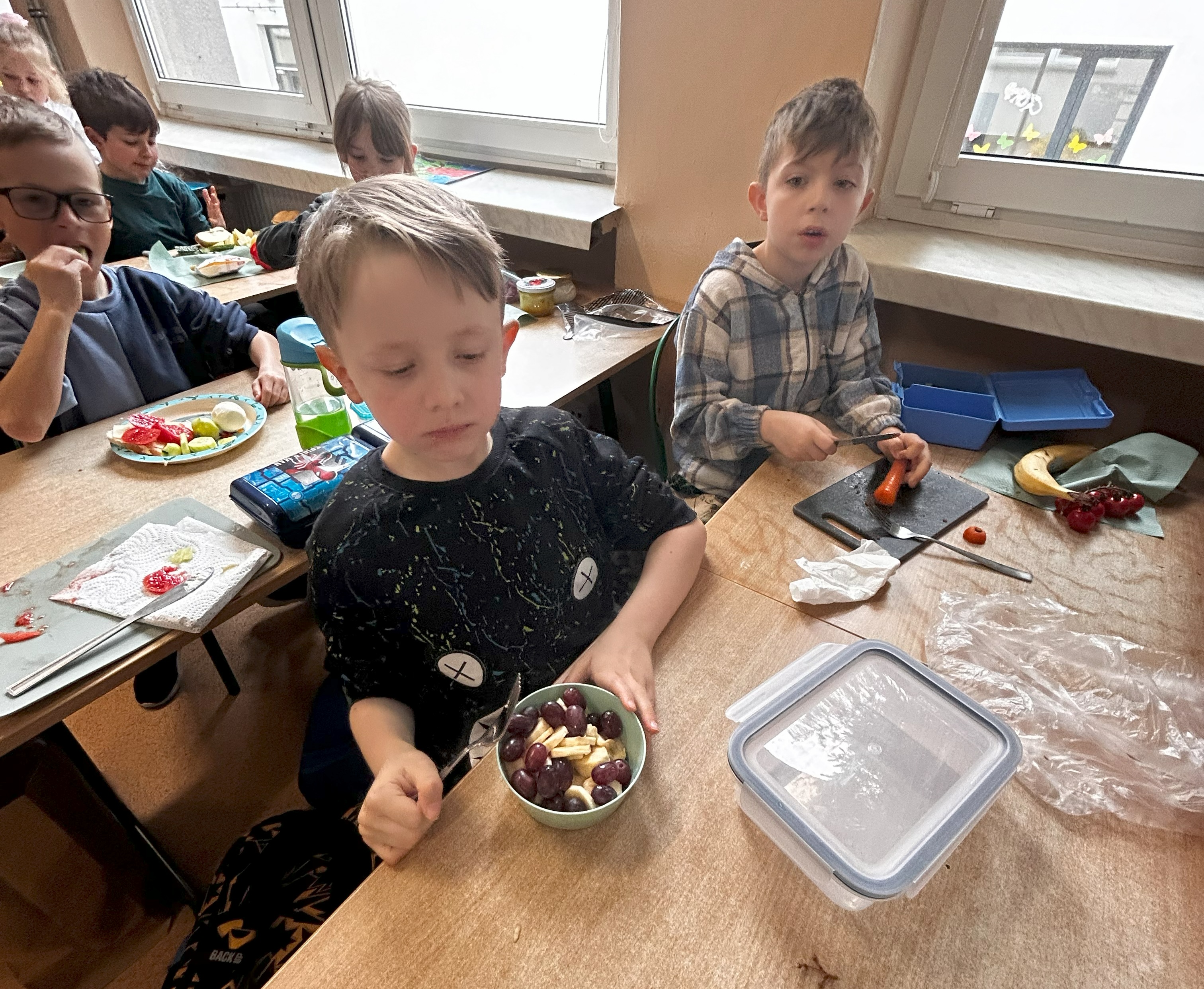 Już od rana w klasie unosił się zapach świeżych warzyw, owoców i pełnoziarnistego pieczywa. Uczniowie przygotowywali kolorowe kanapki i owocowe sałatk. Nie zabrakło również rozmów o tym, jak ważne jest codzienne, wartościowe śniadanie – zwłaszcza przed dniem pełnym nauki i zabawy.