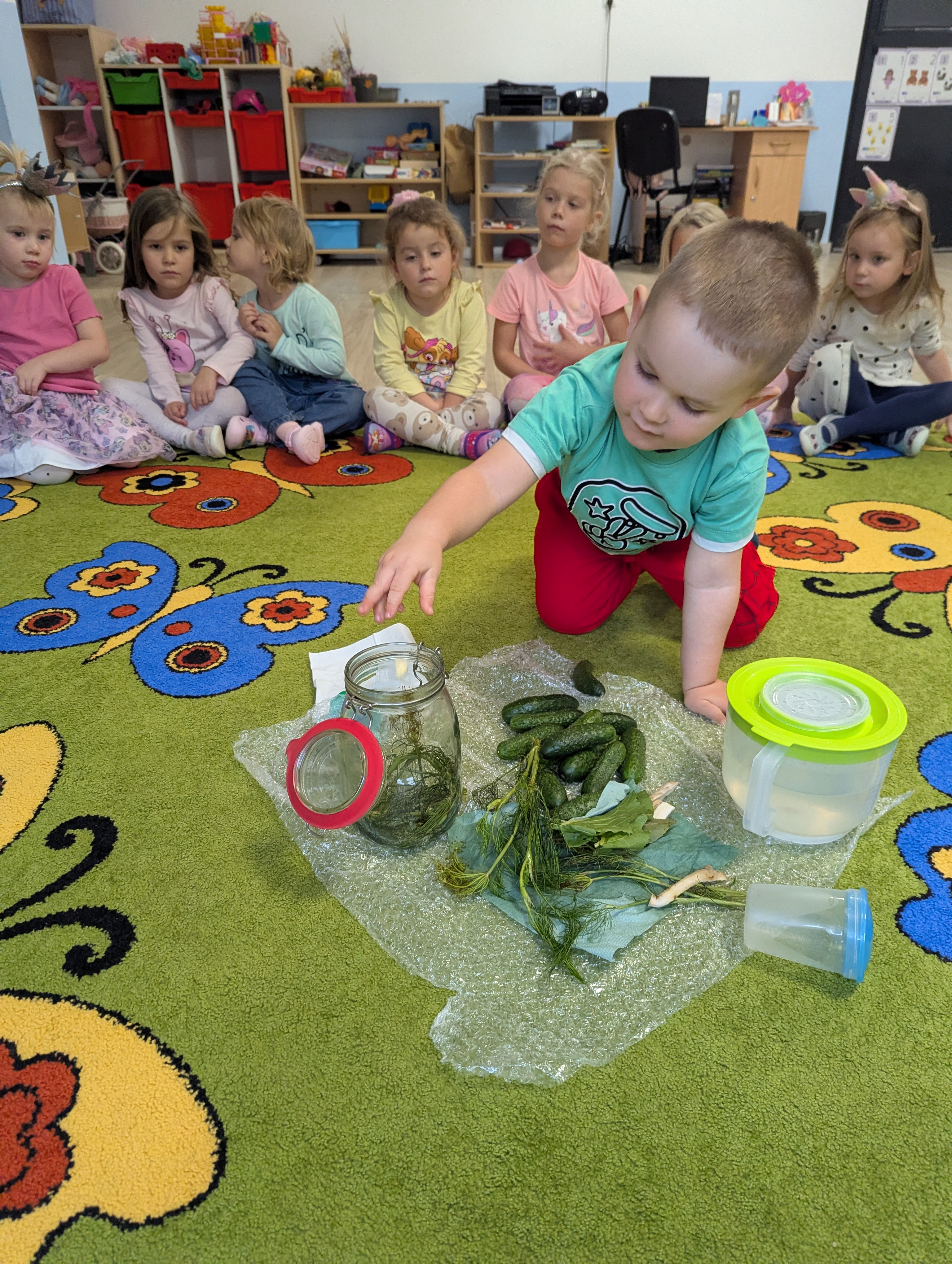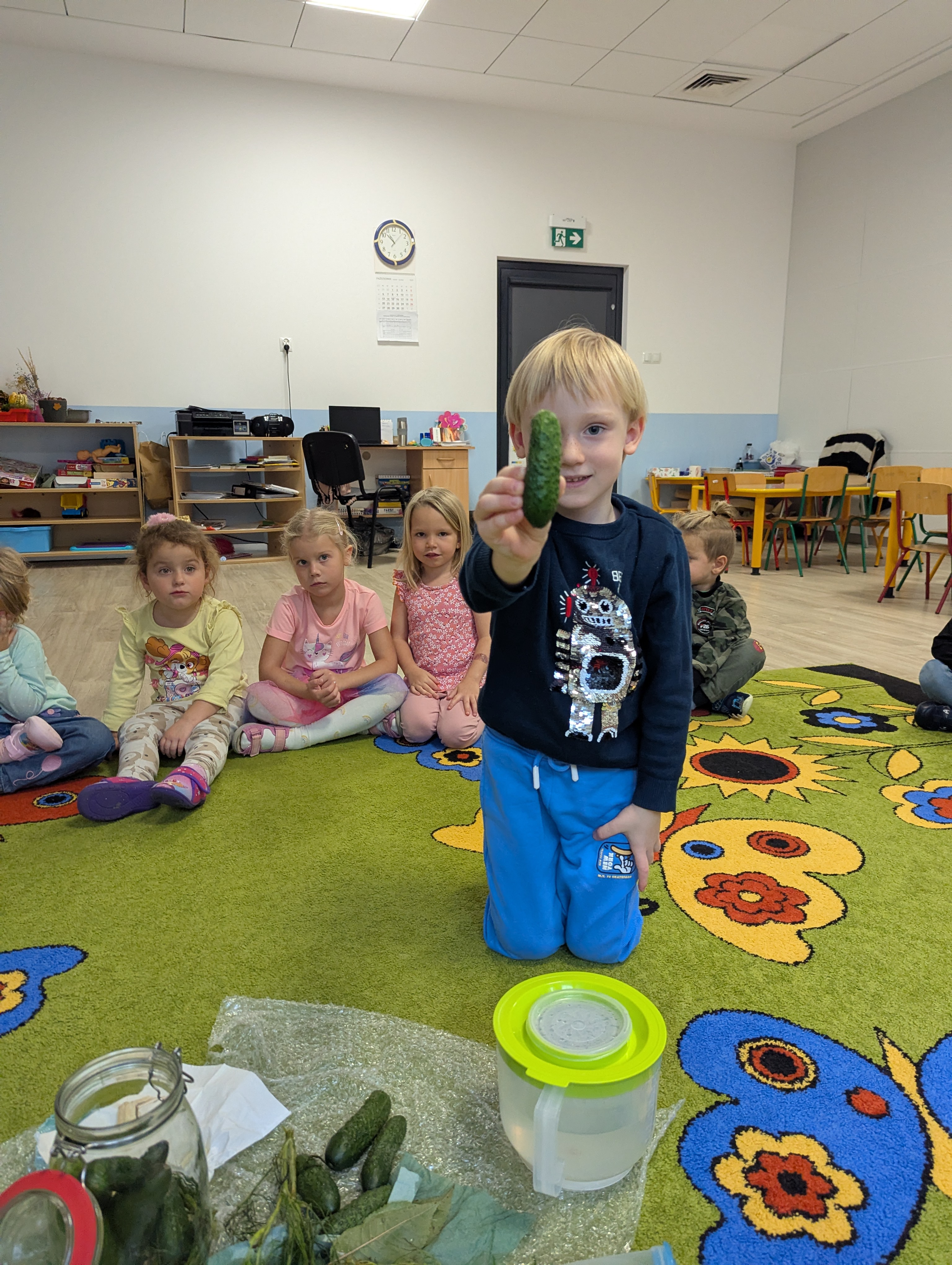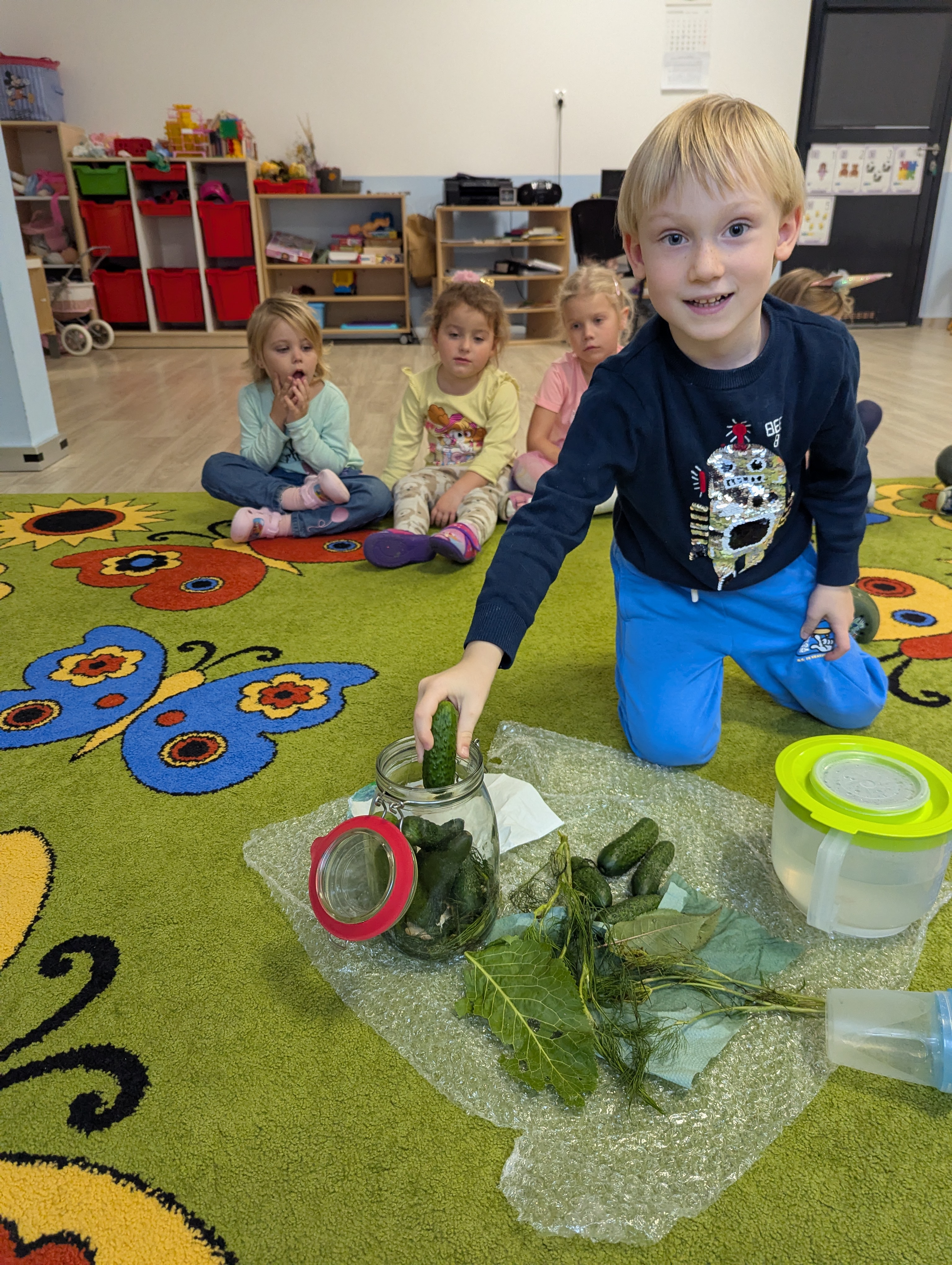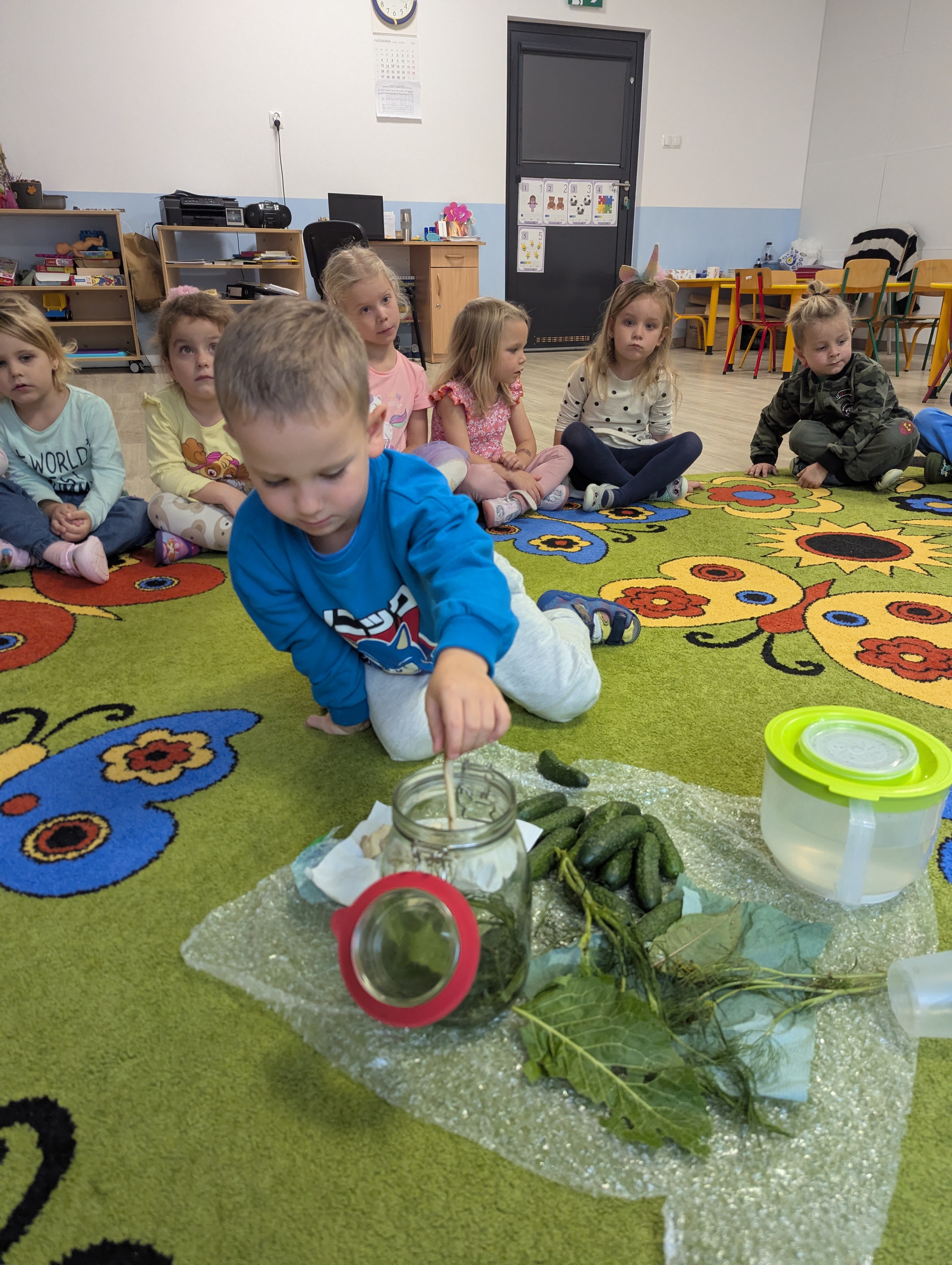 Dzieci poznały cały proces przygotowywania ogórków do kiszenia – od dokładnego mycia, przez dodawanie aromatycznych przypraw, aż po staranne włożenie ich do słoików. Każdy miał swój ważny udział, a uśmiechy towarzyszyły nam na każdym etapie pracy.