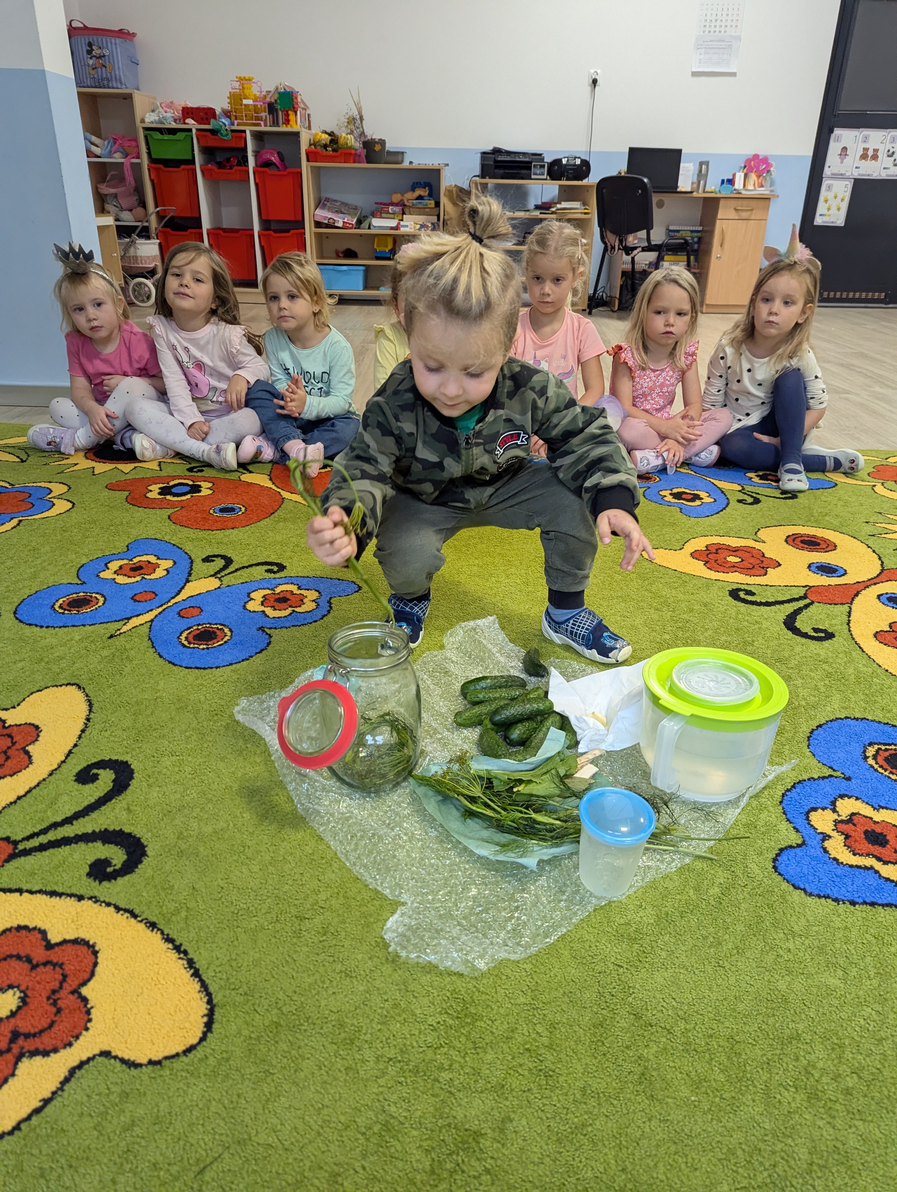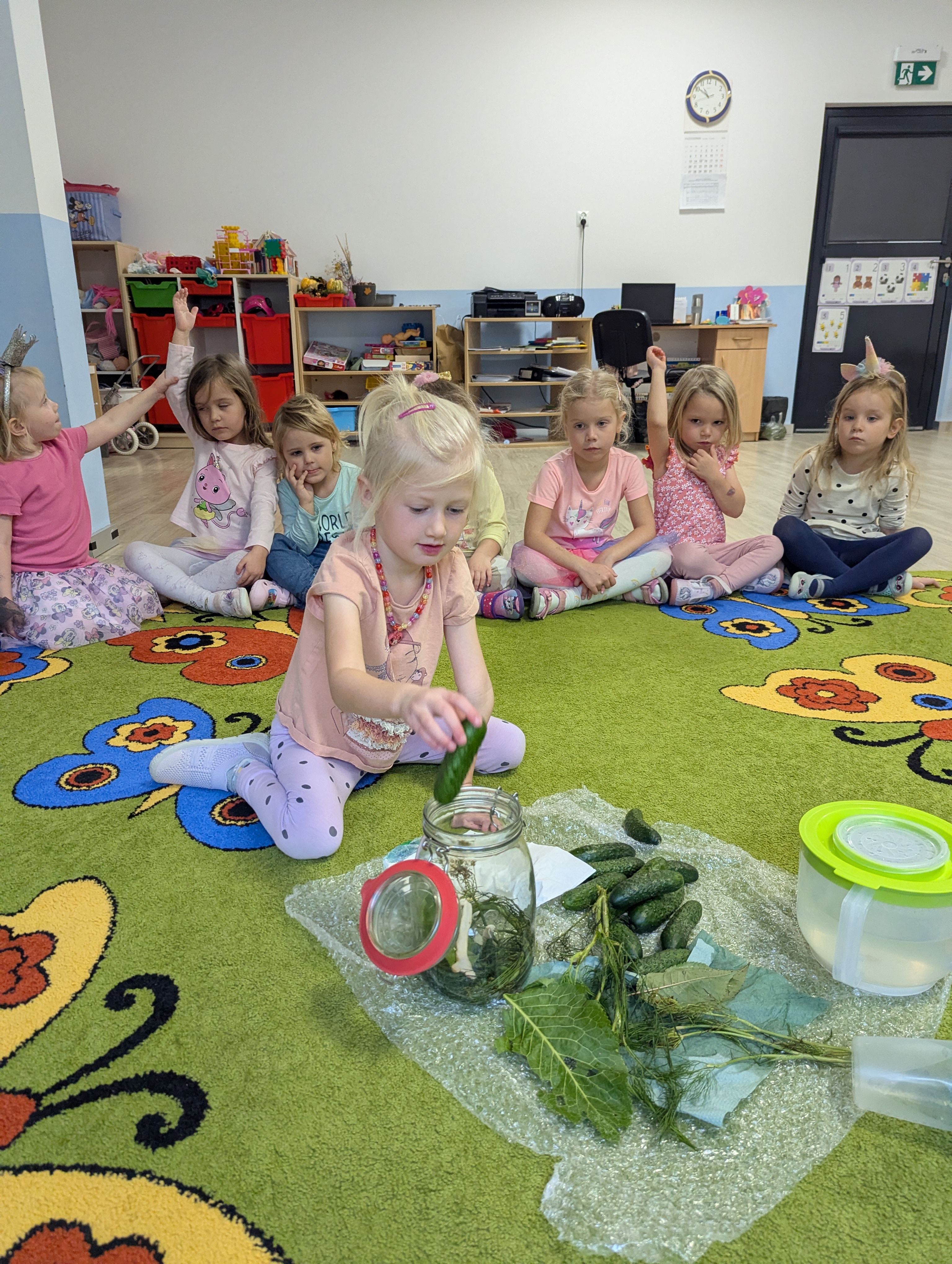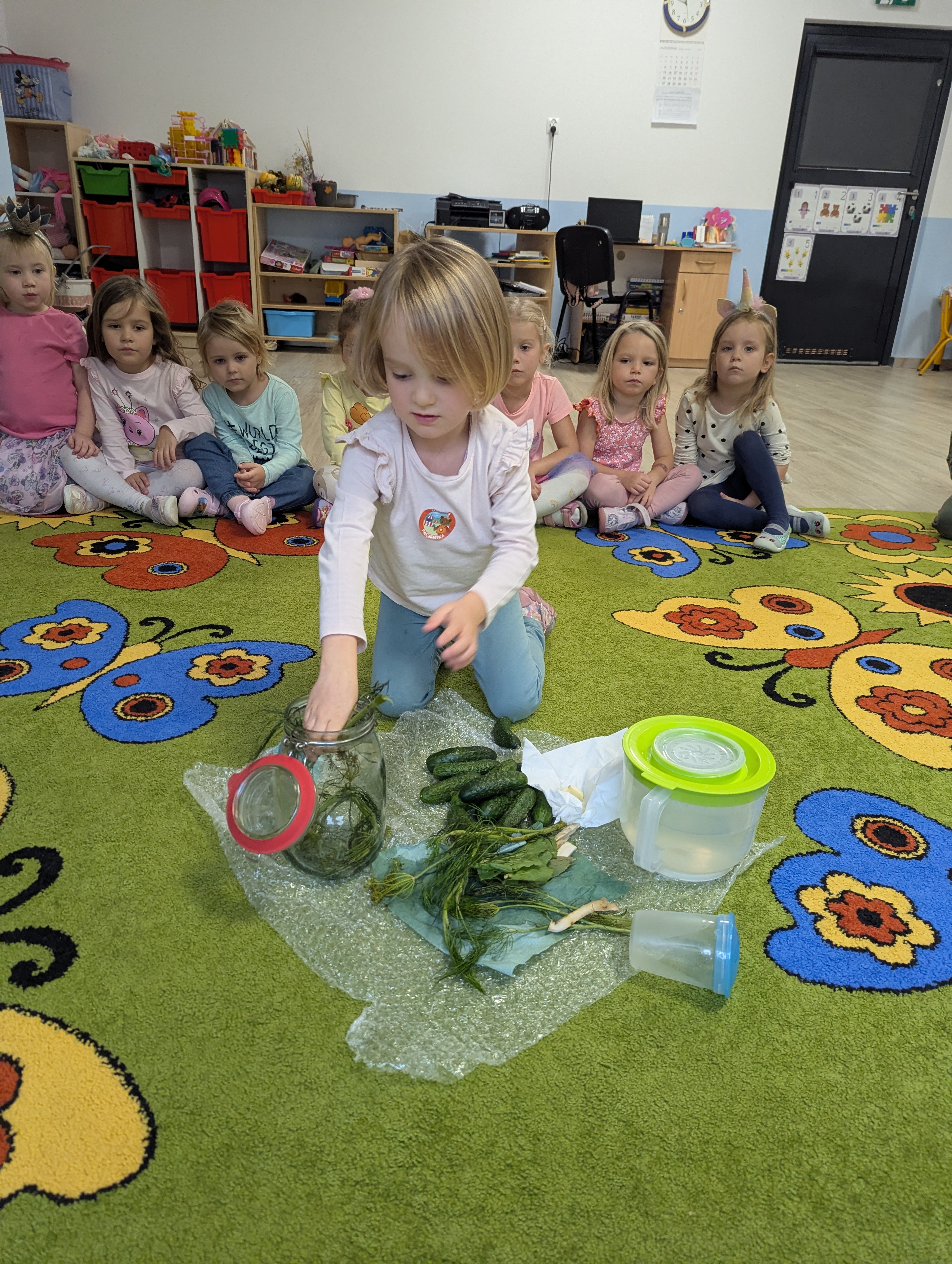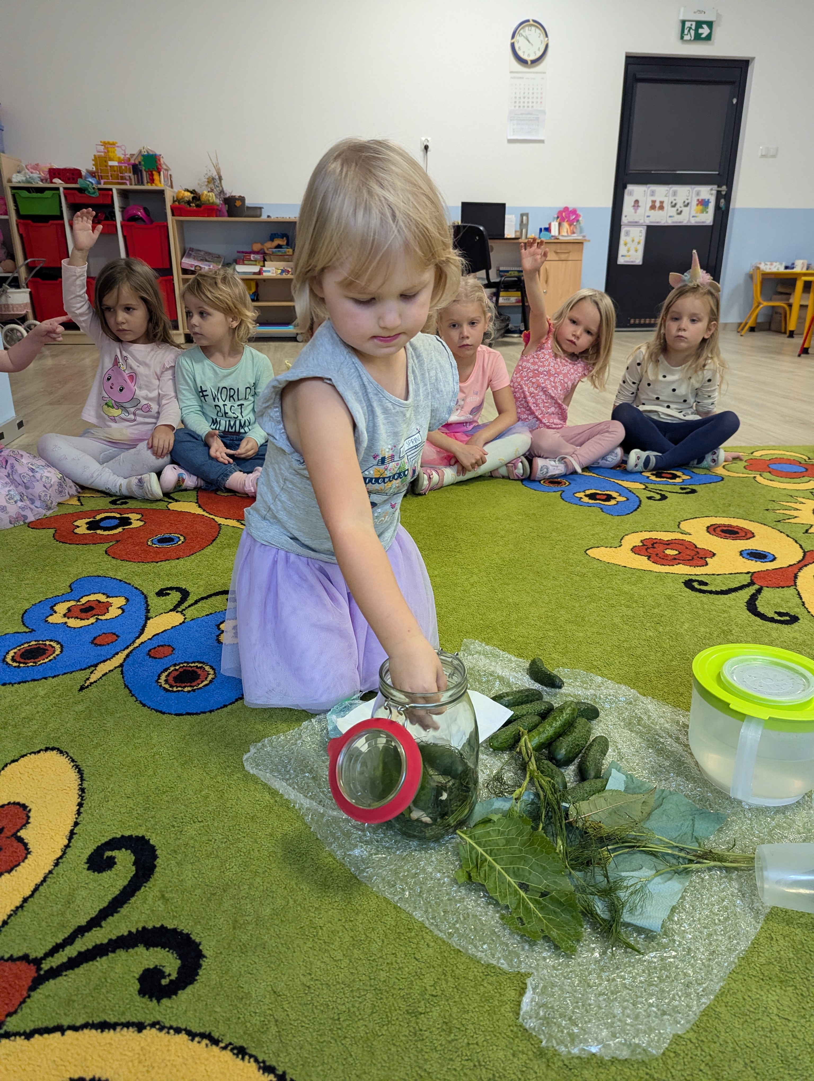 Dzieci poznały cały proces przygotowywania ogórków do kiszenia – od dokładnego mycia, przez dodawanie aromatycznych przypraw, aż po staranne włożenie ich do słoików. Każdy miał swój ważny udział, a uśmiechy towarzyszyły nam na każdym etapie pracy.