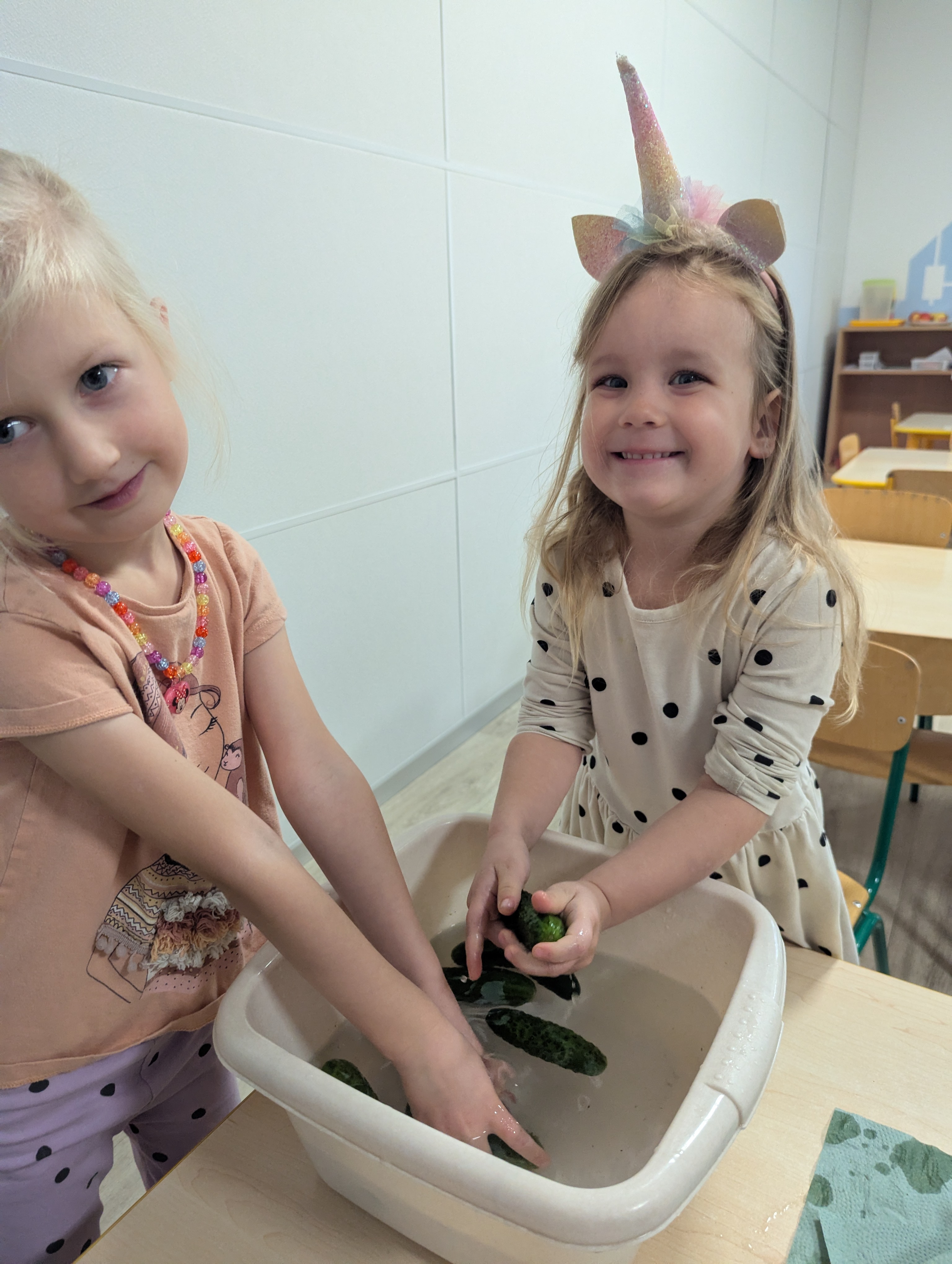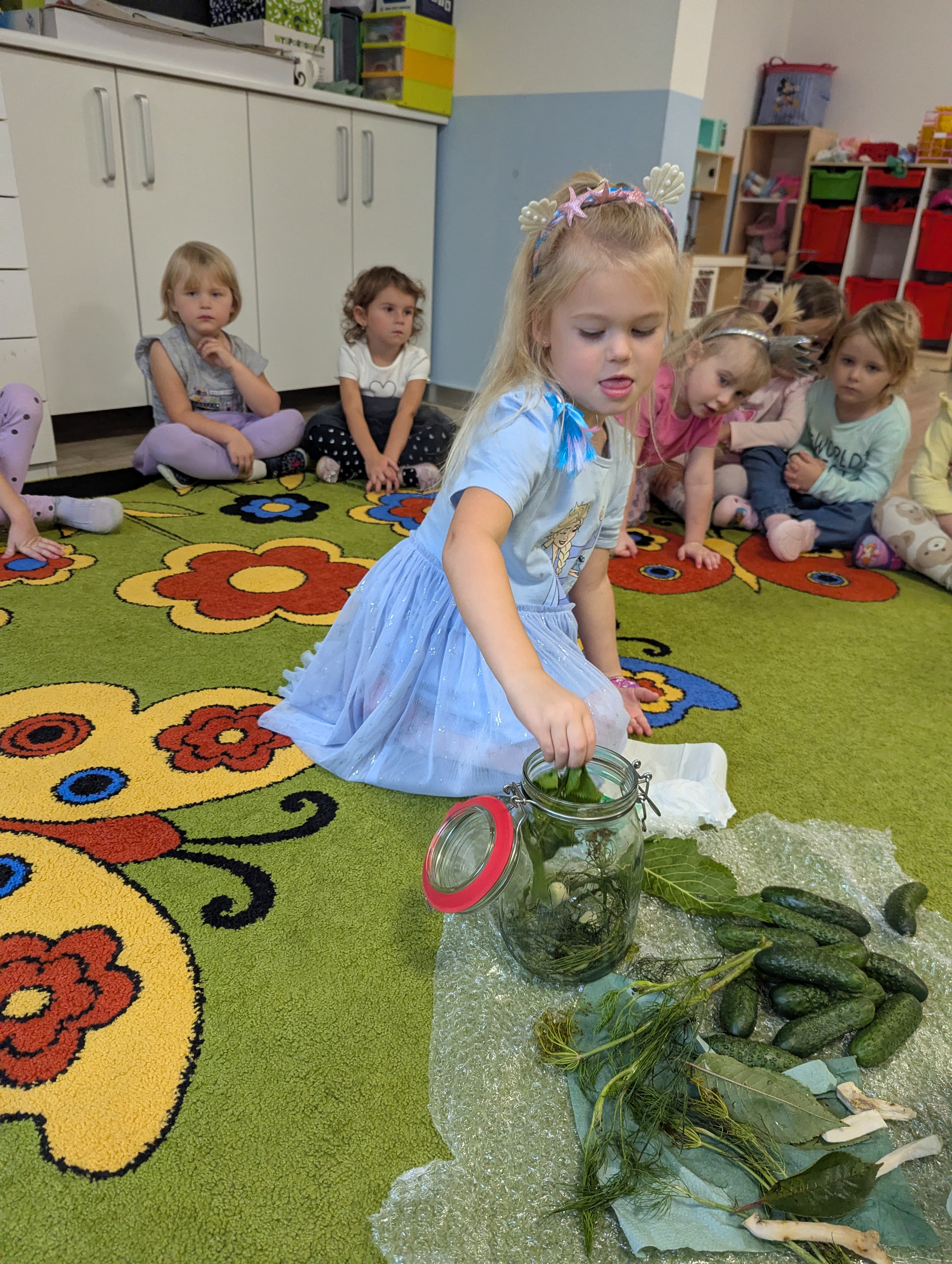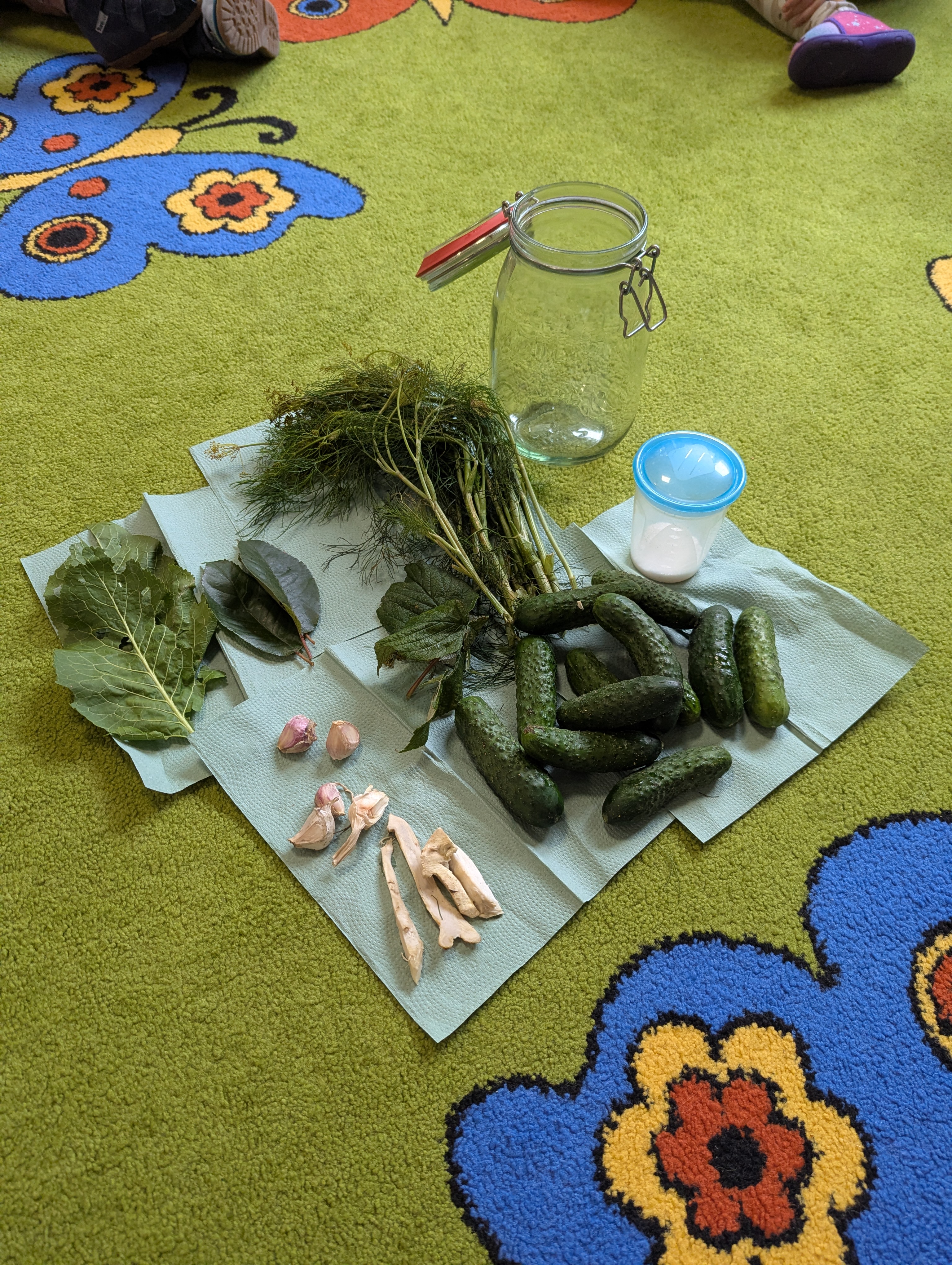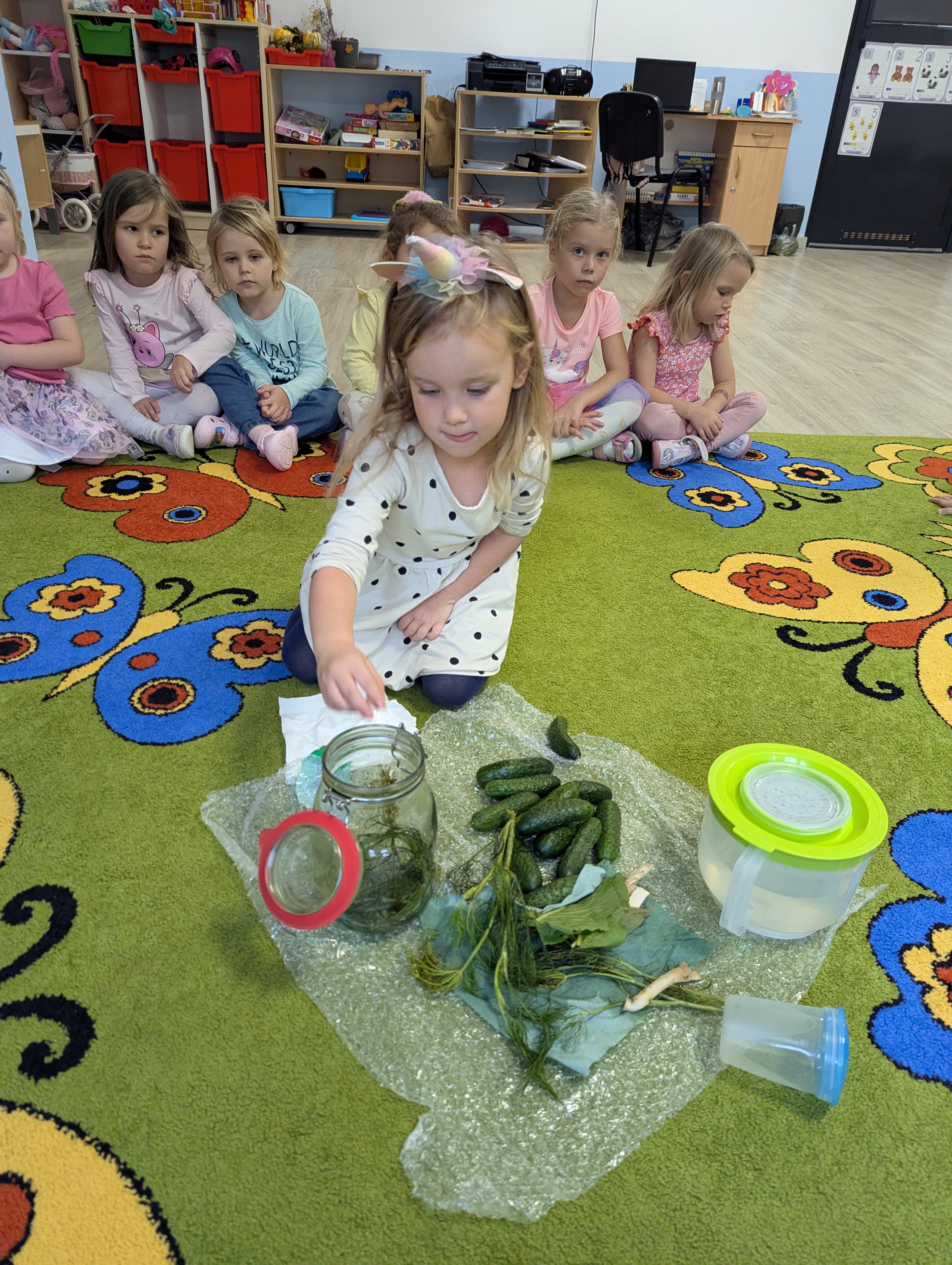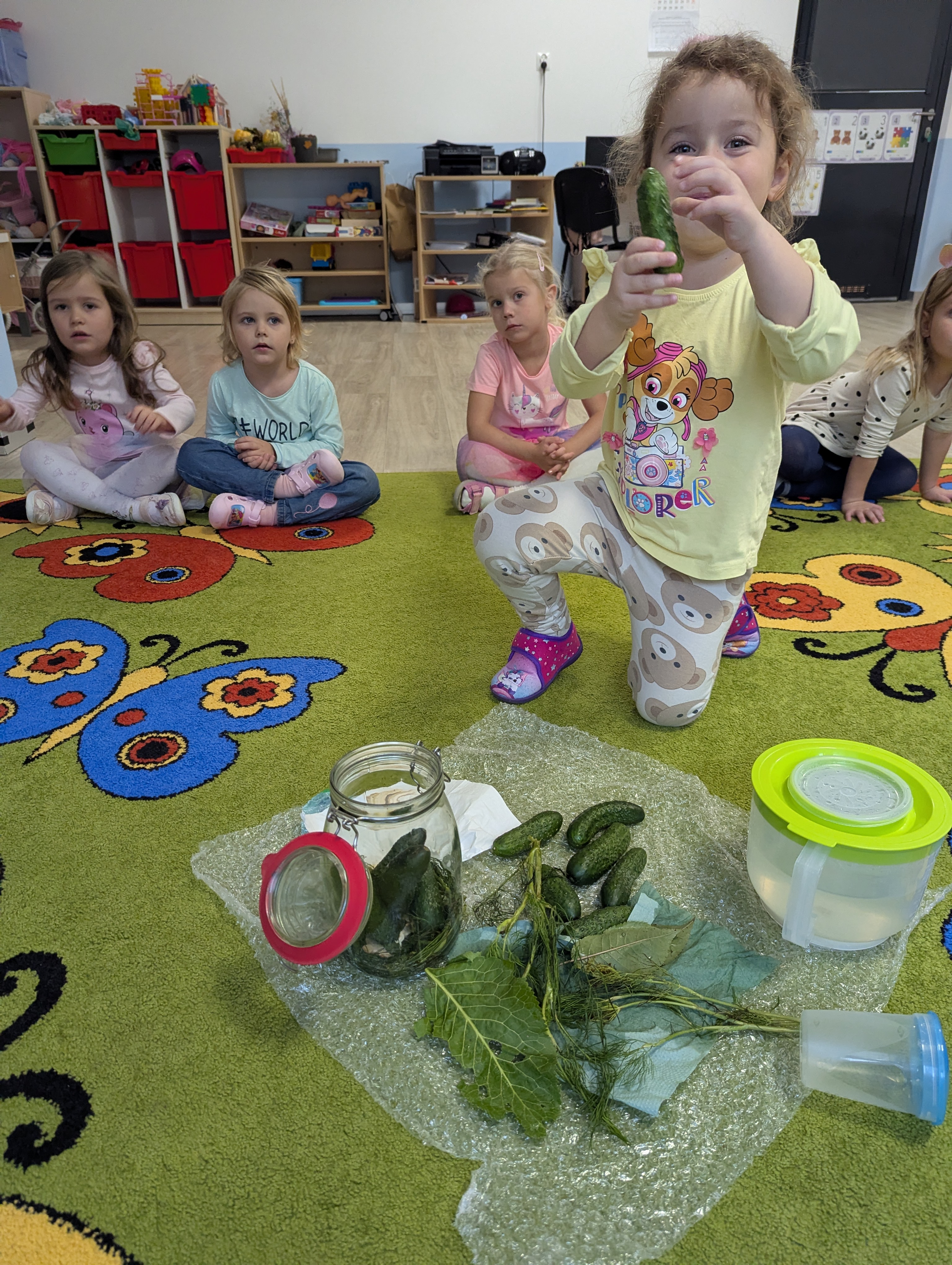 Dzieci poznały cały proces przygotowywania ogórków do kiszenia – od dokładnego mycia, przez dodawanie aromatycznych przypraw, aż po staranne włożenie ich do słoików. Każdy miał swój ważny udział, a uśmiechy towarzyszyły nam na każdym etapie pracy.