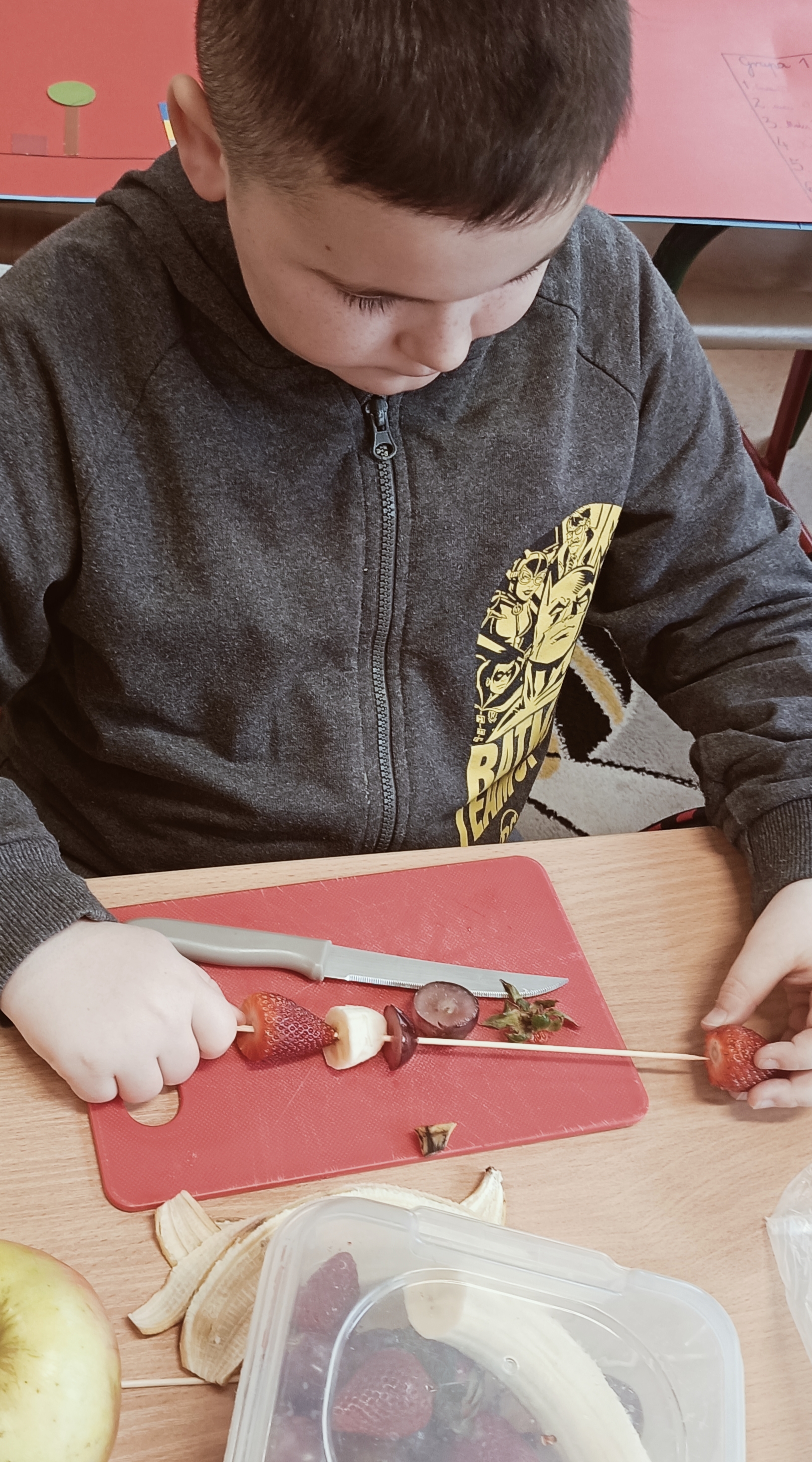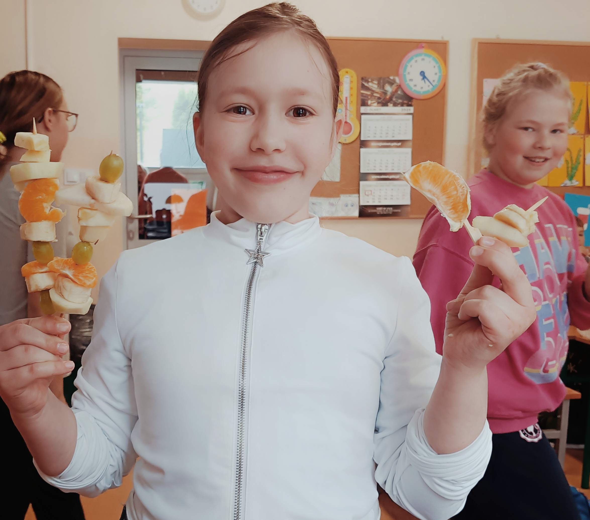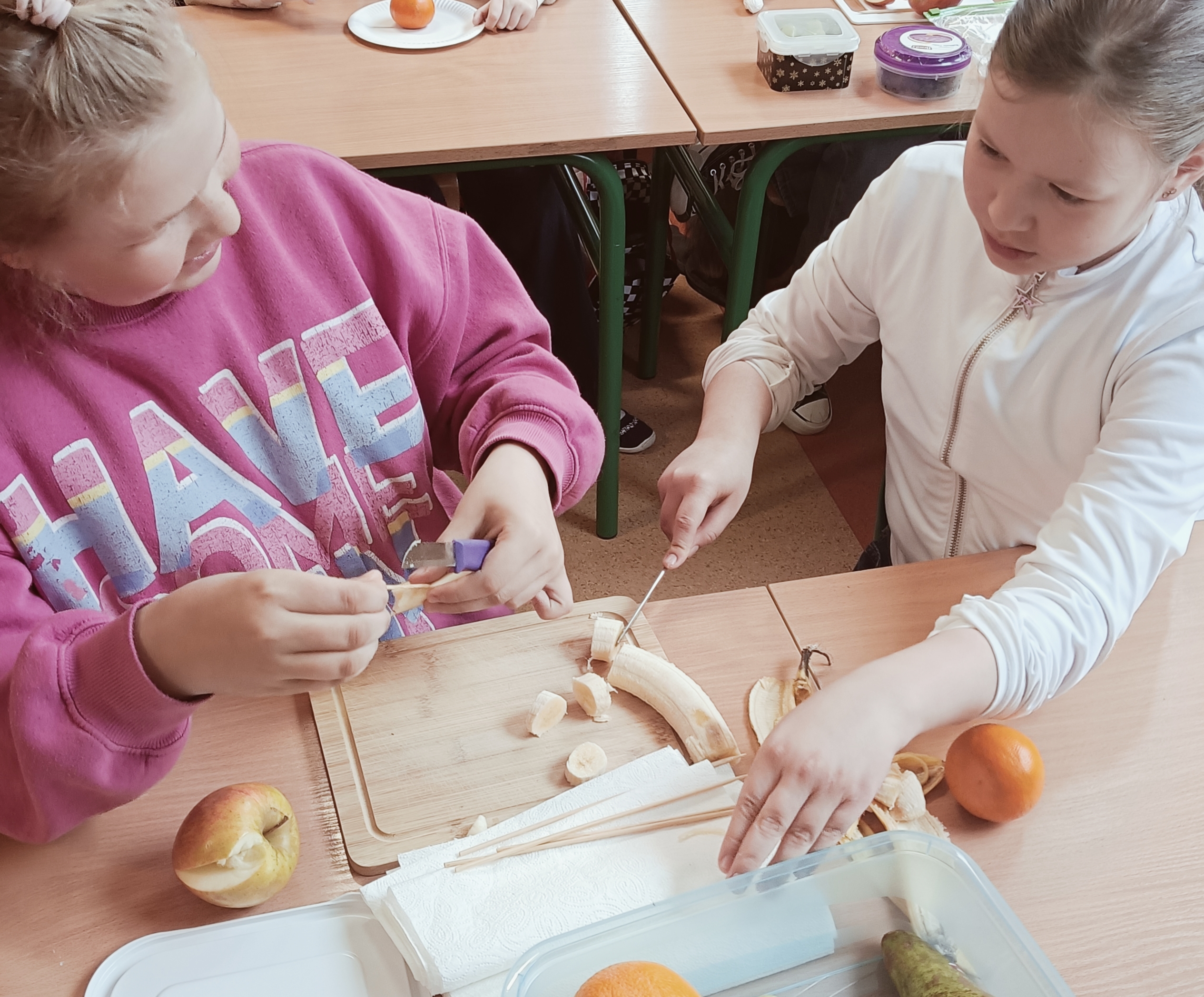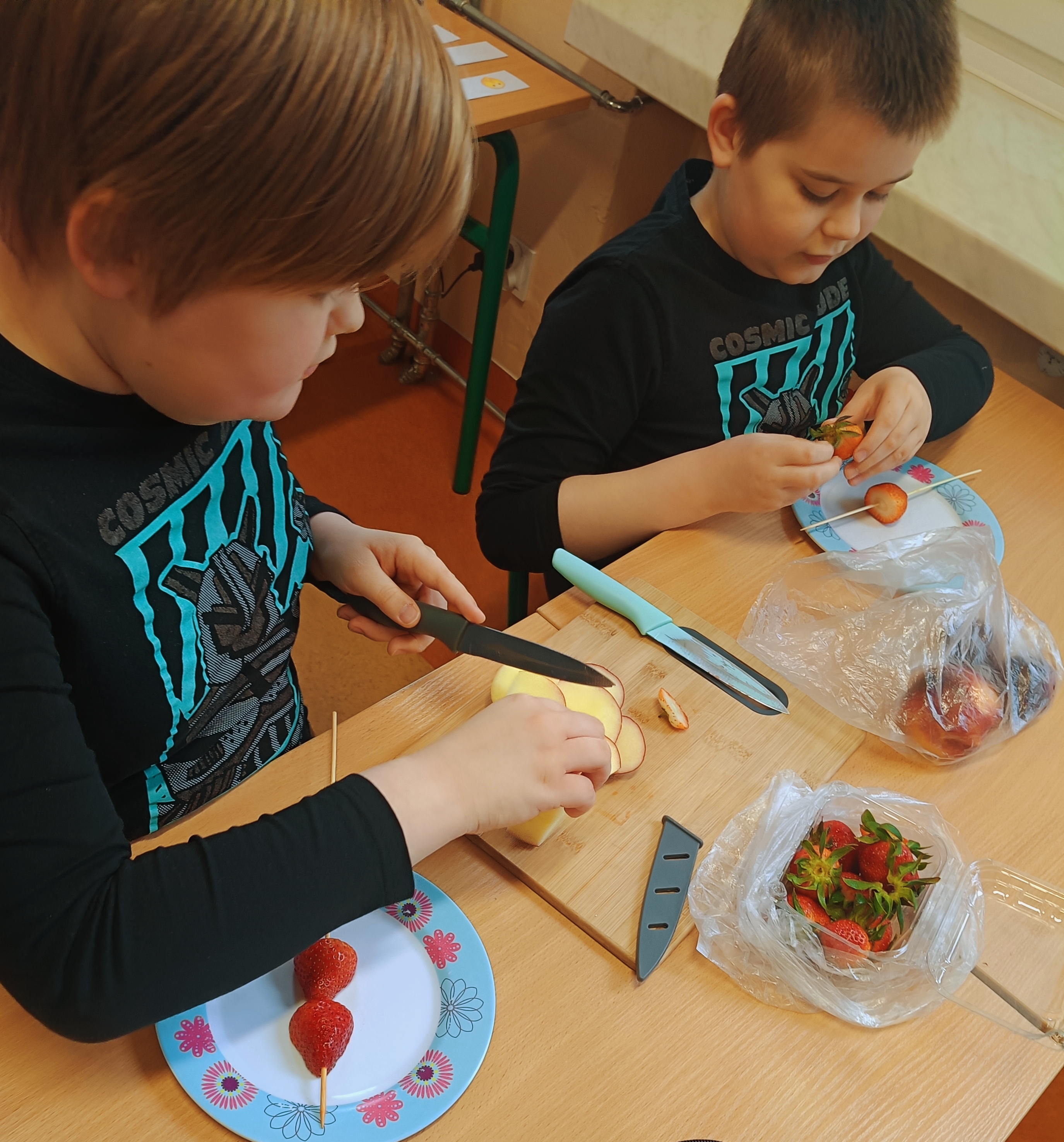 Uczniowie wzięli udział w wyjątkowych zajęciach kulinarnych, podczas których przygotowywali zdrowe i kolorowe szaszłyki owocowe. Dzieci samodzielnie dobierały owoce, kroiły je na kawałki i układały na patyczkach, tworząc pyszne, pełne witamin przekąski.