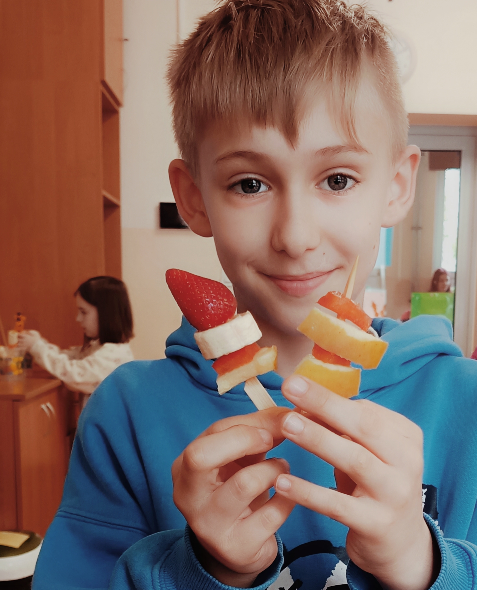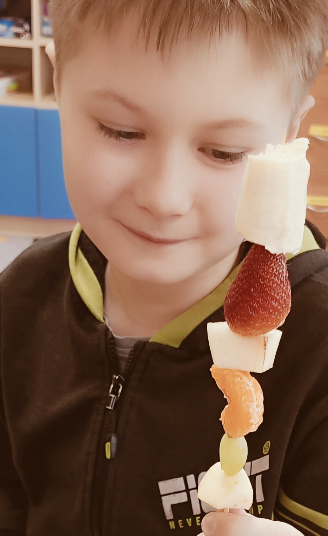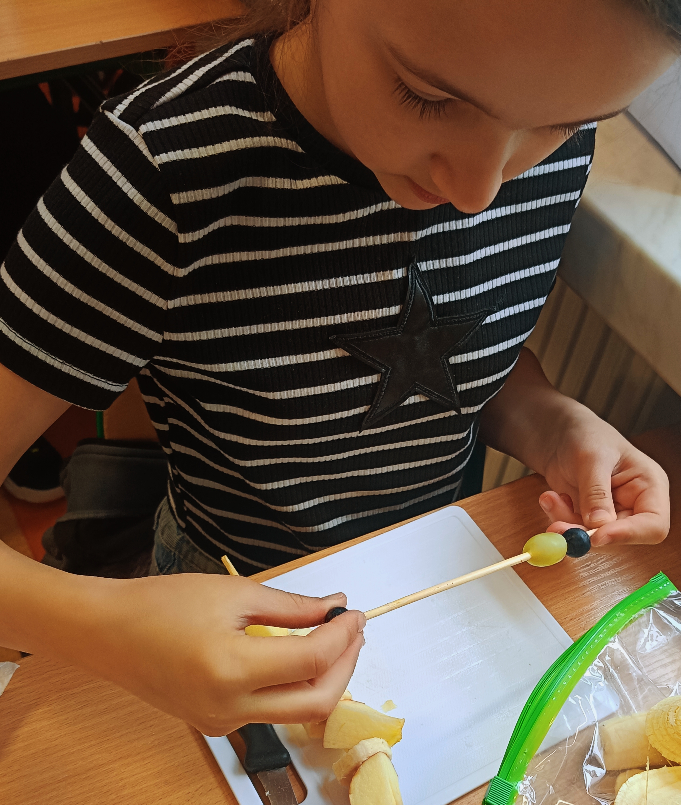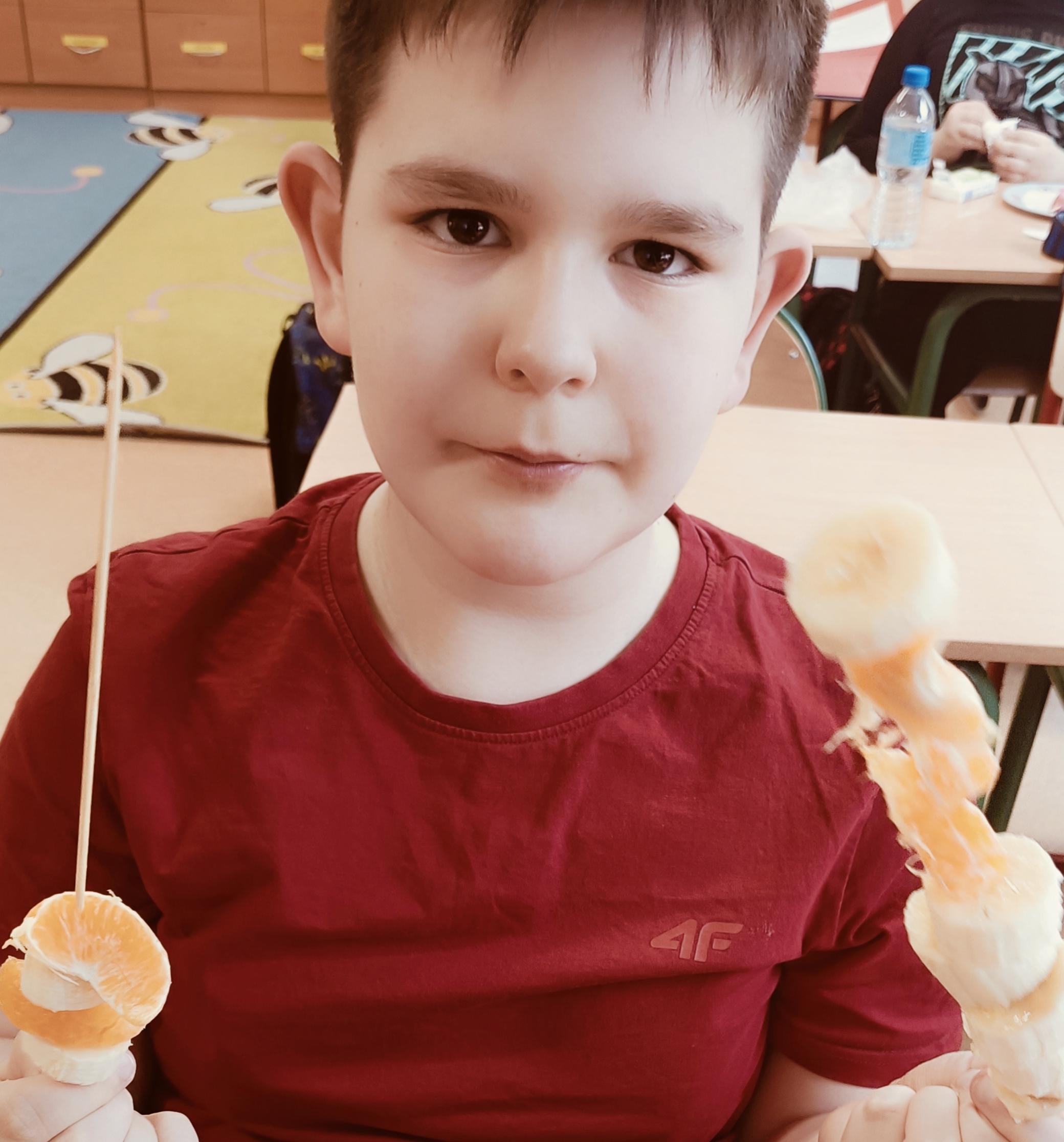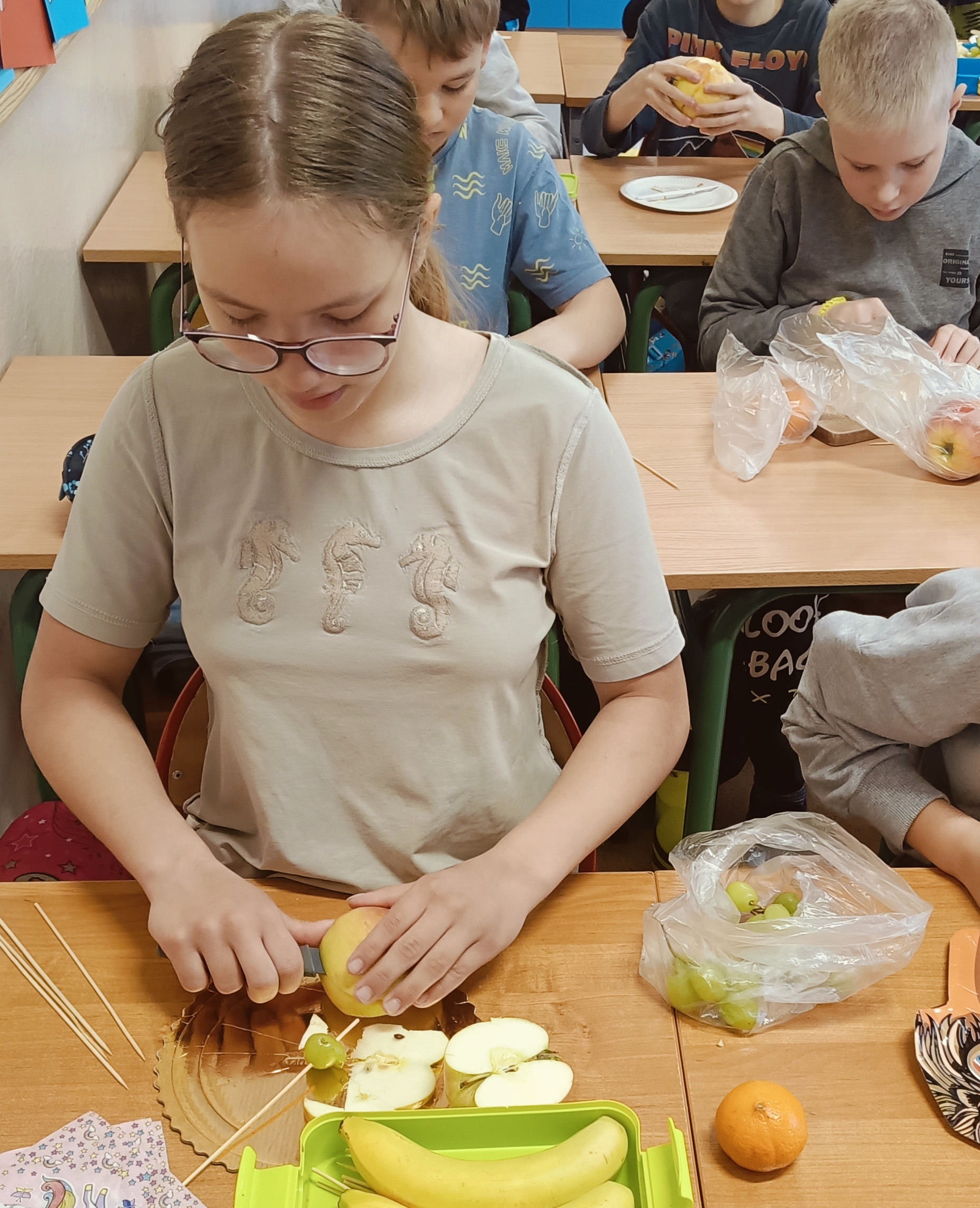 Uczniowie wzięli udział w wyjątkowych zajęciach kulinarnych, podczas których przygotowywali zdrowe i kolorowe szaszłyki owocowe. Dzieci samodzielnie dobierały owoce, kroiły je na kawałki i układały na patyczkach, tworząc pyszne, pełne witamin przekąski.