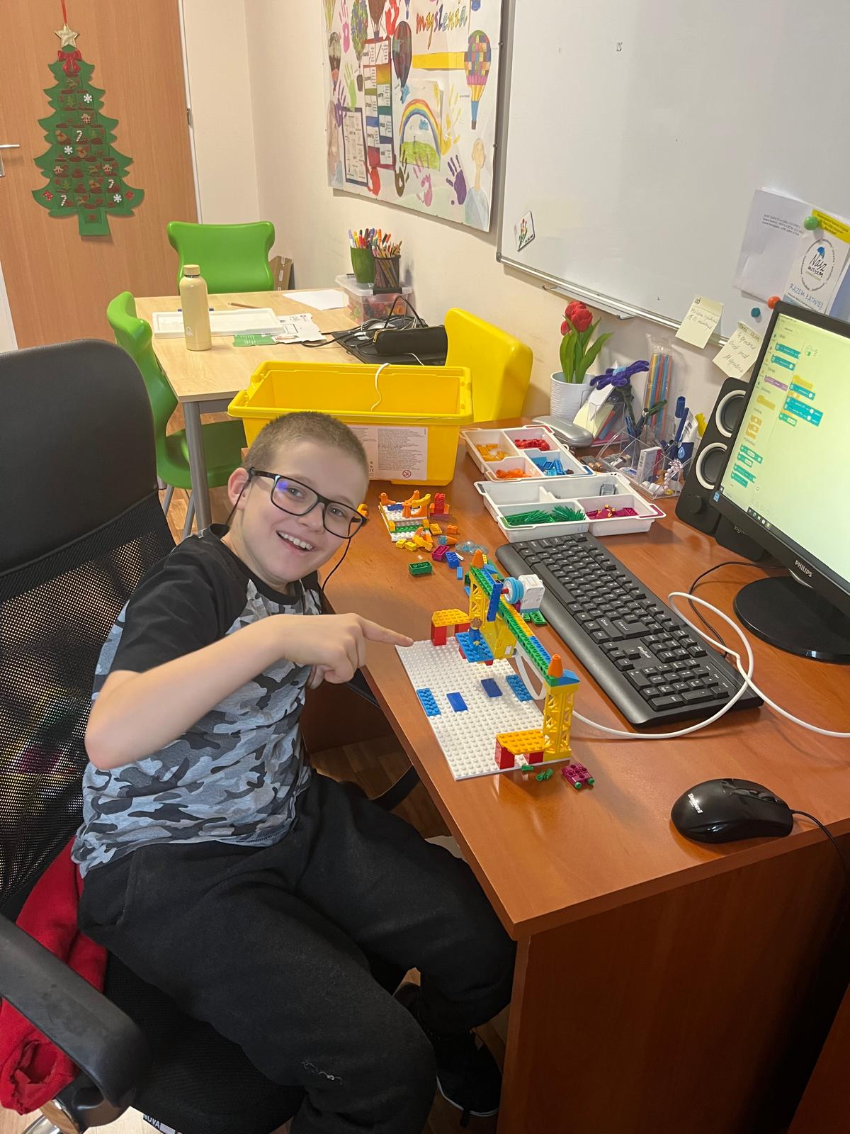 W dniu 5 grudnia 2025 roku na zajęciach dodatkowych z uczniem Piotrem Kusztalem z klasy 3b wykorzystano klocki lego SPIKE. Uczeń miał za zadanie zbudować wybrane budowle, a następnie stworzyć i przetestować program, który uruchomi jego konstrukcje. Piotr zbudował Śmigający śmigłowiec i Kolejkę linową. Umiejętność okazała się dla ucznia bardzo prosta. Zajęcia dostarczyły mu mnóstwo radości, emocji i dokładnego czytania instrukcji.