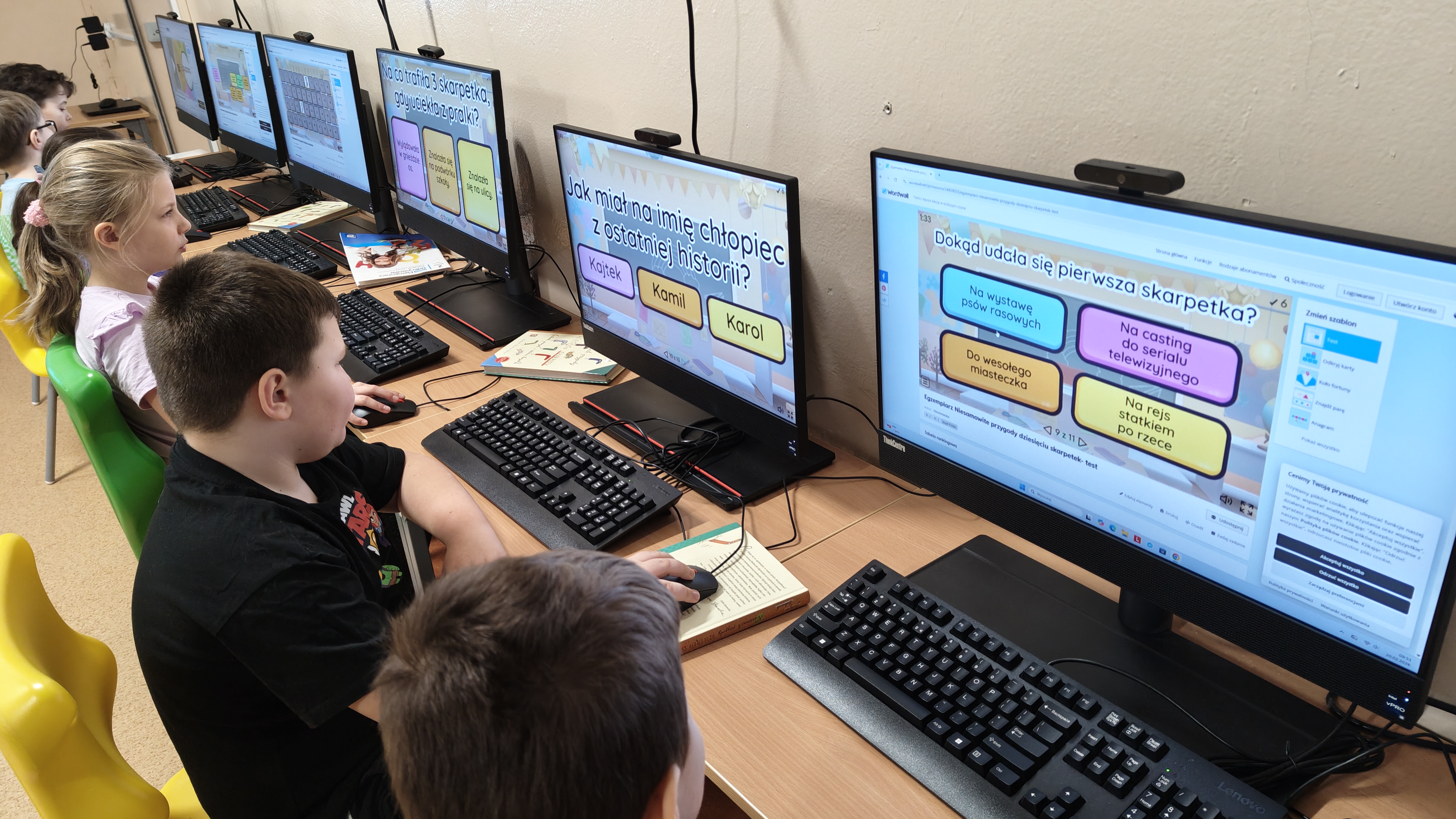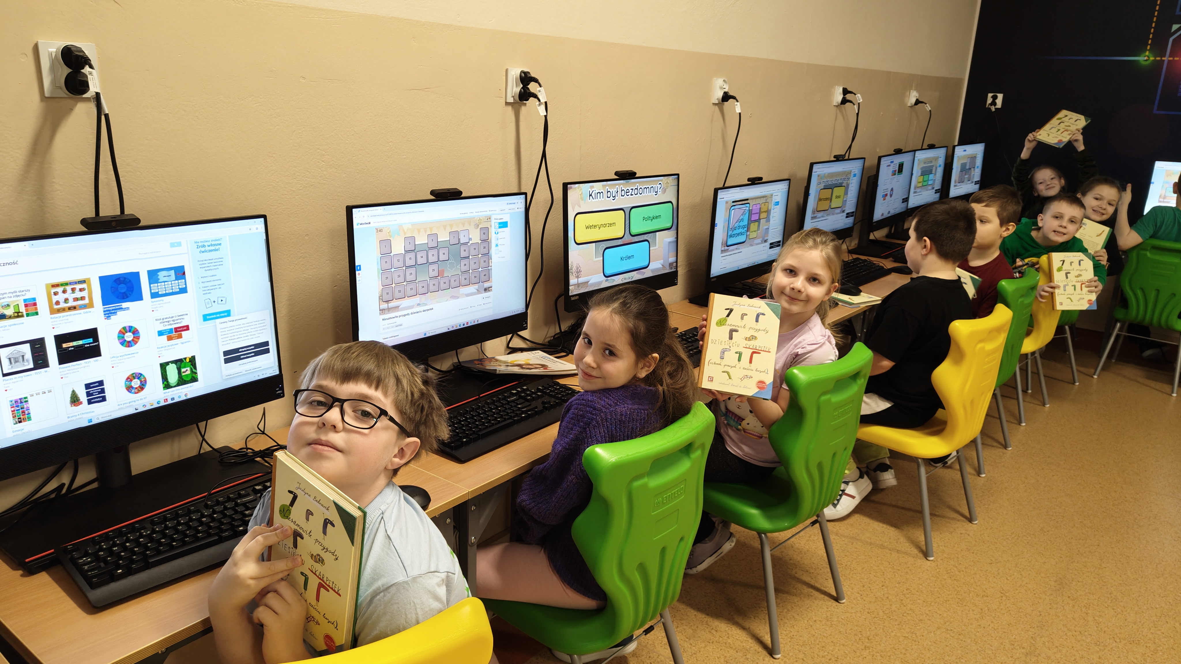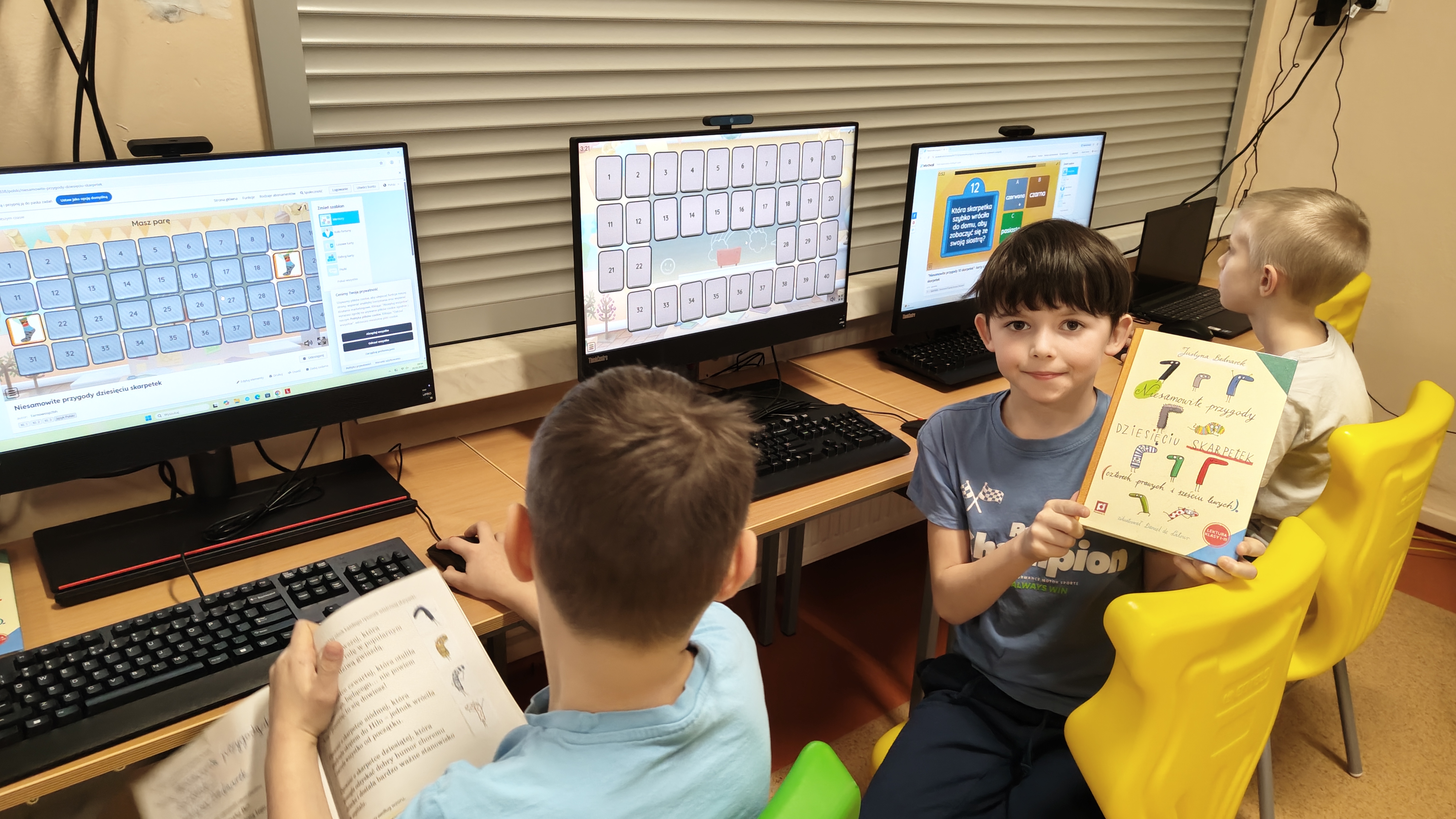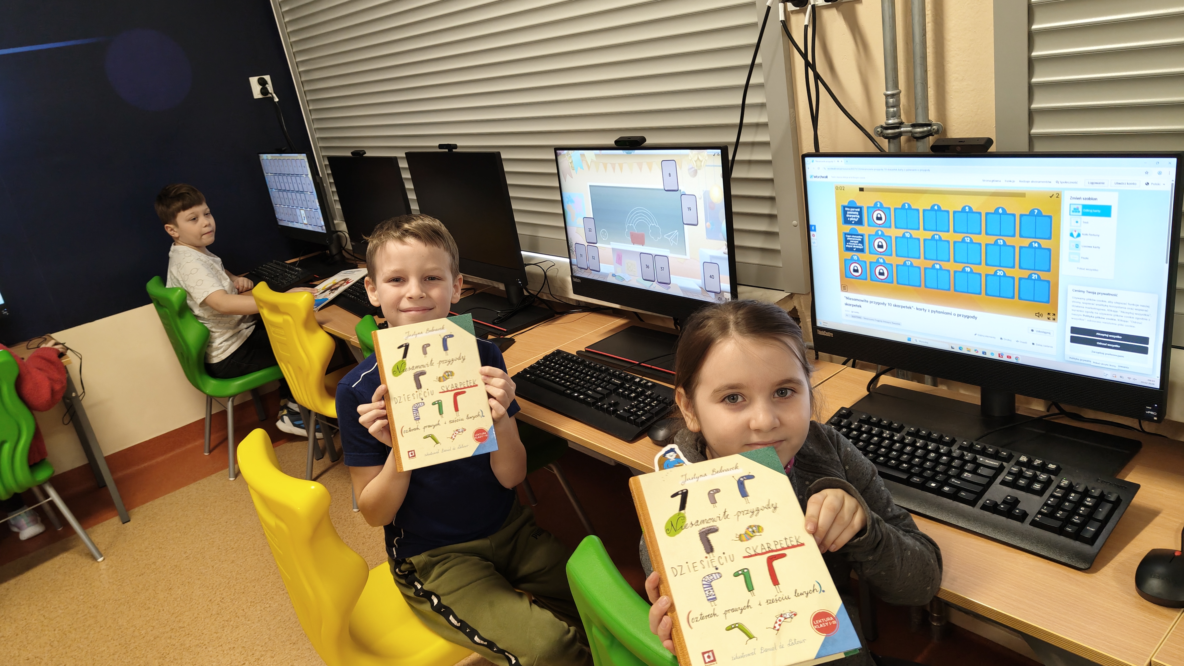 "Niesamowite przygody dziesięciu skarpetek... Justyny Bednarek -to lektura, która zawędrowała z uczniami naszej klasy w miniony piątek do pracowni komputerowej. Tam, z wykorzystaniem różnorodnych testów online (teleturniej, test, odkryj karty, koło fortuny, znajdź parę itp.) sprawdzaliśmy poziom znajomości przeczytanej lektury. To był z pewnością bardzo atrakcyjny sposób sprawdzenia wiedzy uczniów, połączony z rozwijaniem kompetencji informatycznych.