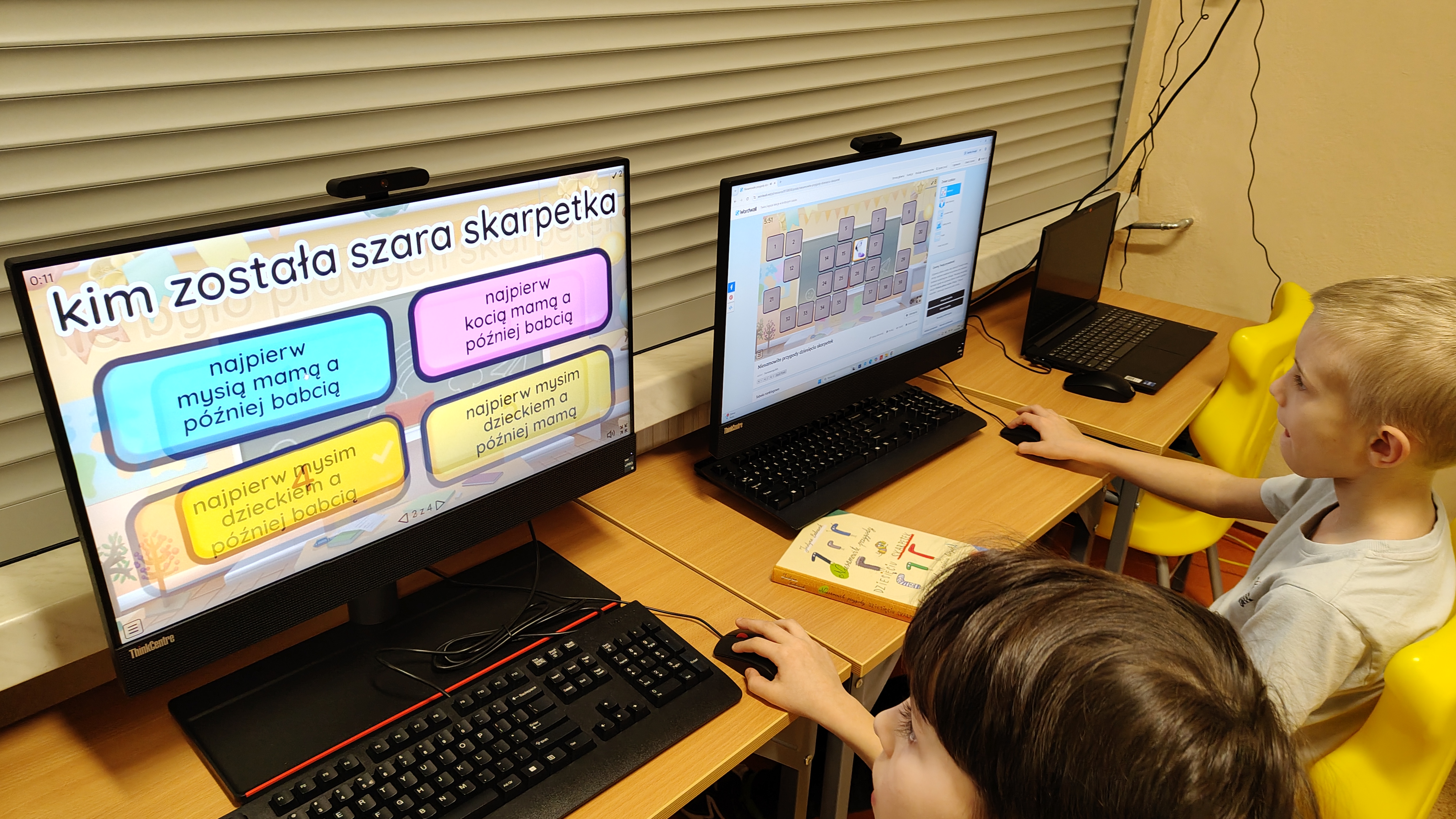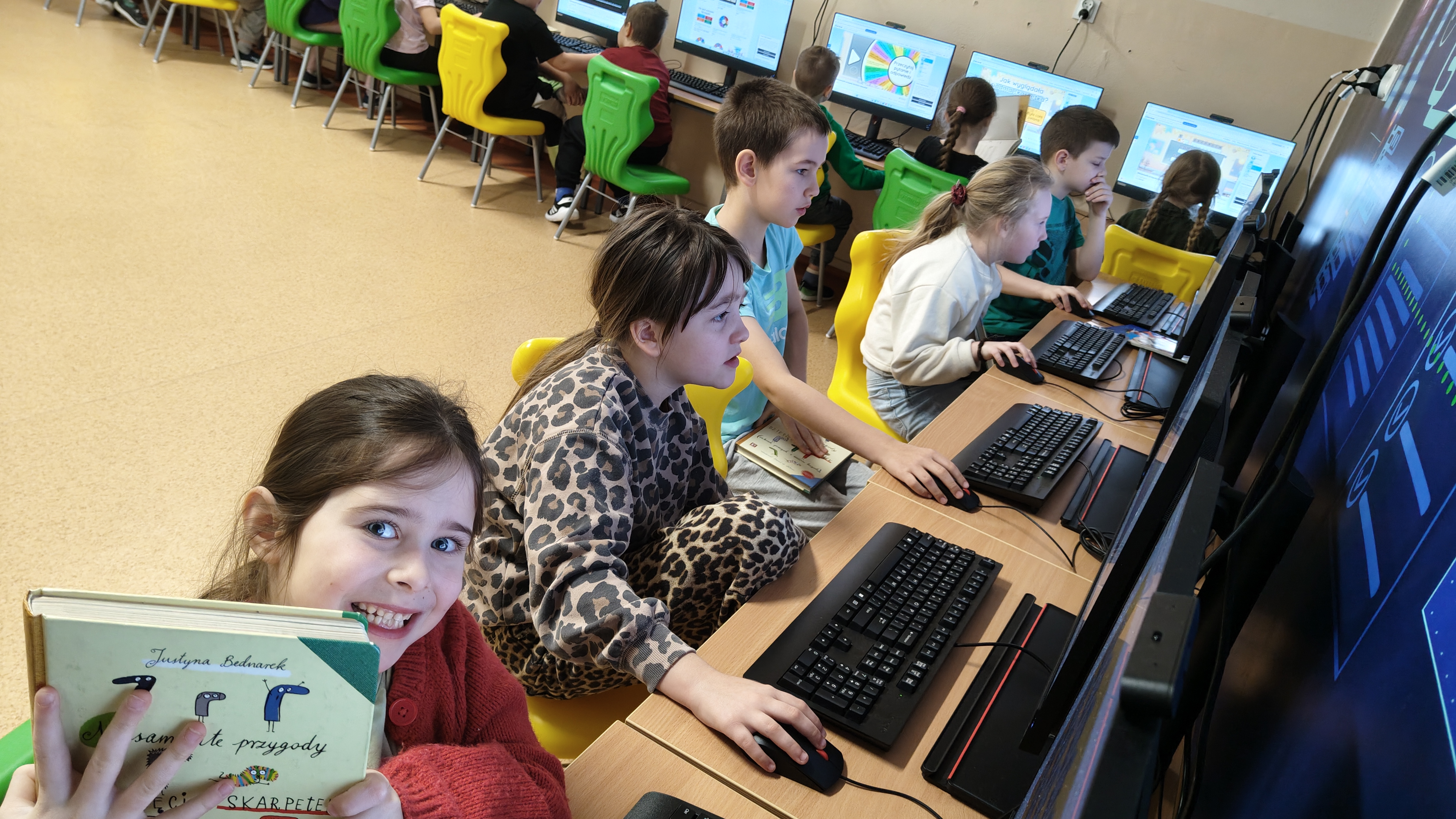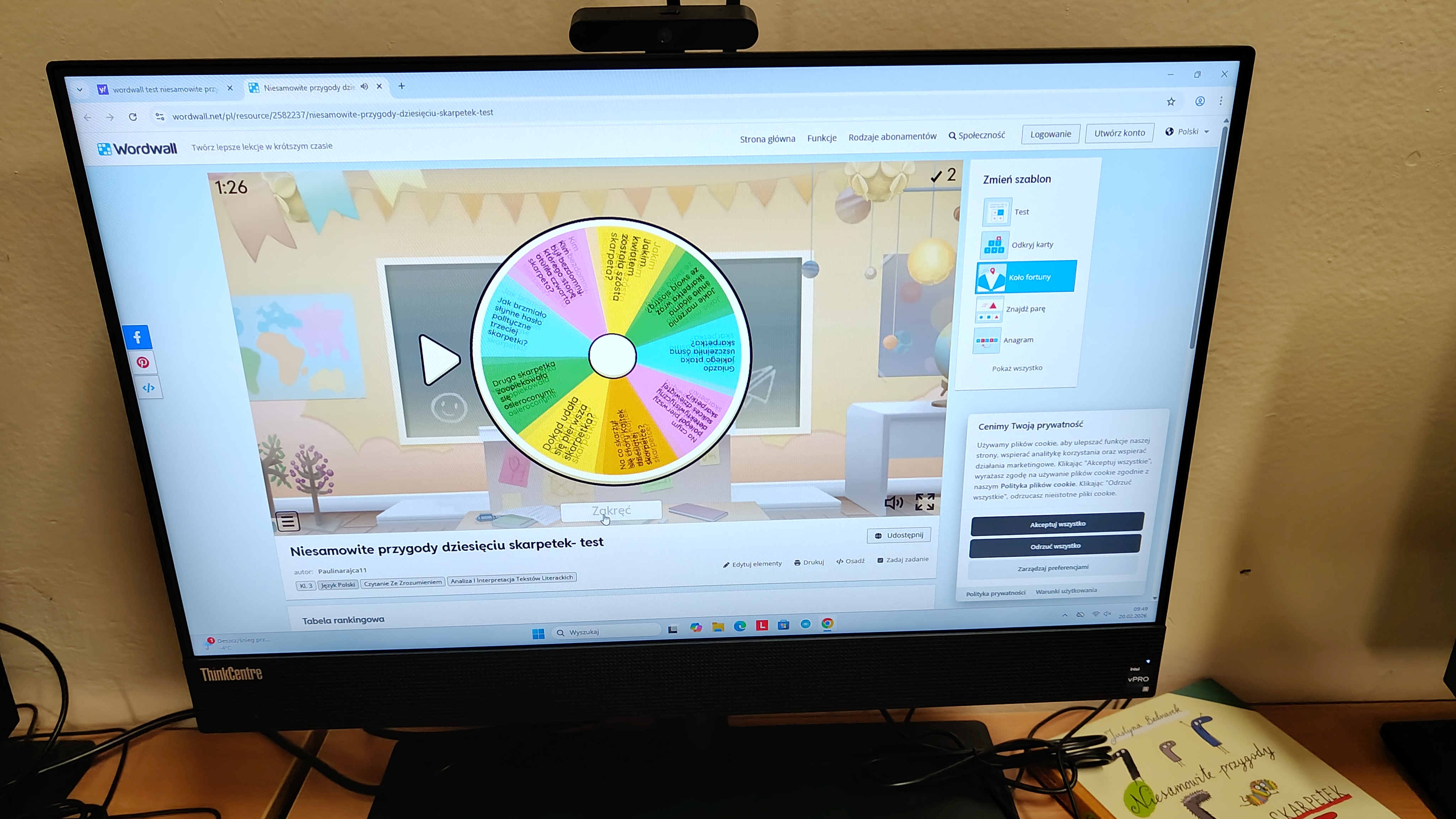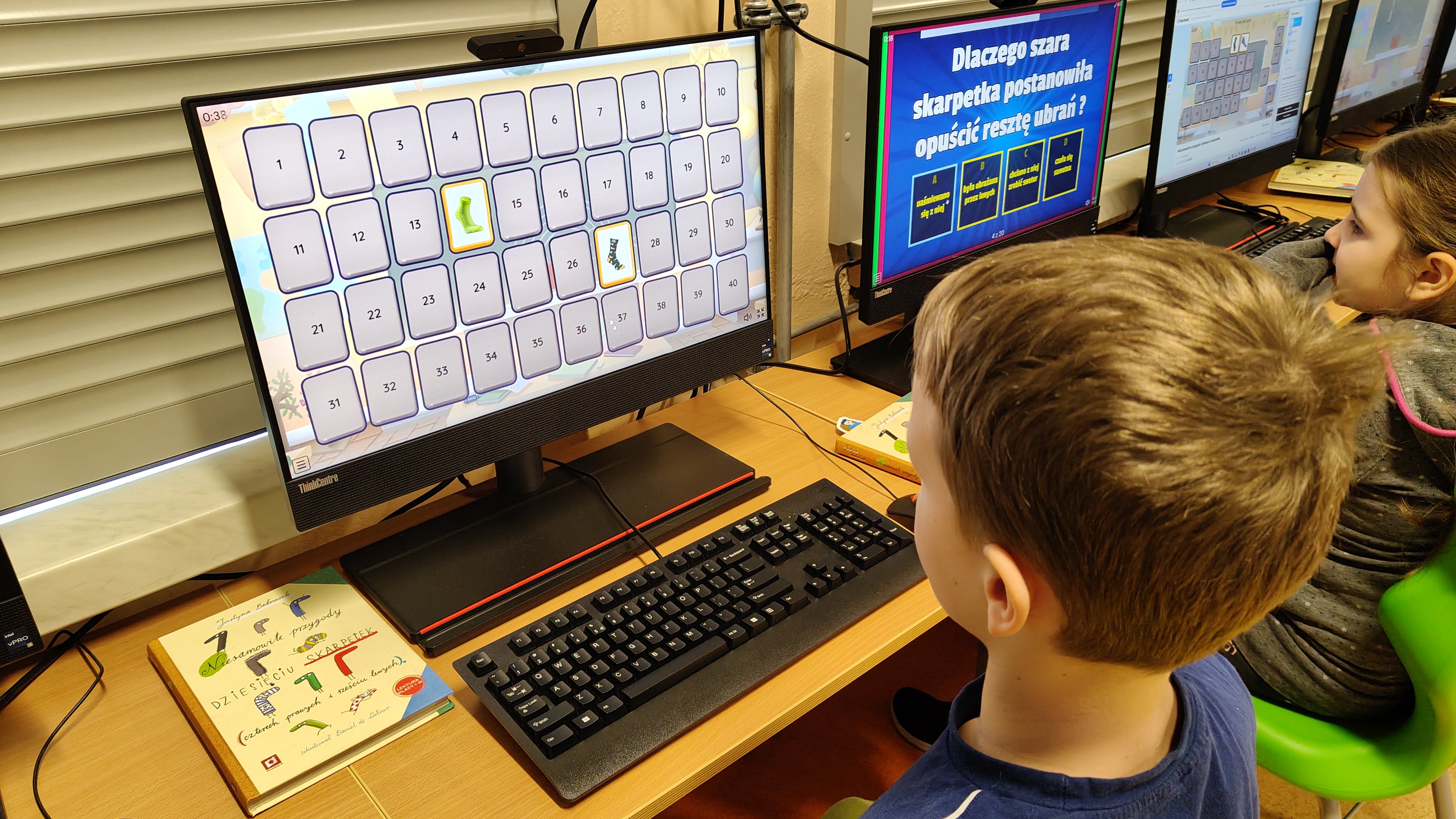 "Niesamowite przygody dziesięciu skarpetek... Justyny Bednarek -to lektura, która zawędrowała z uczniami naszej klasy w miniony piątek do pracowni komputerowej. Tam, z wykorzystaniem różnorodnych testów online (teleturniej, test, odkryj karty, koło fortuny, znajdź parę itp.) sprawdzaliśmy poziom znajomości przeczytanej lektury. To był z pewnością bardzo atrakcyjny sposób sprawdzenia wiedzy uczniów, połączony z rozwijaniem kompetencji informatycznych.