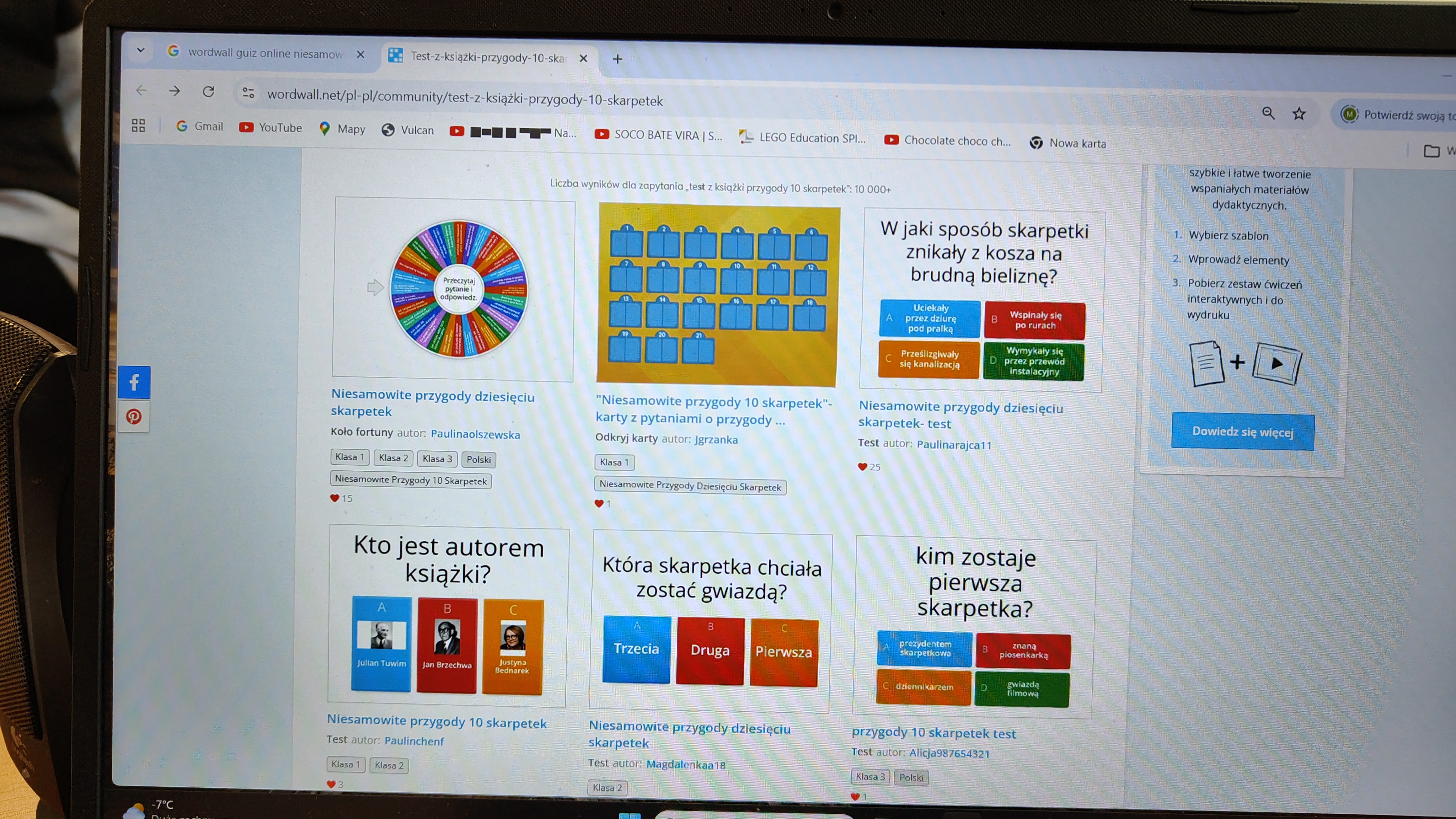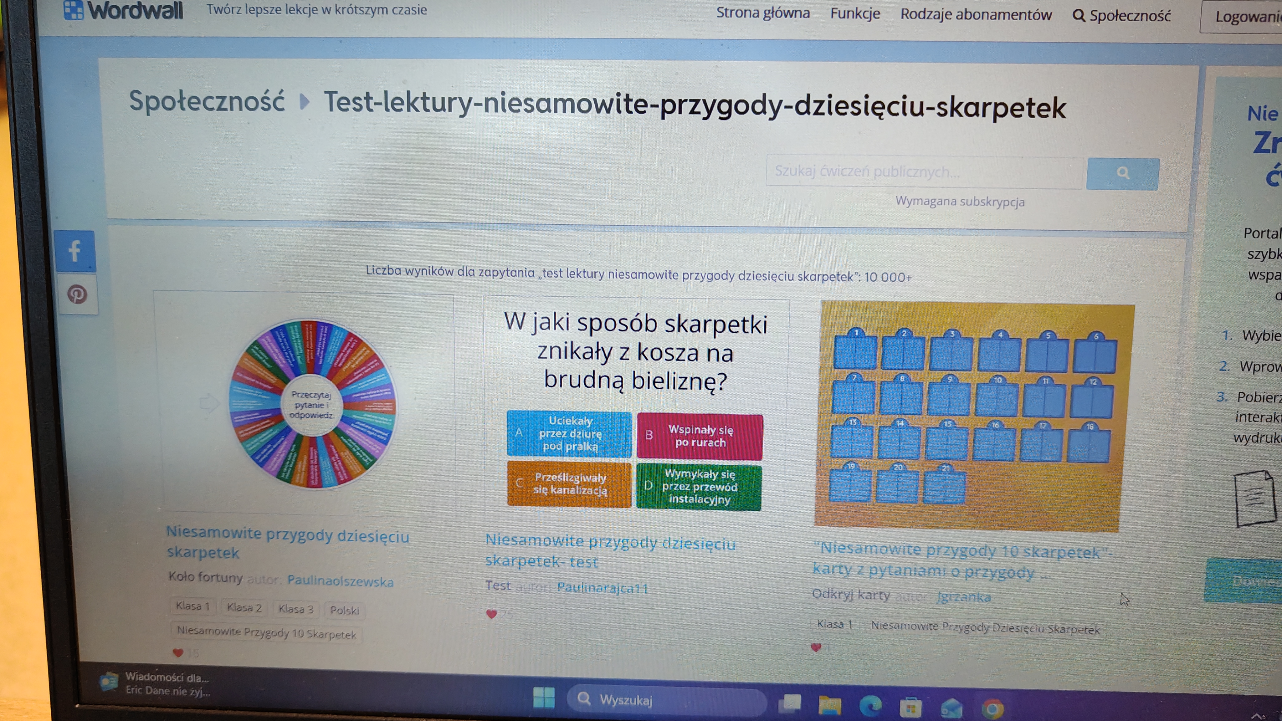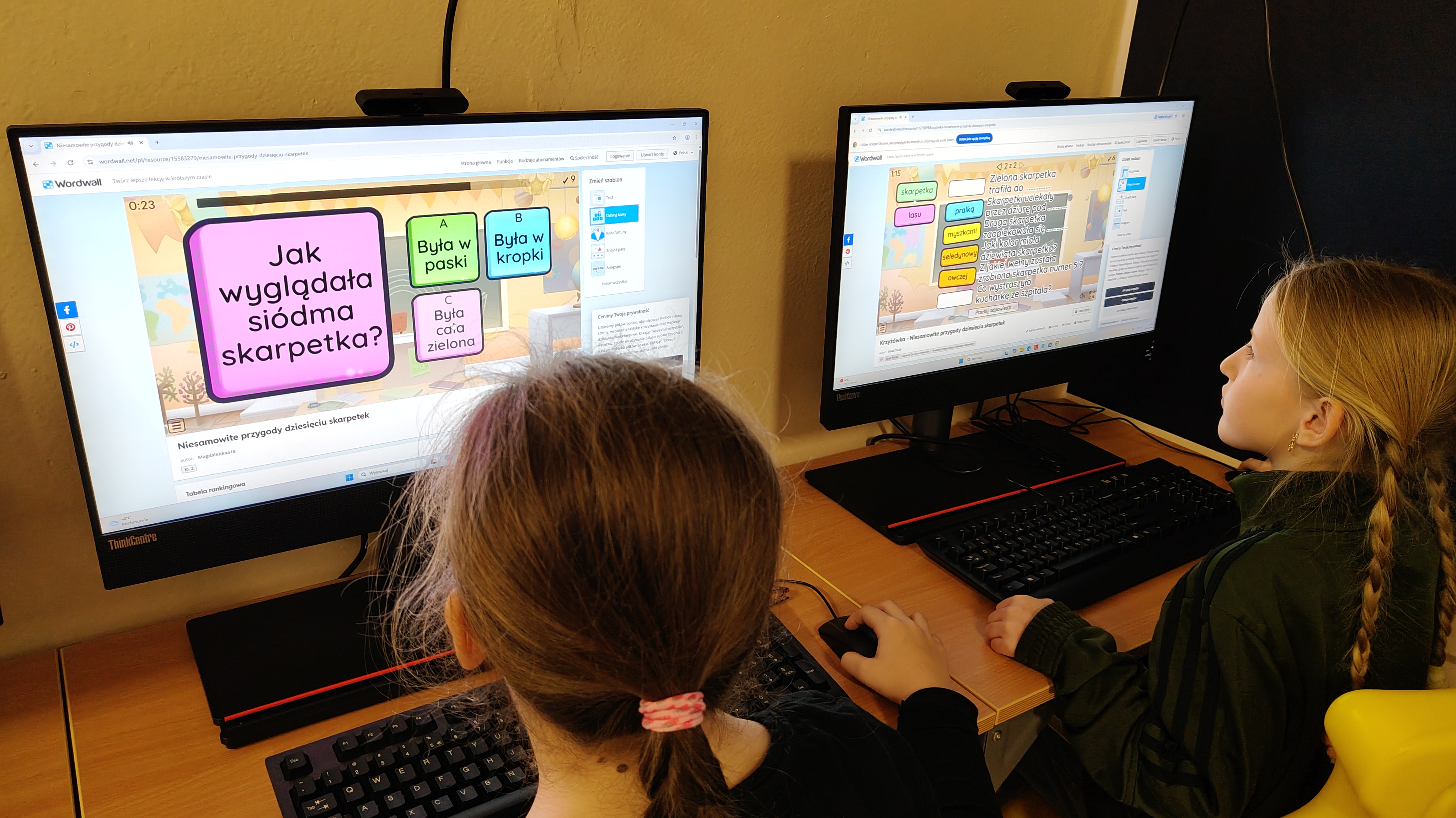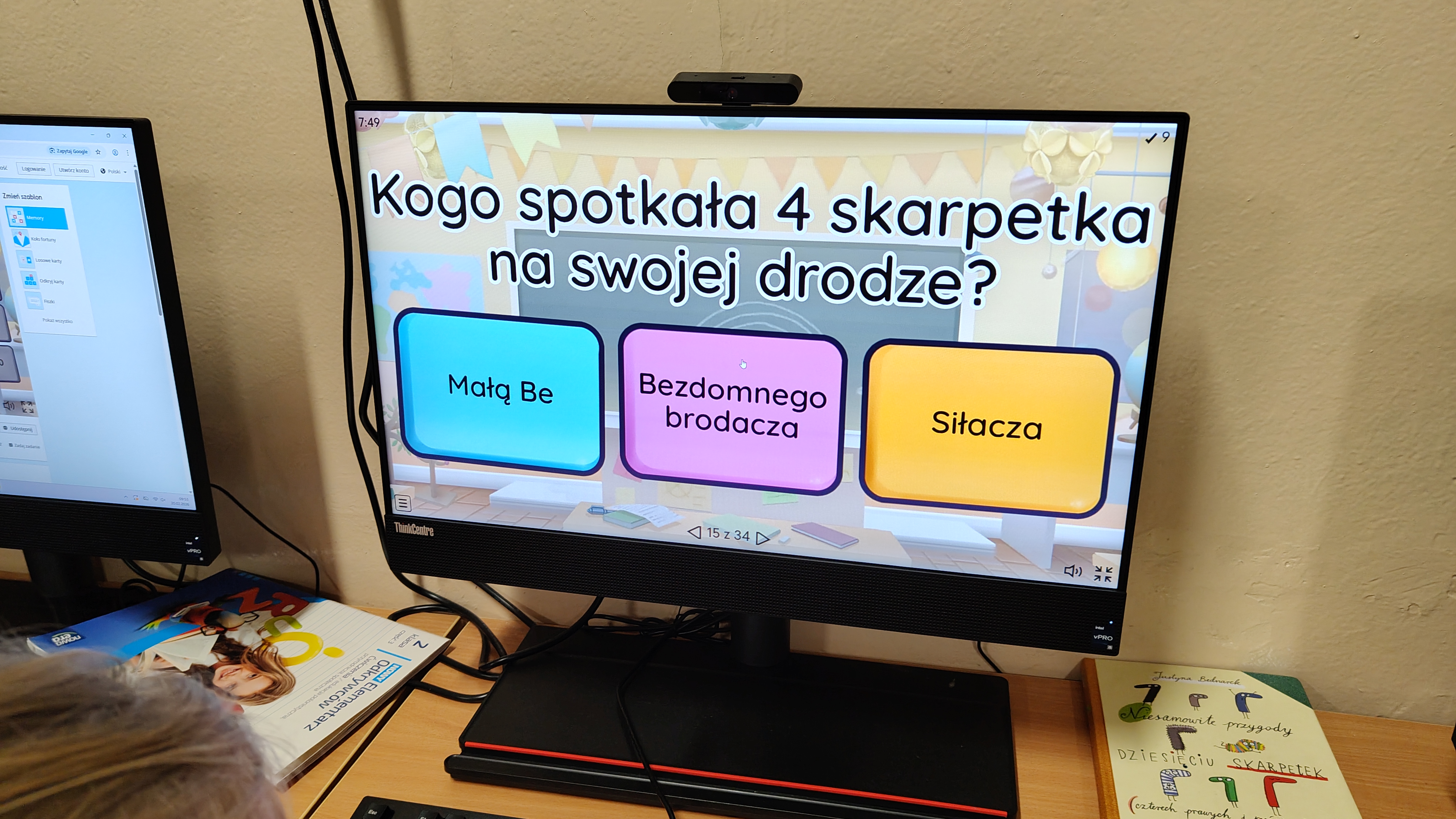 "Niesamowite przygody dziesięciu skarpetek... Justyny Bednarek -to lektura, która zawędrowała z uczniami naszej klasy w miniony piątek do pracowni komputerowej. Tam, z wykorzystaniem różnorodnych testów online (teleturniej, test, odkryj karty, koło fortuny, znajdź parę itp.) sprawdzaliśmy poziom znajomości przeczytanej lektury. To był z pewnością bardzo atrakcyjny sposób sprawdzenia wiedzy uczniów, połączony z rozwijaniem kompetencji informatycznych.