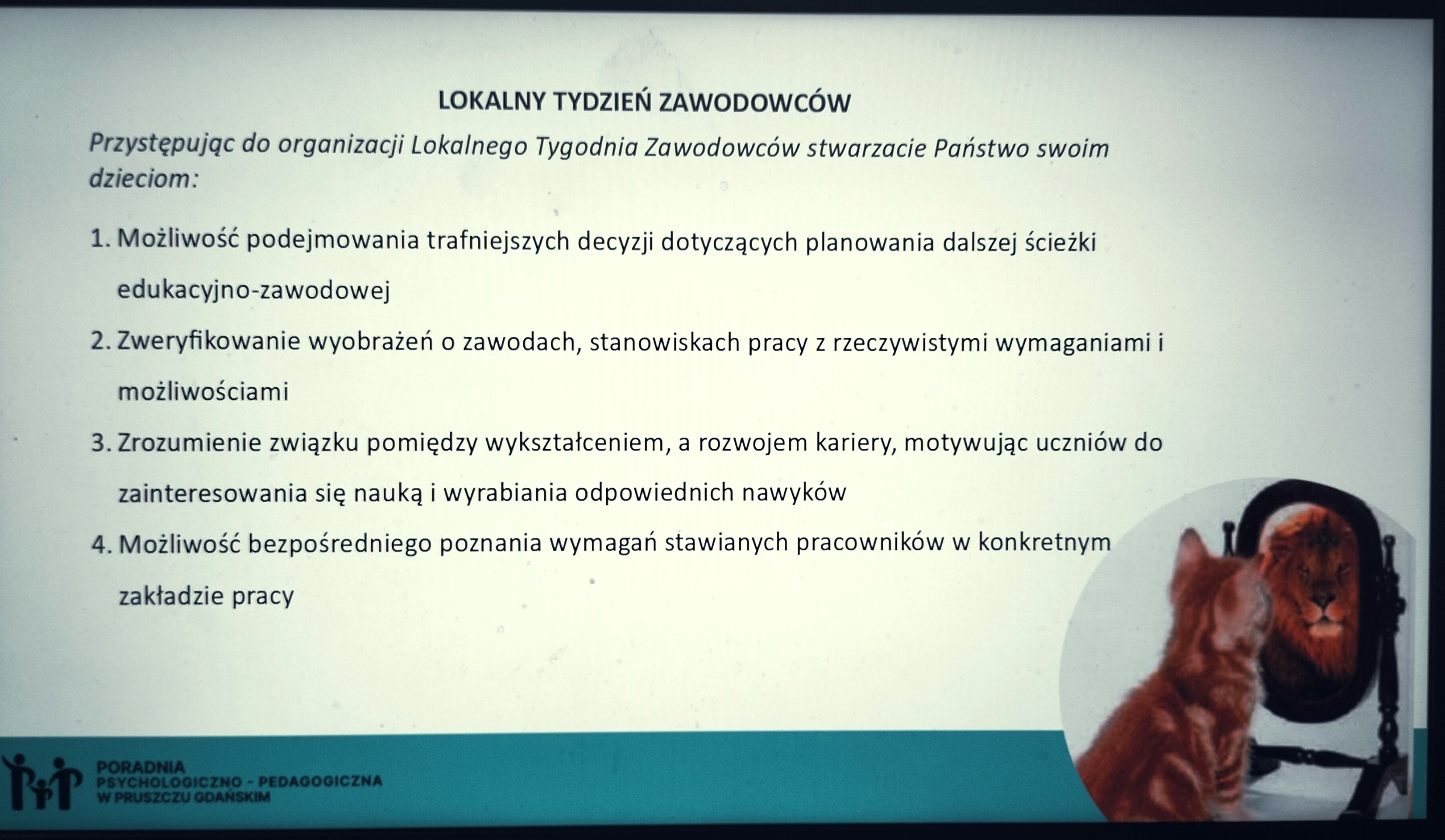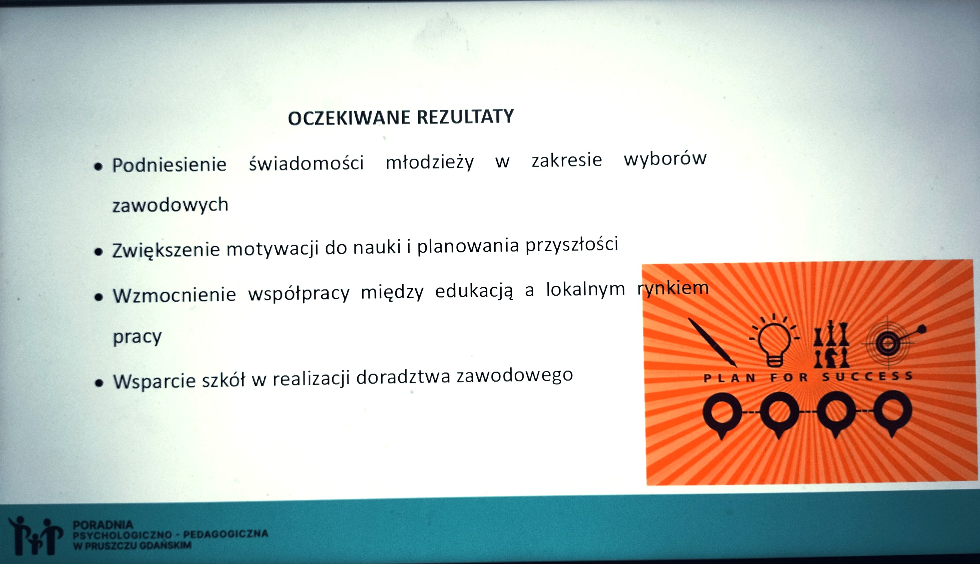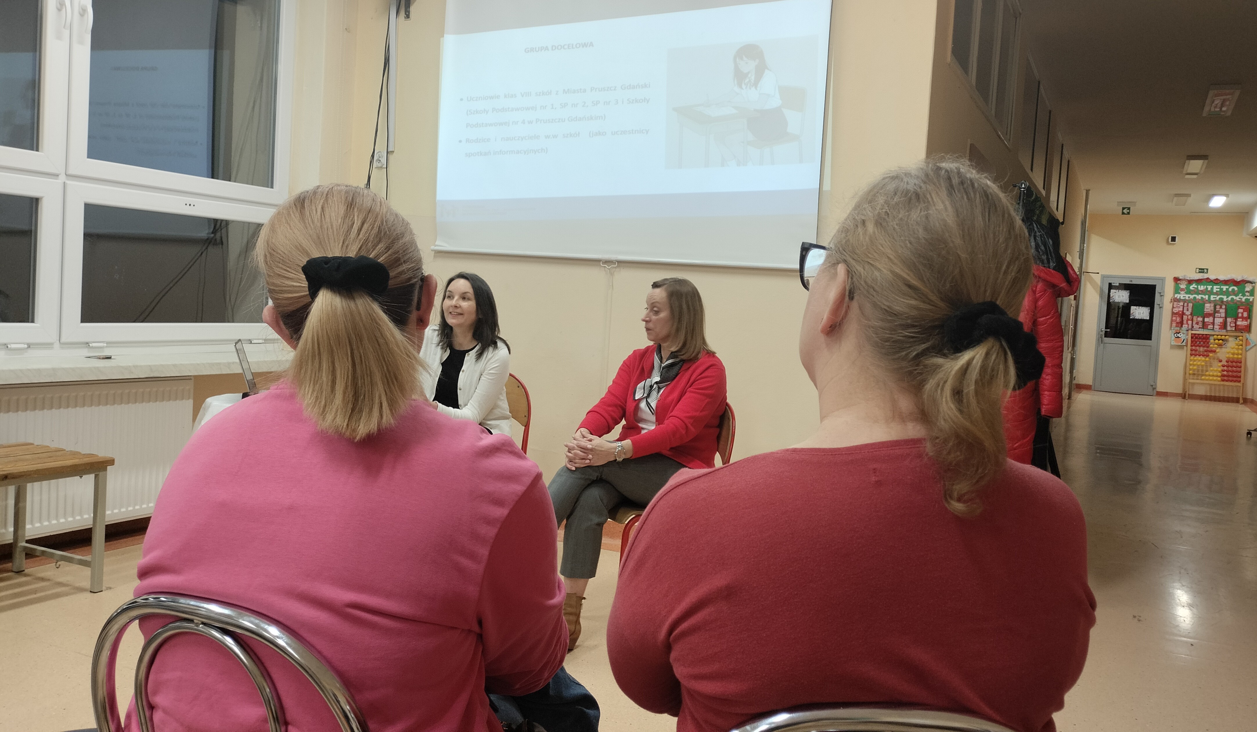 Pani Ewa Ksepka, doradca zawodowy z Poradni Psychologiczno-Pedagogicznej w Pruszczu Gdańskim, przedstawiła ideę projektu, natomiast psycholog p. Jolanta Zianowicz-Szulfer omówiła znaczącą rolę rodziców w procesie podejmowania decyzji edukacyjnych przez młodzież oraz potrzebę wspierania ich w tym etapie dorastania.