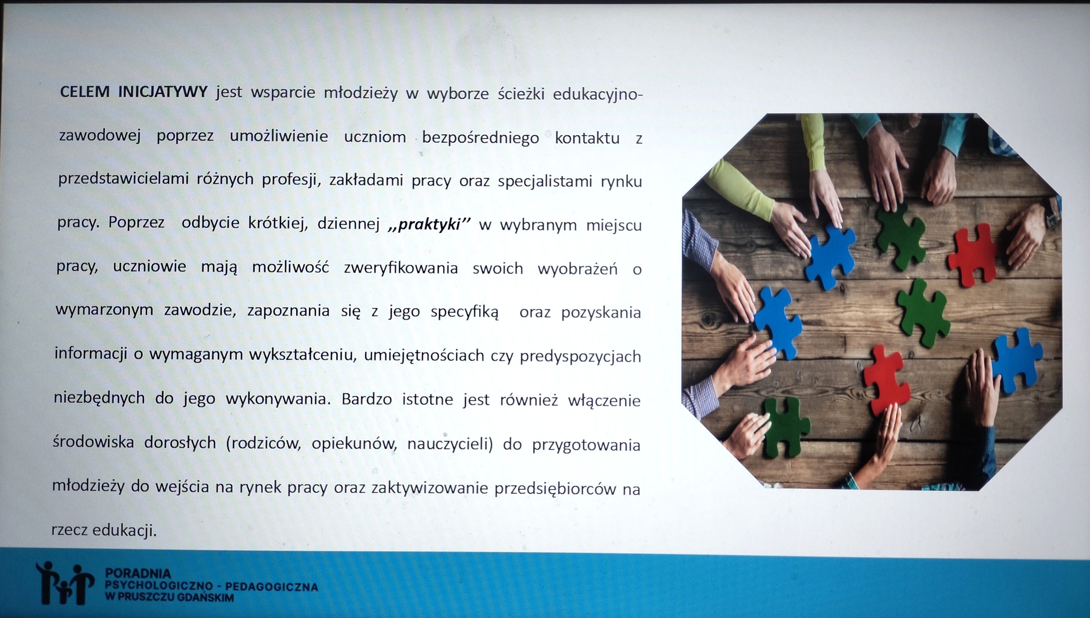 Projekt ma na celu wspieranie młodzieży w świadomym wyborze przyszłej ścieżki edukacyjno-zawodowej oraz umożliwienie kontaktu z przedstawicielami różnych zawodów.