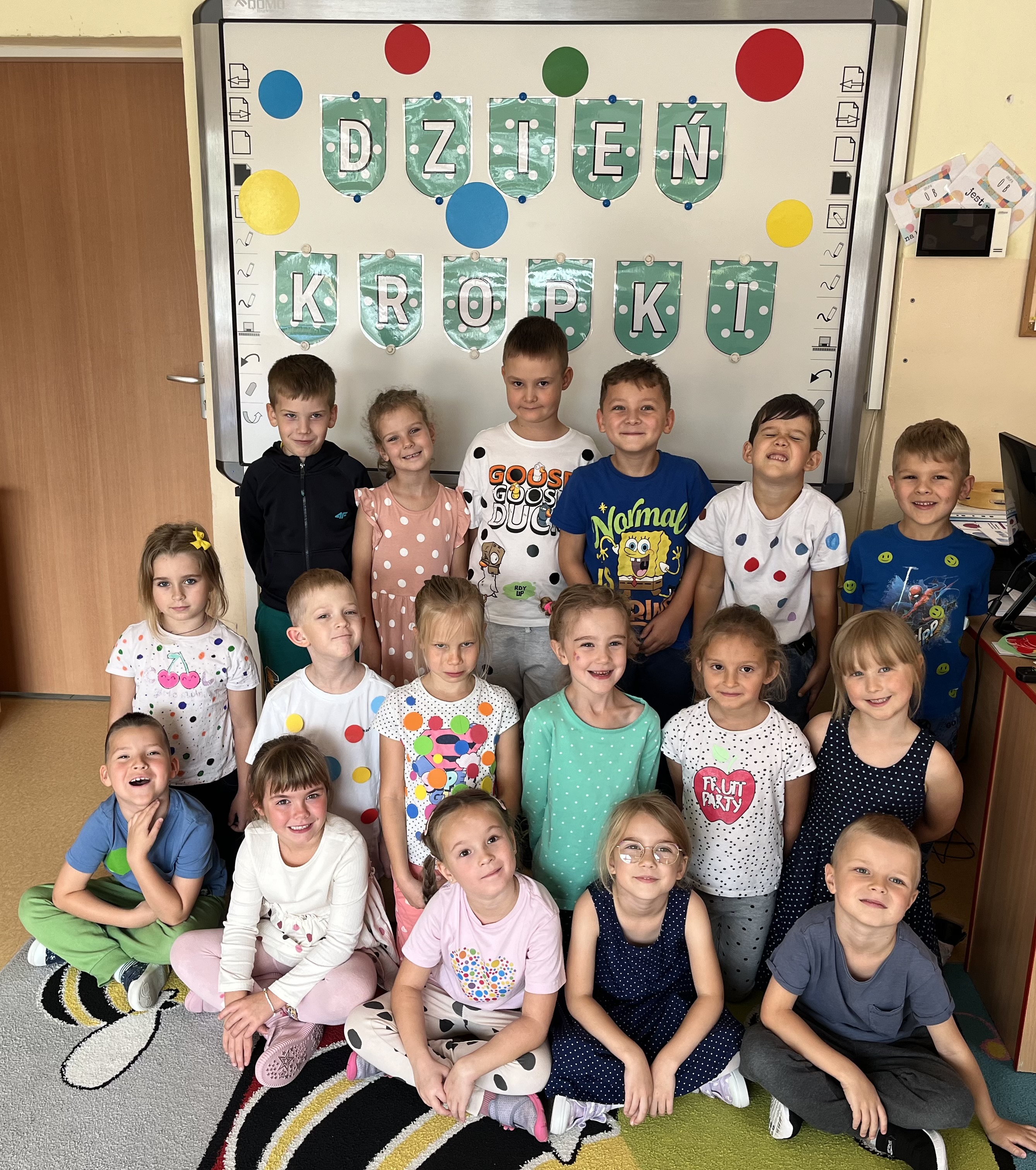 Dnia 15 września obchodziliśmy Międzynarodowy Dzień Kropki – dzień kreatywności, odwagi i zabawy! Na zajęciach poznaliśmy genezę tego święta. Dzieci uważnie wysłuchały opowiadania, jak to zwyczajna kropka zmieniła świat małej dziewczynki o imieniu Vashti. Historia ta uświadomiła przedszkolakom, że każdy z nas ma jakieś ukryte zdolności, talent. Zerówkowicze wykazały się niezwykłą kreatywnością i pomysłowością w przygotowanych zajęciach. Tego dnia również dostrzegaliśmy kropki tam, gdzie wcześniej nikt na nie nie zwracał uwagi. Nie zabrakło też kolorowych kropek na ubraniach, a nawet buźkach. Na koniec tego twórczego dnia dzieci otrzymały Dyplomy Kreatywności.