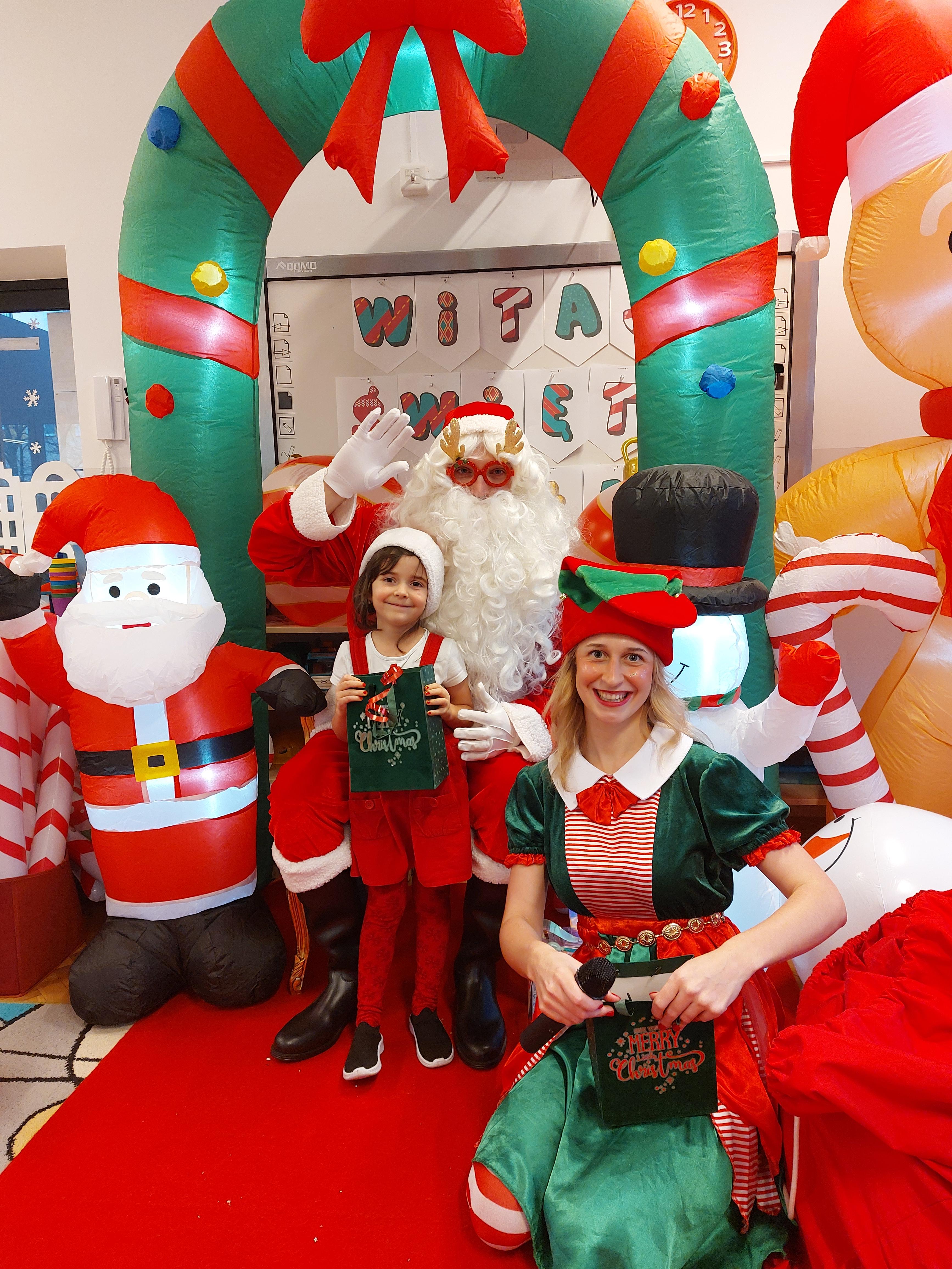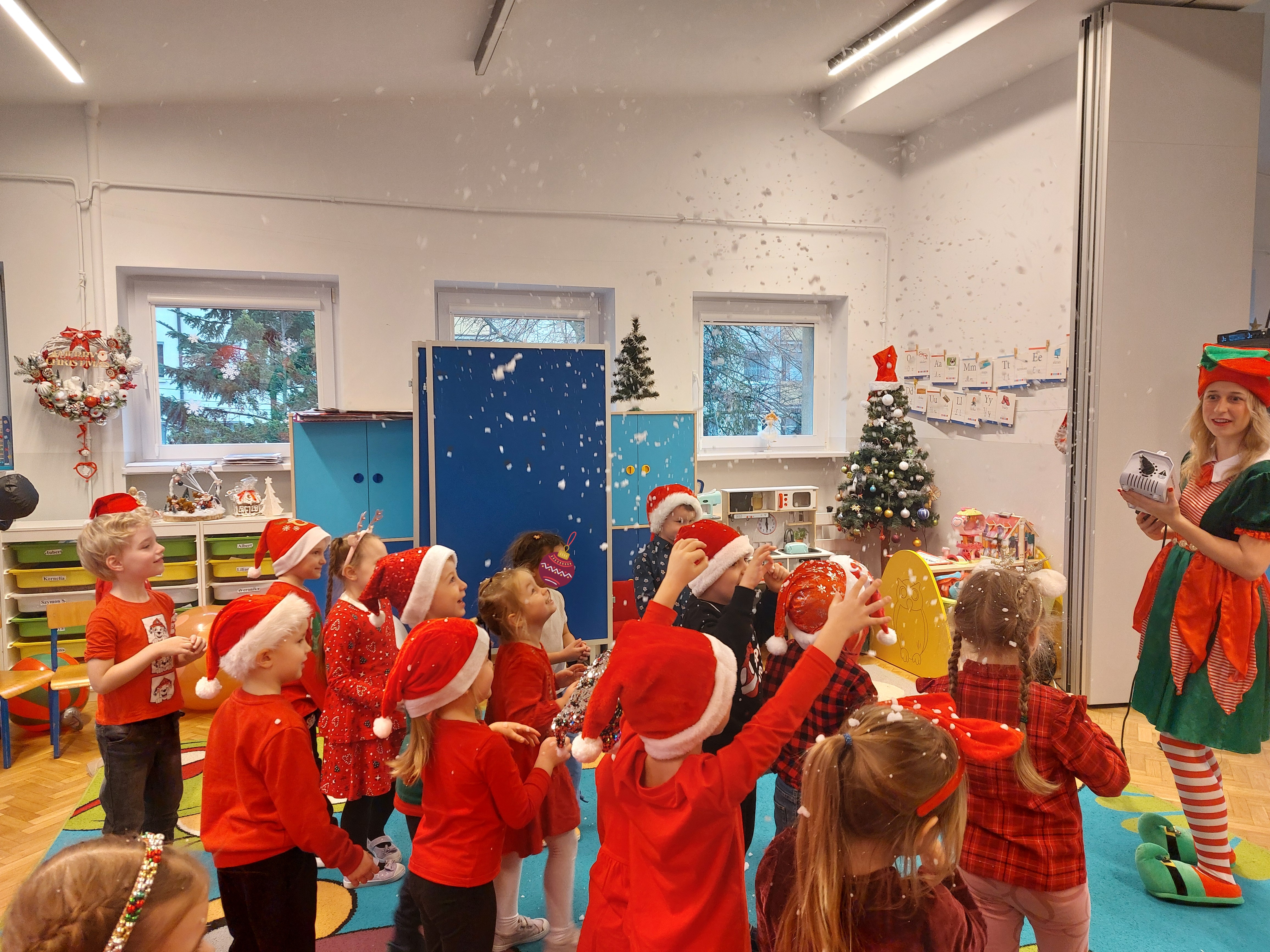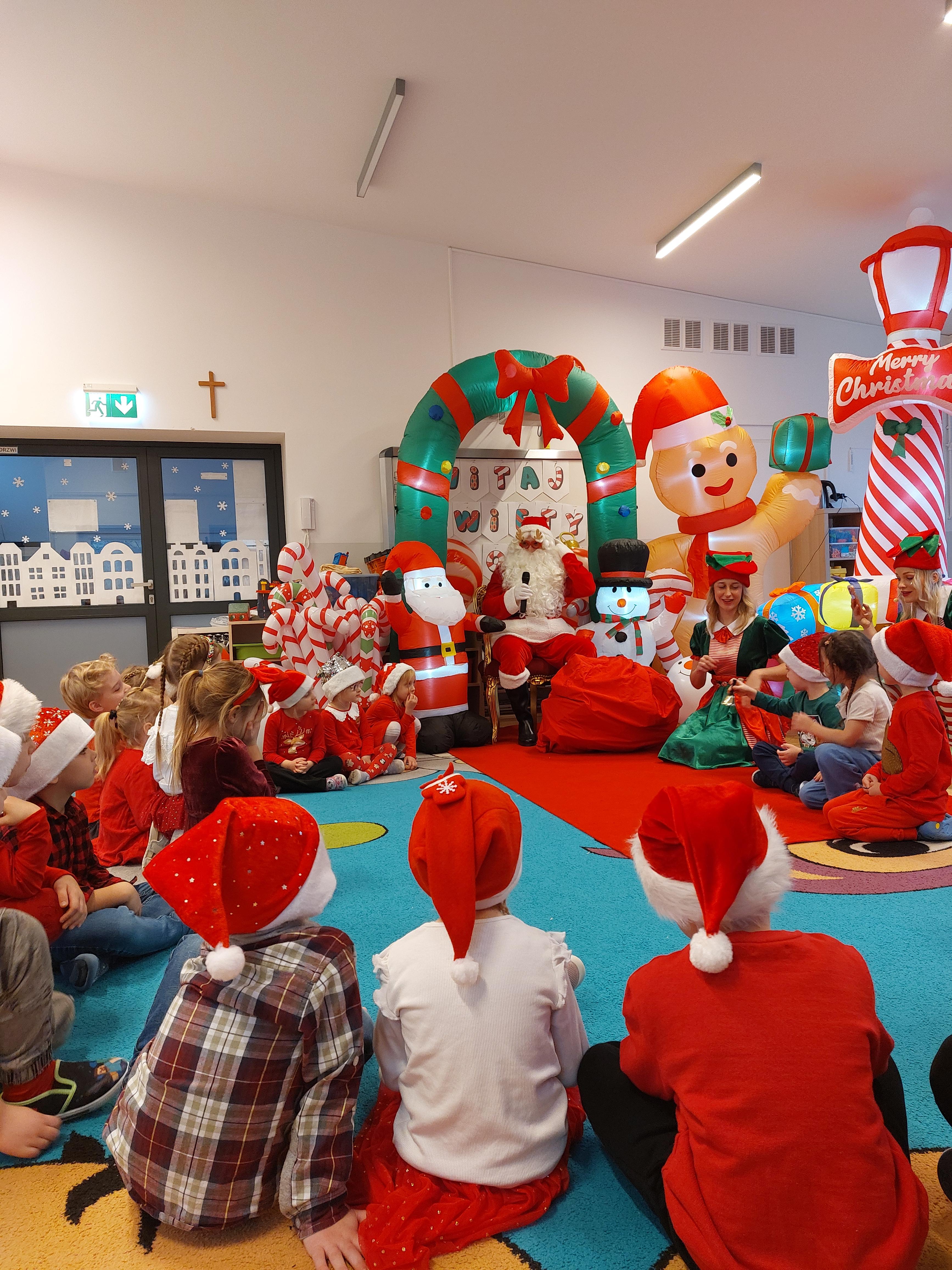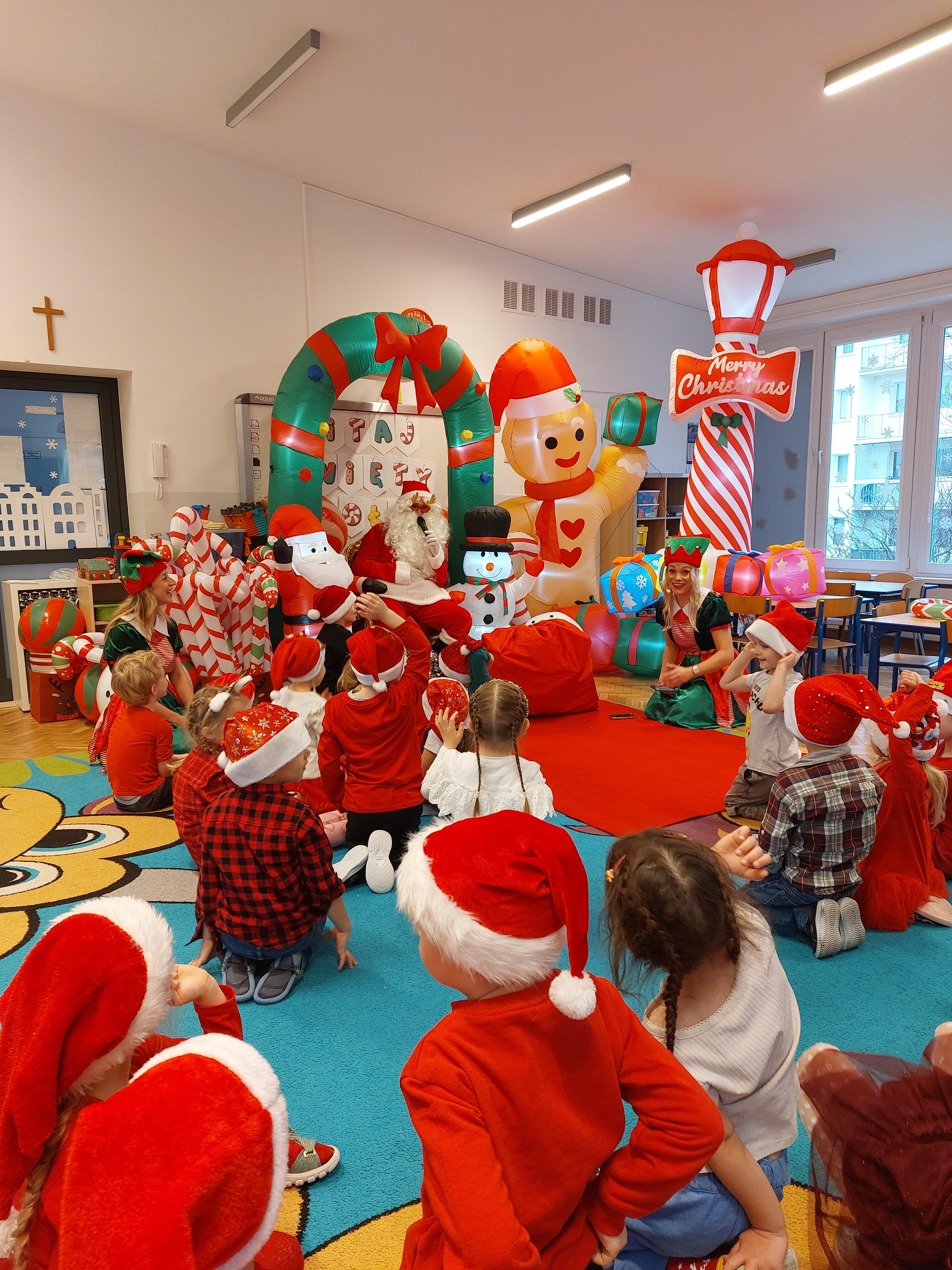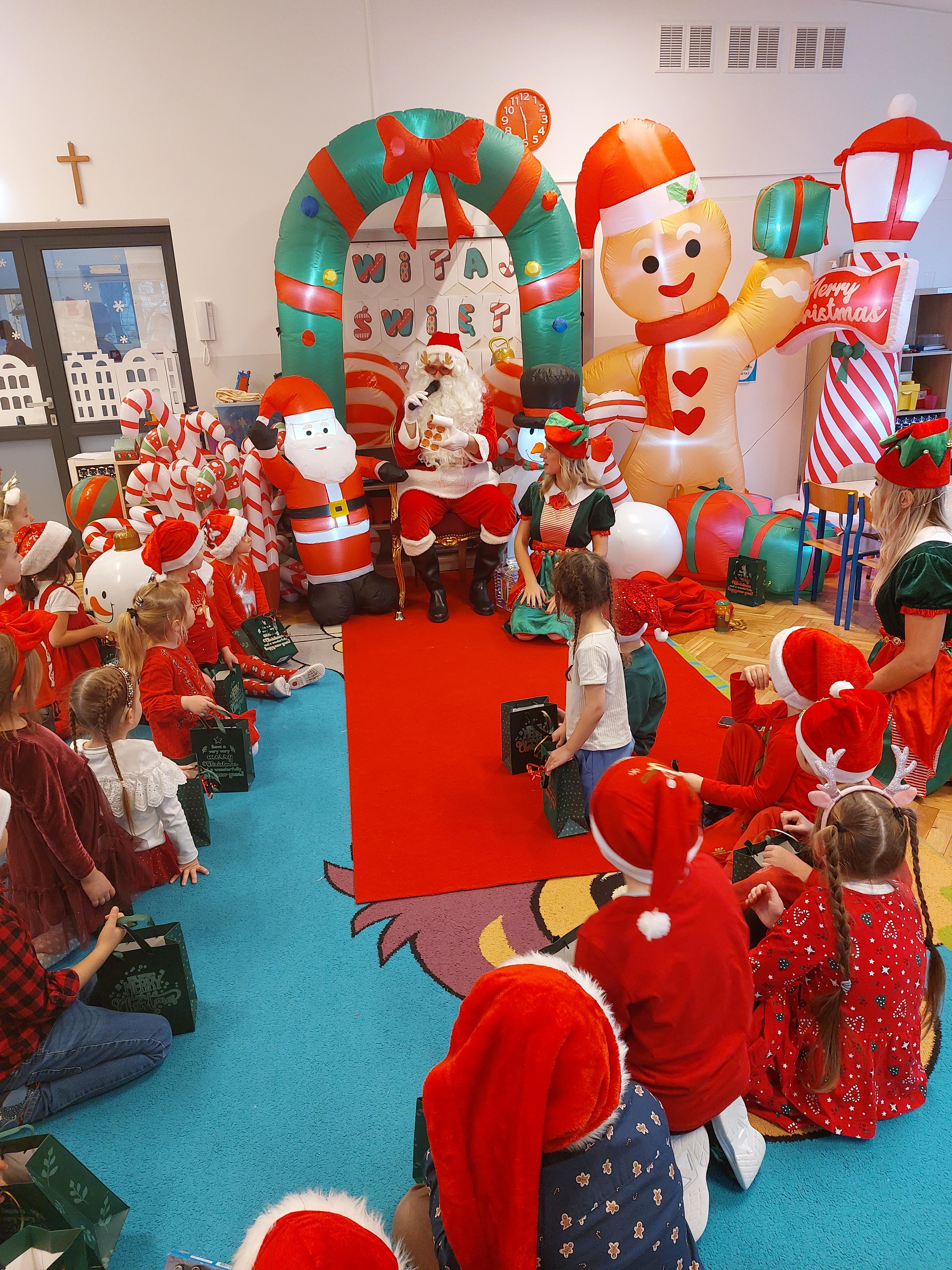 3 grudnia obchodziliśmy w naszym przedszkolu mikołajki. Tego dnia odwiedził nas wyjątkowy gość - Mikołaj, wraz ze swoimi sympatycznymi elfkami. To była prawdziwa impreza! Zaczęliśmy zabawami przy świątecznych piosenkach, później były zawody w toczeniu ogromnej bombki i reniferkowy pociąg. Choć prawdziwa zima do nas jeszcze nie zawitała, elfki sprawiły, że w sali spadł na nas prawdziwy śnieg! Po tych ekscytujących zabawach nastąpiła główna atrakcja dnia - do sali wszedł prawdziwy Mikołaj, dźwigając ogromny worek pełen prezentów! To nie był koniec zabaw - wspólnie z Mikołajem bawiliśmy się w ,,pytanie czy zadanie", zatańczyliśmy, a na koniec nadszedł czas, aby Mikołaj rozdał dzieciom wyczekiwane przez nie niespodzianki. Emocjom nie było końca!