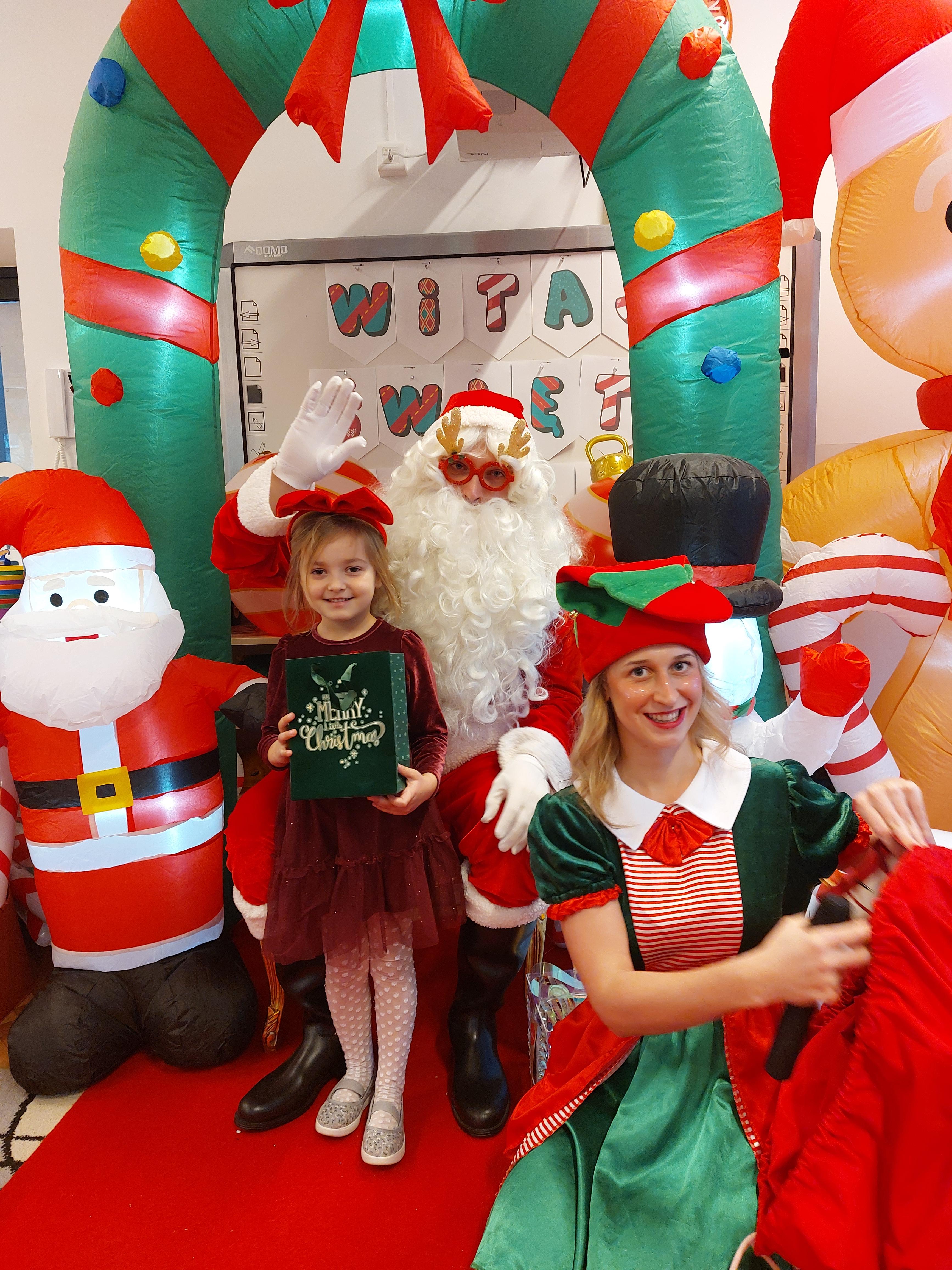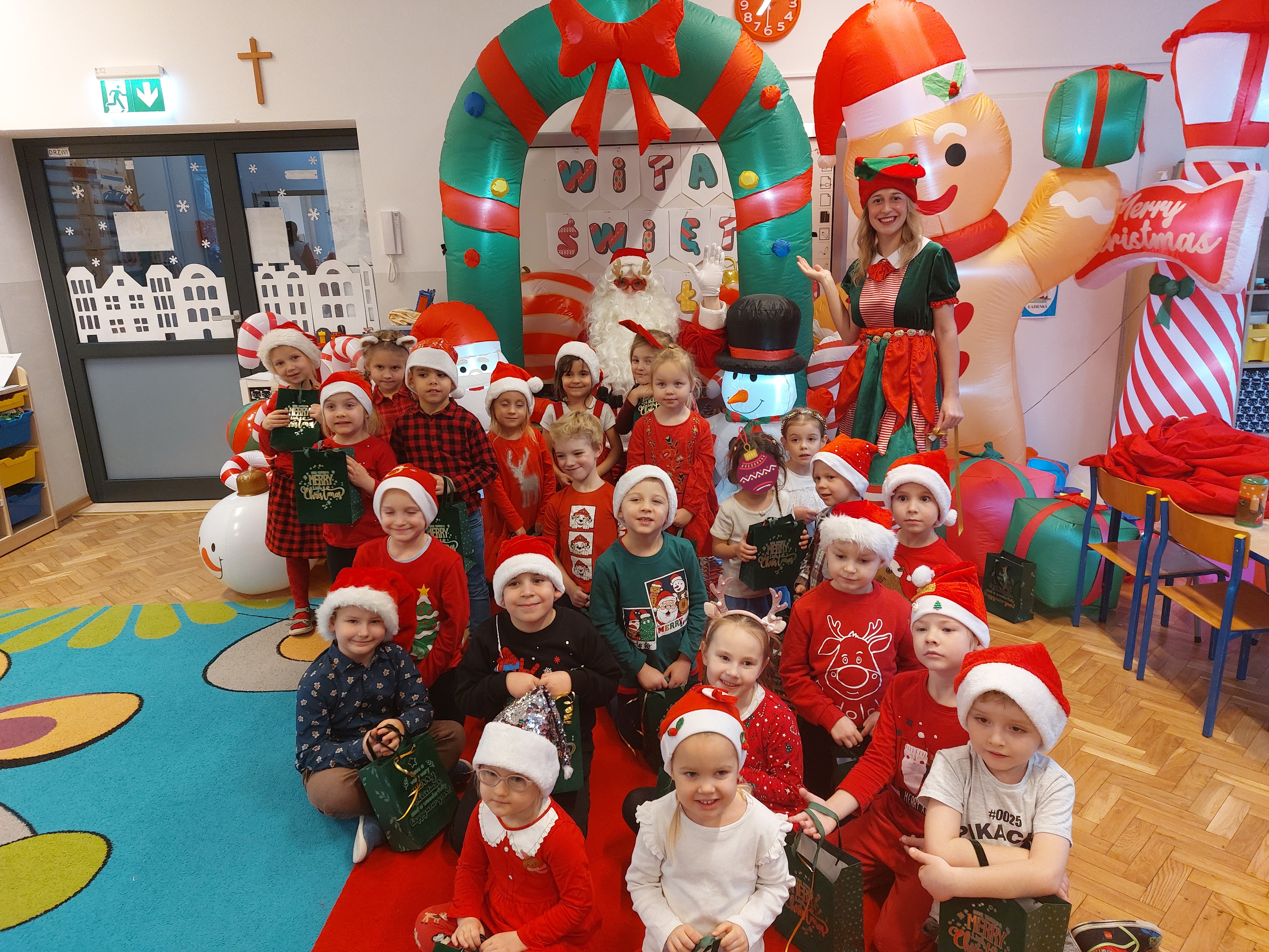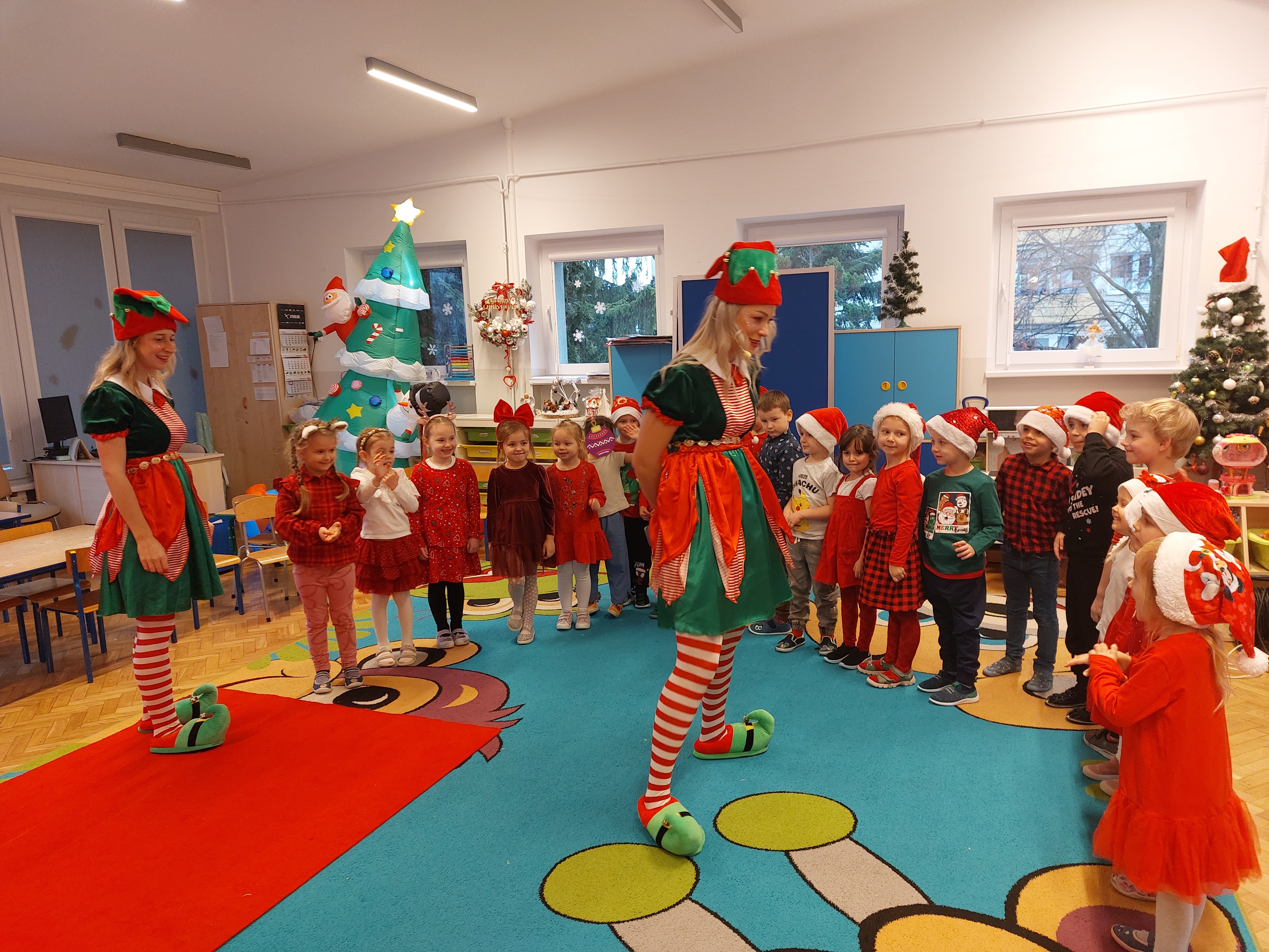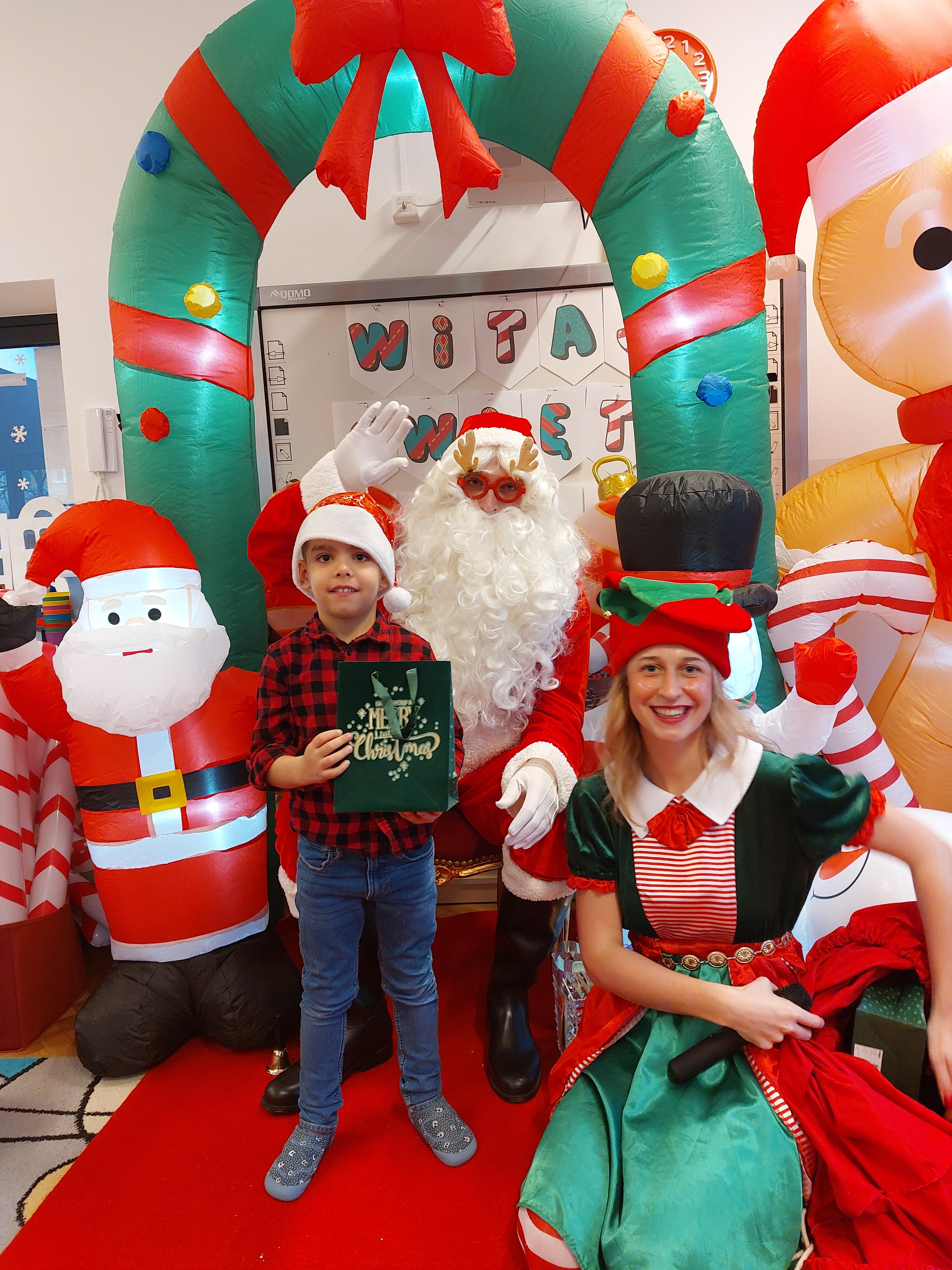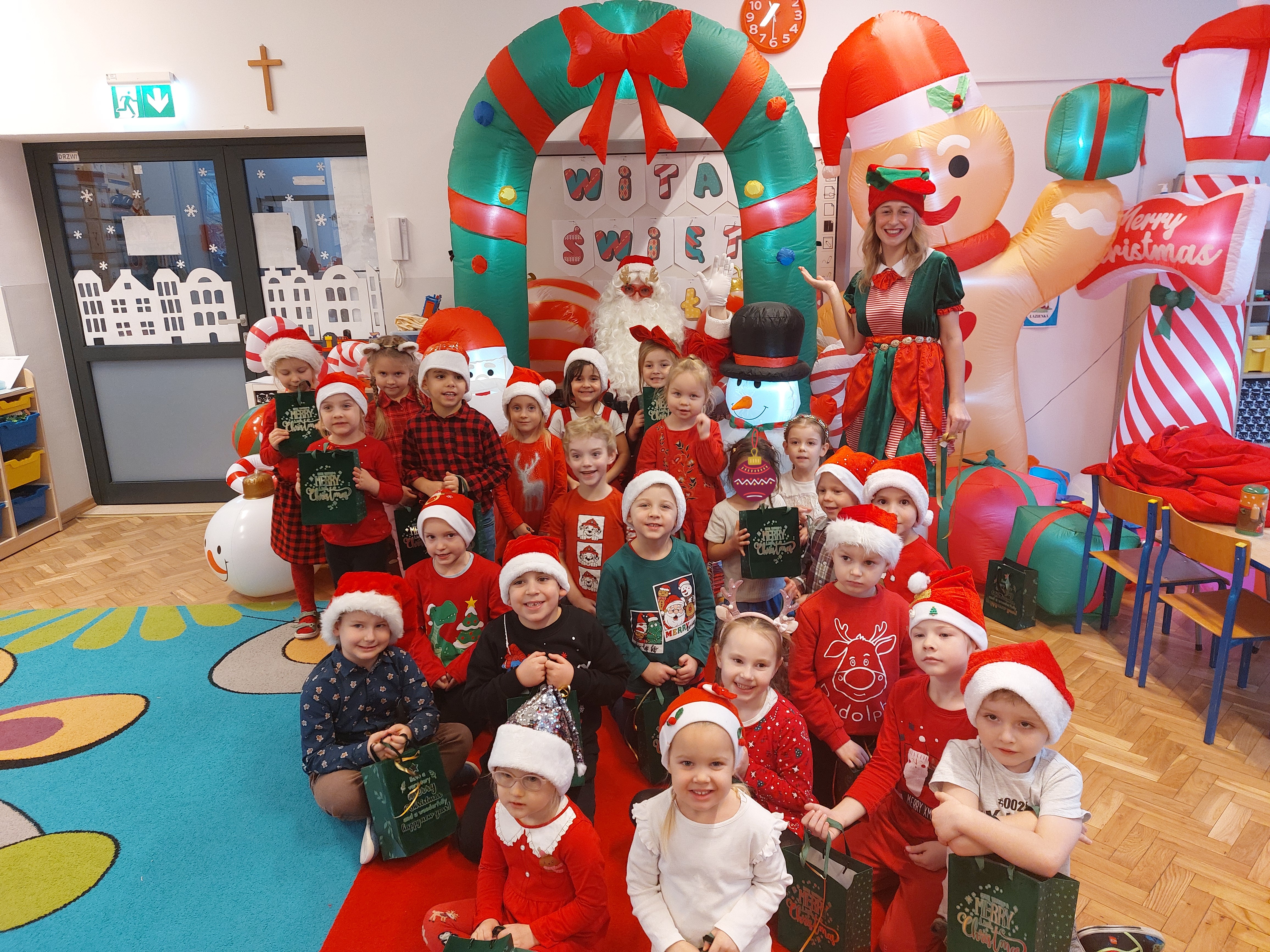 3 grudnia obchodziliśmy w naszym przedszkolu mikołajki. Tego dnia odwiedził nas wyjątkowy gość - Mikołaj, wraz ze swoimi sympatycznymi elfkami. To była prawdziwa impreza! Zaczęliśmy zabawami przy świątecznych piosenkach, później były zawody w toczeniu ogromnej bombki i reniferkowy pociąg. Choć prawdziwa zima do nas jeszcze nie zawitała, elfki sprawiły, że w sali spadł na nas prawdziwy śnieg! Po tych ekscytujących zabawach nastąpiła główna atrakcja dnia - do sali wszedł prawdziwy Mikołaj, dźwigając ogromny worek pełen prezentów! To nie był koniec zabaw - wspólnie z Mikołajem bawiliśmy się w ,,pytanie czy zadanie", zatańczyliśmy, a na koniec nadszedł czas, aby Mikołaj rozdał dzieciom wyczekiwane przez nie niespodzianki. Emocjom nie było końca!
