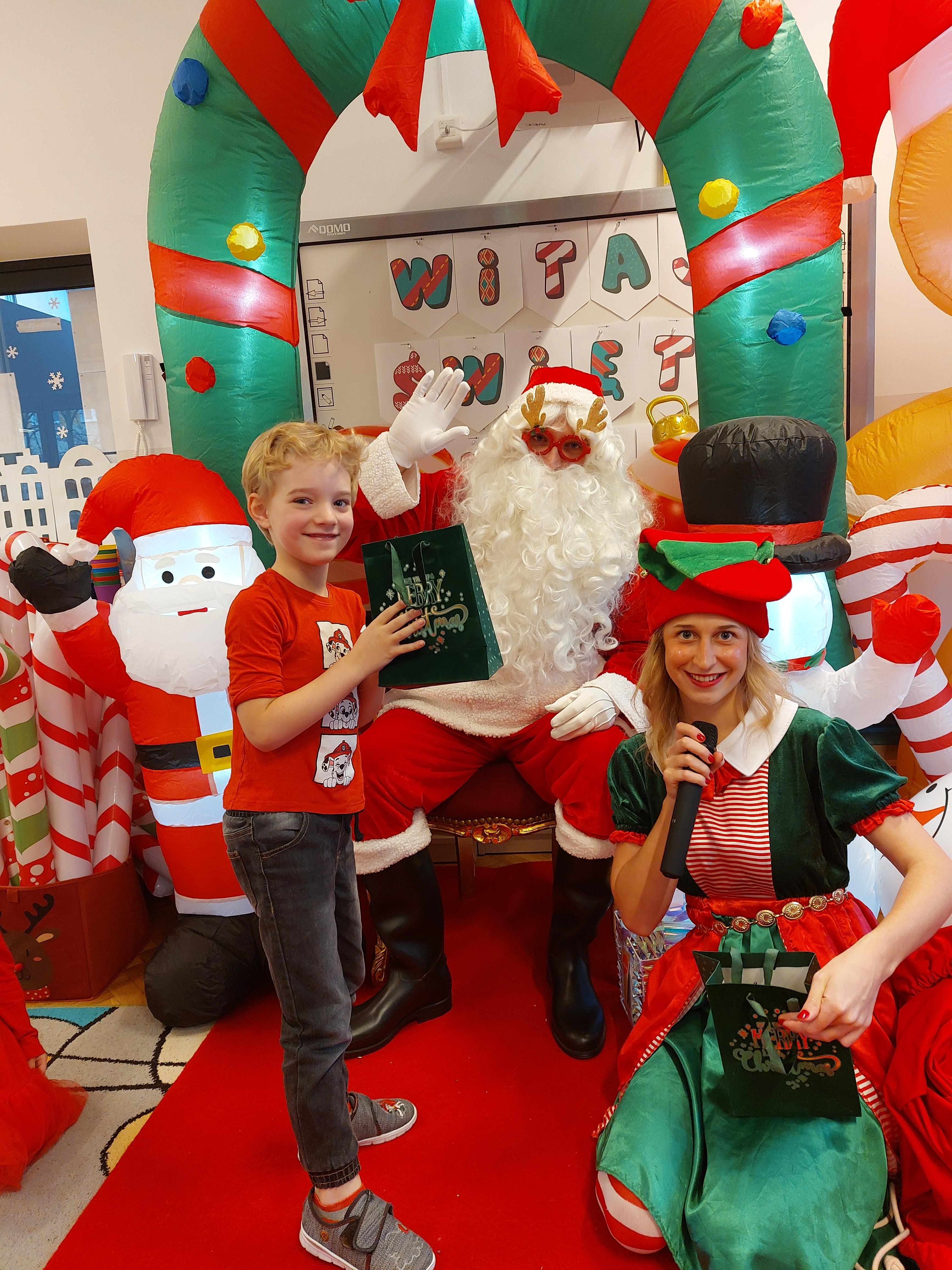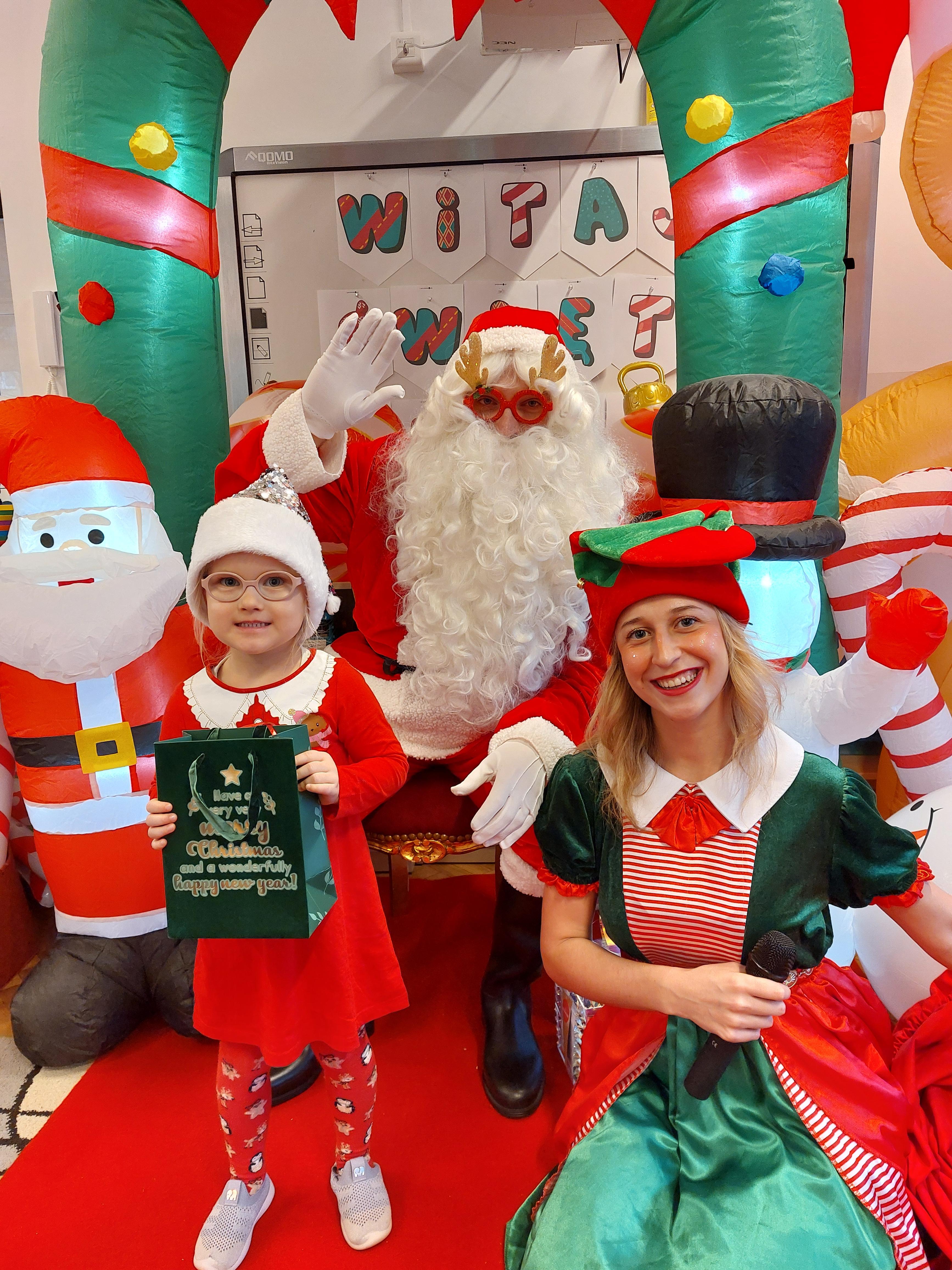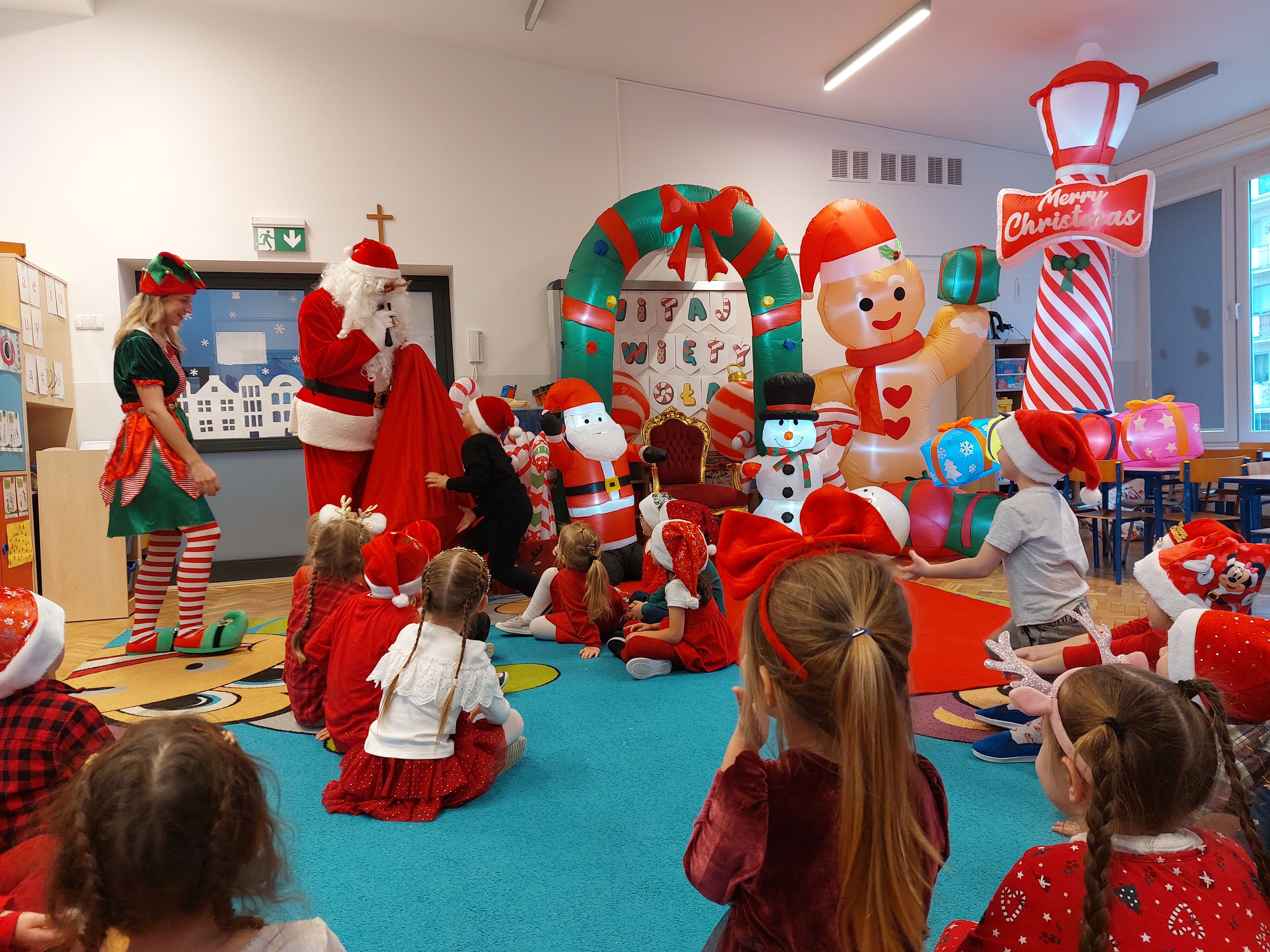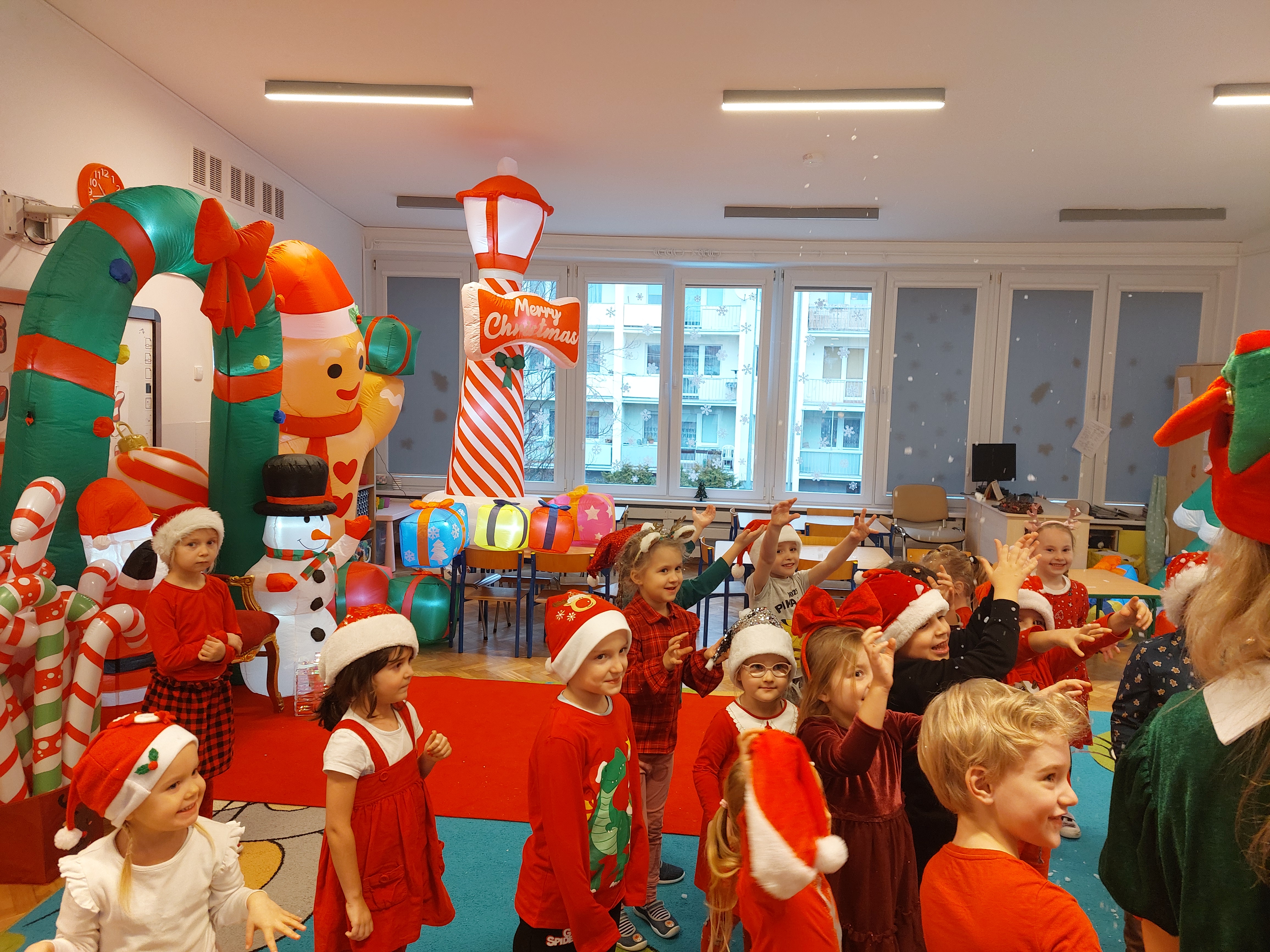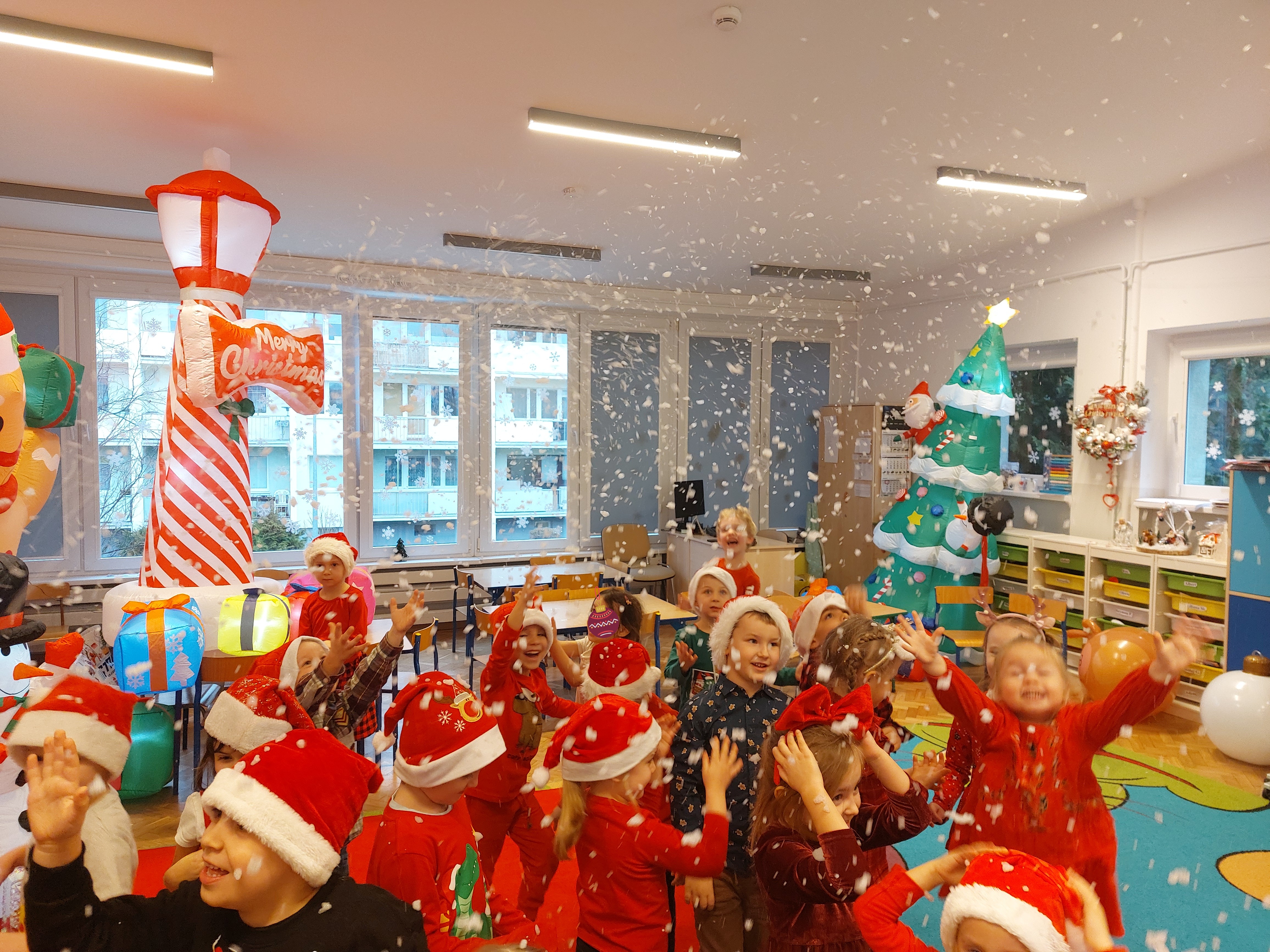 3 grudnia obchodziliśmy w naszym przedszkolu mikołajki. Tego dnia odwiedził nas wyjątkowy gość - Mikołaj, wraz ze swoimi sympatycznymi elfkami. To była prawdziwa impreza! Zaczęliśmy zabawami przy świątecznych piosenkach, później były zawody w toczeniu ogromnej bombki i reniferkowy pociąg. Choć prawdziwa zima do nas jeszcze nie zawitała, elfki sprawiły, że w sali spadł na nas prawdziwy śnieg! Po tych ekscytujących zabawach nastąpiła główna atrakcja dnia - do sali wszedł prawdziwy Mikołaj, dźwigając ogromny worek pełen prezentów! To nie był koniec zabaw - wspólnie z Mikołajem bawiliśmy się w ,,pytanie czy zadanie", zatańczyliśmy, a na koniec nadszedł czas, aby Mikołaj rozdał dzieciom wyczekiwane przez nie niespodzianki. Emocjom nie było końca!