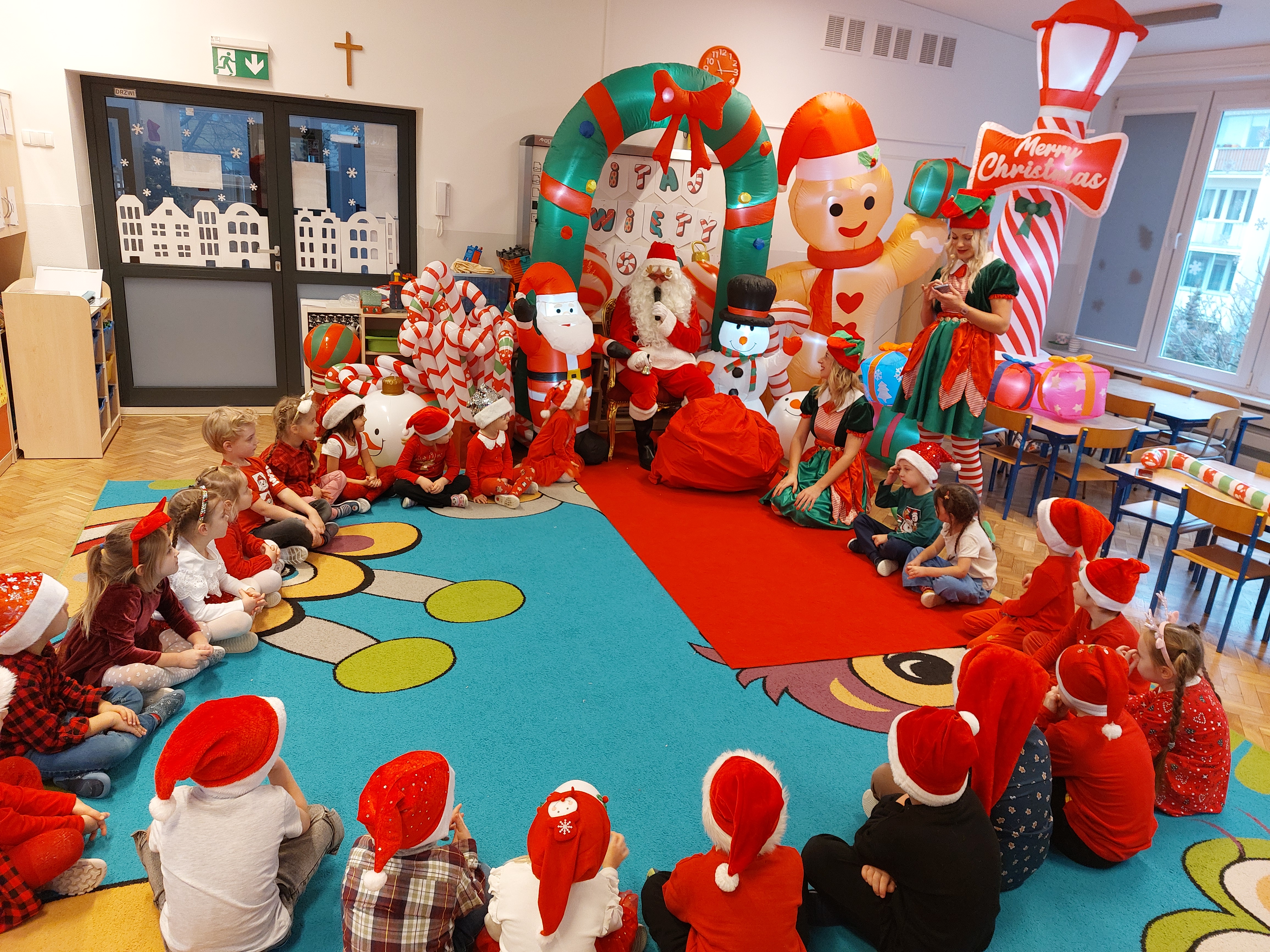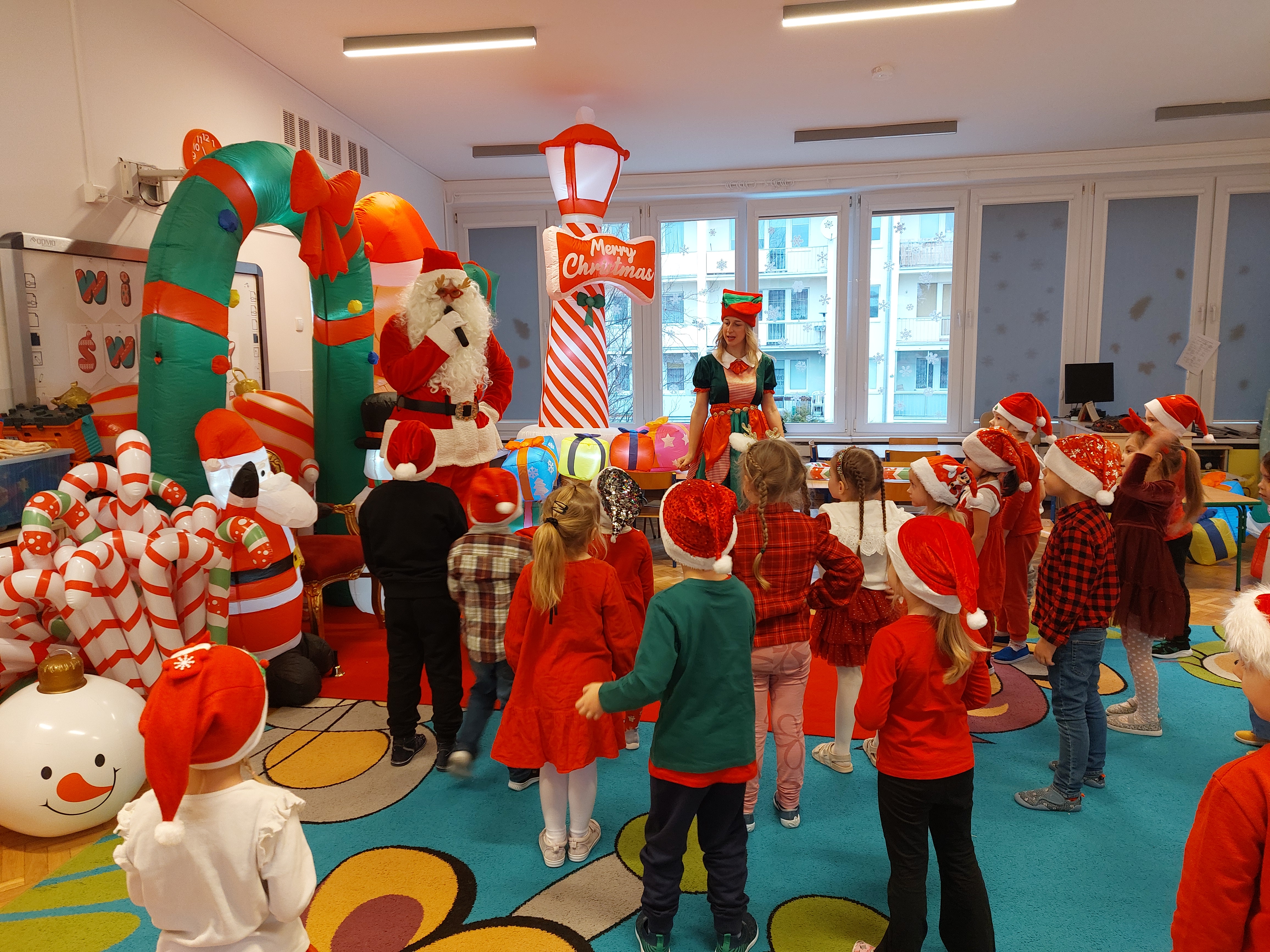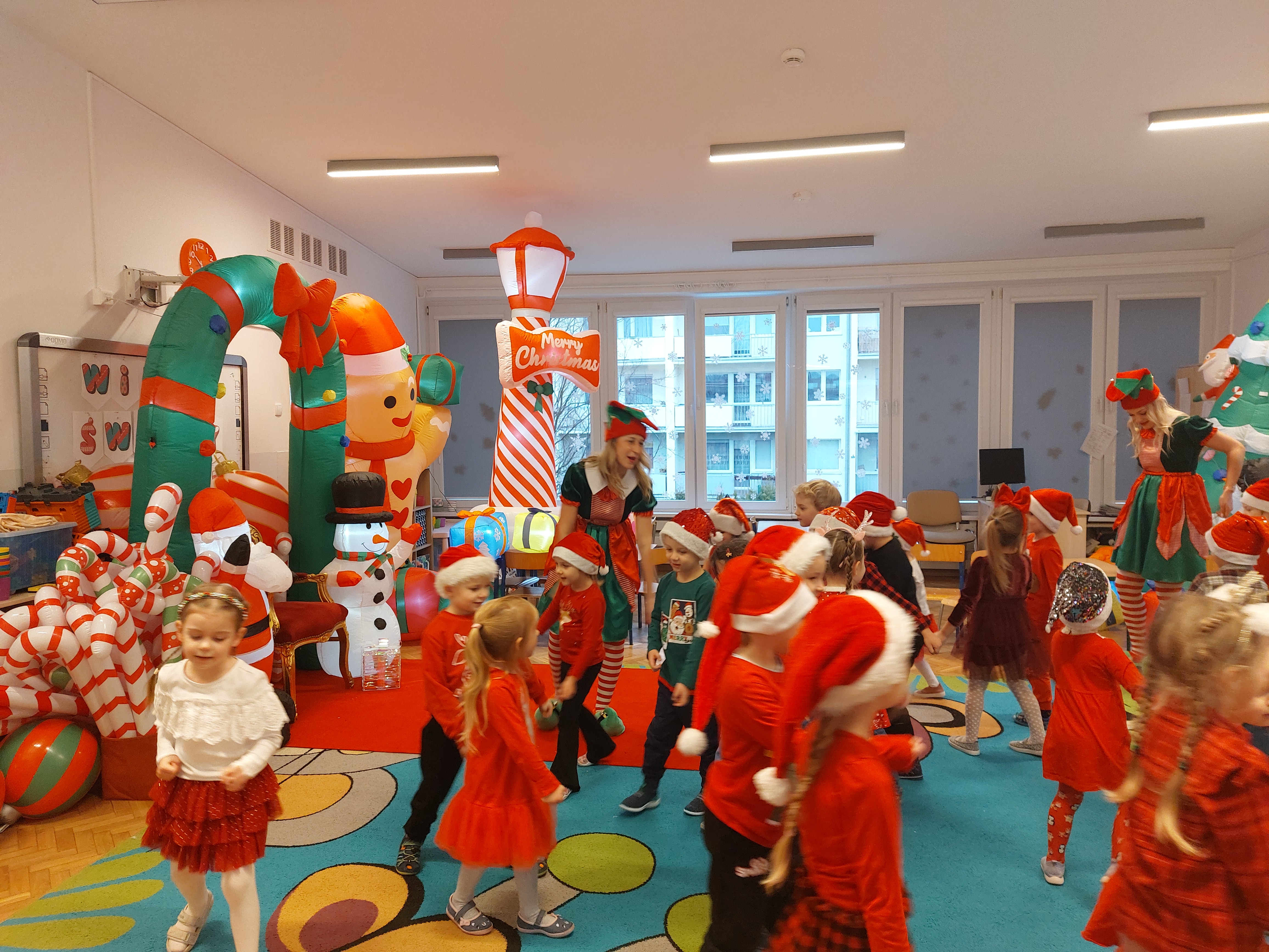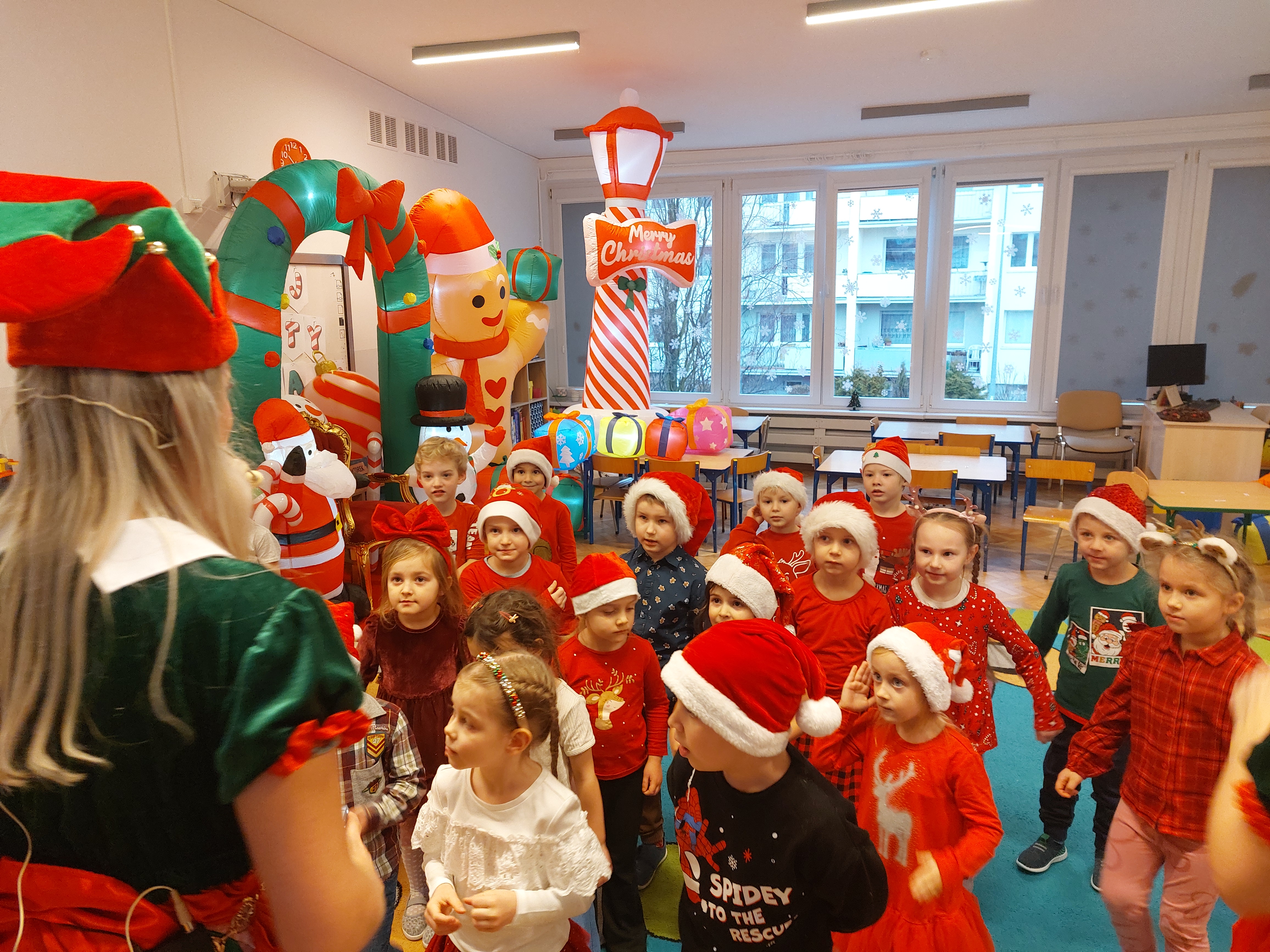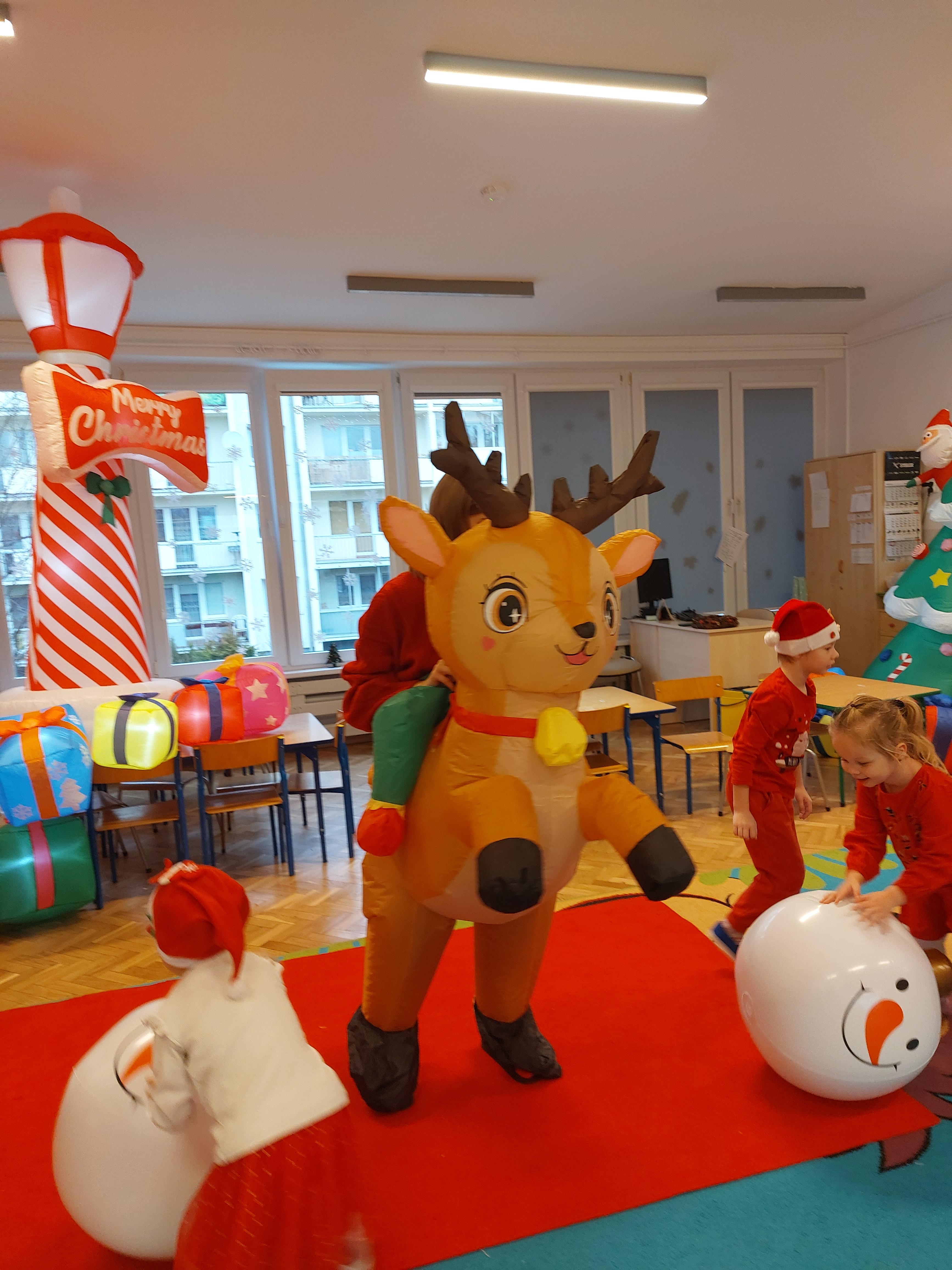 3 grudnia obchodziliśmy w naszym przedszkolu mikołajki. Tego dnia odwiedził nas wyjątkowy gość - Mikołaj, wraz ze swoimi sympatycznymi elfkami. To była prawdziwa impreza! Zaczęliśmy zabawami przy świątecznych piosenkach, później były zawody w toczeniu ogromnej bombki i reniferkowy pociąg. Choć prawdziwa zima do nas jeszcze nie zawitała, elfki sprawiły, że w sali spadł na nas prawdziwy śnieg! Po tych ekscytujących zabawach nastąpiła główna atrakcja dnia - do sali wszedł prawdziwy Mikołaj, dźwigając ogromny worek pełen prezentów! To nie był koniec zabaw - wspólnie z Mikołajem bawiliśmy się w ,,pytanie czy zadanie", zatańczyliśmy, a na koniec nadszedł czas, aby Mikołaj rozdał dzieciom wyczekiwane przez nie niespodzianki. Emocjom nie było końca!