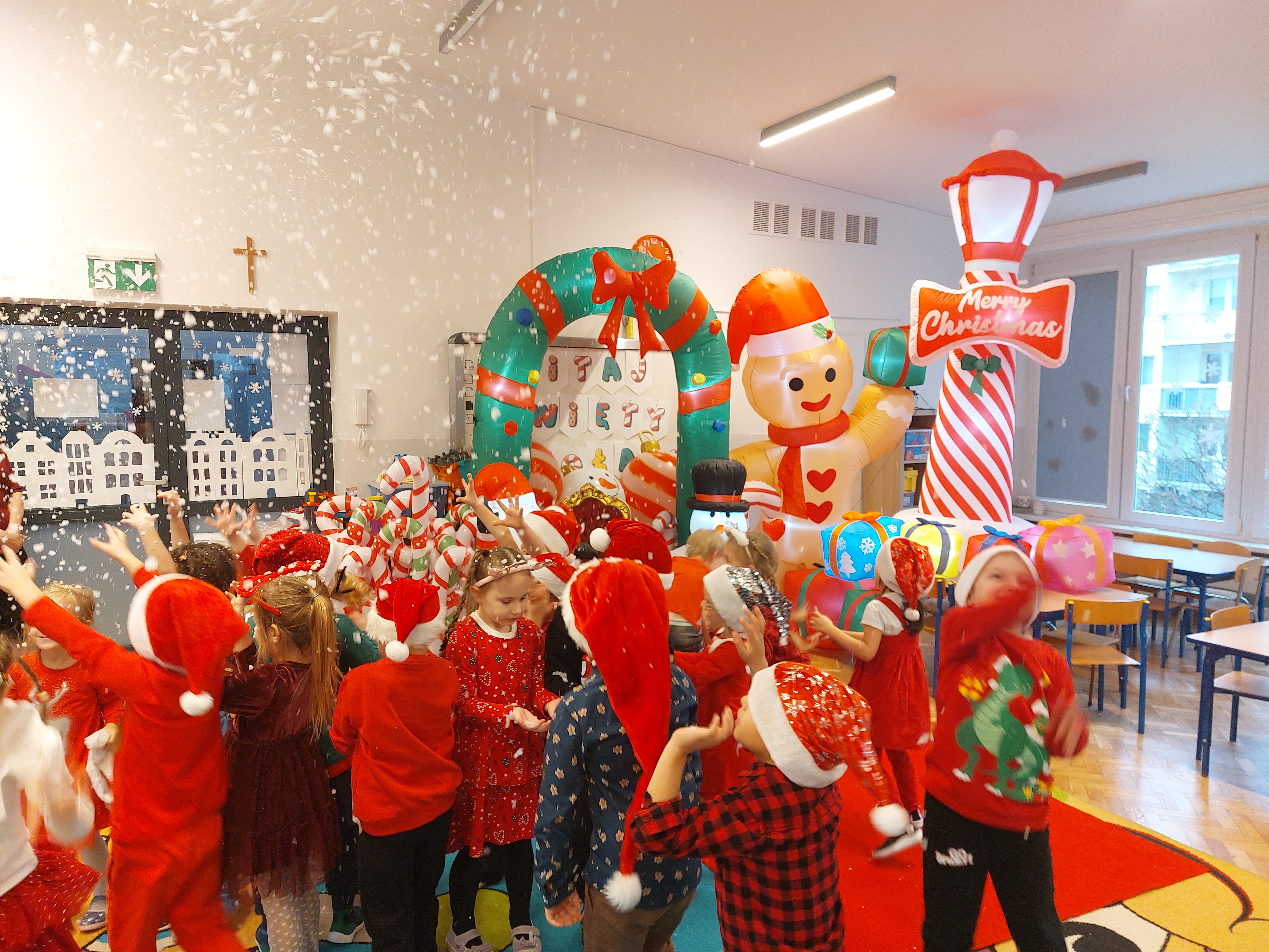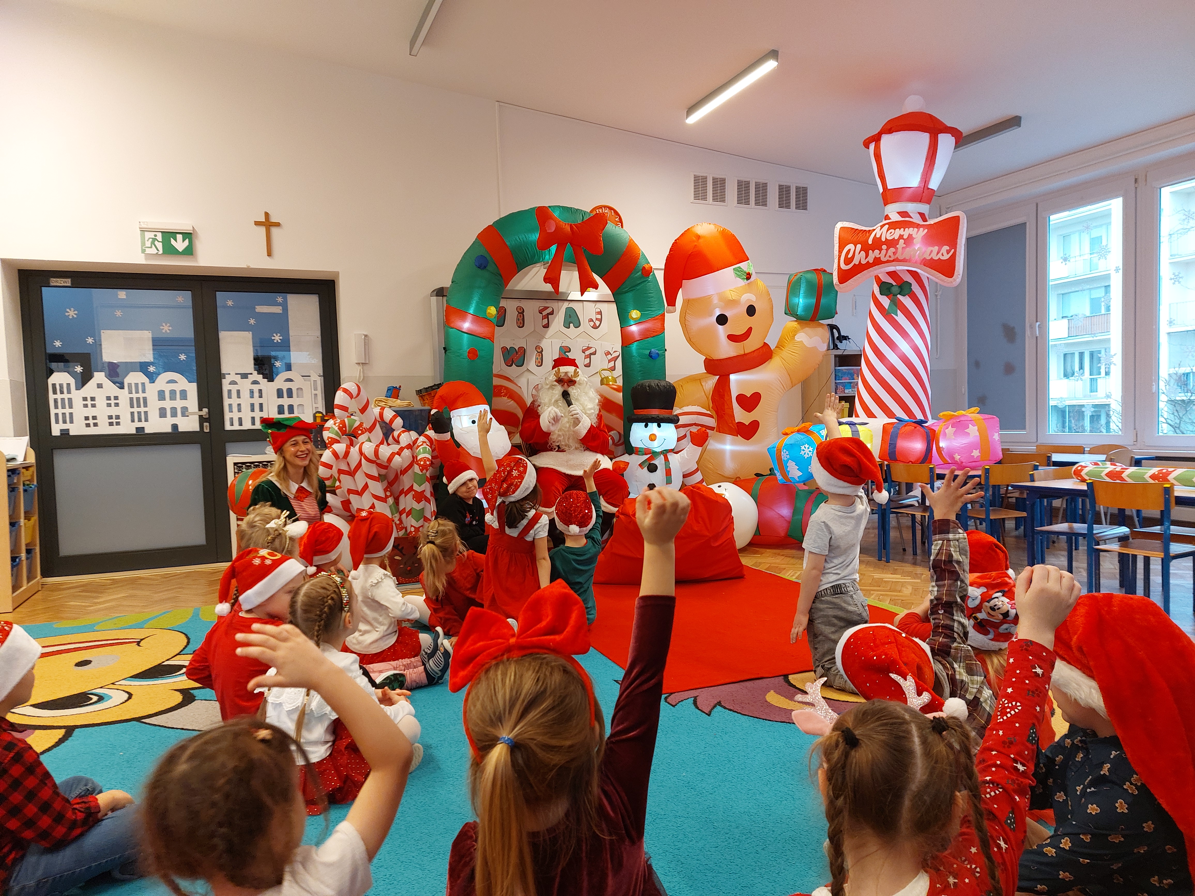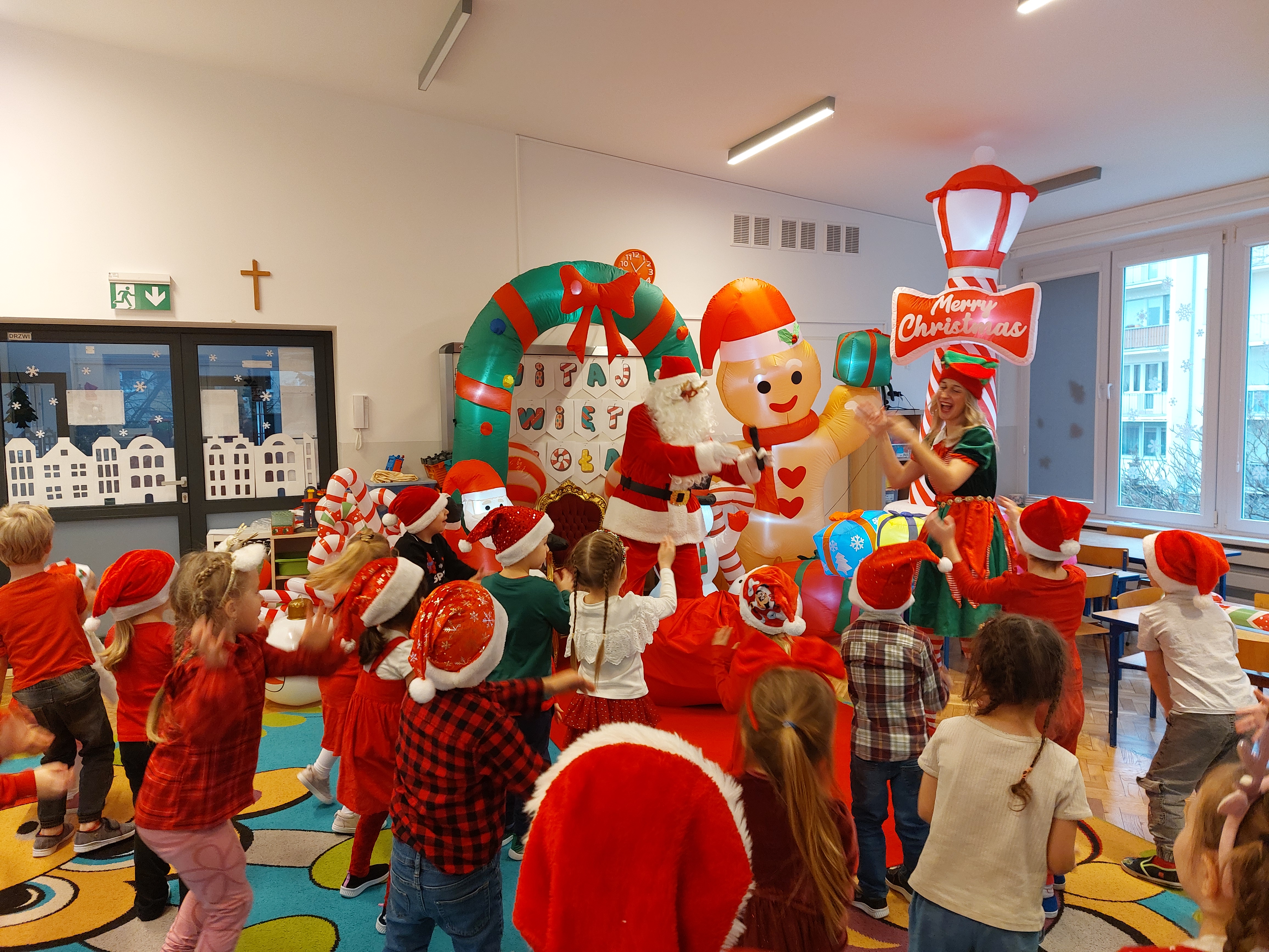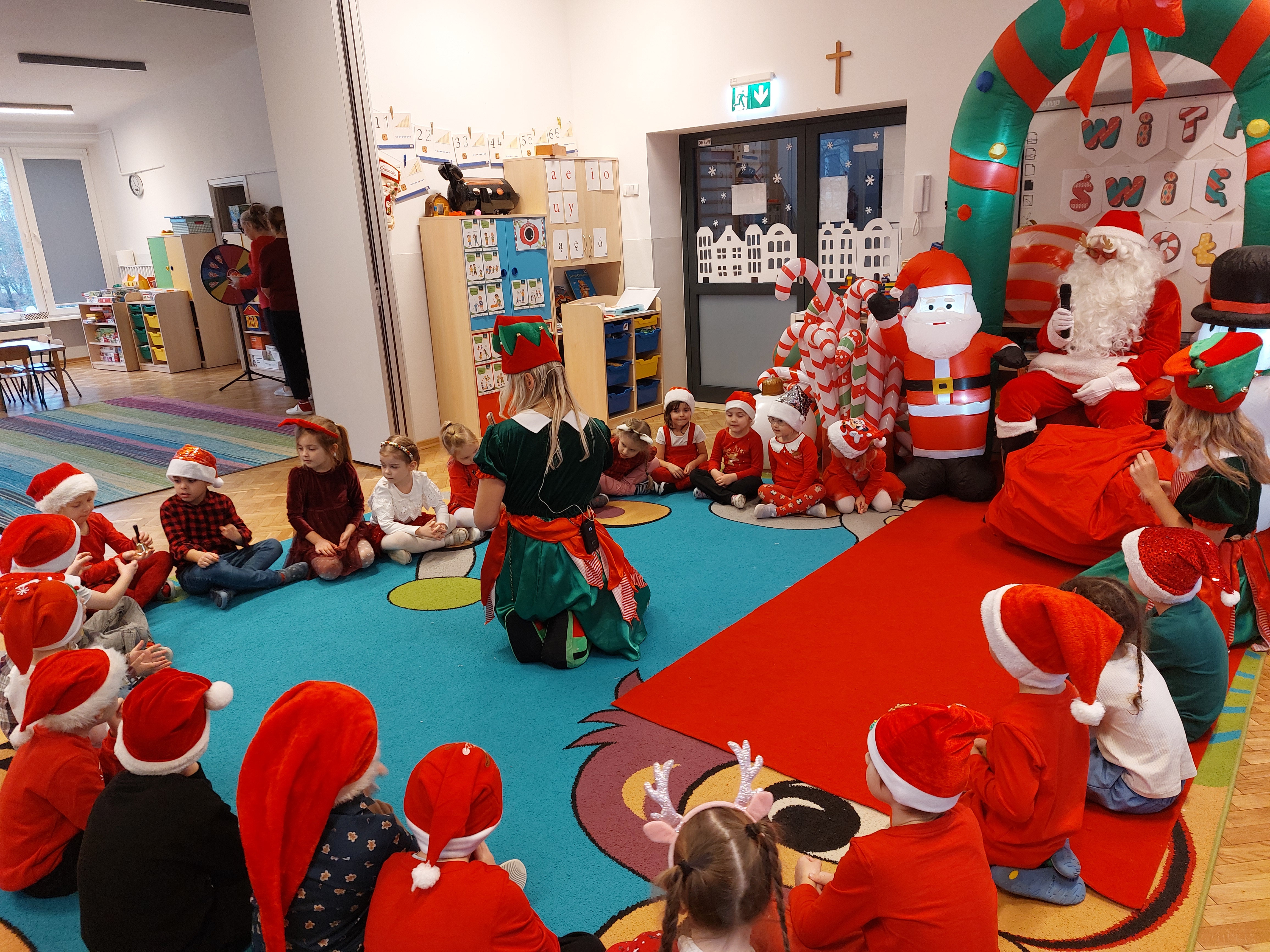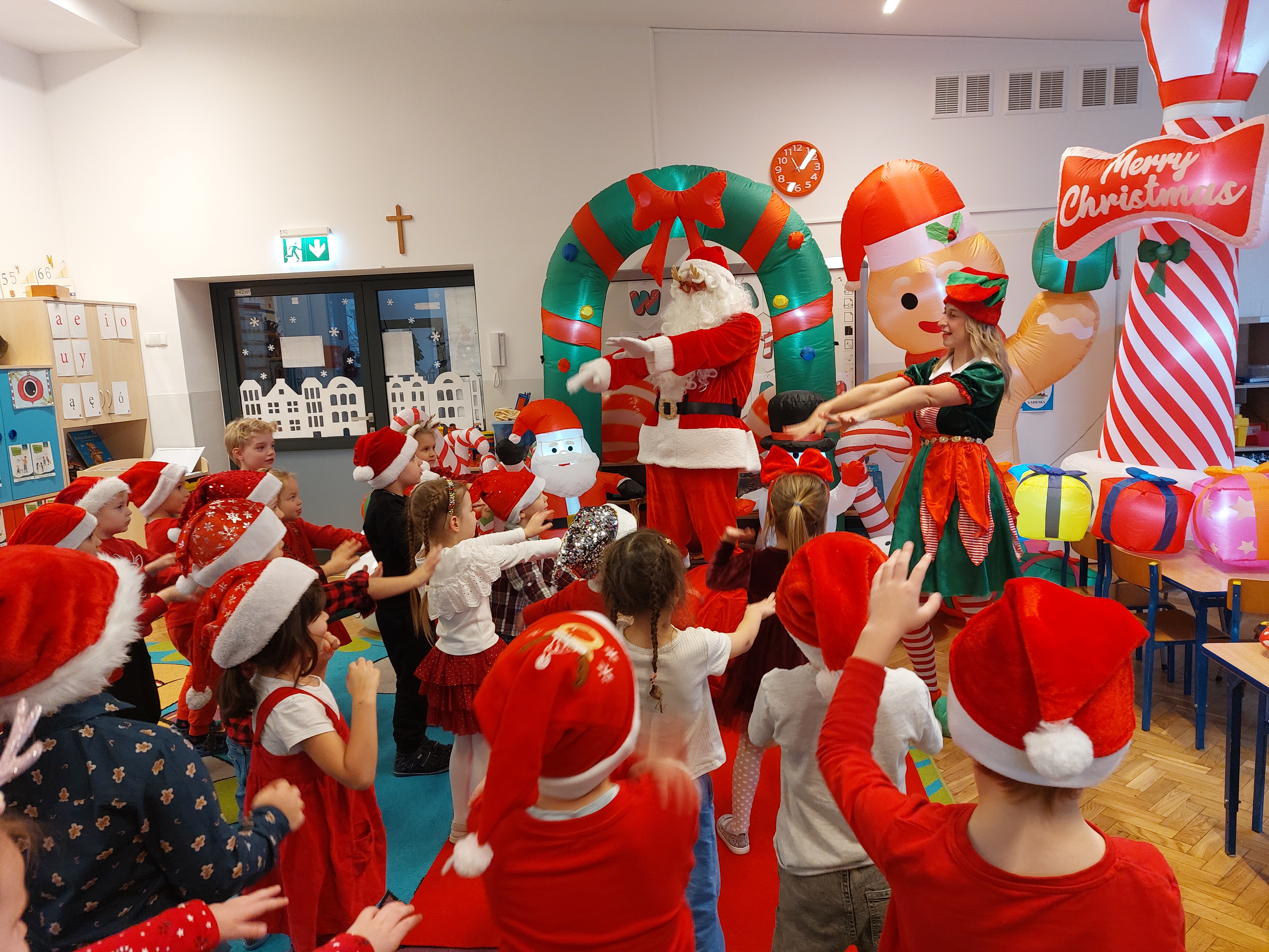 3 grudnia obchodziliśmy w naszym przedszkolu mikołajki. Tego dnia odwiedził nas wyjątkowy gość - Mikołaj, wraz ze swoimi sympatycznymi elfkami. To była prawdziwa impreza! Zaczęliśmy zabawami przy świątecznych piosenkach, później były zawody w toczeniu ogromnej bombki i reniferkowy pociąg. Choć prawdziwa zima do nas jeszcze nie zawitała, elfki sprawiły, że w sali spadł na nas prawdziwy śnieg! Po tych ekscytujących zabawach nastąpiła główna atrakcja dnia - do sali wszedł prawdziwy Mikołaj, dźwigając ogromny worek pełen prezentów! To nie był koniec zabaw - wspólnie z Mikołajem bawiliśmy się w ,,pytanie czy zadanie", zatańczyliśmy, a na koniec nadszedł czas, aby Mikołaj rozdał dzieciom wyczekiwane przez nie niespodzianki. Emocjom nie było końca!