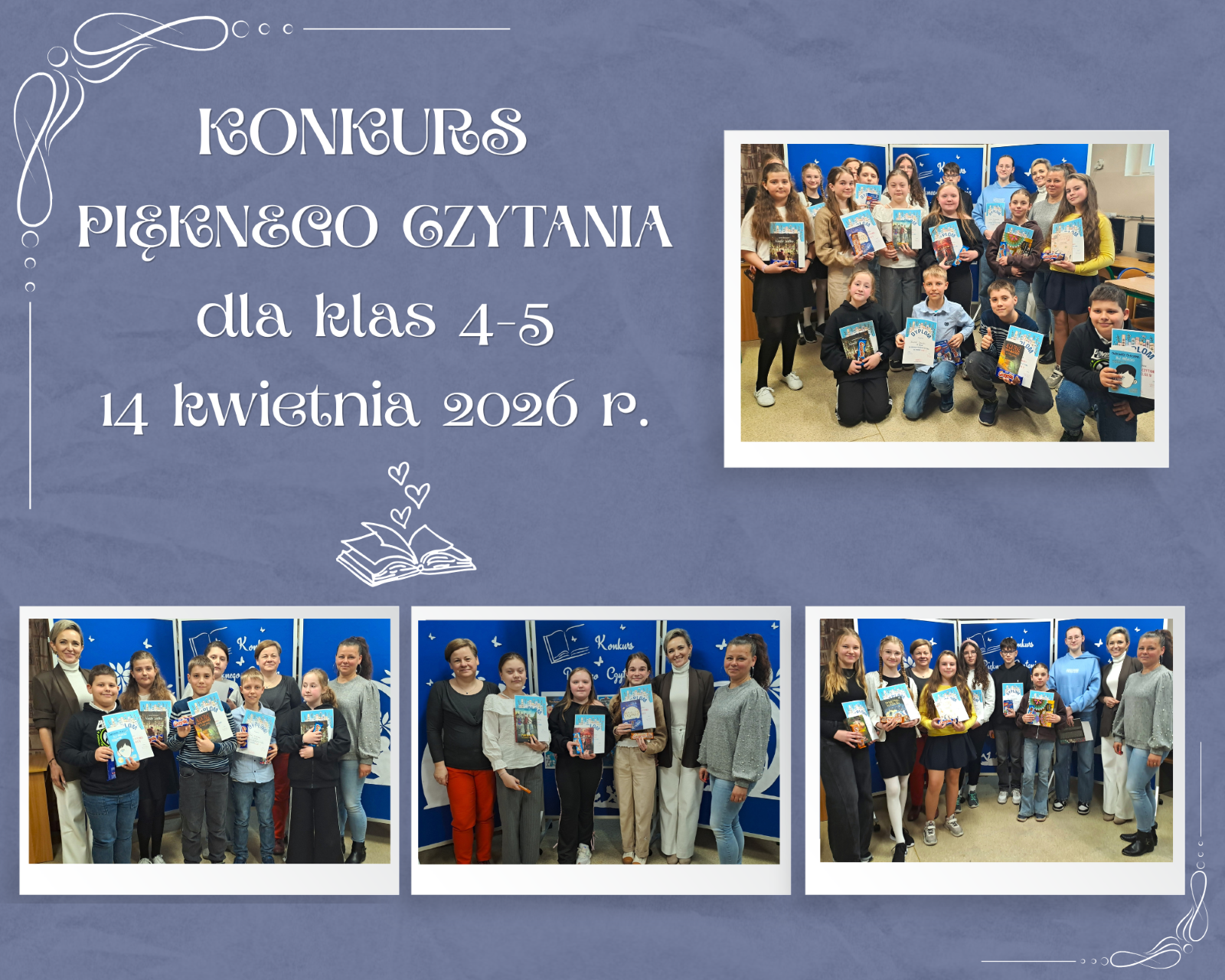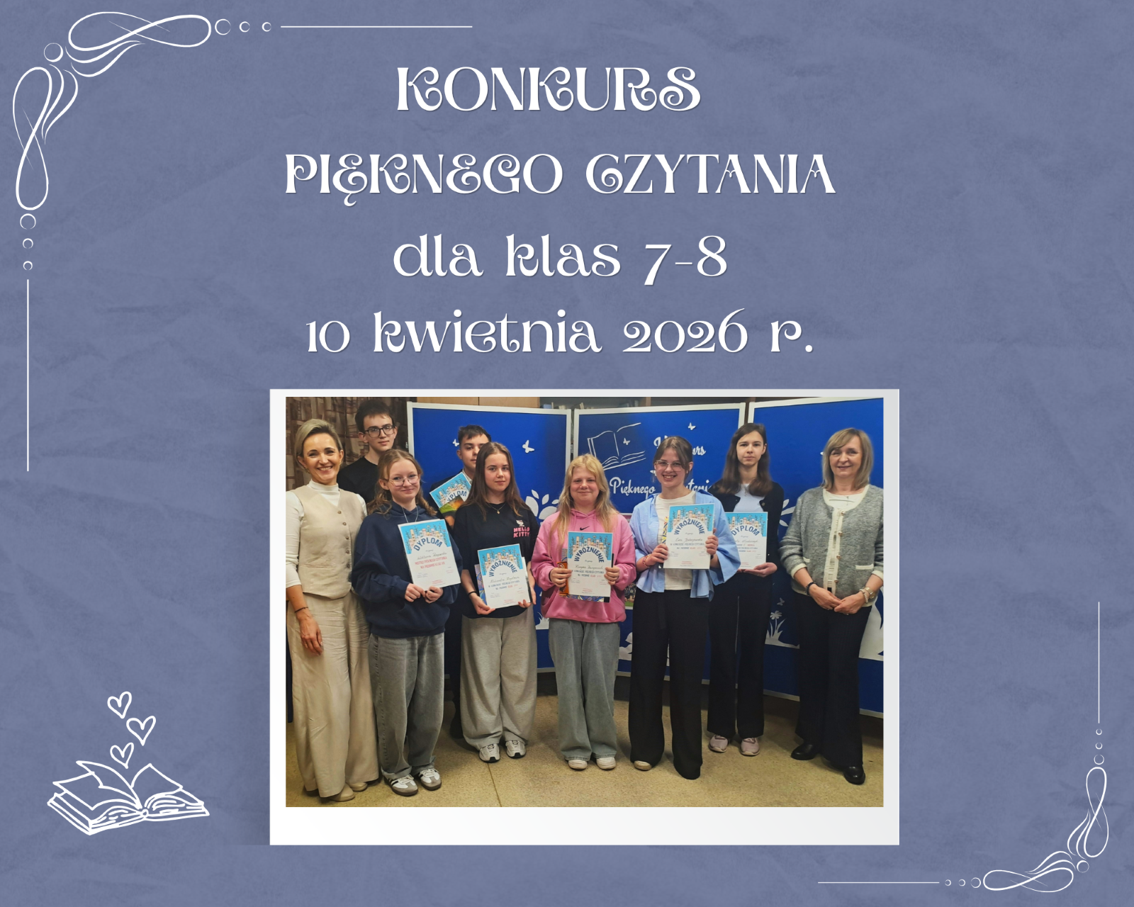 Mistrzowie Pięknego Czytania będą reprezentować szkołę w XV Powiatowym Konkursie Pięknego Czytania, który odbędzie się w dniach 5–7 maja 2026 r. w Pomorskiej Bibliotece Pedagogicznej w Pruszczu Gdańskim o godz. 10.00: