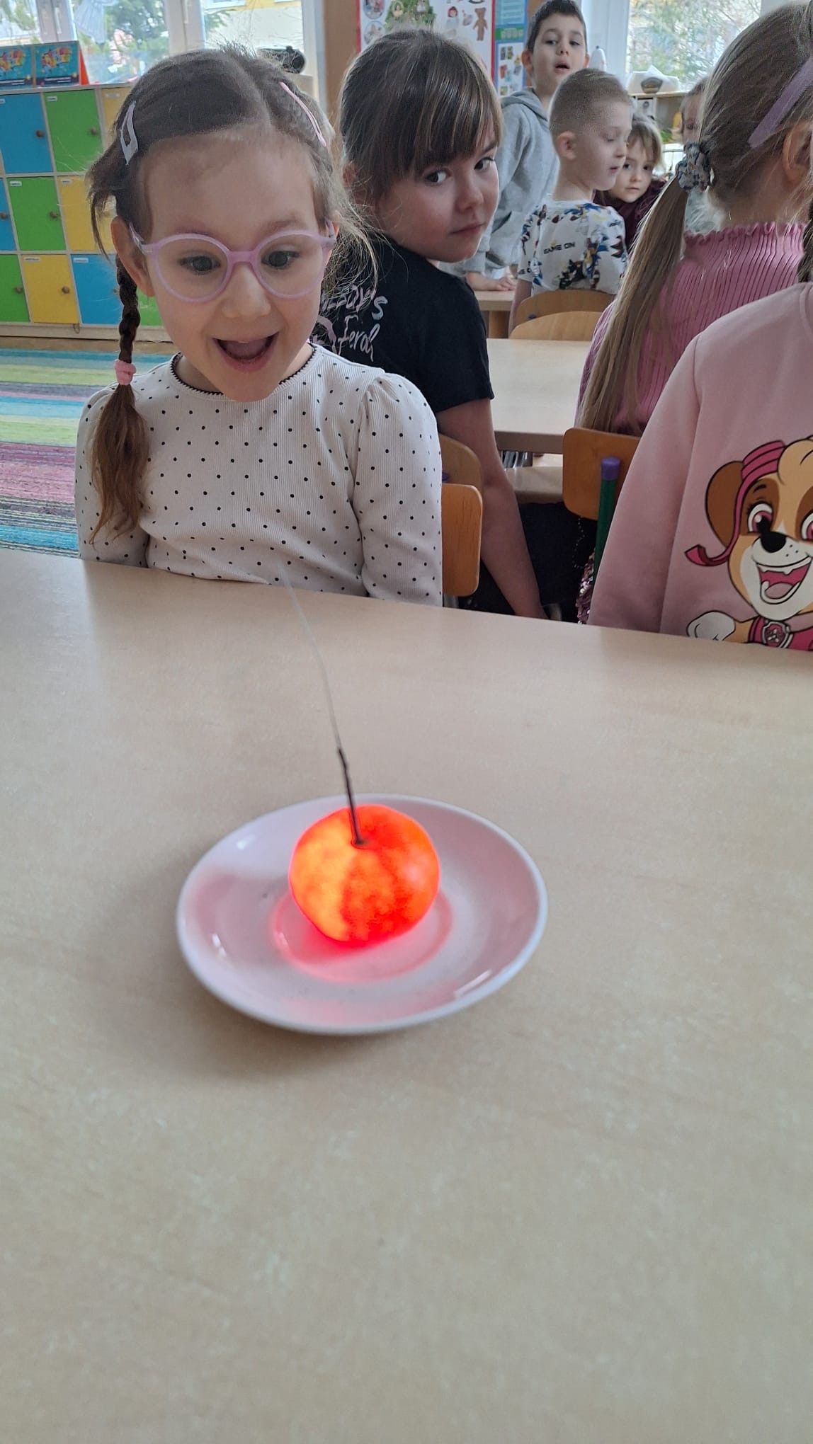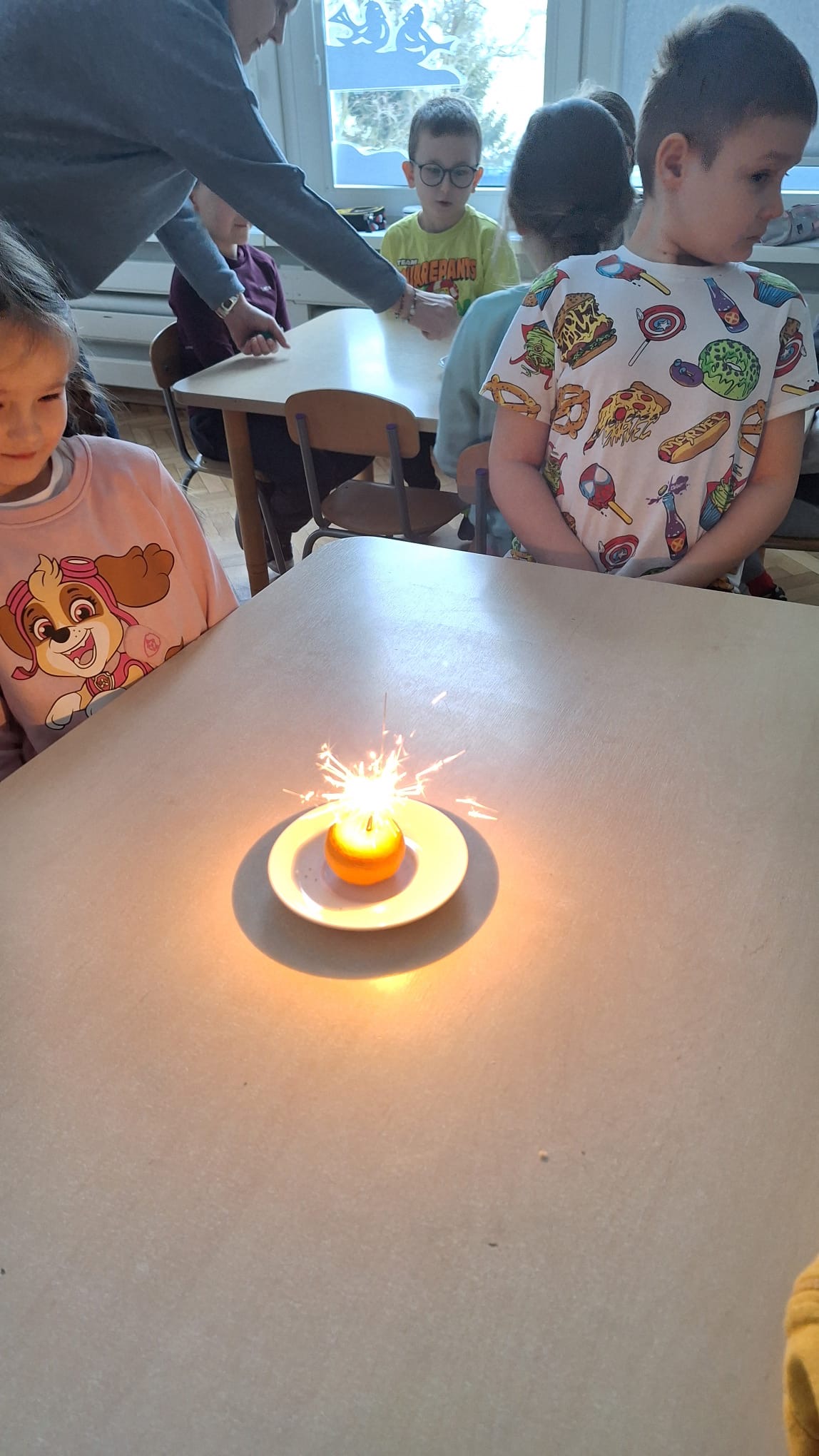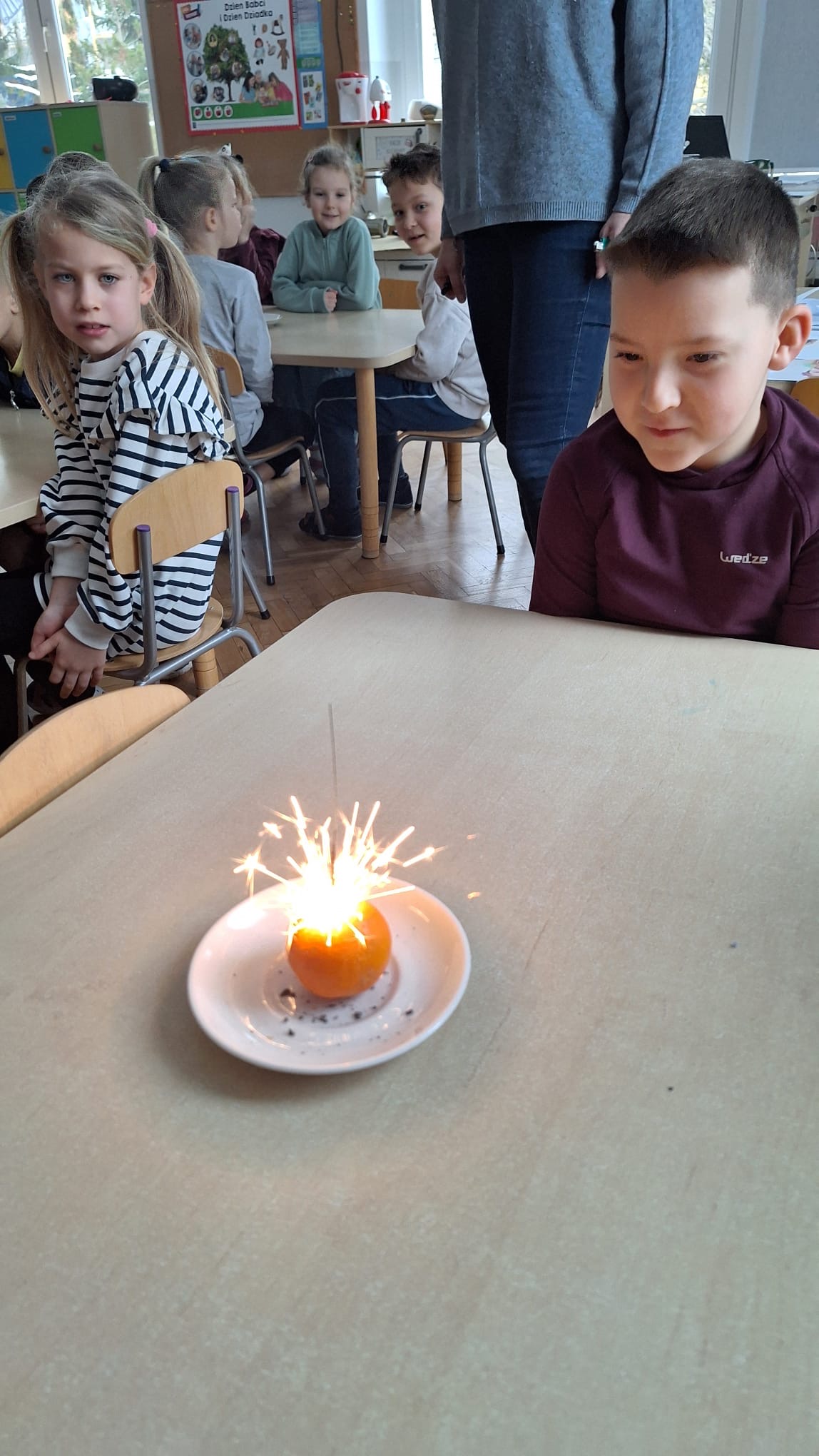 Grupa „0b” z Oddziałów Przedszkolnych przy Szkole Podstawowej nr 2 w Pruszczu Gdańskim wykonała V zadanie – „Matematyczne eksperymenty”. Dzieci podczas zajęć miały możliwość doświadczenia prawdziwej ekscytacji. Do realizacji tego zadania potrzebne były: mandarynka oraz zimne ognie. Po wypaleniu się zimnego ognia mandarynka zaczynała się świecić, co wzbudziło wśród dzieci ogromne zainteresowanie i radość. Było to niezwykłe doświadczenie, które połączyło naukę z zabawą i pozwoliło najmłodszym odkrywać świat poprzez eksperymentowanie.