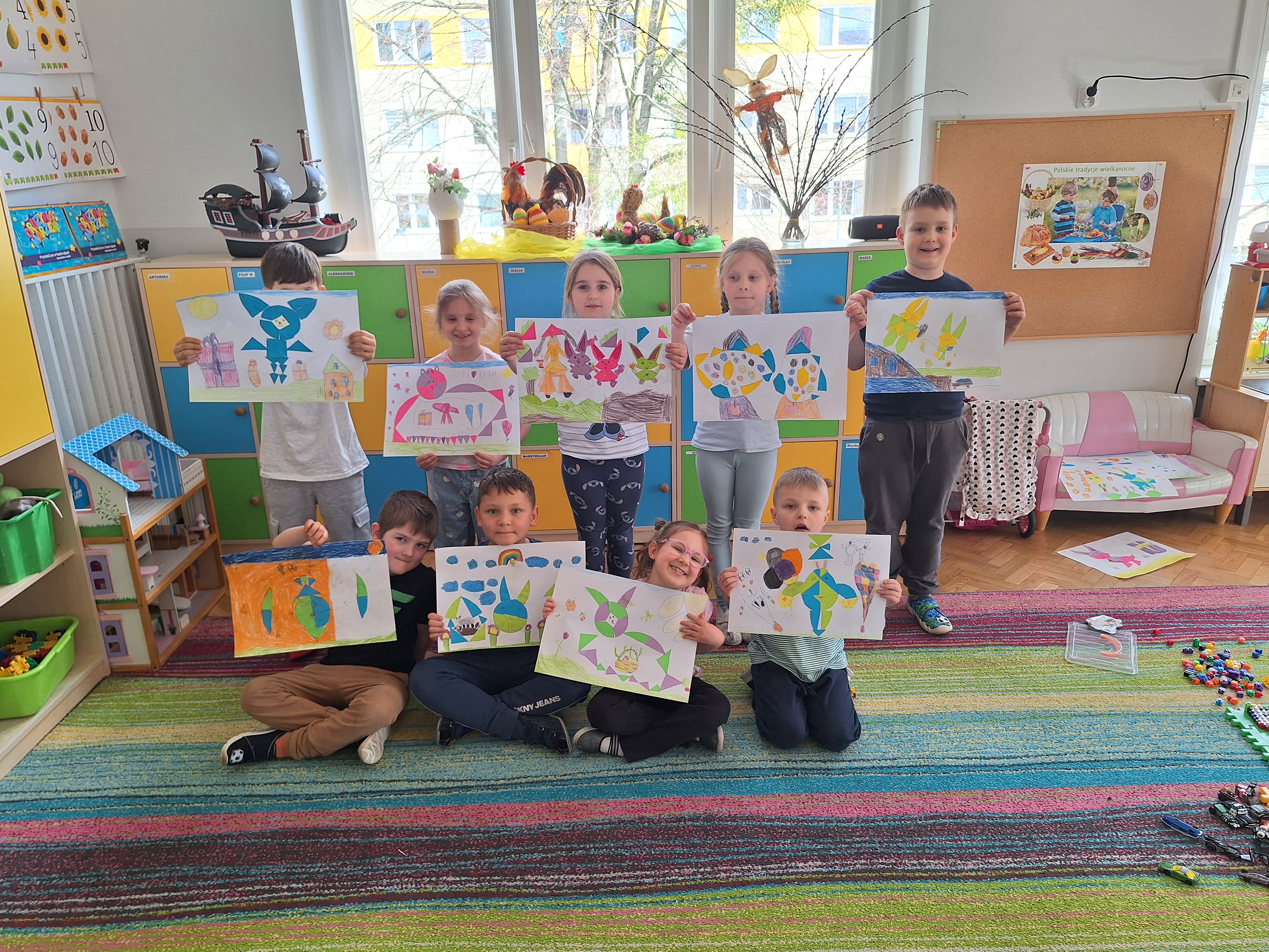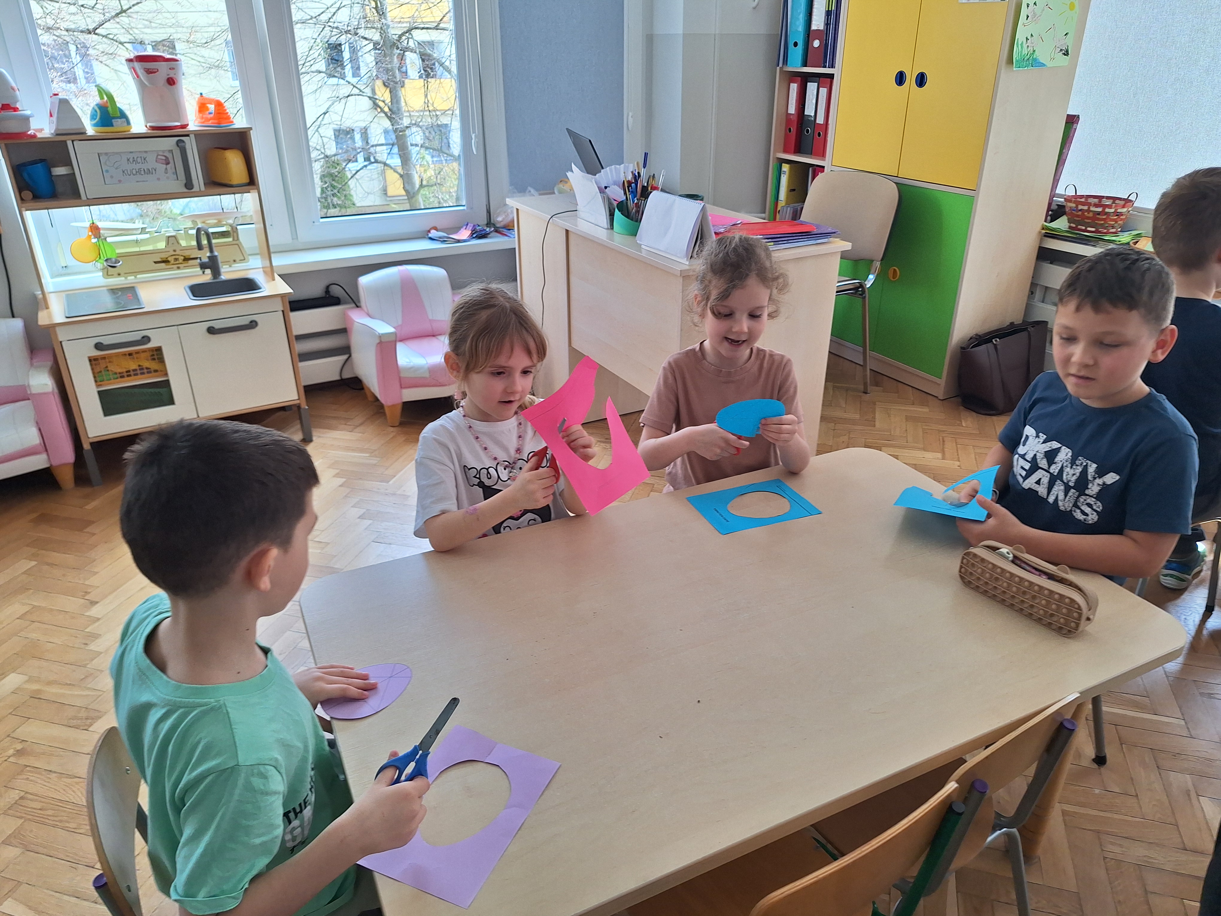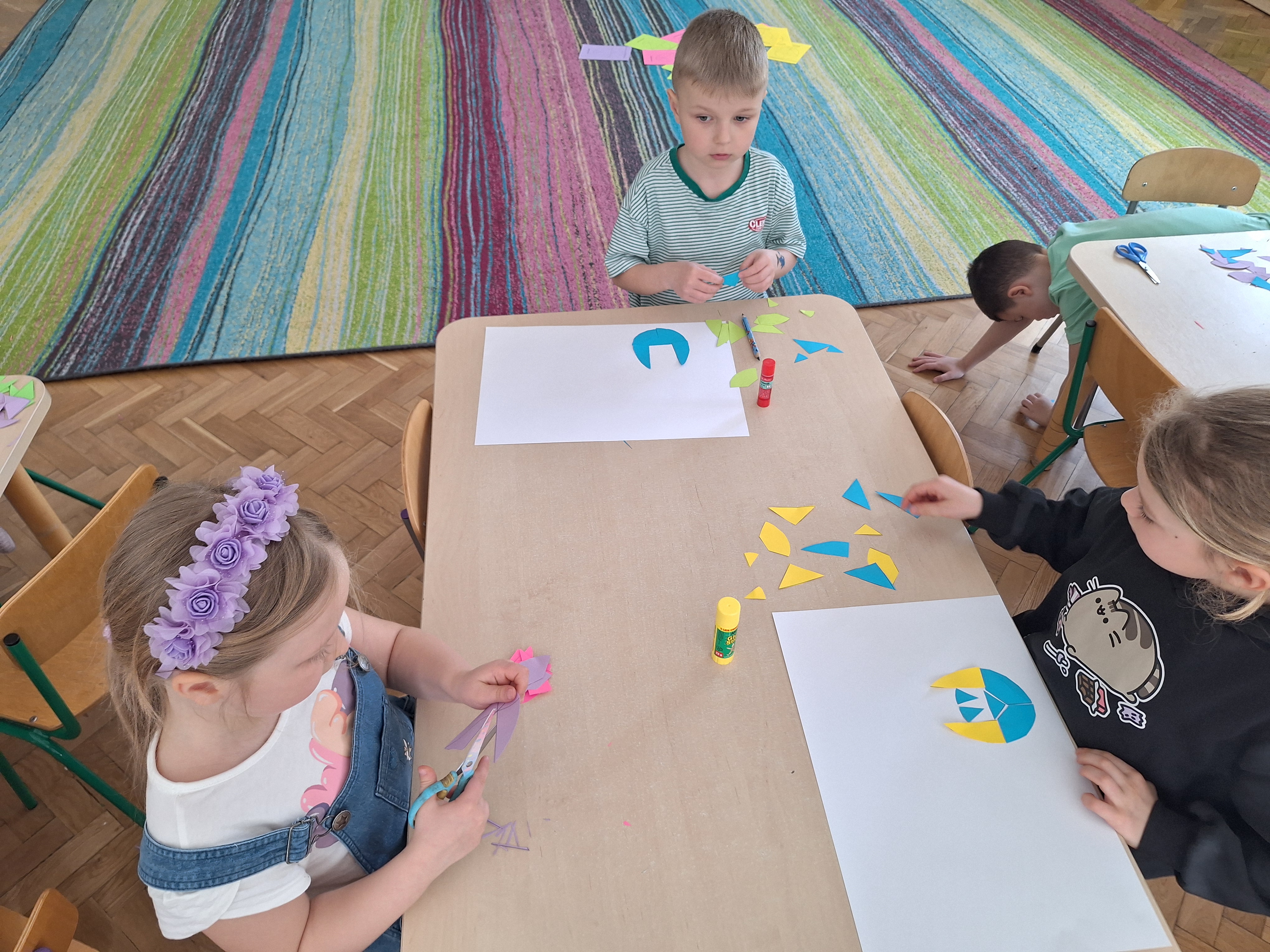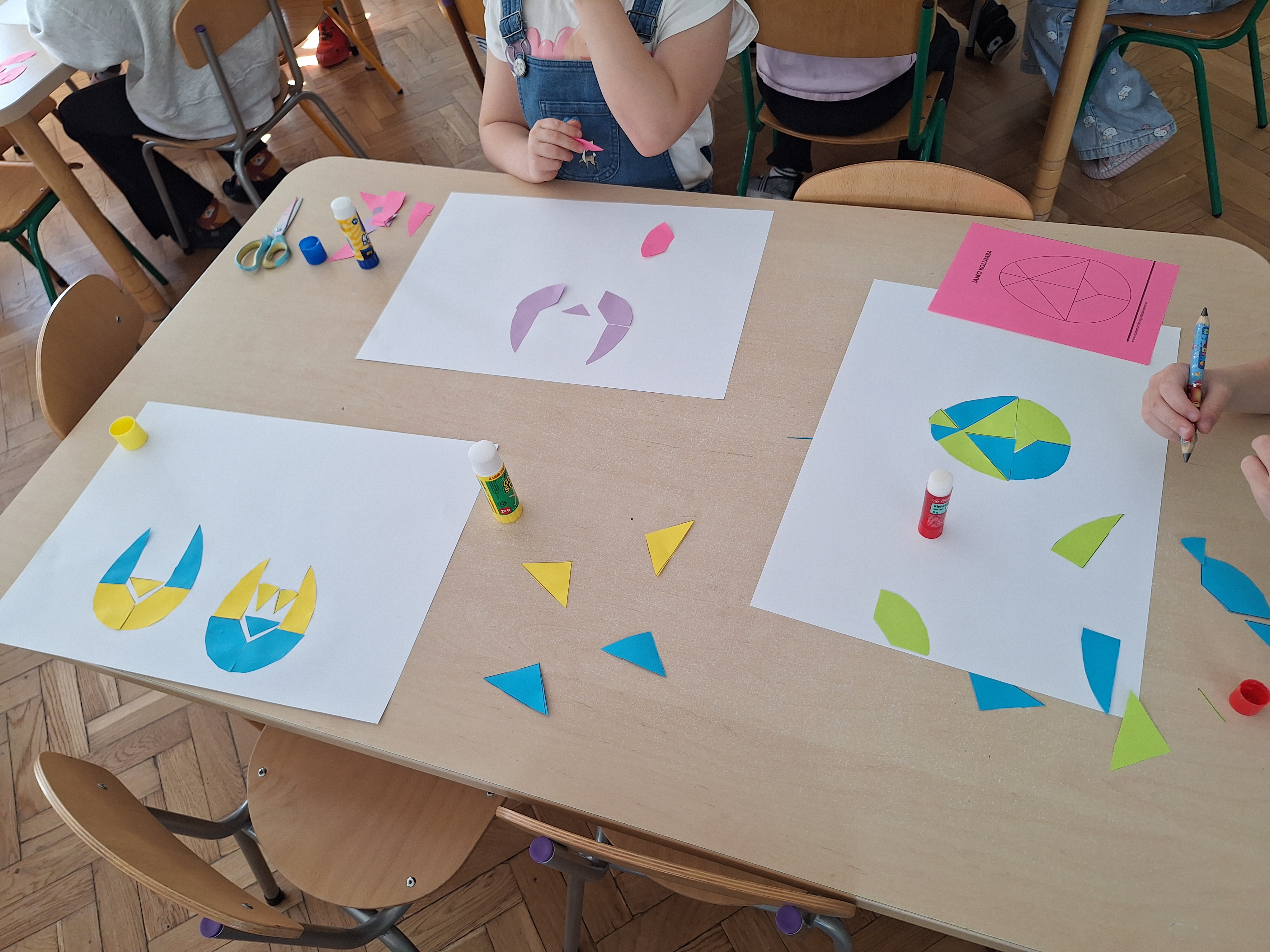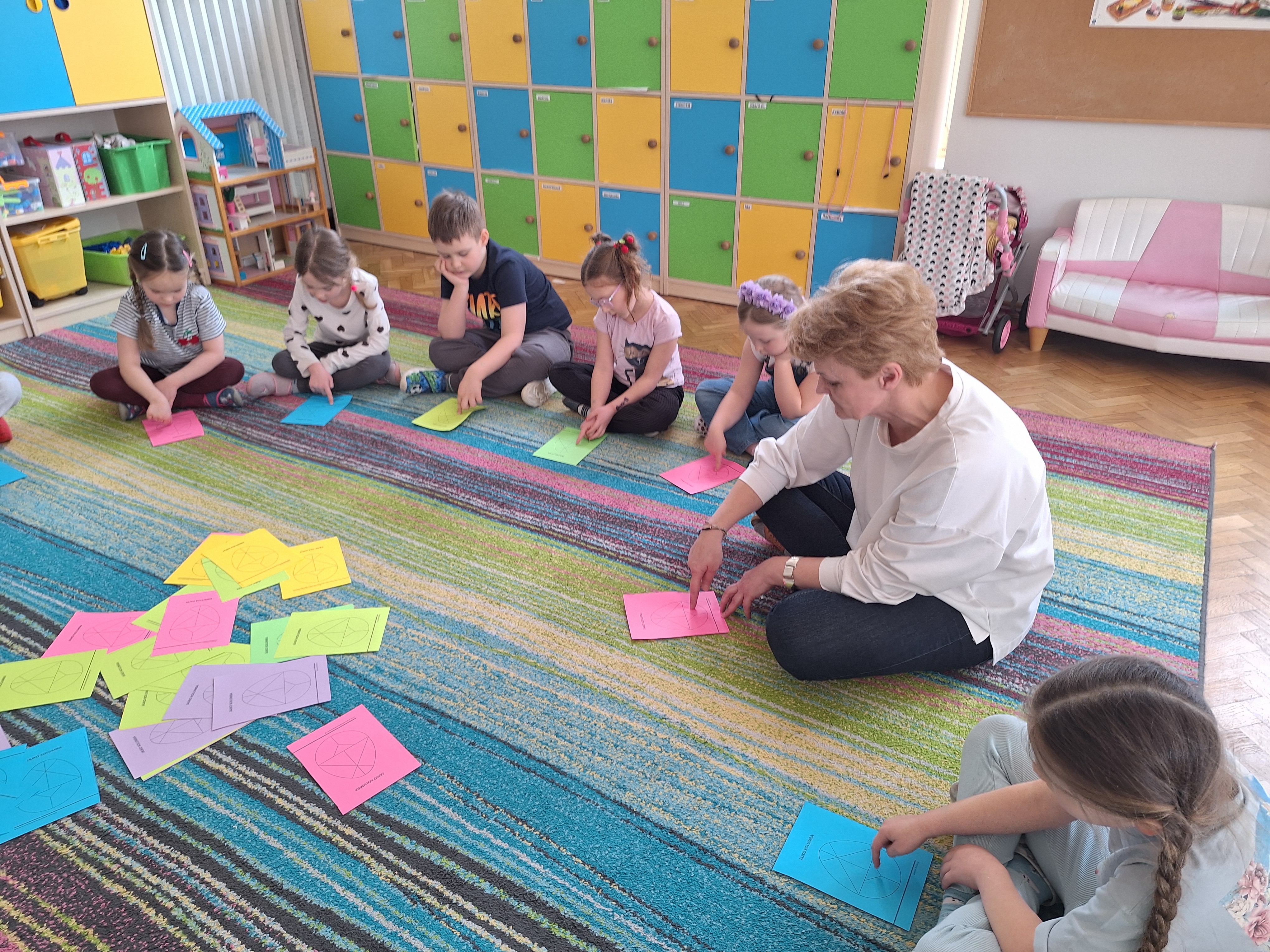 W tym tygodniu realizowaliśmy V zadanie projektu pt. "Matematyczne układanki", wykorzystując tangram w kształcie jajka. Zajęcia rozpoczęły się od wprowadzenia w atmosferę nadchodzących świąt, poprzez omówienie tradycji wielkanocnych oraz określanie charakterystycznych barw dla tego okresu. Przed przystąpieniem do pracy właściwej, dzieci wykonały ćwiczenia oddechowe, wspomagające koncentrację, a następnie skupiły się na rozpoznaniu i nazywaniu figur geometrycznych oraz przeliczaniu elementów wchodzących w skład tangramu. Kolejnym etapem było doskonalenie sprawności manualnej poprzez precyzyjne cięcie nożyczkami, co pozwoliło przedszkolakom na samodzielne przygotowanie elementów układanki. Finałem działań było wykazanie się logicznym myśleniem oraz kreatywnością podczas wykonania kompozycji, co połączyło naukę matematyki z przygotowaniami do Wielkanocy.
