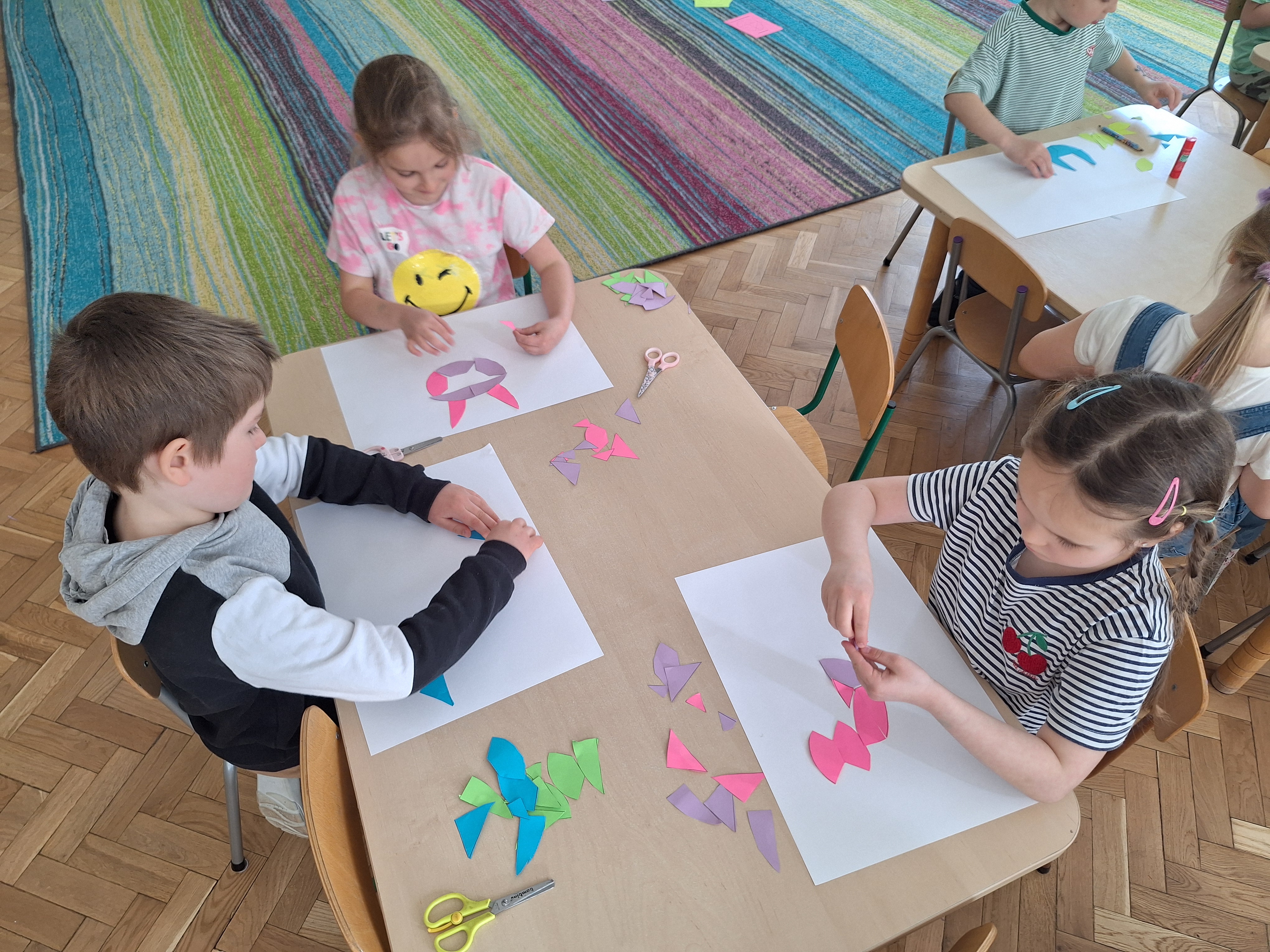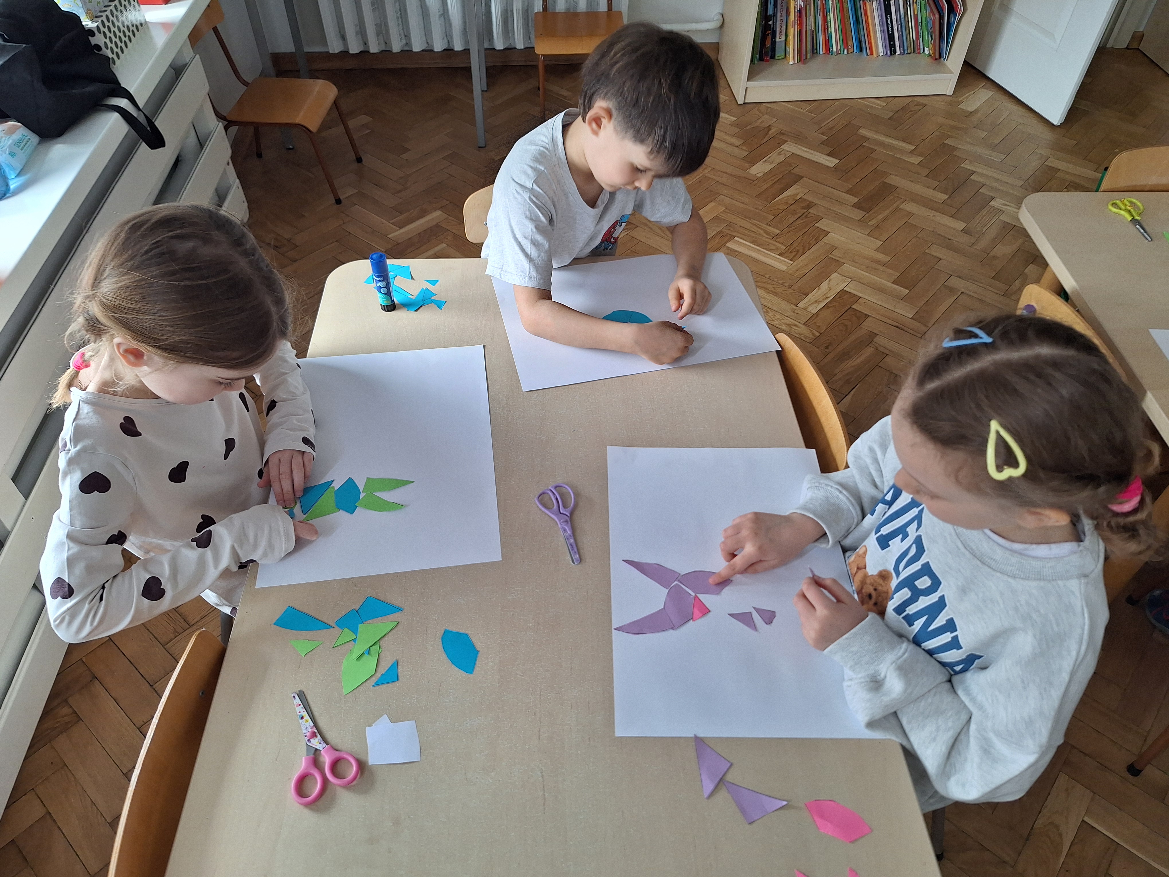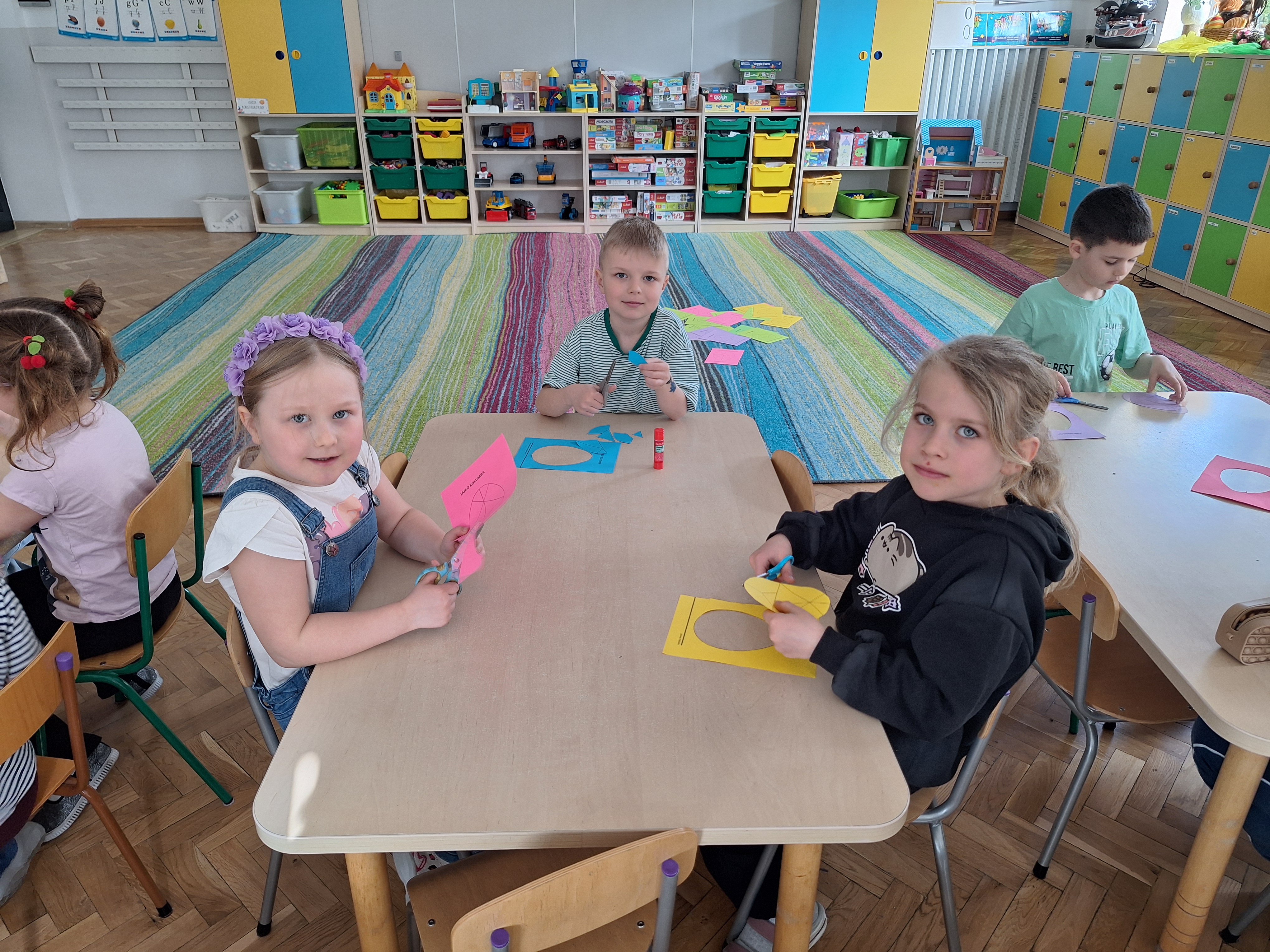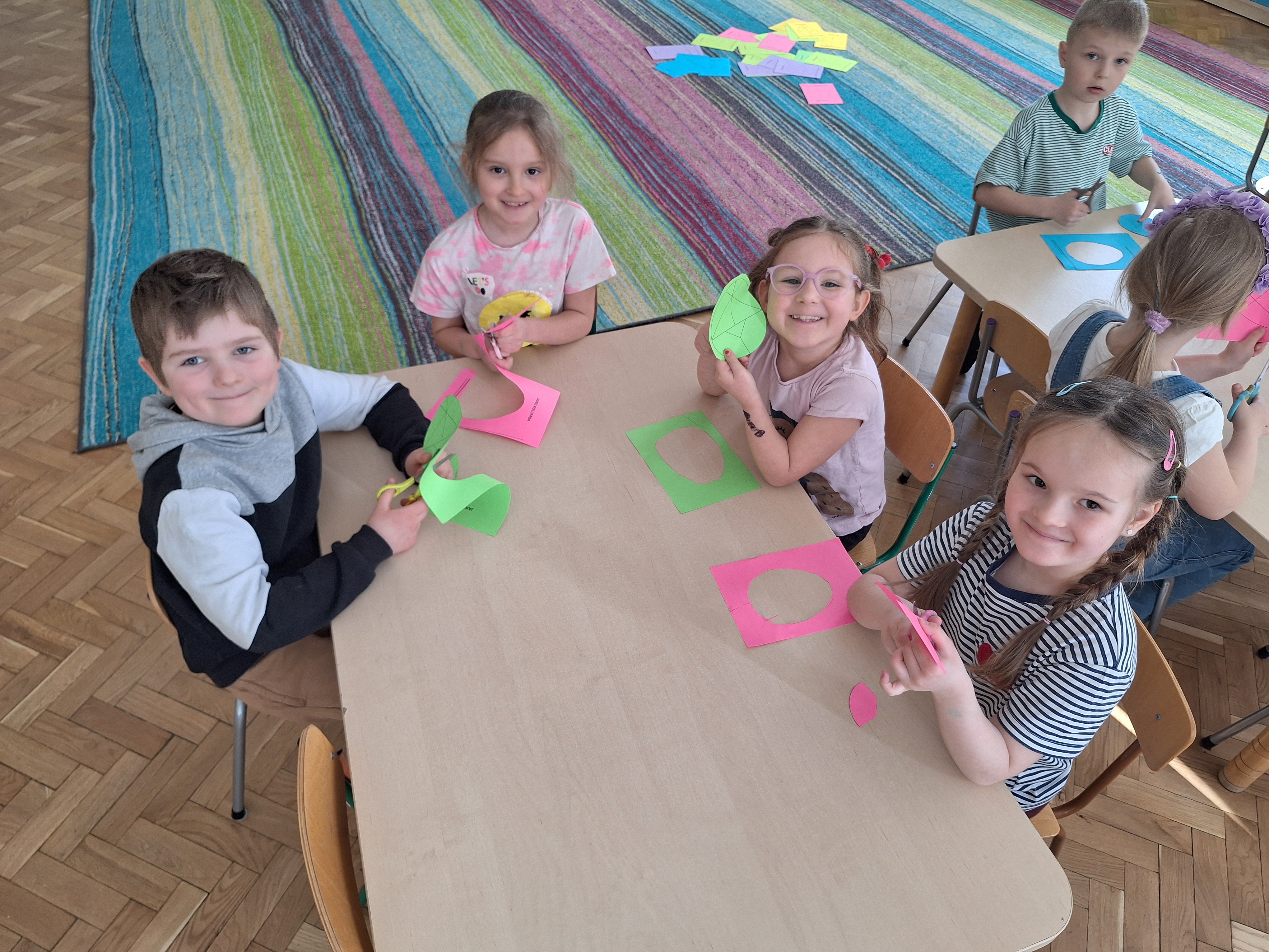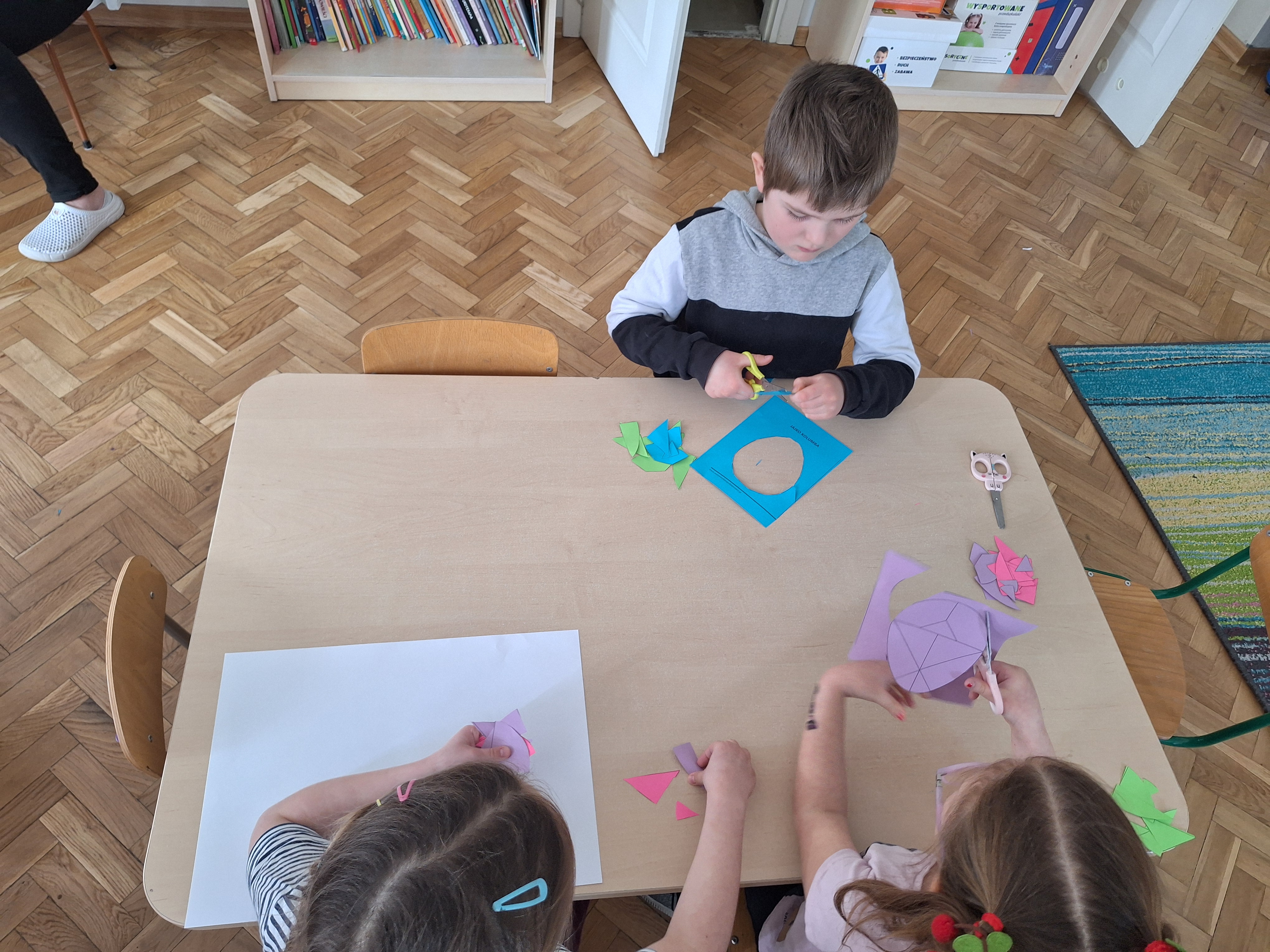 W tym tygodniu realizowaliśmy V zadanie projektu pt. "Matematyczne układanki", wykorzystując tangram w kształcie jajka. Zajęcia rozpoczęły się od wprowadzenia w atmosferę nadchodzących świąt, poprzez omówienie tradycji wielkanocnych oraz określanie charakterystycznych barw dla tego okresu. Przed przystąpieniem do pracy właściwej, dzieci wykonały ćwiczenia oddechowe, wspomagające koncentrację, a następnie skupiły się na rozpoznaniu i nazywaniu figur geometrycznych oraz przeliczaniu elementów wchodzących w skład tangramu. Kolejnym etapem było doskonalenie sprawności manualnej poprzez precyzyjne cięcie nożyczkami, co pozwoliło przedszkolakom na samodzielne przygotowanie elementów układanki. Finałem działań było wykazanie się logicznym myśleniem oraz kreatywnością podczas wykonania kompozycji, co połączyło naukę matematyki z przygotowaniami do Wielkanocy.