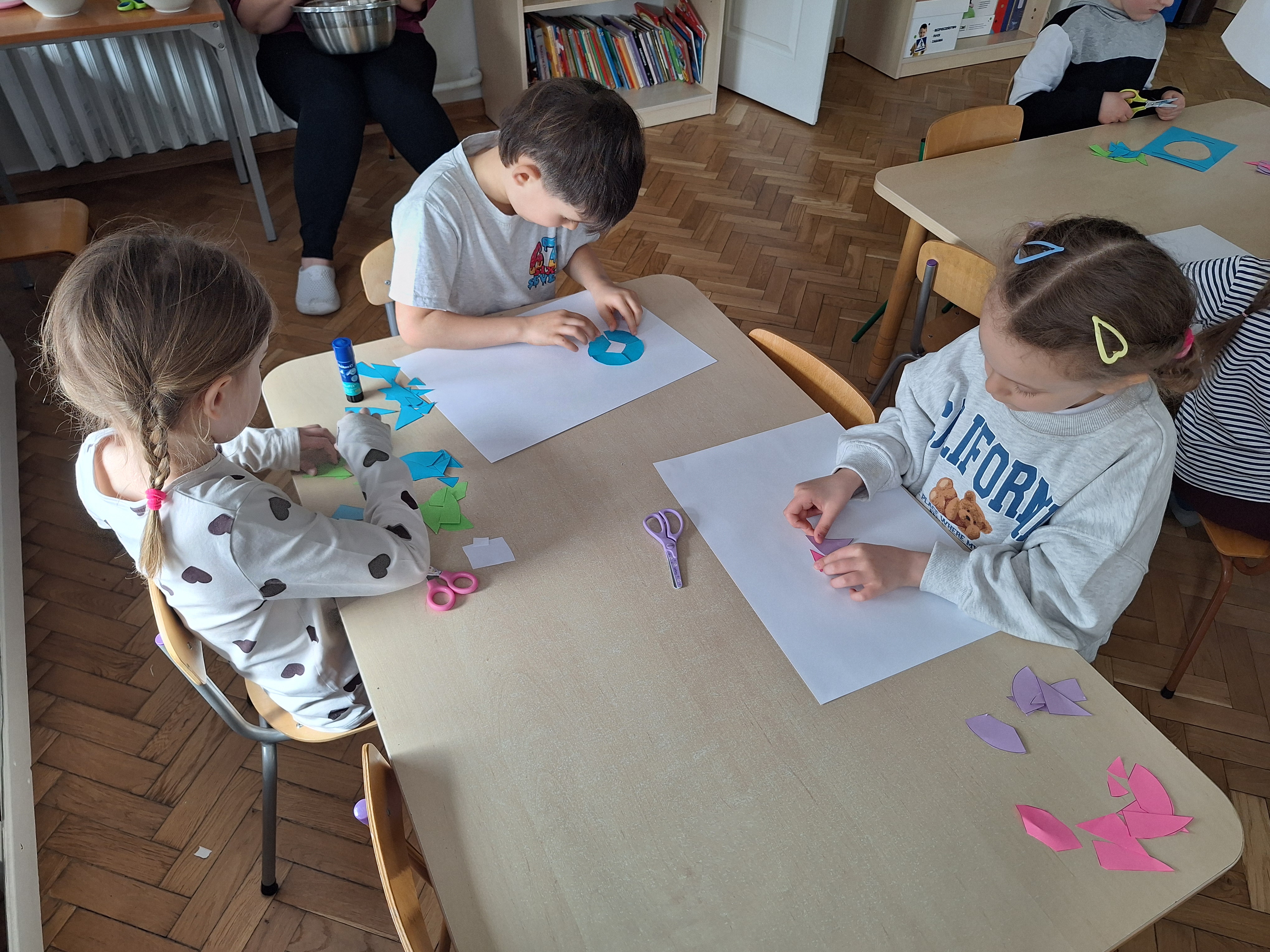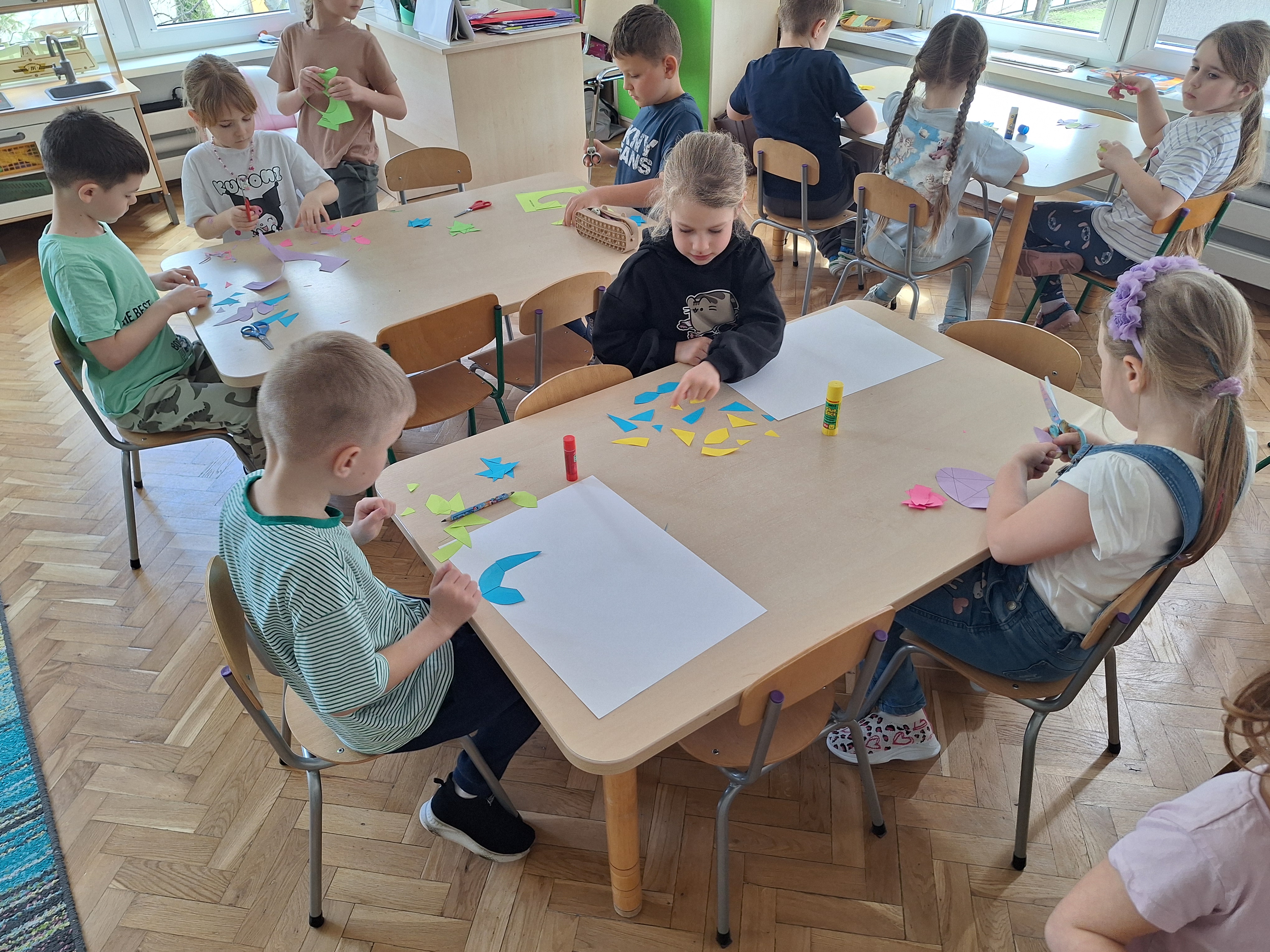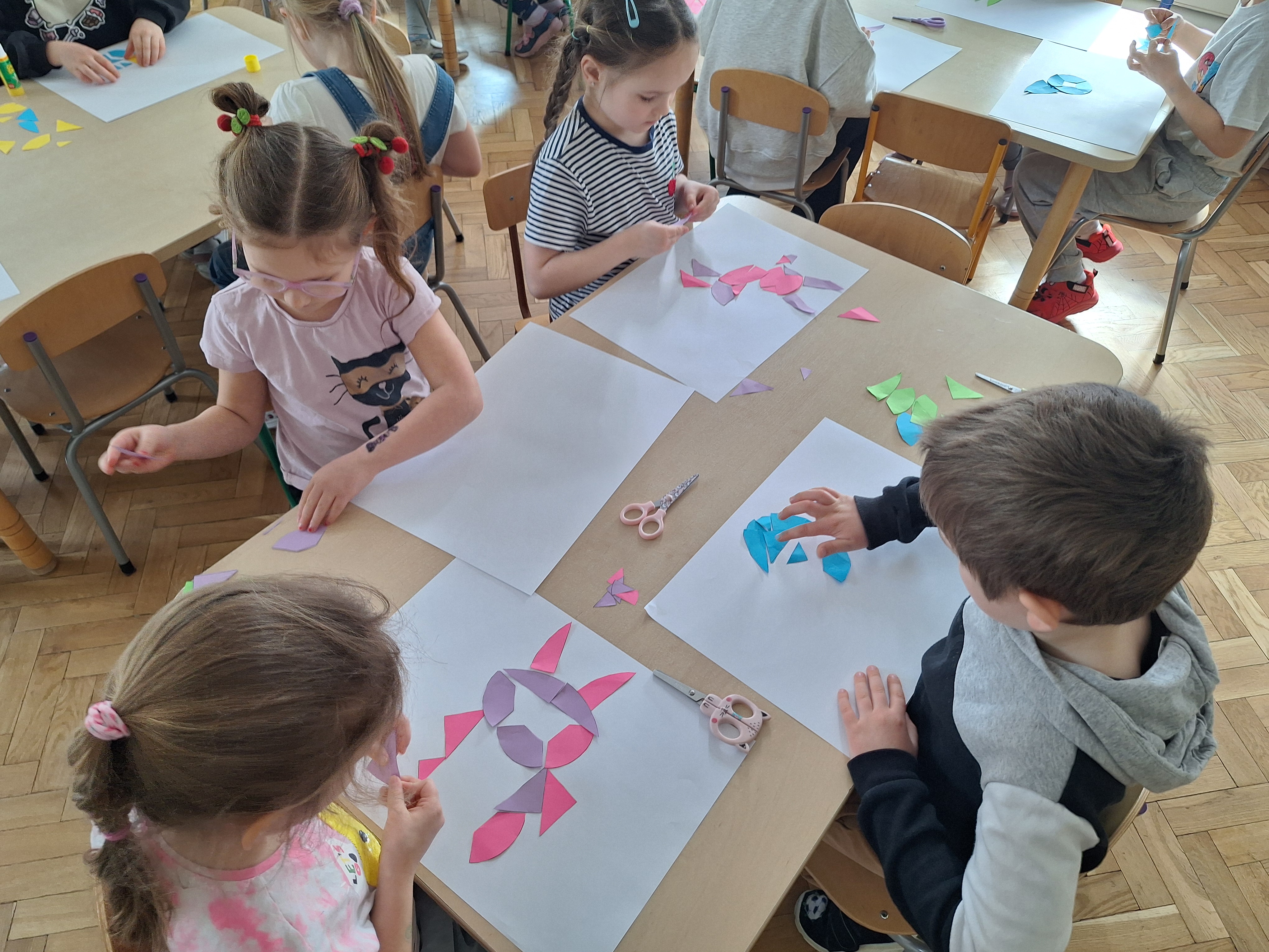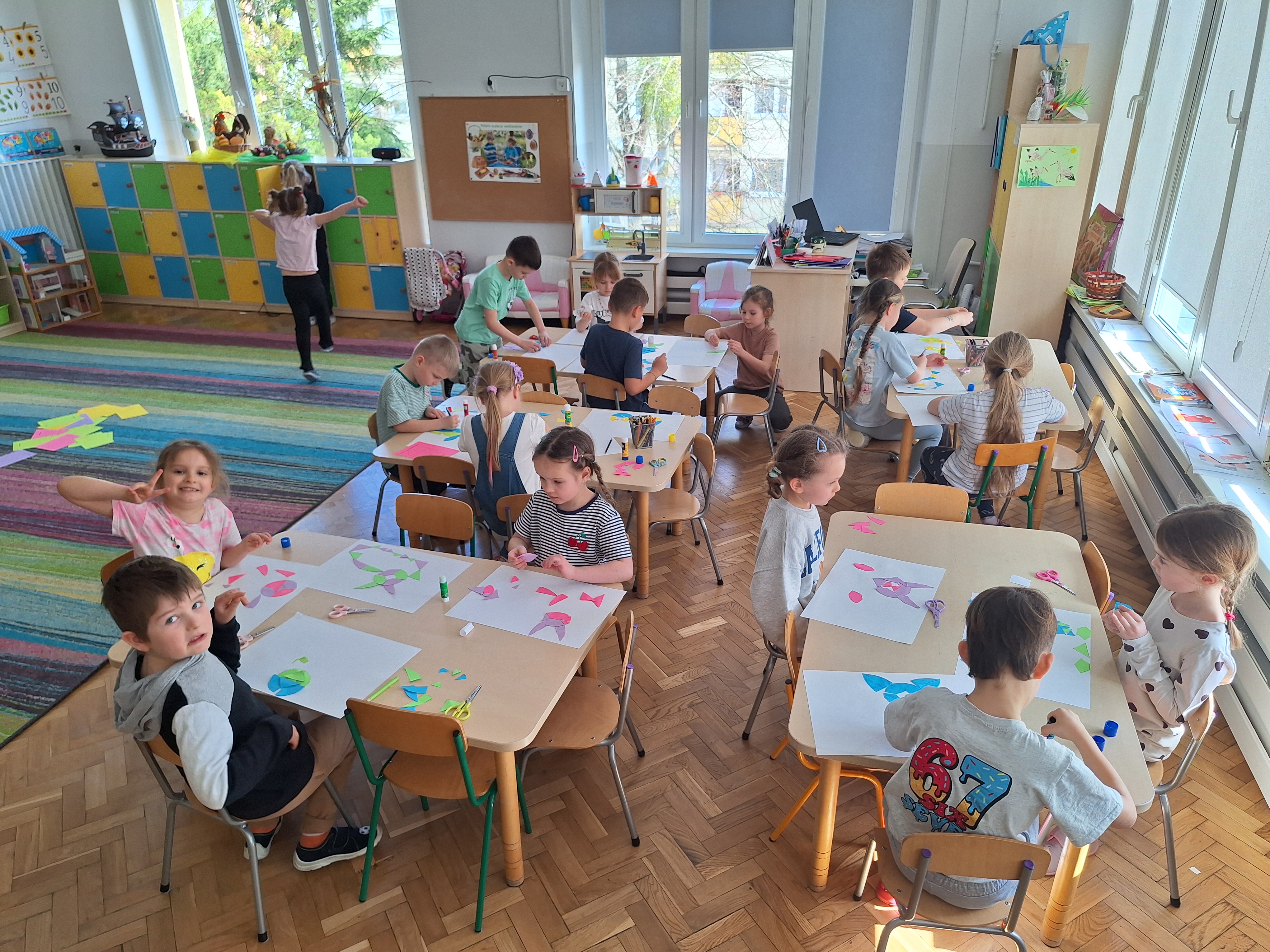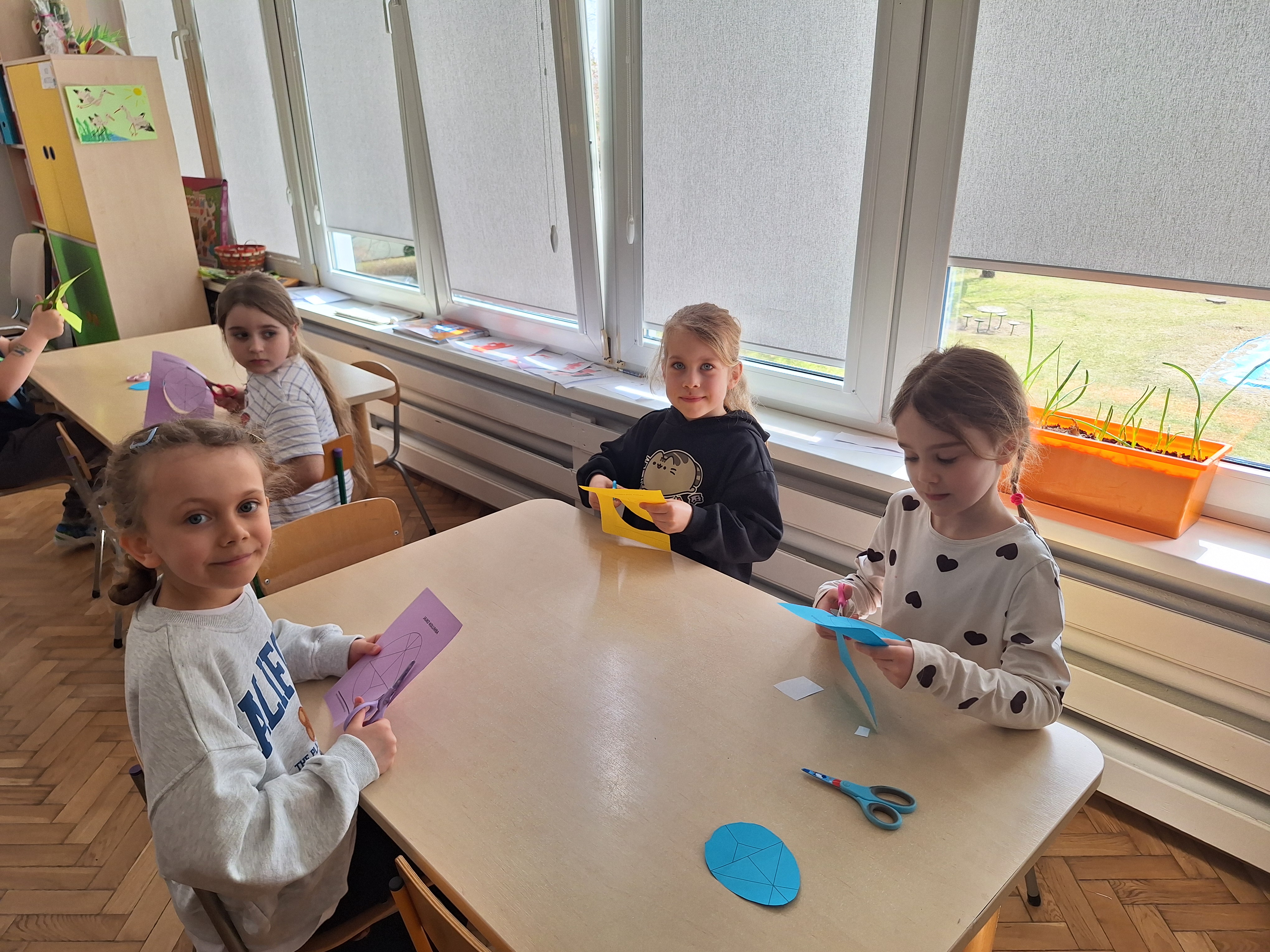 W tym tygodniu realizowaliśmy V zadanie projektu pt. "Matematyczne układanki", wykorzystując tangram w kształcie jajka. Zajęcia rozpoczęły się od wprowadzenia w atmosferę nadchodzących świąt, poprzez omówienie tradycji wielkanocnych oraz określanie charakterystycznych barw dla tego okresu. Przed przystąpieniem do pracy właściwej, dzieci wykonały ćwiczenia oddechowe, wspomagające koncentrację, a następnie skupiły się na rozpoznaniu i nazywaniu figur geometrycznych oraz przeliczaniu elementów wchodzących w skład tangramu. Kolejnym etapem było doskonalenie sprawności manualnej poprzez precyzyjne cięcie nożyczkami, co pozwoliło przedszkolakom na samodzielne przygotowanie elementów układanki. Finałem działań było wykazanie się logicznym myśleniem oraz kreatywnością podczas wykonania kompozycji, co połączyło naukę matematyki z przygotowaniami do Wielkanocy.