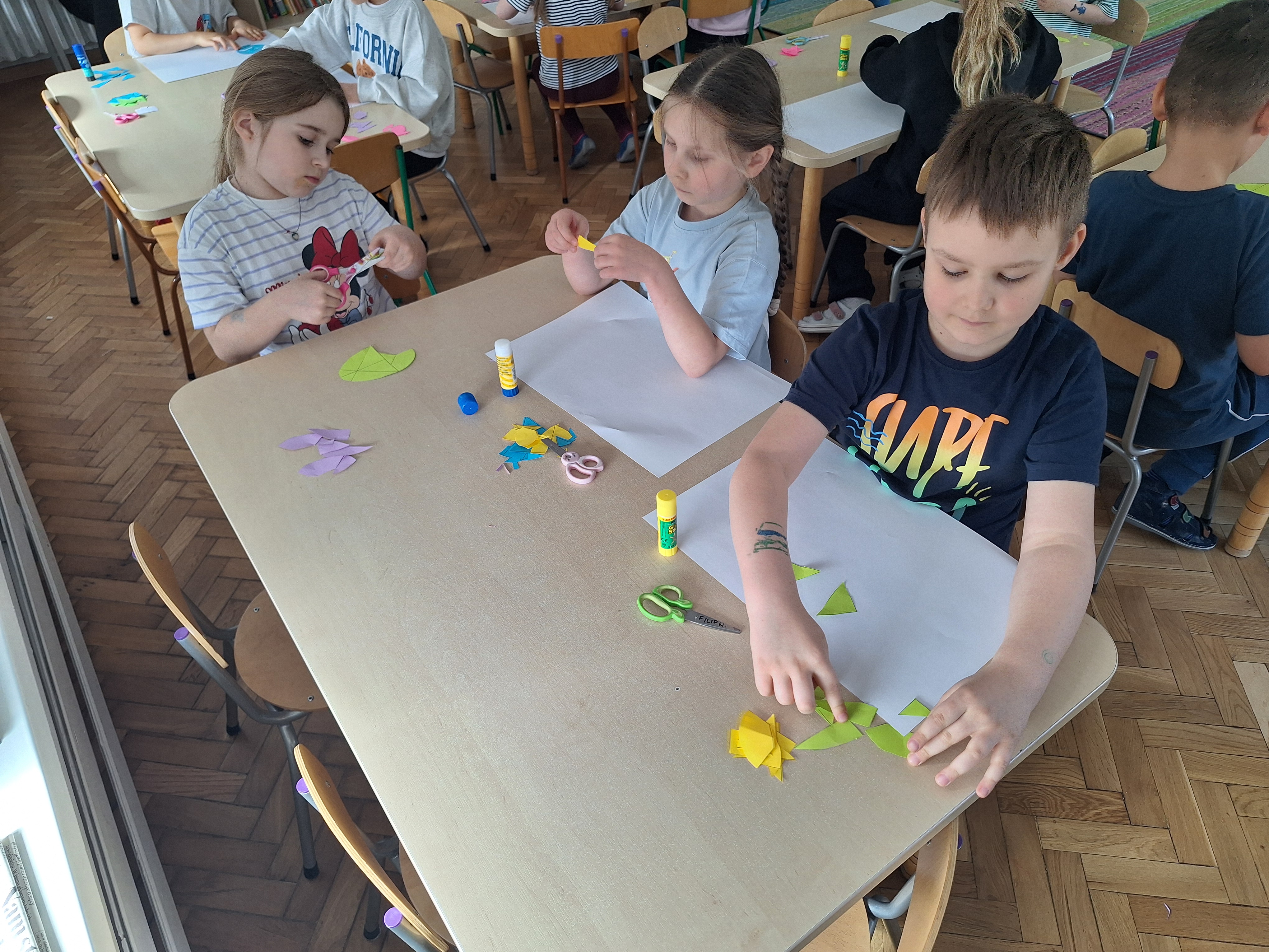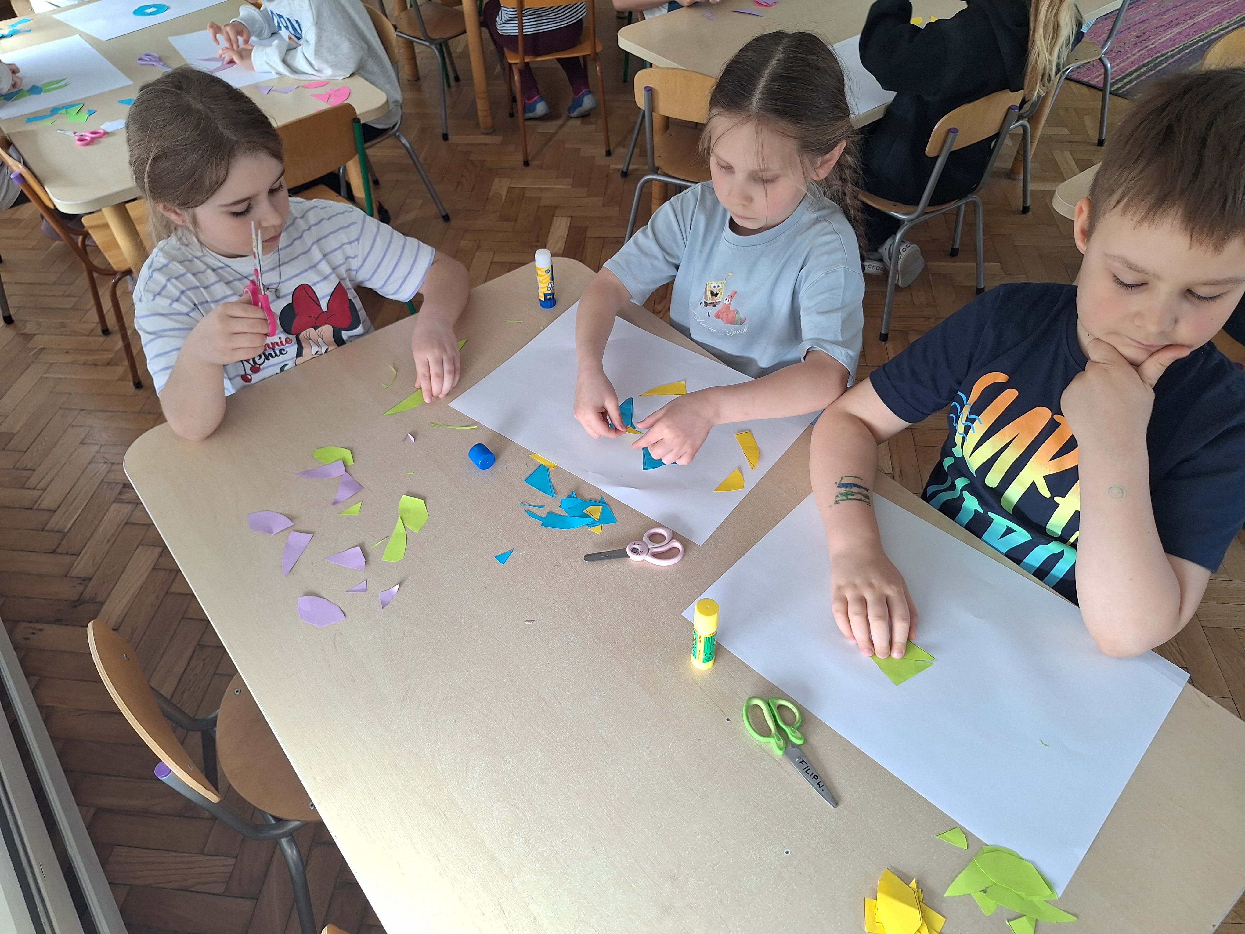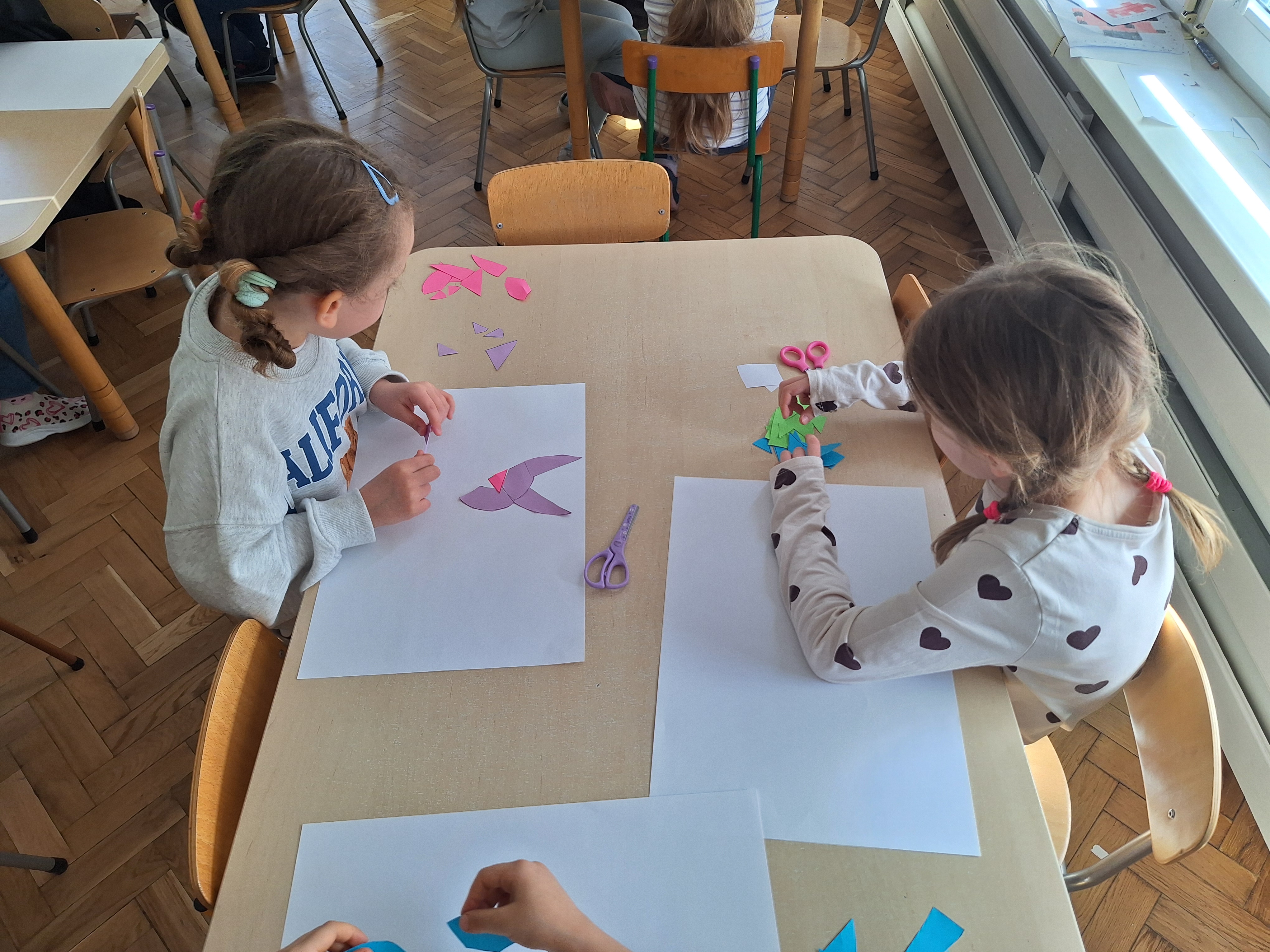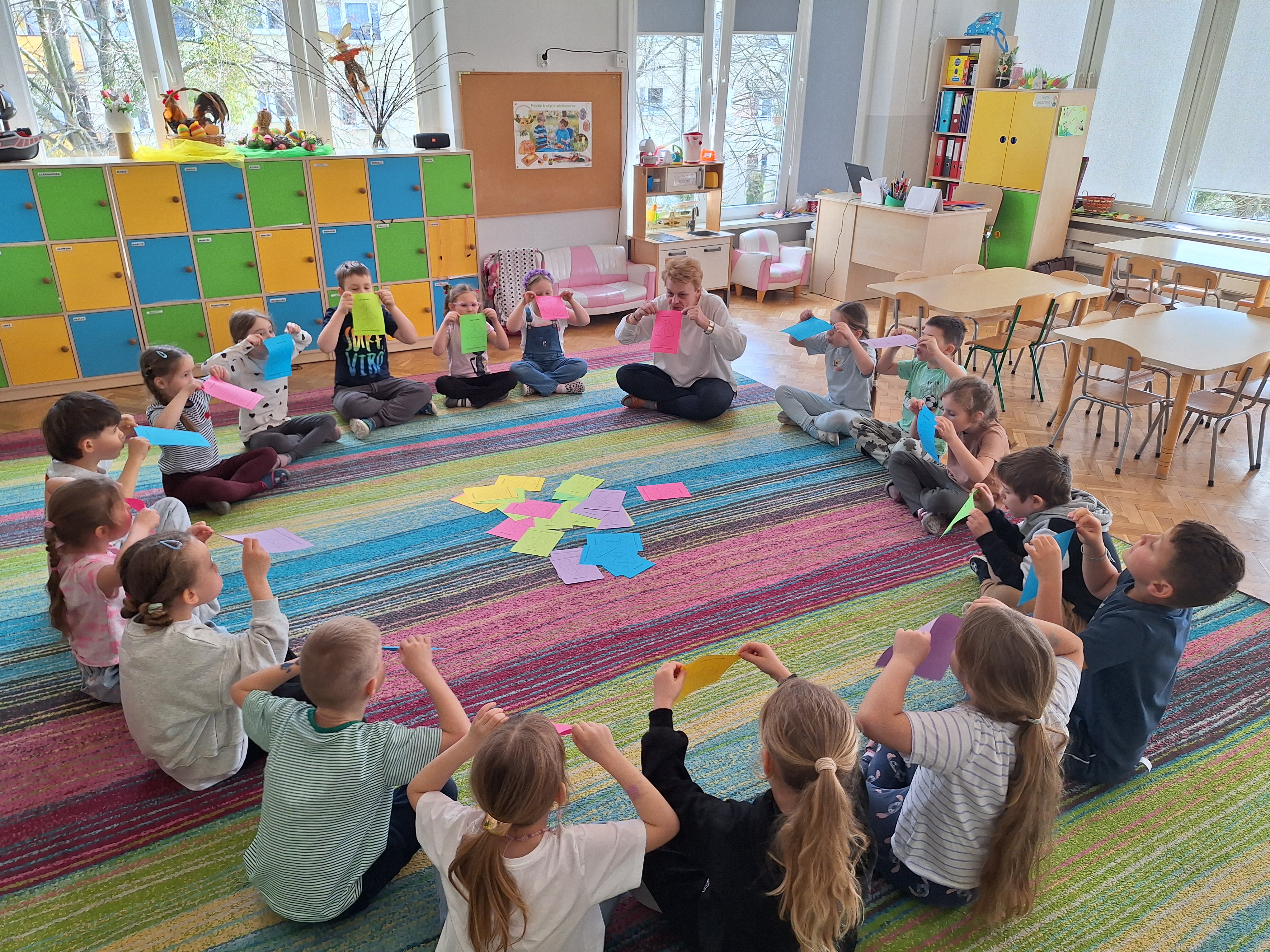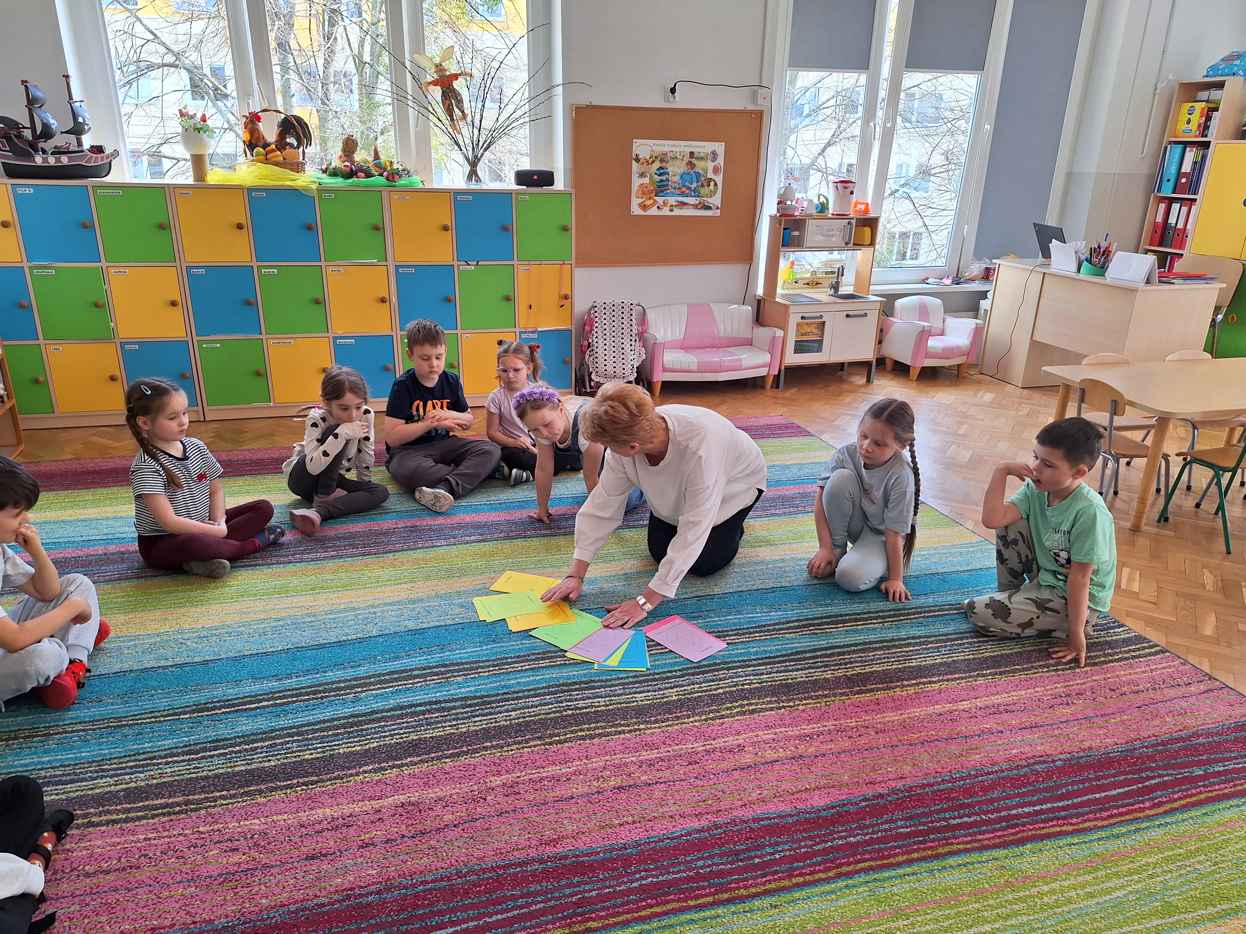 W tym tygodniu realizowaliśmy V zadanie projektu pt. "Matematyczne układanki", wykorzystując tangram w kształcie jajka. Zajęcia rozpoczęły się od wprowadzenia w atmosferę nadchodzących świąt, poprzez omówienie tradycji wielkanocnych oraz określanie charakterystycznych barw dla tego okresu. Przed przystąpieniem do pracy właściwej, dzieci wykonały ćwiczenia oddechowe, wspomagające koncentrację, a następnie skupiły się na rozpoznaniu i nazywaniu figur geometrycznych oraz przeliczaniu elementów wchodzących w skład tangramu. Kolejnym etapem było doskonalenie sprawności manualnej poprzez precyzyjne cięcie nożyczkami, co pozwoliło przedszkolakom na samodzielne przygotowanie elementów układanki. Finałem działań było wykazanie się logicznym myśleniem oraz kreatywnością podczas wykonania kompozycji, co połączyło naukę matematyki z przygotowaniami do Wielkanocy.