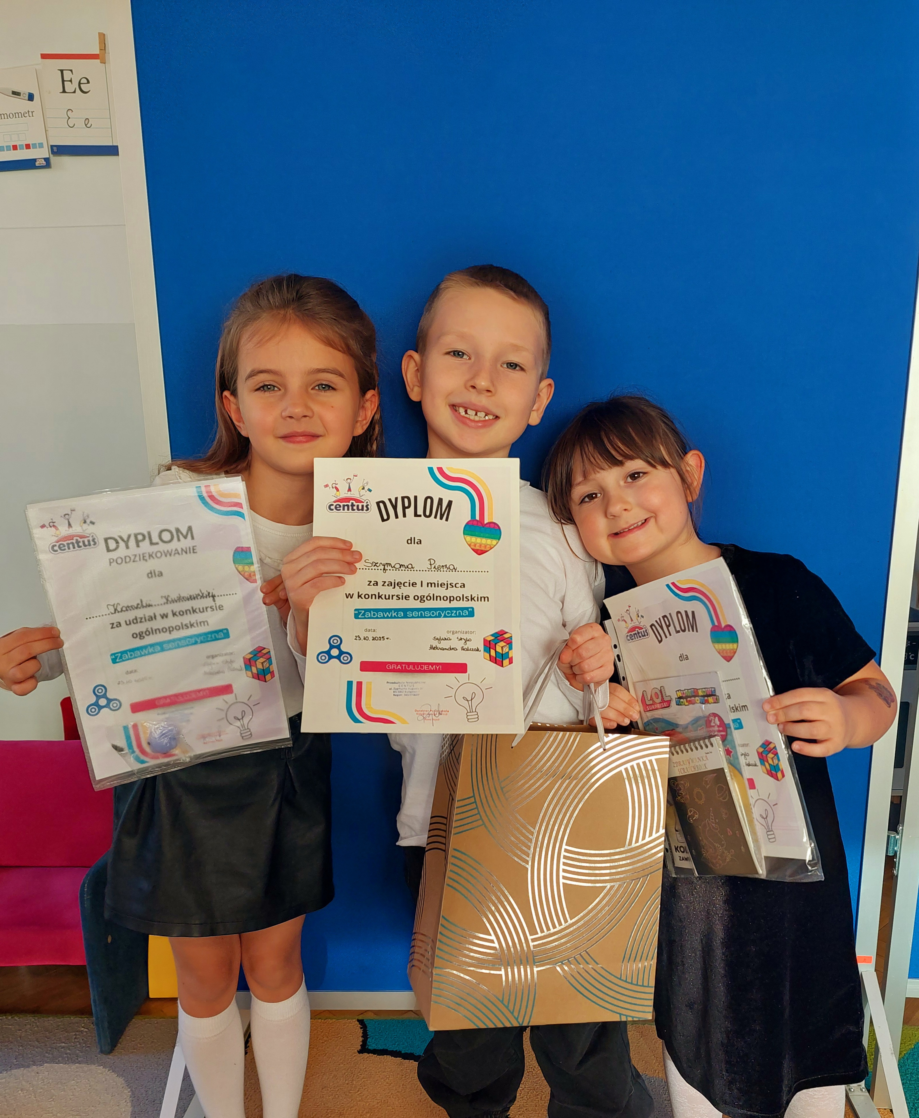 Troje dzieci z grupy 0a wzięło udział w Ogólnopolskim Konkursie „Sensoryczna Zabawka", organizowanym przez Przedszkole Centuś z Bydgoszczy. Z radością informujemy, że zajęły wspaniałe miejsca : ) Wielkie starania, praca, wyobraźnia oraz wysłanie prac bardzo się opłaciło....