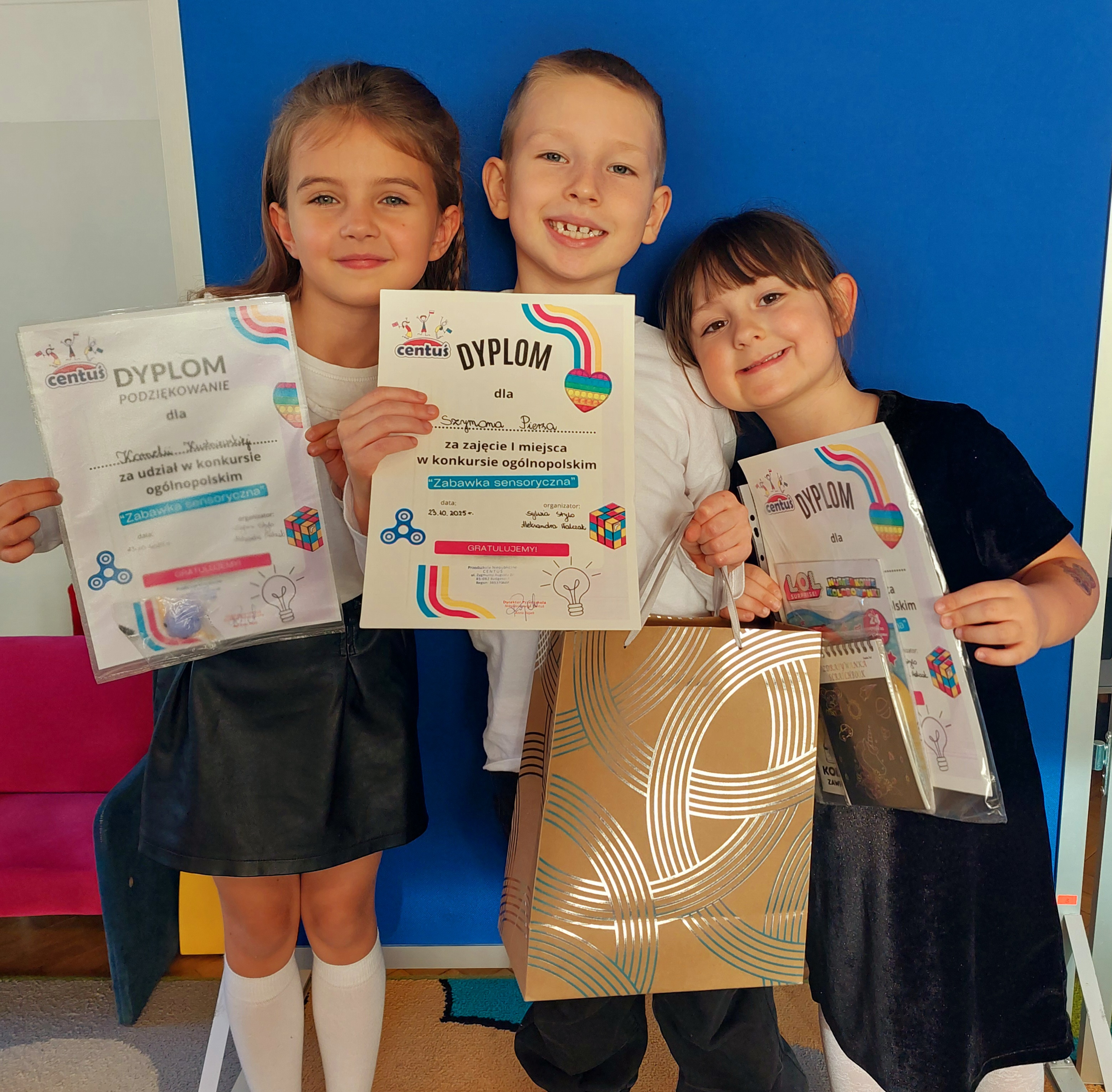 Z radością informujemy, że troje dzieci z naszej grupy wzięło udział w Ogólnopolskim Konkursie „Sensoryczna Zabawka”, organizowanym przez Przedszkole Centuś z Bydgoszczy. Wielkie starania , praca i wyobraźnia oraz wysłanie prac bardzo się opłaciło : )
