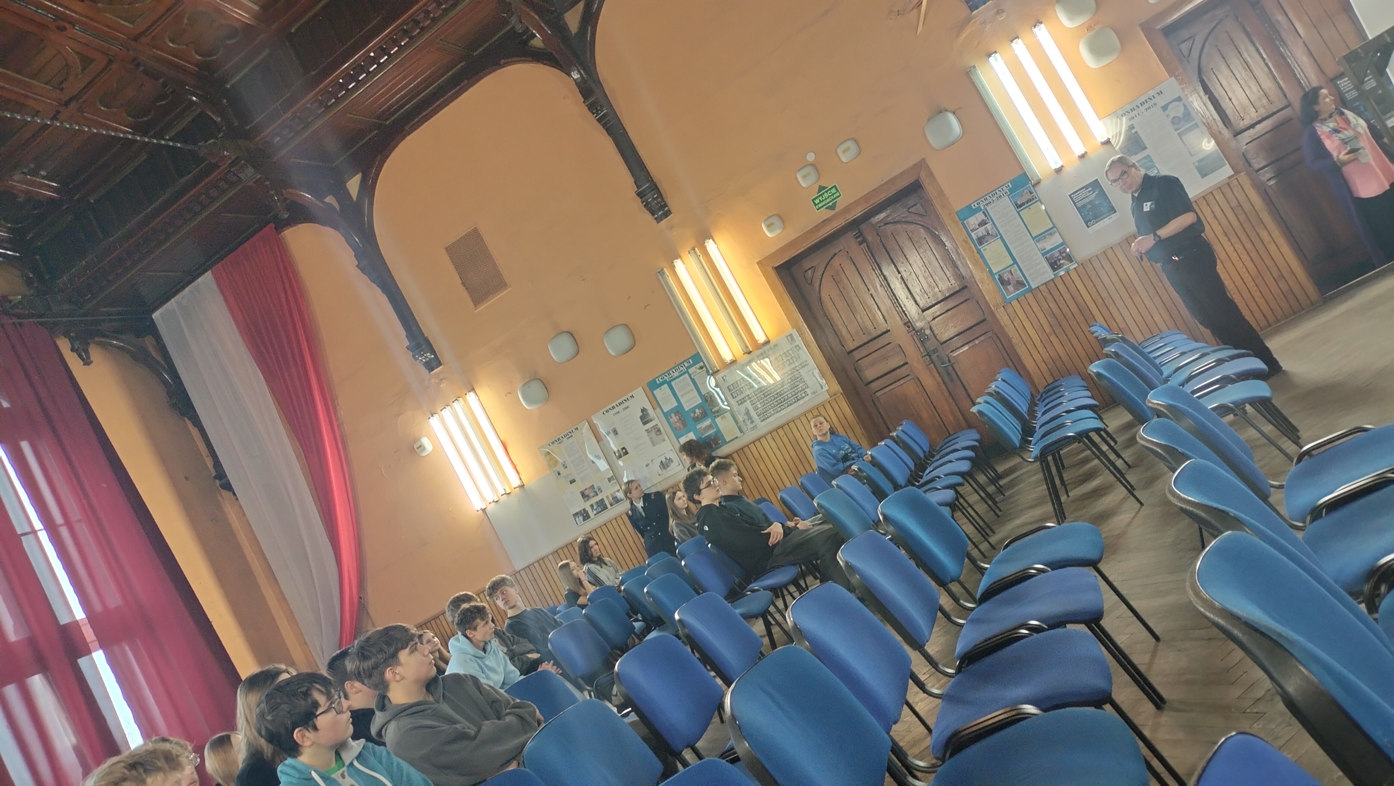 Podczas spaceru po szkole uczniowie zwiedzili różne jej zakątki – w tym imponującą aulę, która zrobiła na nich ogromne wrażenie i pozwoliła poczuć wyjątkowy klimat placówki.