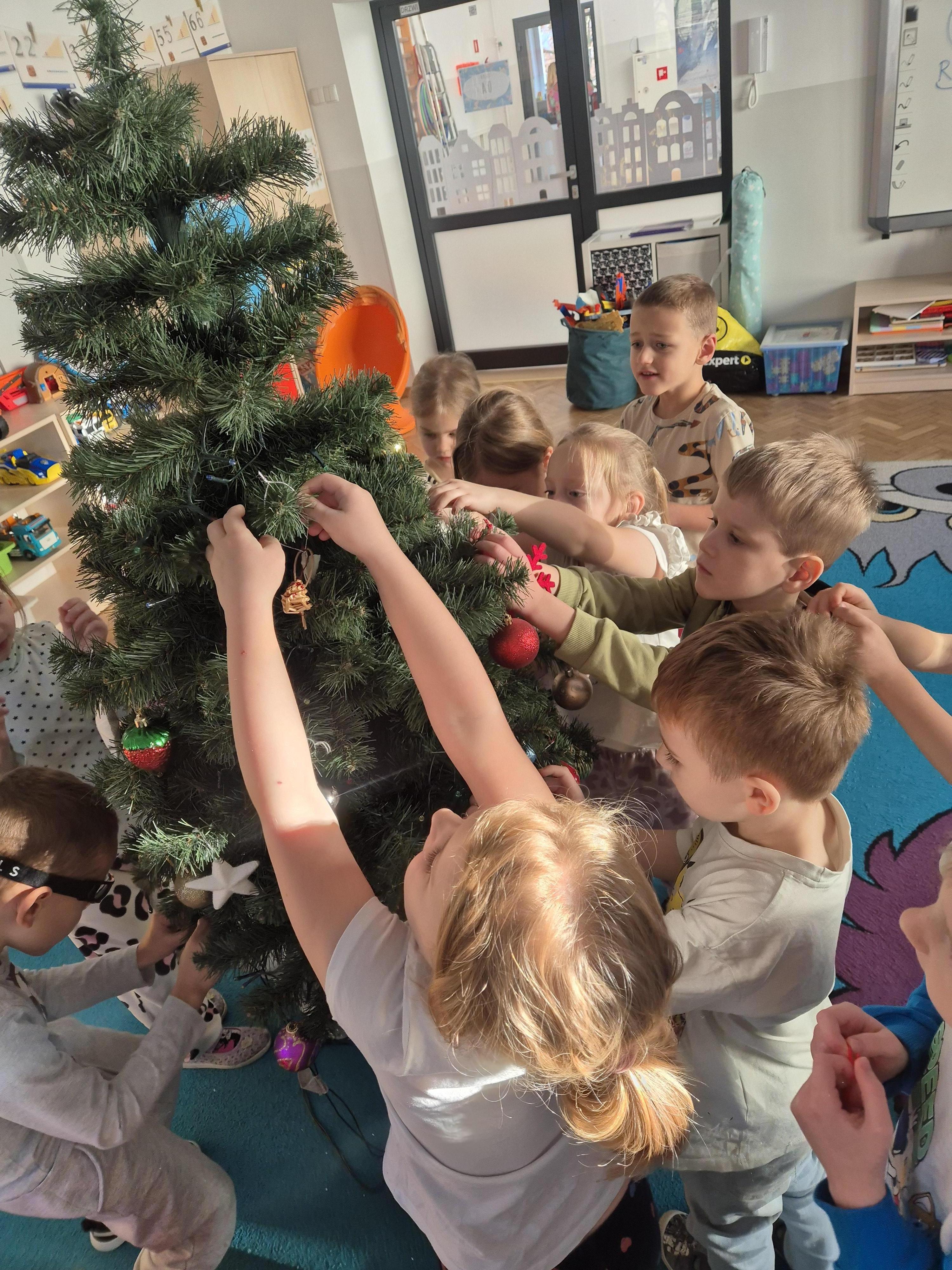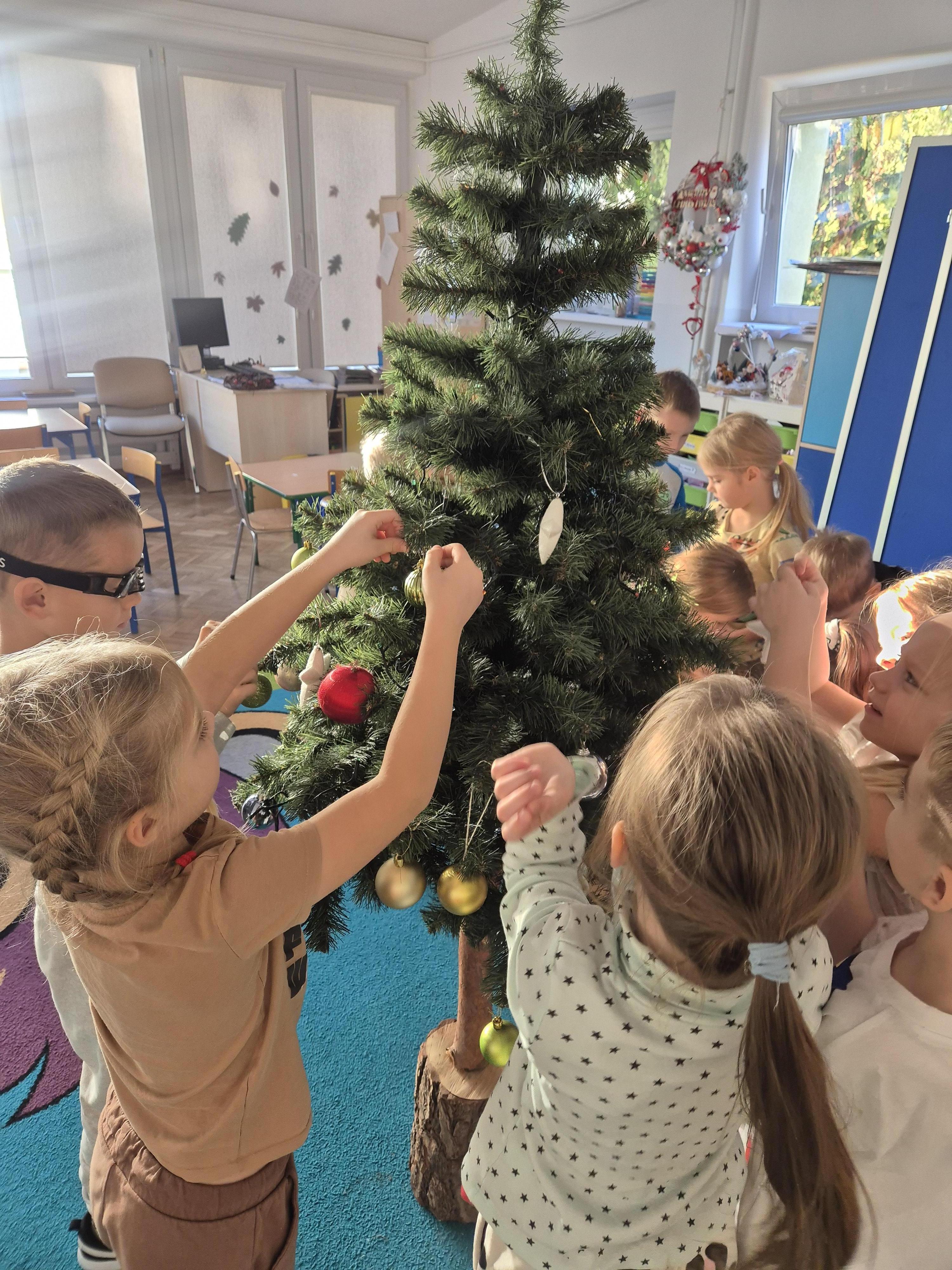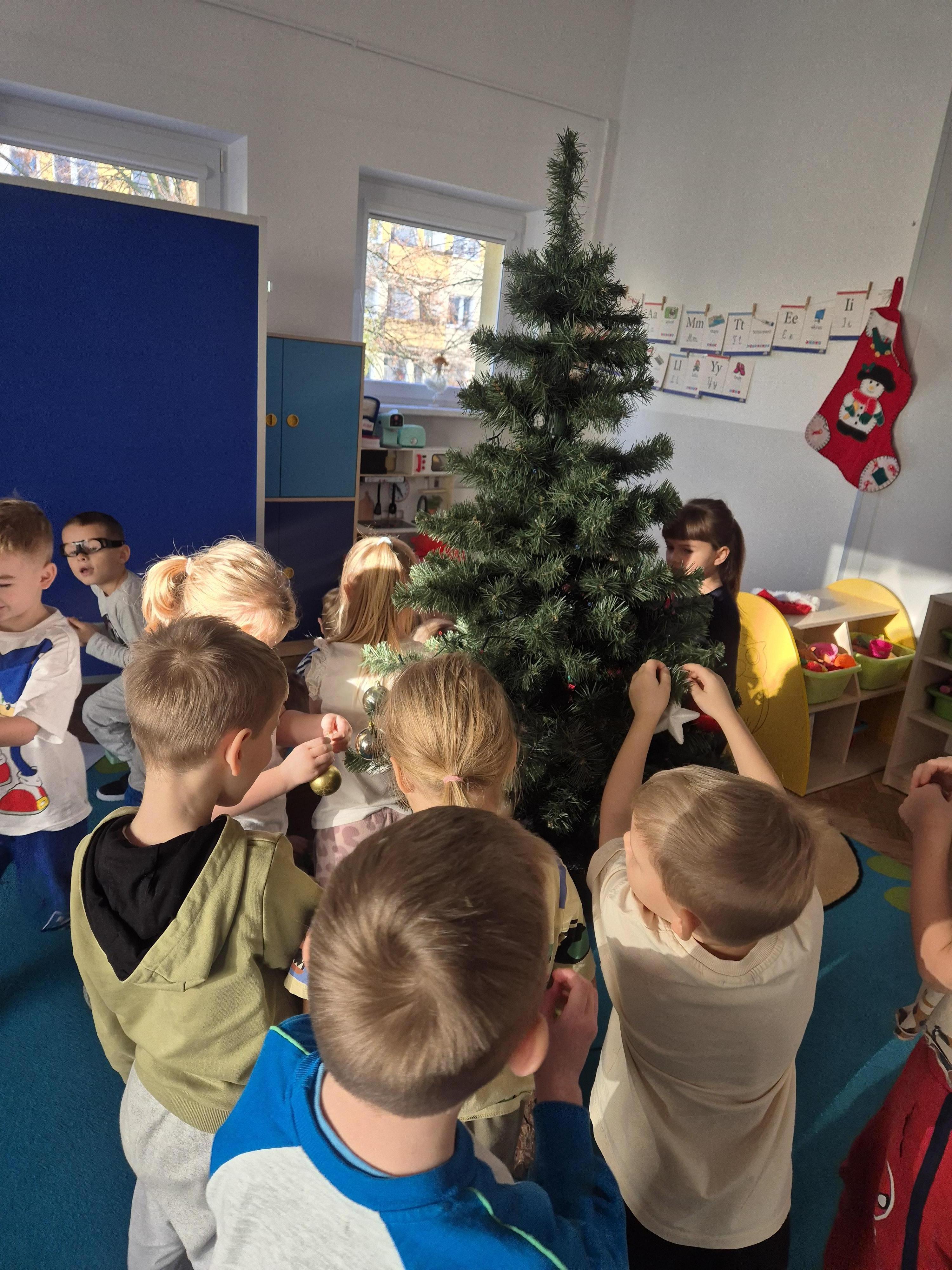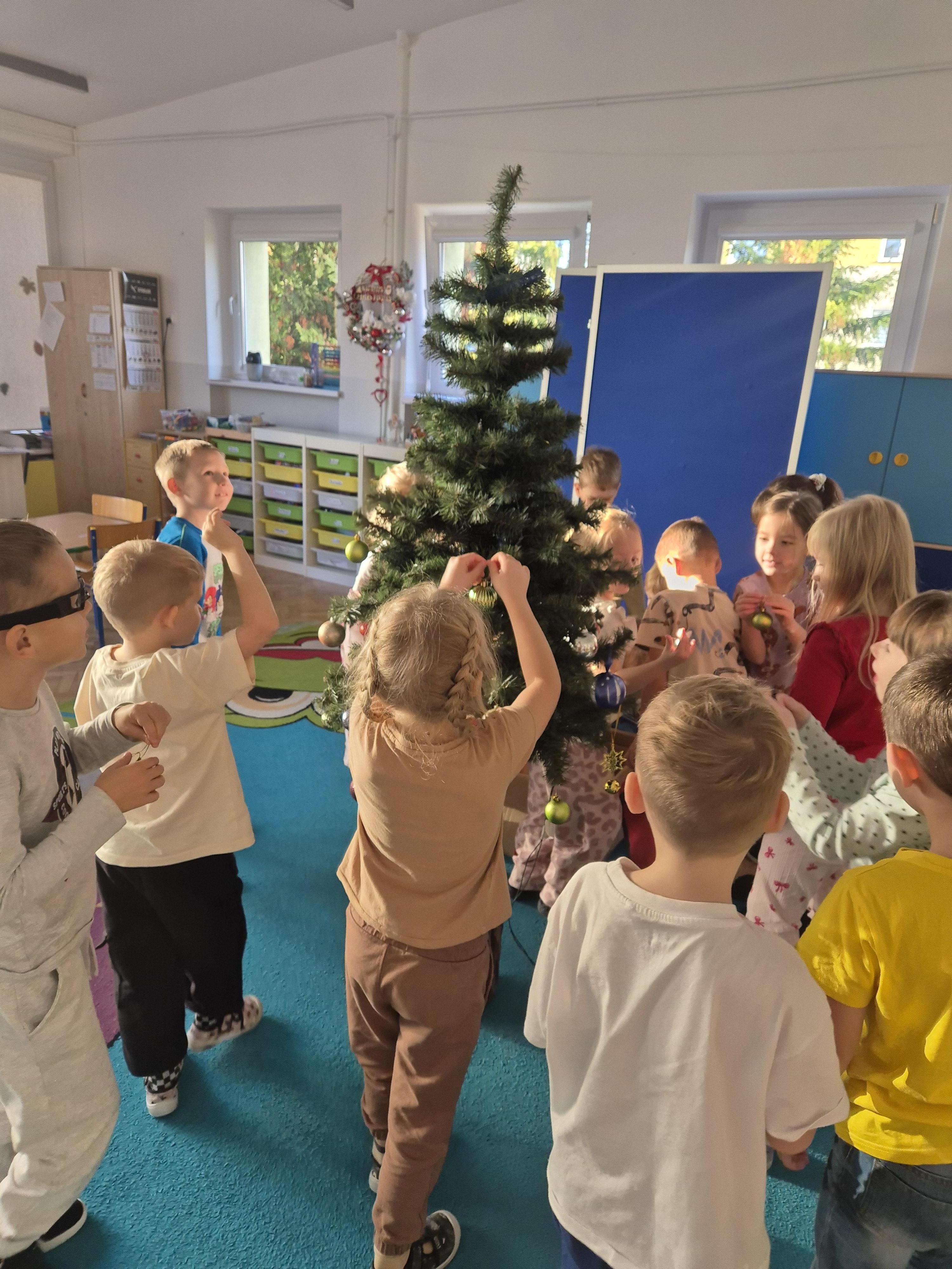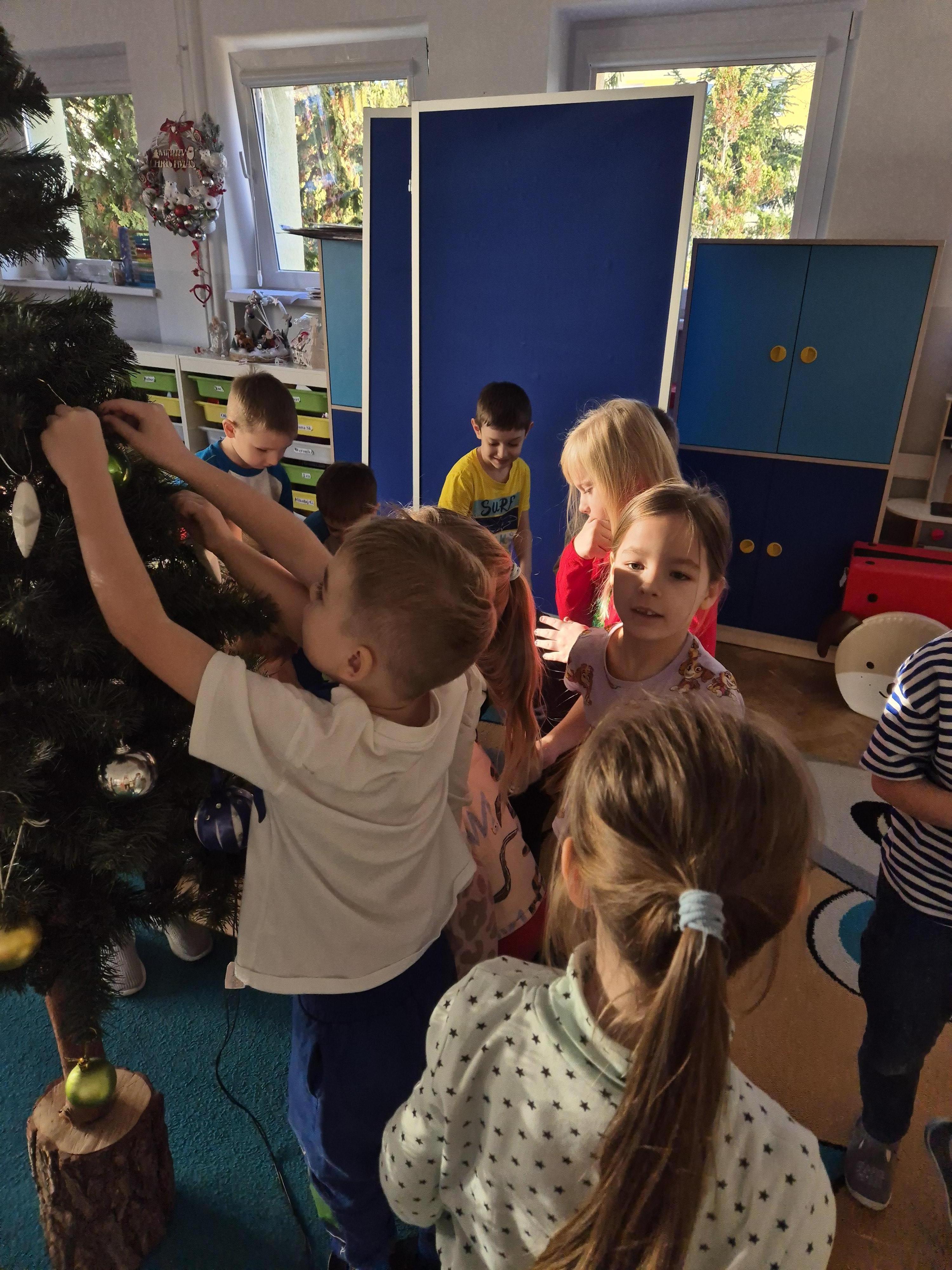 W poniedzialek 01.12 przedszkolaki przy muzyce świątecznej ozdabiały choinkę. Z radością zawieszały łańcuchy, bombki i lampki, wspólnie tworząc piękną, kolorową dekorację w sali. Strojenie choinki sprawiło im dużo uśmiechu i wprowadziło wszystkich w magiczną, świąteczną atmosferę.