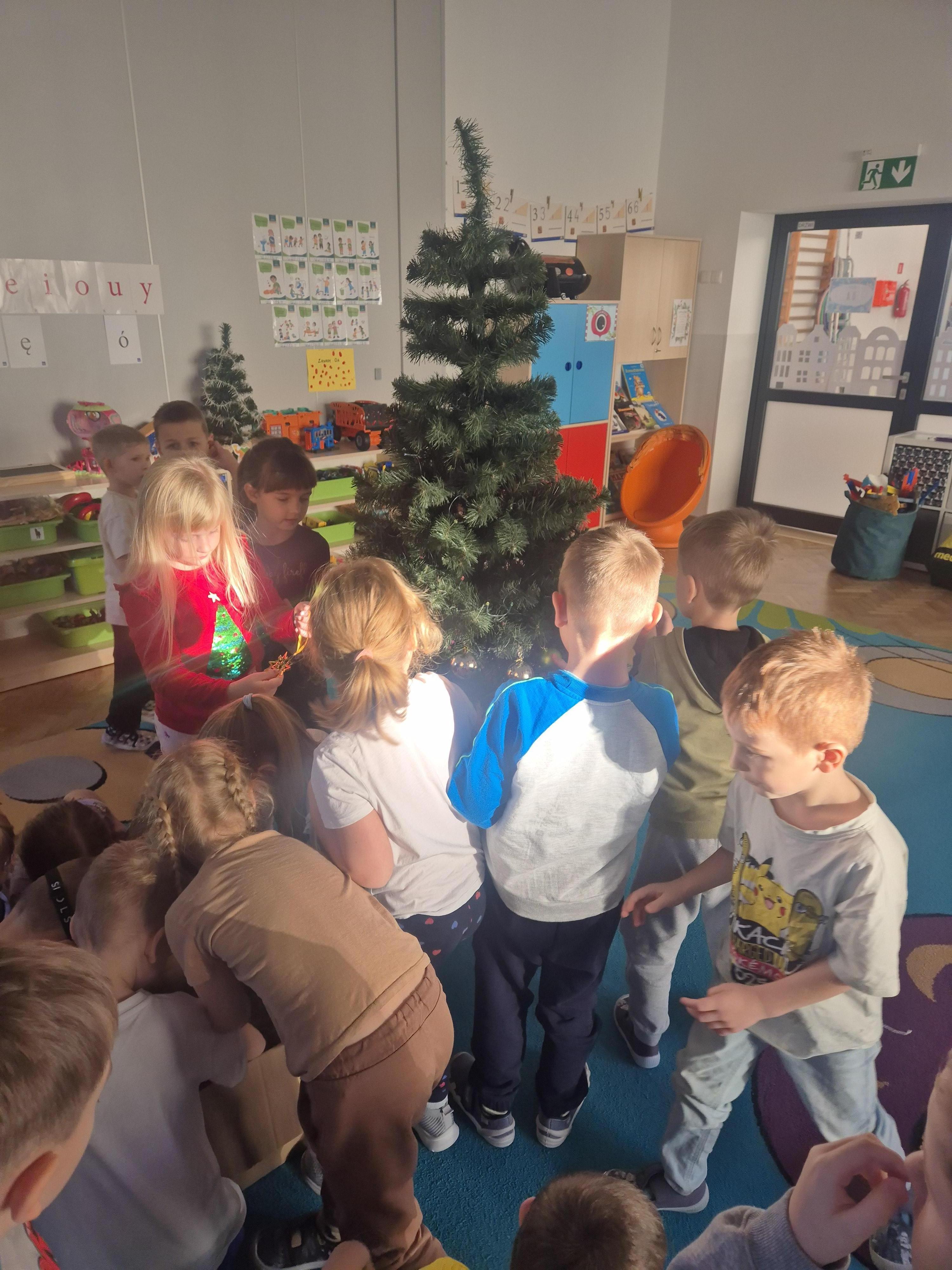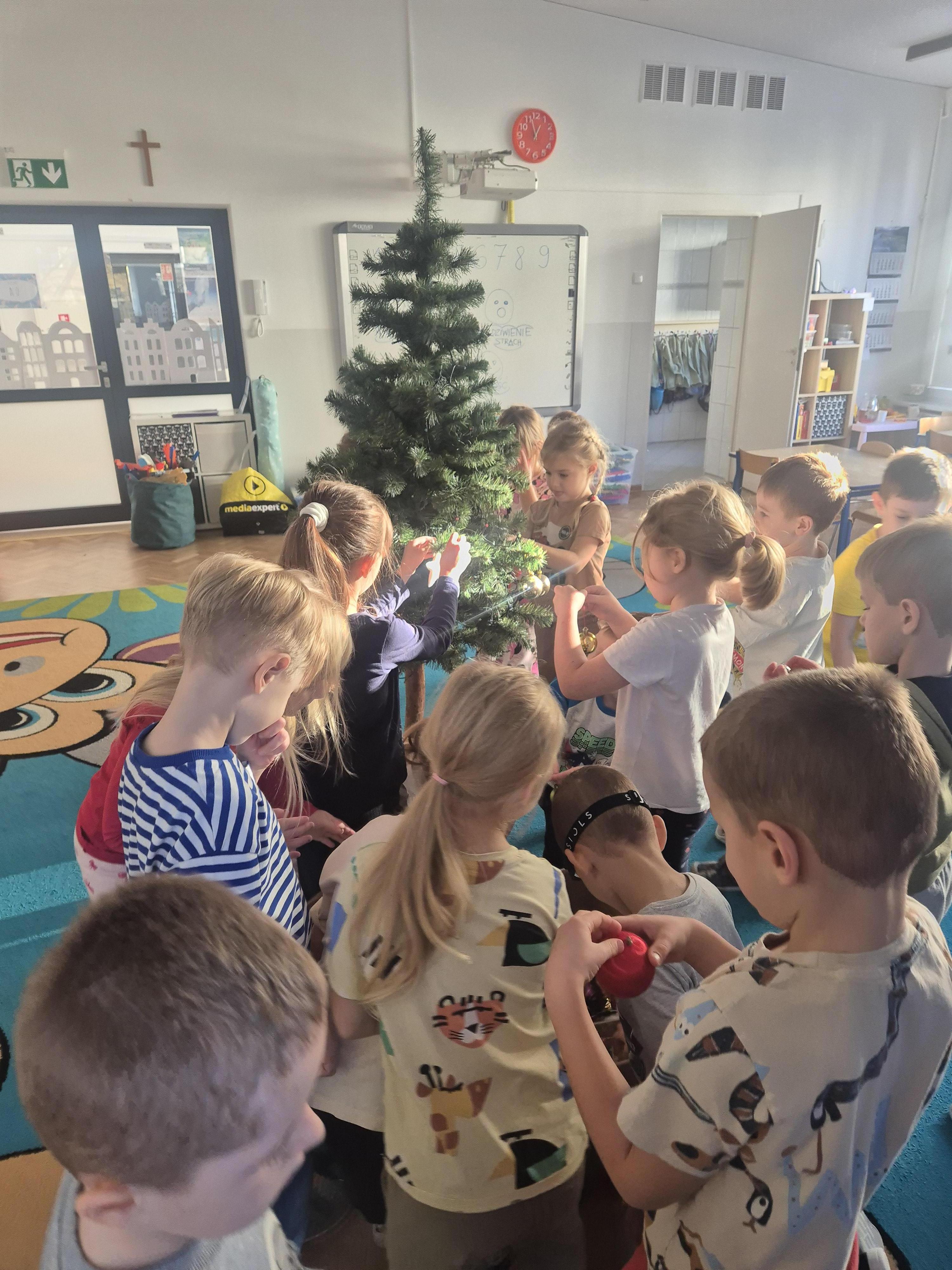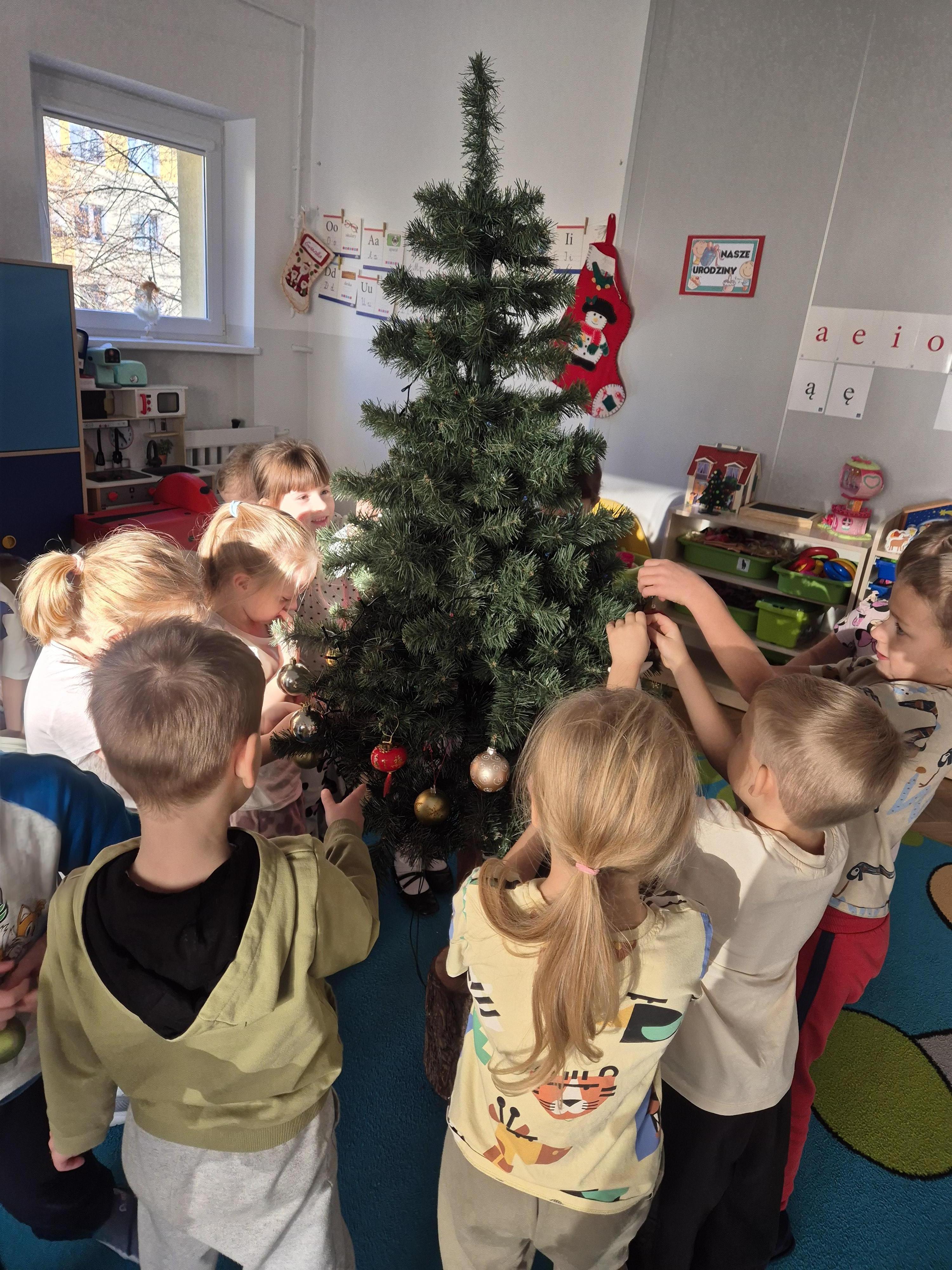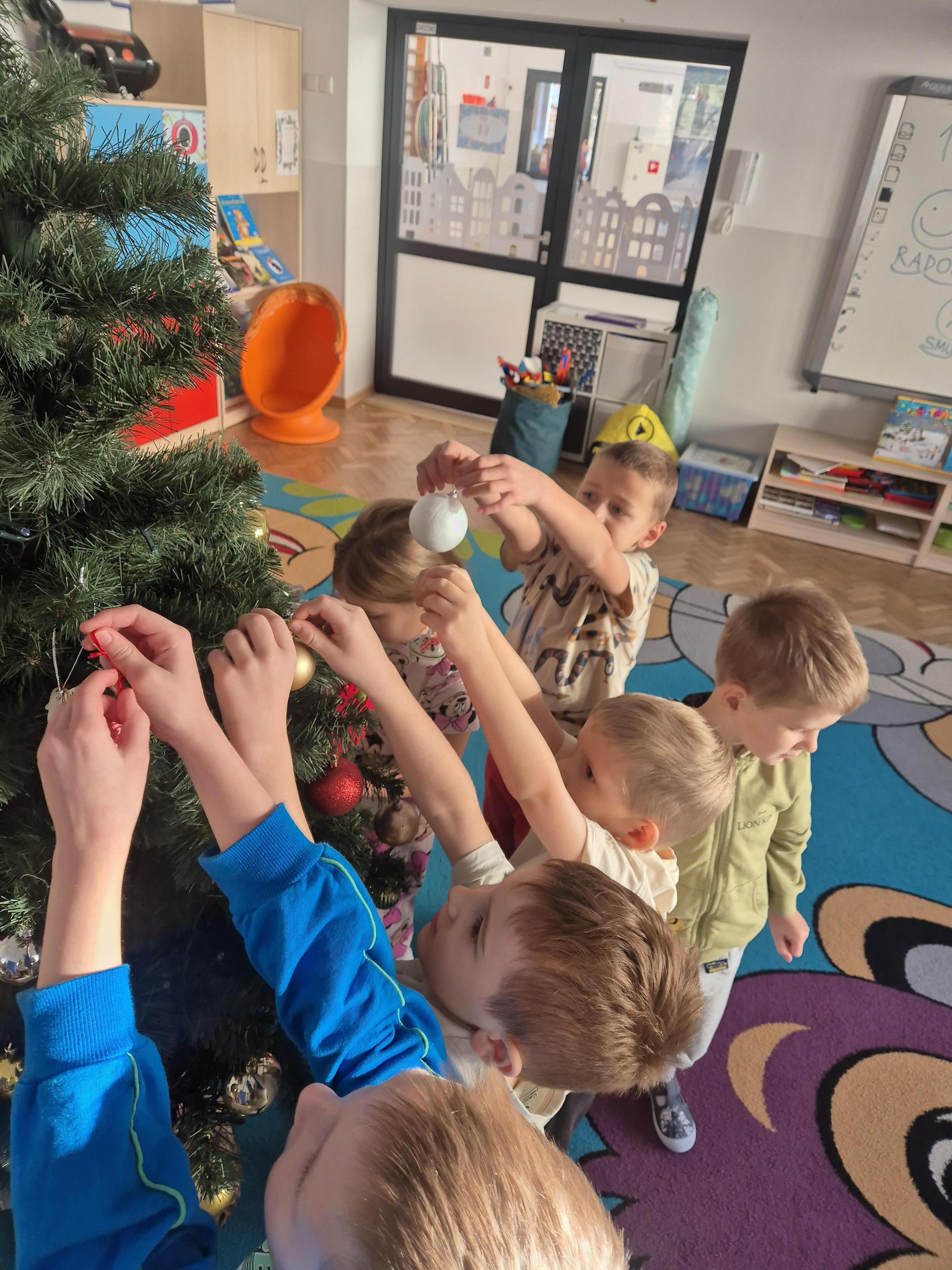 W poniedzialek 01.12 przedszkolaki przy muzyce świątecznej ozdabiały choinkę. Z radością zawieszały łańcuchy, bombki i lampki, wspólnie tworząc piękną, kolorową dekorację w sali. Strojenie choinki sprawiło im dużo uśmiechu i wprowadziło wszystkich w magiczną, świąteczną atmosferę.