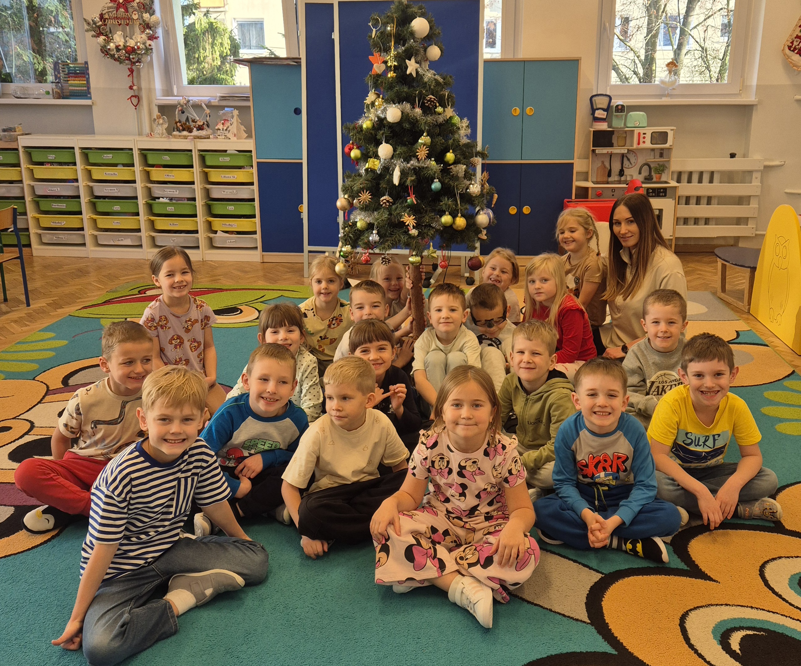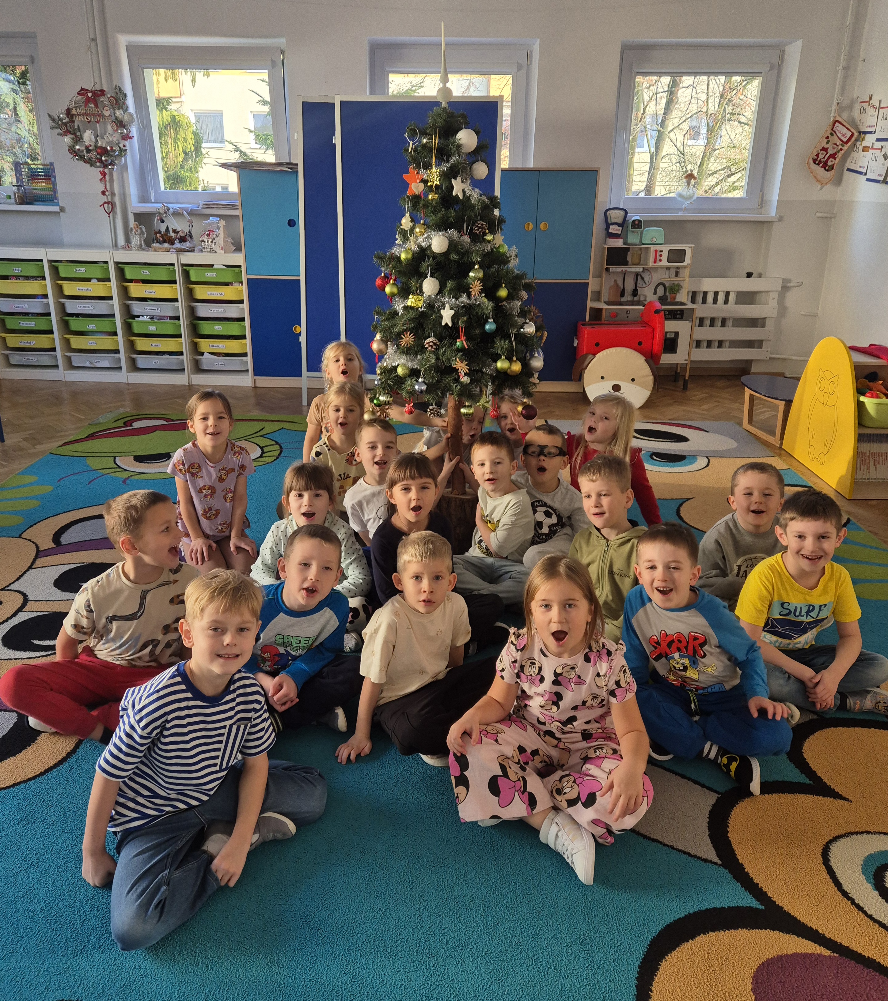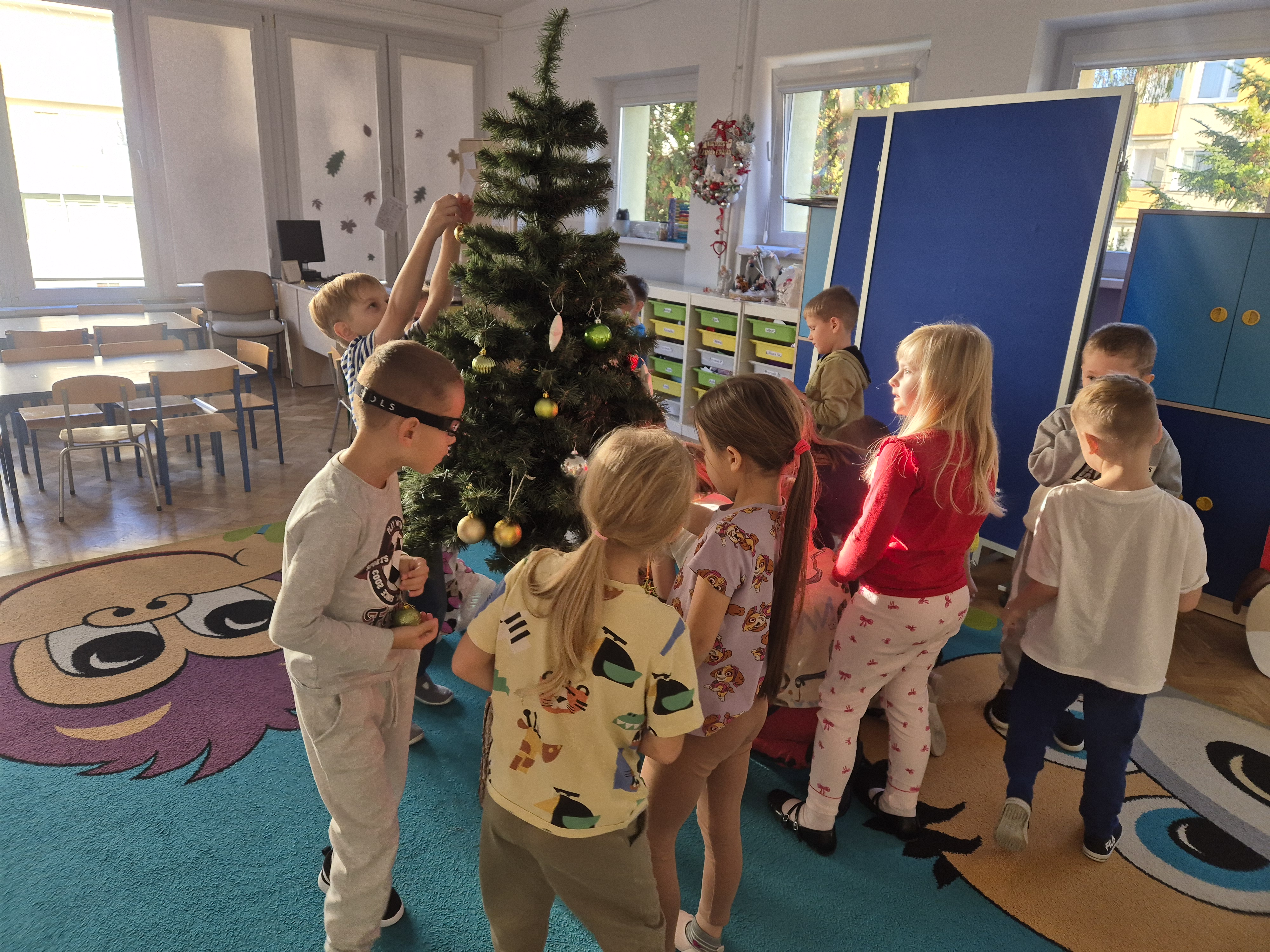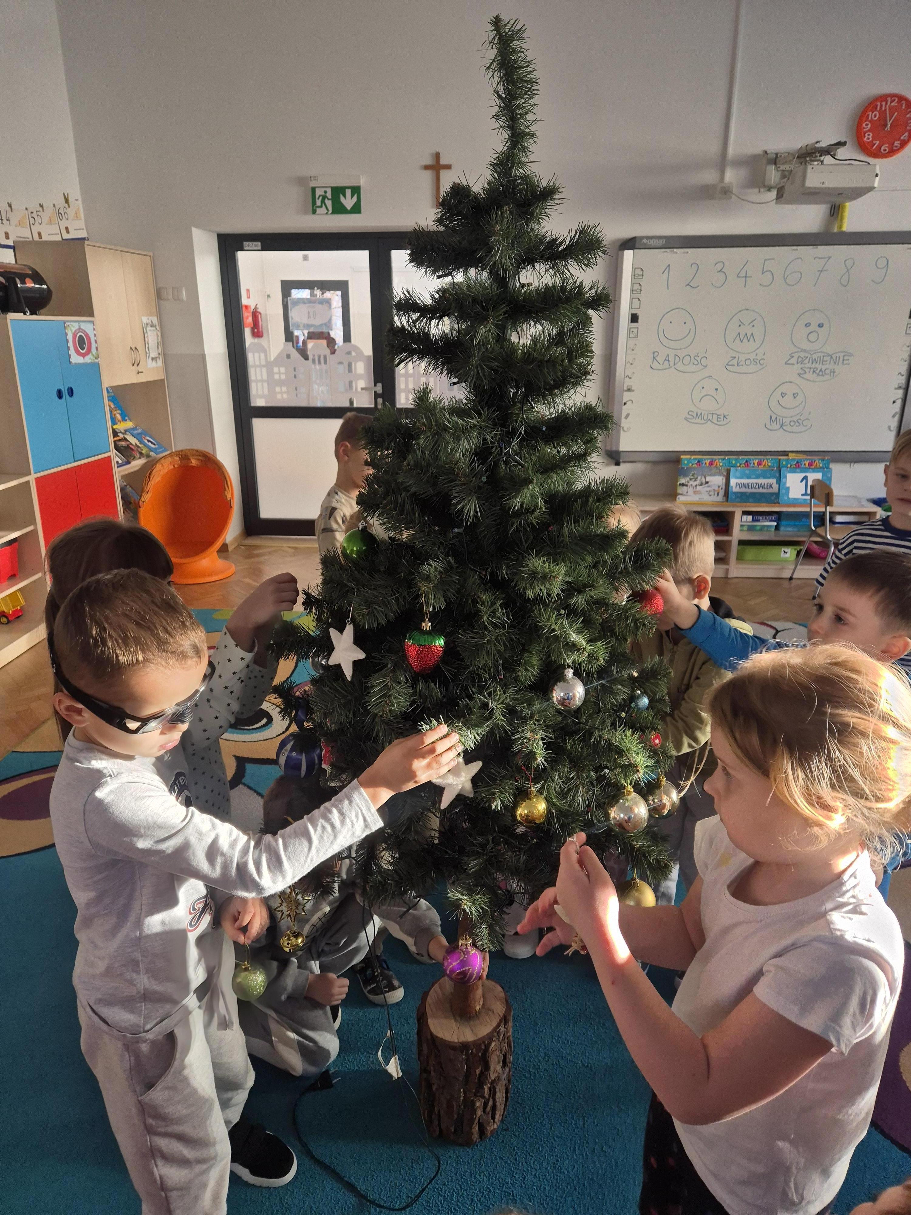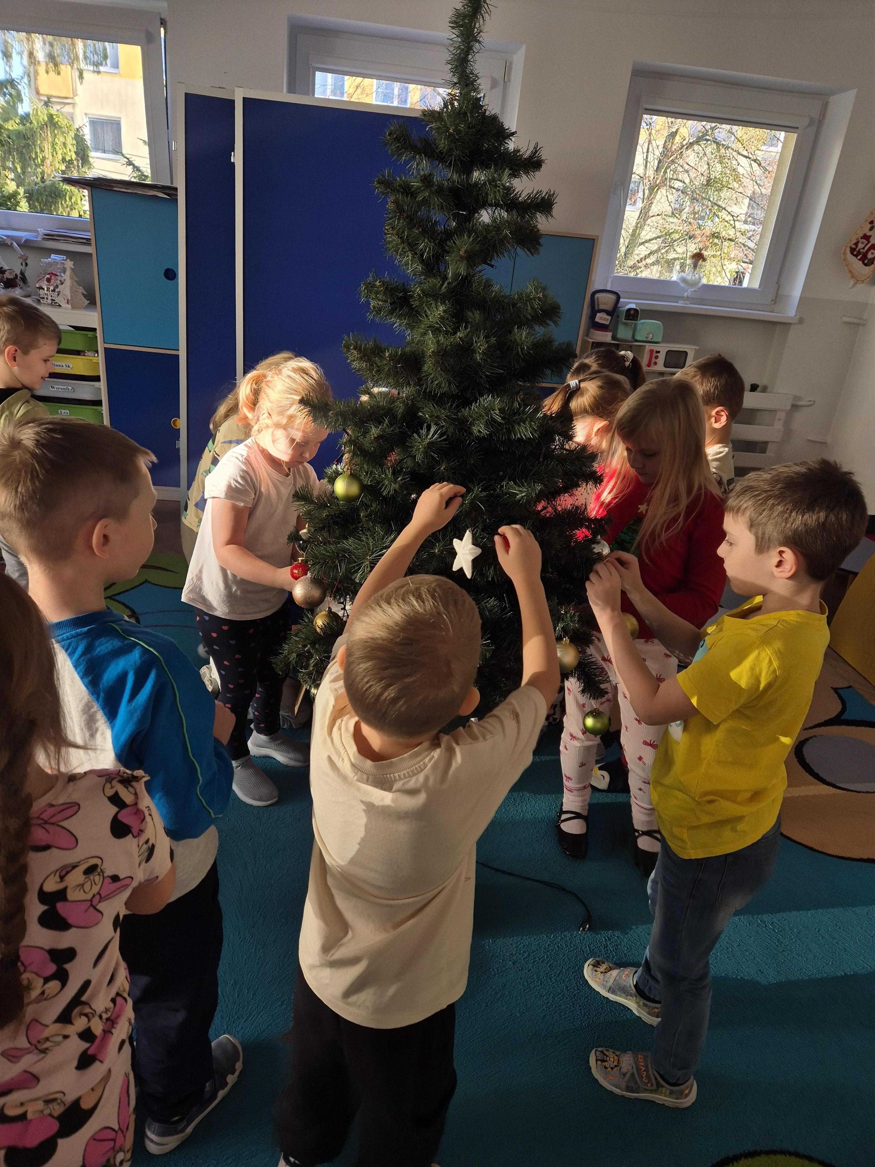 W poniedzialek 01.12 przedszkolaki przy muzyce świątecznej ozdabiały choinkę. Z radością zawieszały łańcuchy, bombki i lampki, wspólnie tworząc piękną, kolorową dekorację w sali. Strojenie choinki sprawiło im dużo uśmiechu i wprowadziło wszystkich w magiczną, świąteczną atmosferę.