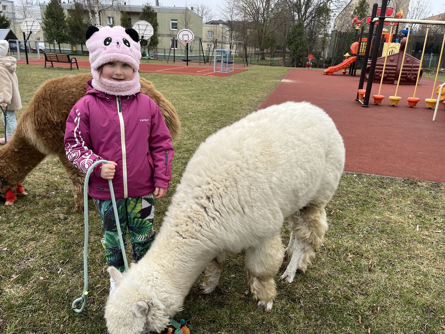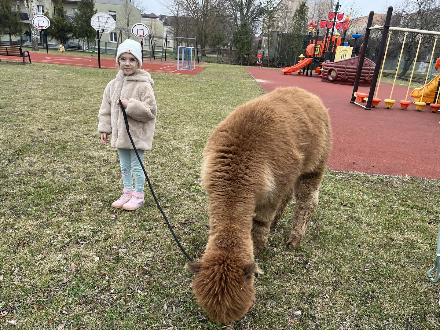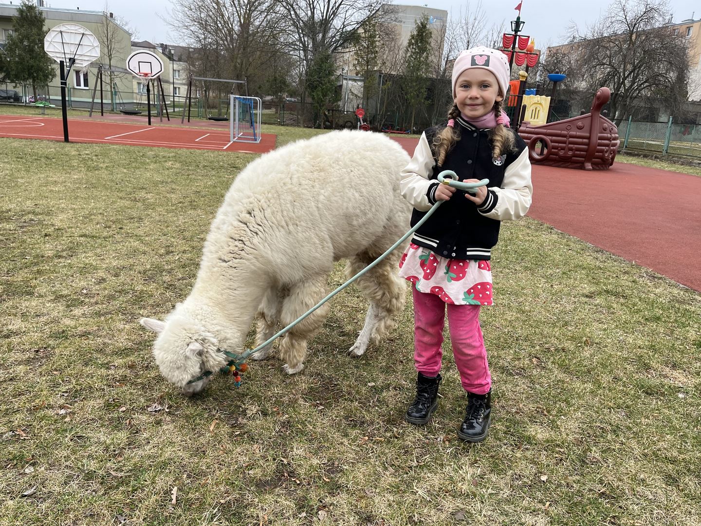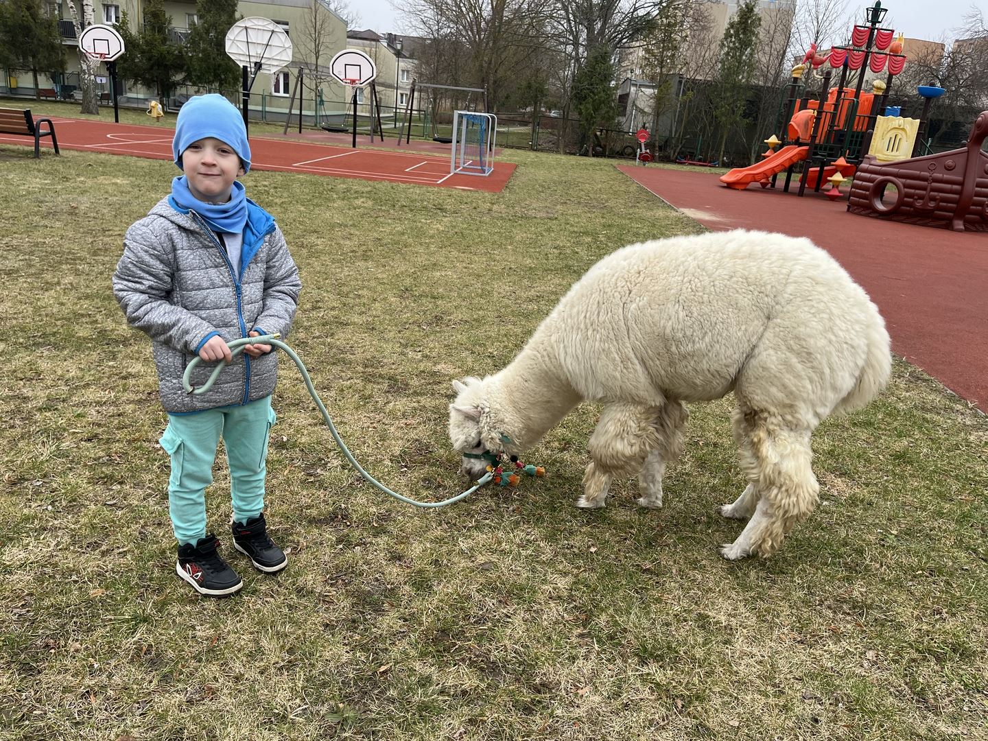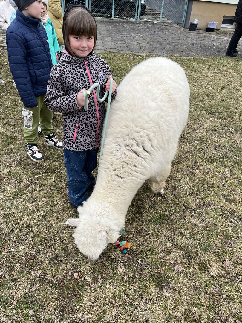 Niespodzianką dla dzieci było spotkanie z wyjątkowymi gośćmi – lamami. Dzieci dowiedziały się, czym się odżywiają, jak się zachowują oraz miały okazję wspólnie z nimi pospacerować, co sprawiło im wiele radości.