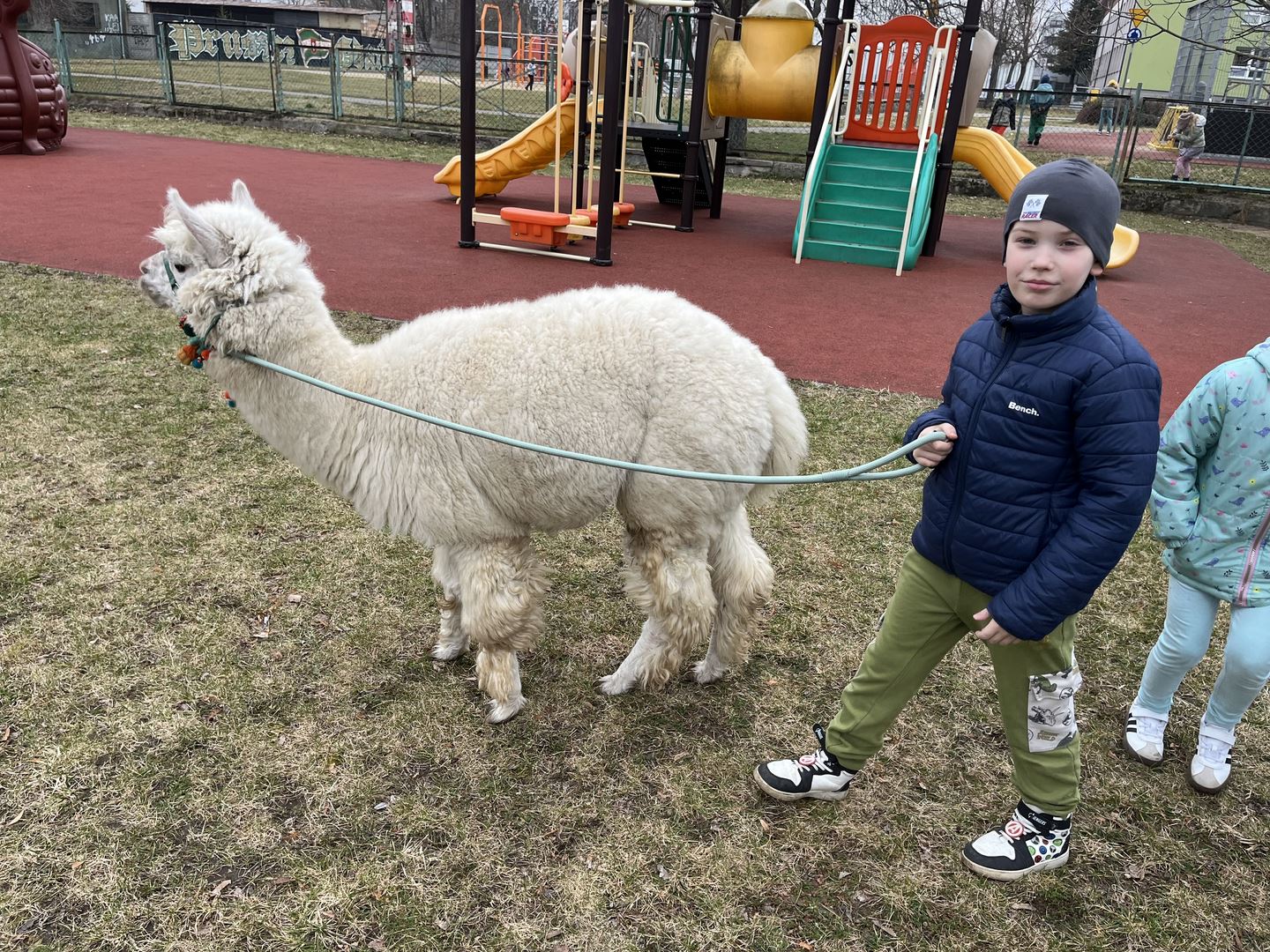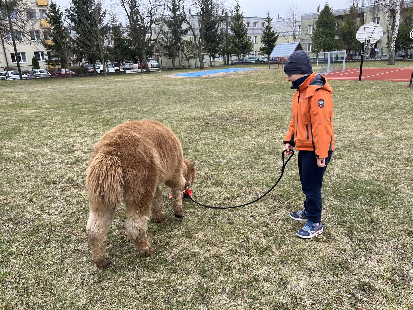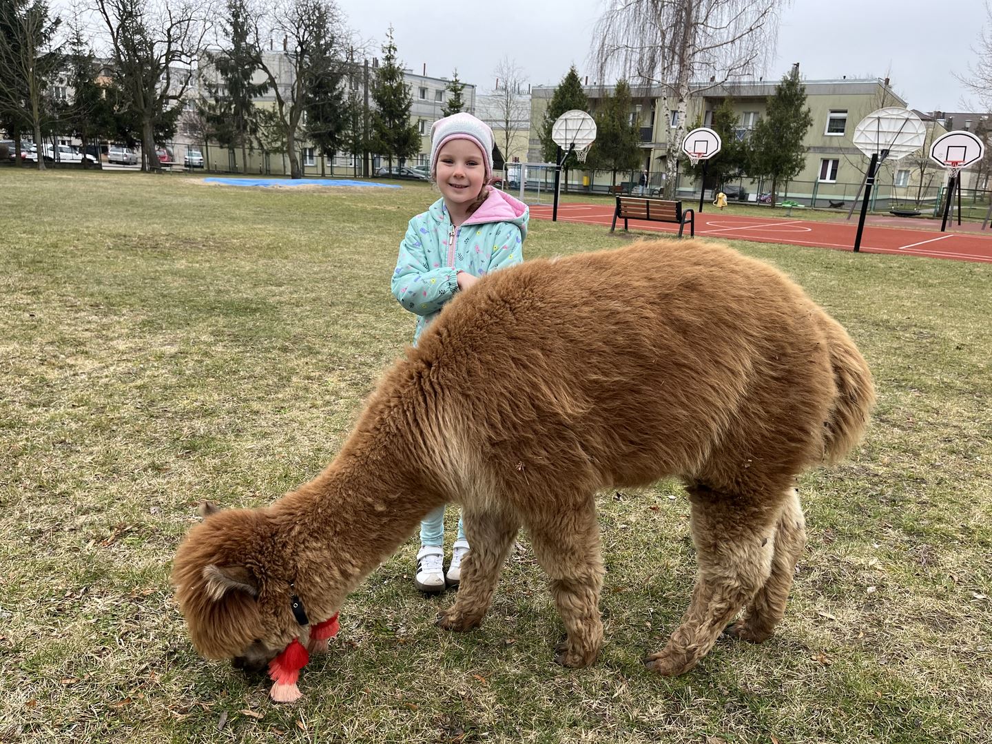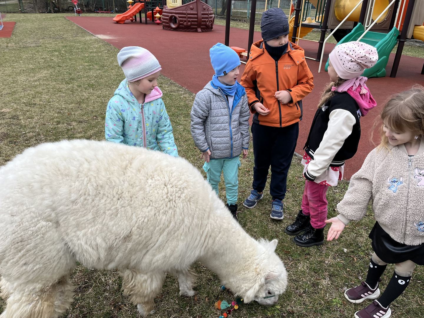 Niespodzianką dla dzieci było spotkanie z wyjątkowymi gośćmi – lamami. Dzieci dowiedziały się, czym się odżywiają, jak się zachowują oraz miały okazję wspólnie z nimi pospacerować, co sprawiło im wiele radości.